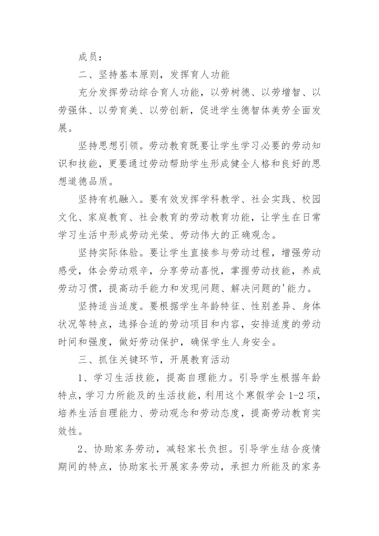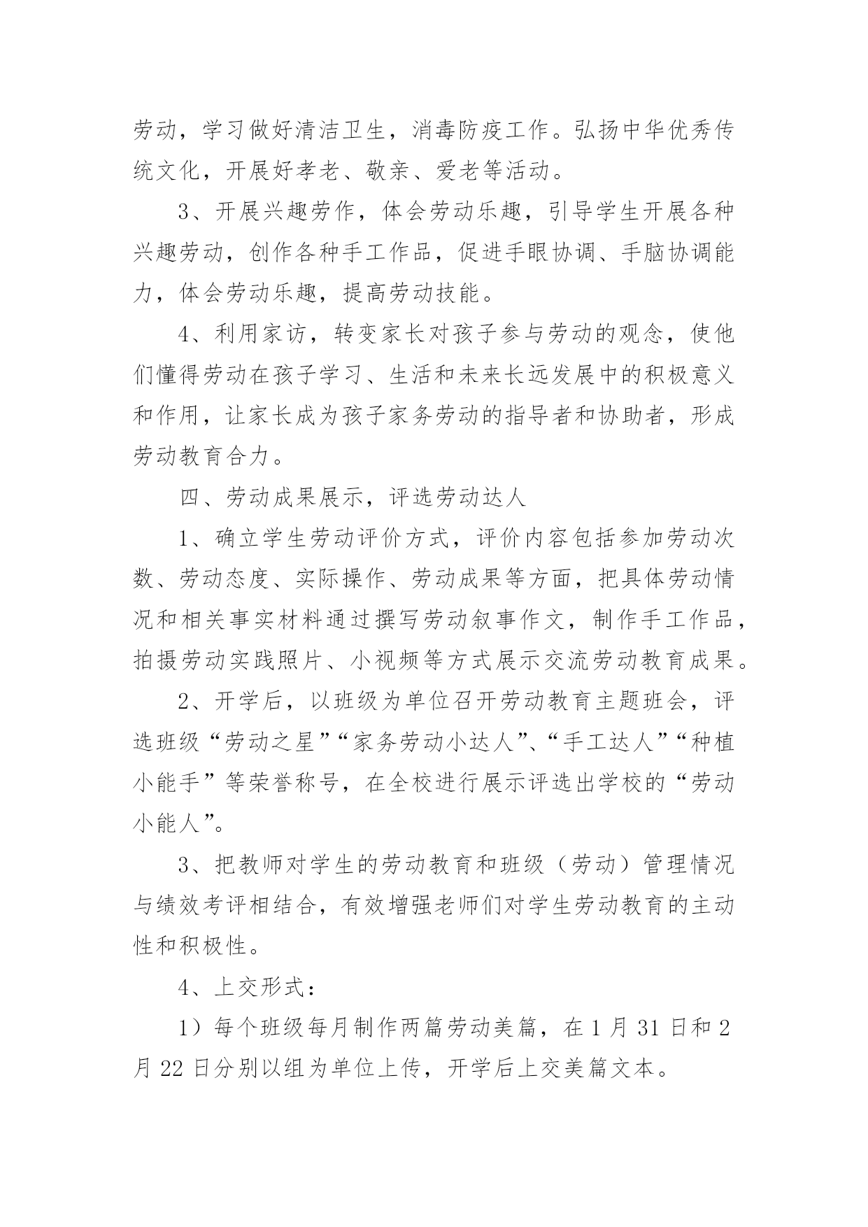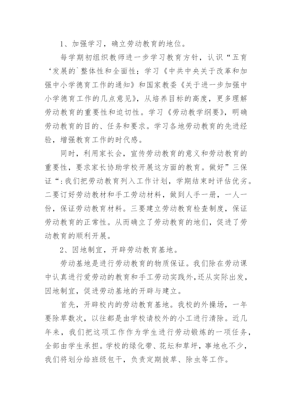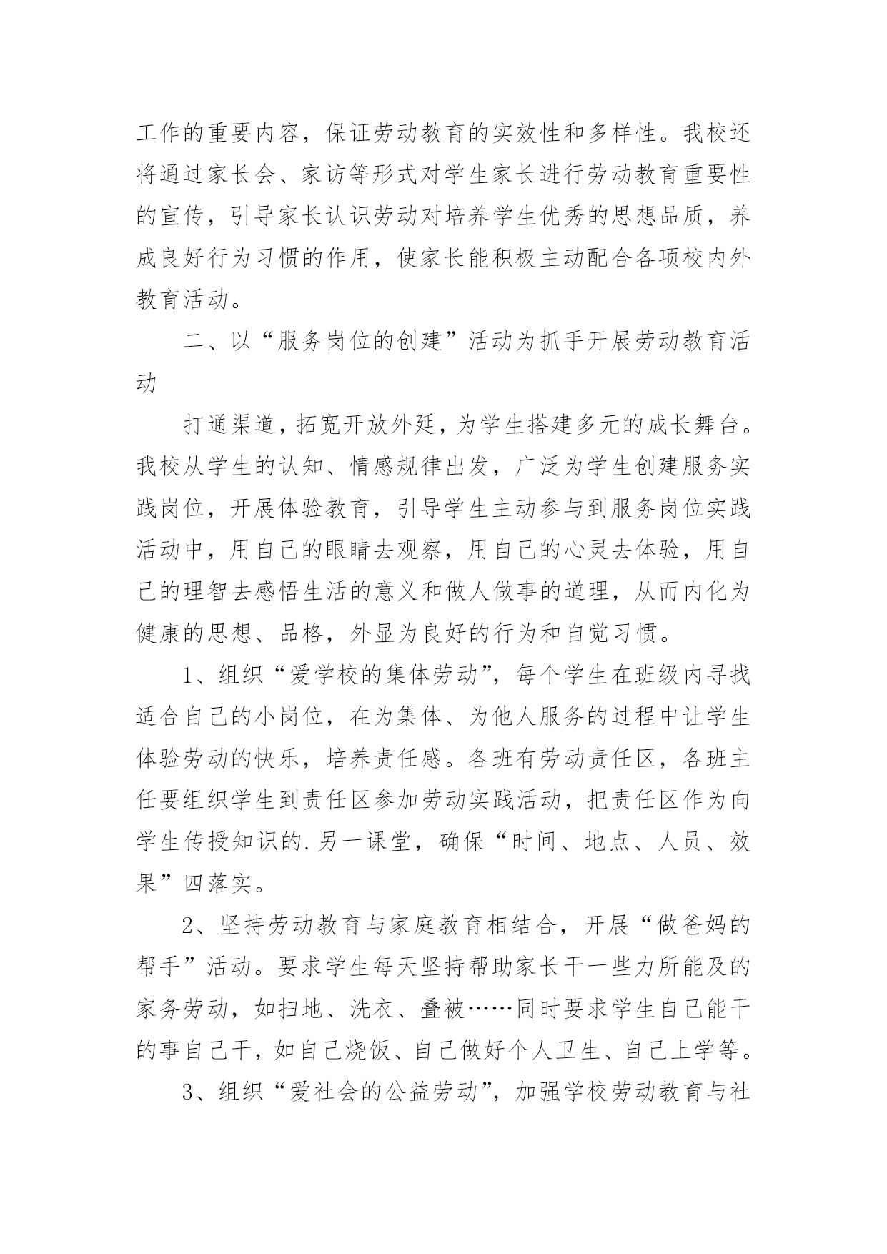 劳动教育理论课实践报告劳动教育理论课实践报告(精选13篇)转眼难忘的社会实践生活就已结束了,想必你的视野也得到了开拓,此时需要写一份实践报告,做好总结。那么如何把实践报告写出新花样呢?以下是小编收集整理的劳动教育理论课实践报告,仅供参考,大家一起来看看吧。劳动教育理论课实践报告篇1一、指导思想:为了认真贯彻中共中央、国务院召开的全国教育工作会议精神,落实《中共中央国务院关于深化教育改革全面推进素质教育的决定》和《面向21世纪教育振兴行动计划》,进一步全面推进素质教育,促进学生的全面发展。二、教育目标:1、从小培养学生的劳动意识及其良好的行为习惯,促进学生健全人格的发展。在家能帮助父母做些力所及的家务劳动。在校能完成打扫卫生等基本的劳动。2、通过劳动基地等劳动,做到良好习惯的培养和不良习惯的矫正相结合,促进学生的健康,使学生掌握一些基本的劳动技术及热爱劳动的品质。3、教师从理论与实践的结合上探讨中小学阶段学生劳动意识的形成、范围及培养途径。三、具体措施:1、加强学习,确立劳动教育的地位。每学期初组织教师进一步学习教育方针,认识“五育‘发展的`整体性和全面性;学习《中共中央关于改革和加强中小学德育工作的通知》和国家教委《关于进一步加强中小学德育工作的几点意见》,从培养目标的高度,更多理解劳动教育的重要性和迫切性。学习《劳动教学纲要》,明确劳动教育的目的、任务和要求。学习各地劳动教育的先进经验,增强教育工作的时代感。同时,利用家长会,宣传劳动教育的意义和劳动教育的重要性,要求家长协助学校开展这方面的教育。做好”三保证“:我们把劳动教育列入工作计划,学期结束时评估优劣。二要订好劳动教材和手工劳动材料,做到人手一册,一人一份,保证劳动教育材料。三要建立劳动教育检查制度,保证劳动教育的正常性。从而确立了劳动教育的地们,促进了劳动教育的顺利开展。2、因地制宜,开辟劳动教育基地。劳动基地是进行劳动教育的物质保证。我们除在劳动课中认真进行爱劳动的教育和手工劳动实践外,还从实际出发,因地制宜,促进劳动基地的开辟与建立。首先,开辟校内的劳动教育基地。我校的外操场,一年要除草数次,以往都是由学校请校外的小工进行清除。近几年来,我们把这项工作作为学生进行劳动锻炼的一项任务,全部由学生承担。学校的绿化带、花坛和草坪,事地也不少,我们将划分给班级包干,负责定期拔草、除虫等工作。其次,我们经常组织学生参加打扫燕子村的黄金台、易黄公路边捡拾白色垃圾等公益性劳动,将学校门口这一路段作为校外的劳动教育基地,由各年级学生轮流做好路面的清扫工作。其三,利用军营村苗木生产基地,每月组织骨干学生参加劳动,请技术员讲解劳动技巧,以提高学生的劳动兴趣。此外,积极倡导学生在家做到自己的事情自己做,父母的事情帮着做,还通过定期的问卷调查,及时了解情况,使劳动教育落到实处。3、开展研究,提高劳动教育质量。积极开展教学研究,努力提高劳动课教学的质量,是优化劳动教育的关键。首先,我们组织教师认真学习《劳动教学纲要》;深刻领会纲要对各年级学生进行劳动教育的具体要求。其次,我们以现行劳动教材为内容,举行了劳动教学公开课,课后,重点讨论研究劳动课教学的基本模式。4、各班要结合自己的实际,有目的,有主题的组织丰富多彩的劳动教育活动,在劳动的过程中,遵循知、情、意、行相统一的原则,并充分注意教育形势的趣、活、实。要求:每班进行一次关于劳动教育的主题班会,组织一次社会实践活动,进行一次劳动技能竞赛活动,组建一个劳动兴趣小组。并及时整理活动的过程性资料,学期末,学校将评选劳动先进班集体。5、学校开展全校学生征集”劳动小窍门“、”劳动金点子“,培养学生在劳动中实践、学习、创新的能力。6、各班组织学生开展”学一种劳动技术“、”写一篇劳动收获体会“活动,让学生在活动中学本领,做主人。7、举行竞赛,激发劳动教育情趣。8、开展评选”劳动基地“、”劳动小能手“等活动。劳动教育理论课实践报告篇2劳动教育是全面贯彻党的教育方针的基本要求,是实施素质教育的重要内容,是培育和践行社会主义核心价值观的有效途径。为了更好地抓好我校劳动教育工作,根据《阿城区义务教育学校学生寒假劳动教育指导建议》文件精神,结合学校实际,特制定本实施方案。一、明确教育目标,加强组织领导通过劳动教育,提高学生的劳动素养,促进他们形成良好的劳动习惯和积极的劳动态度,使他们明白“生活靠劳动创造,人生也靠劳动创造”的道理,培养他们勤奋学习、自觉劳动、勇于创造的精神,为他们终身发展和人生幸福奠定基础。统筹资源,构建模式,形成重视劳动教育的氛围,把我校创建成劳动教育特色学校。为了有序、有效推进工作实施,实现既定的劳动教育目标,决定成立胜利小学劳动教育工作领导小组。具体名单如下:组长:副组长:成员:二、坚持基本原则,发挥育人功能充分发挥劳动综合育人功能,