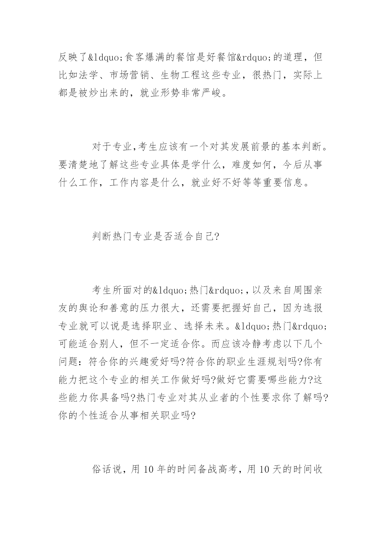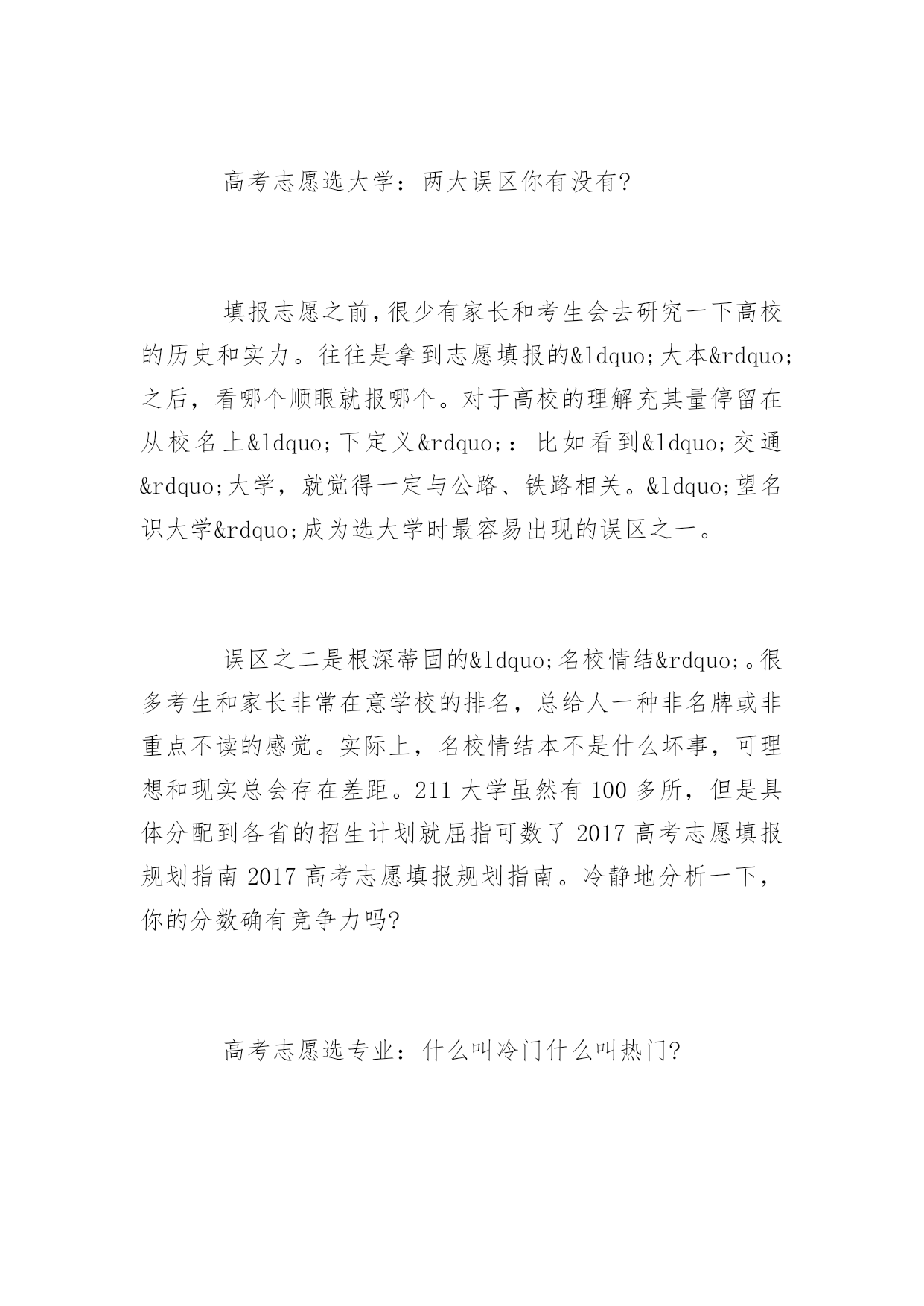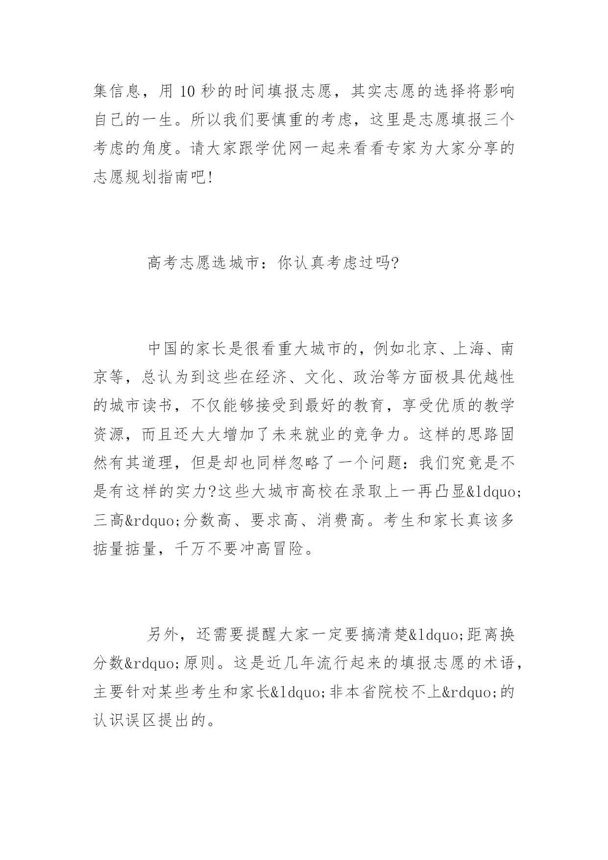 高考志愿指导2017高考志愿指导高考的志愿填写是很多考生无从下手的,志愿填报有那些需要注意的,该怎么填?下面是阳光网小编为你整理的高考志愿填报指导内容,希望能够帮助到你。高考志愿填报指导专业选择是志愿填报的一个部分,一个关乎到你将来可能从事什么样的职业的重要选择。很对考生和家长对专业没有系统深刻的了解,在选择时只是随大流,认为大家都选的就是好的,正是在这种想法的支配下,很多孩子在接触到专业后就后悔了,也有些在步入社会后,才深深后悔当初的草率。为了不让这种情况再现,在专业选择前,我们应该了解哪些问题呢?性格内向和外向的人,选什么专业比较合适?性格能够影响到一个人的职业发展,所以,在选择专业时,一定要考虑自己的性格因素。不要单纯的认为上大学还跟之前的小中高一样,只是在接受知识。要知道,你选择的专业决定着你未来要从事的职业。如果性格和职业不匹配,走的会格外的艰辛。专业热门是否代表职业热门?四年后还热门?选择专业就是选择职业,即选择未来。专业虽然并不能决定某个人将来从事某项特定的具体职业,却能够界定未来职业的范围。考生对专业的选择要适合自己的兴趣和个人目标,最适合自身潜能发展的专业就是最好的专业,而最热门的专业并不一定是最适合你的专业。并且,就读时热门不代表四年后还热门。很多热门仅仅是分数高,报的人多,虽然一定程度上反映了“食客爆满的餐馆是好餐馆”的道理,但比如法学、市场营销、生物工程这些专业,很热门,实际上都是被炒出来的,就业形势非常严峻。对于专业,考生应该有一个对其发展前景的基本判断。要清楚地了解这些专业具体是学什么,难度如何,今后从事什么工作,工作内容是什么,就业好不好等等重要信息。判断热门专业是否适合自己?考生所面对的“热门”,以及来自周围亲友的舆论和善意的压力很大,还需要把握好自己,因为选报专业就可以说是选择职业、选择未来。“热门”可能适合别人,但不一定适合你。而应该冷静考虑以下几个问题:符合你的兴趣爱好吗?符合你的职业生涯规划吗?你有能力把这个专业的相关工作做好吗?做好它需要哪些能力?这些能力你具备吗?热门专业对其从业者的个性要求你了解吗?你的个性适合从事相关职业吗?俗话说,用10年的时间备战高考,用10天的时间收集信息,用10秒的时间填报志愿,其实志愿的选择将影响自己的一生。所以我们要慎重的考虑,这里是志愿填报三个考虑的角度。请大家跟学优网一起来看看专家为大家分享的志愿规划指南吧!高考志愿选城市:你认真考虑过吗?中国的家长是很看重大城市的,例如北京、上海、南京等,总认为到这些在经济、文化、政治等方面极具优越性的城市读书,不仅能够接受到最好的教育,享受优质的教学资源,而且还大大增加了未来就业的竞争力。这样的思路固然有其道理,但是却也同样忽略了一个问题:我们究竟是不是有这样的实力?这些大城市高校在录取上一再凸显“三高”分数高、要求高、消费高。考生和家长真该多掂量掂量,千万不要冲高冒险。另外,还需要提醒大家一定要搞清楚“距离换分数”原则。这是近几年流行起来的填报志愿的术语,主要针对某些考生和家长“非本省院校不上”的认识误区提出的。高考志愿选大学:两大误区你有没有?填报志愿之前,很少有家长和考生会去研究一下高校的历史和实力。往往是拿到志愿填报的“大本”之后,看哪个顺眼就报哪个。对于高校的理解充其量停留在从校名上“下定义”:比如看到“交通”大学,就觉得一定与公路、铁路相关。“望名识大学”成为选大学时最容易出现的误区之一。误区之二是根深蒂固的“名校情结”。很多考生和家长非常在意学校的排名,总给人一种非名牌或非重点不读的感觉。实际上,名校情结本不是什么坏事,可理想和现实总会存在差距。211大学虽然有100多所,但是具体分配到各省的招生计划就屈指可数了2017高考志愿填报规划指南2017高考志愿填报规划指南。冷静地分析一下,你的分数确有竞争力吗?高考志愿选专业:什么叫冷门什么叫热门?考生和家长在选择专业的时候往往愿意选择热门专业,但却不知一些现在看起来热门的专业,随着时间的流逝变得越来越不热门,甚至毕业的时候很难找到合适的工作。不管是冷门还是热门,都首先应该了解专业的内涵,也就是说,针对一个专业,我们要知道该专业的一些常识,比如学什么,今后可以怎么深造等。不要一味地去追求所谓的热门,还是应该从自身情况出发,去选择适合自己的专业。填报志愿时,一般都流行这样一句行话,即:高分考生优选学校,中低分的考生优选专业。其实在高考志愿填报中