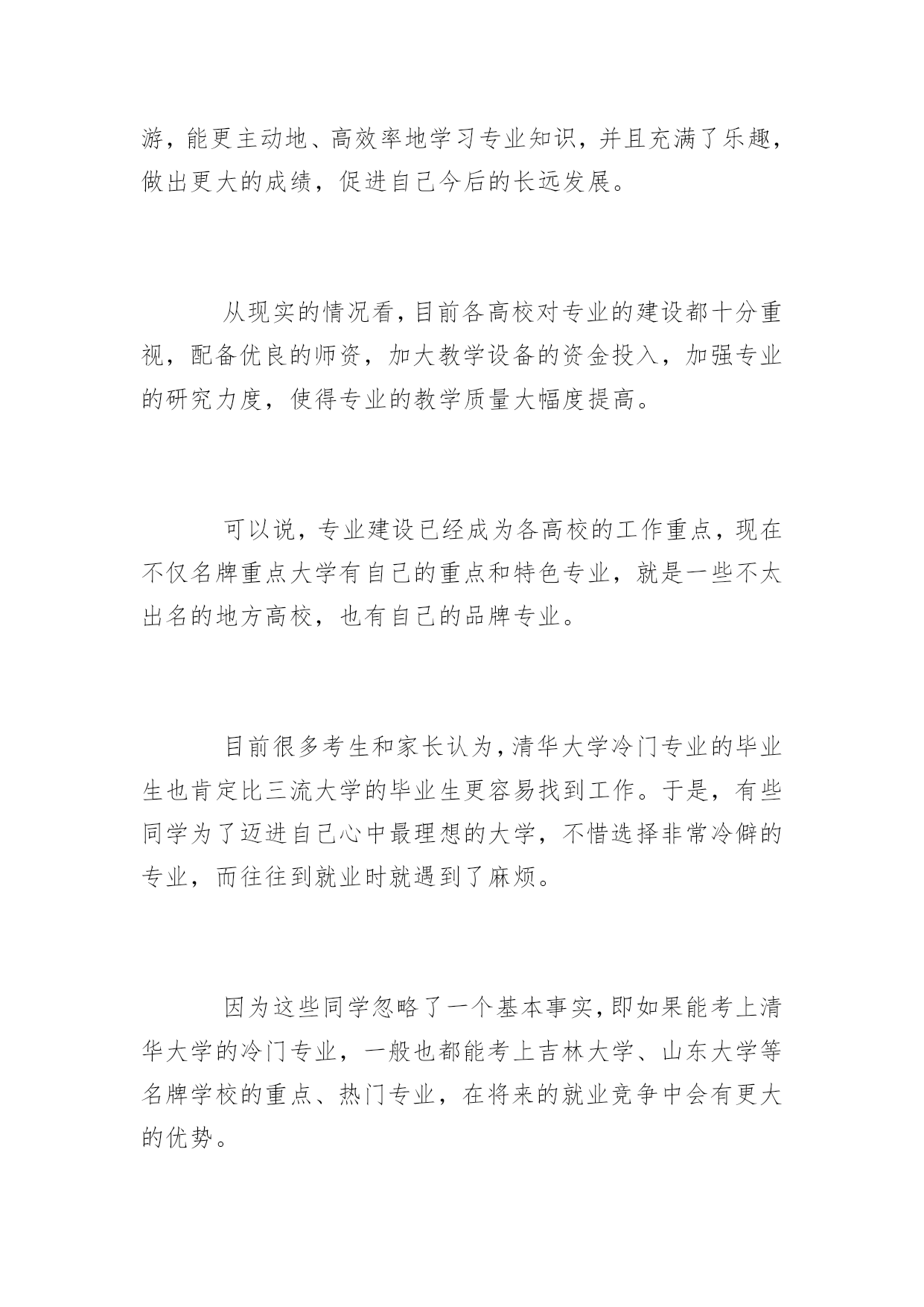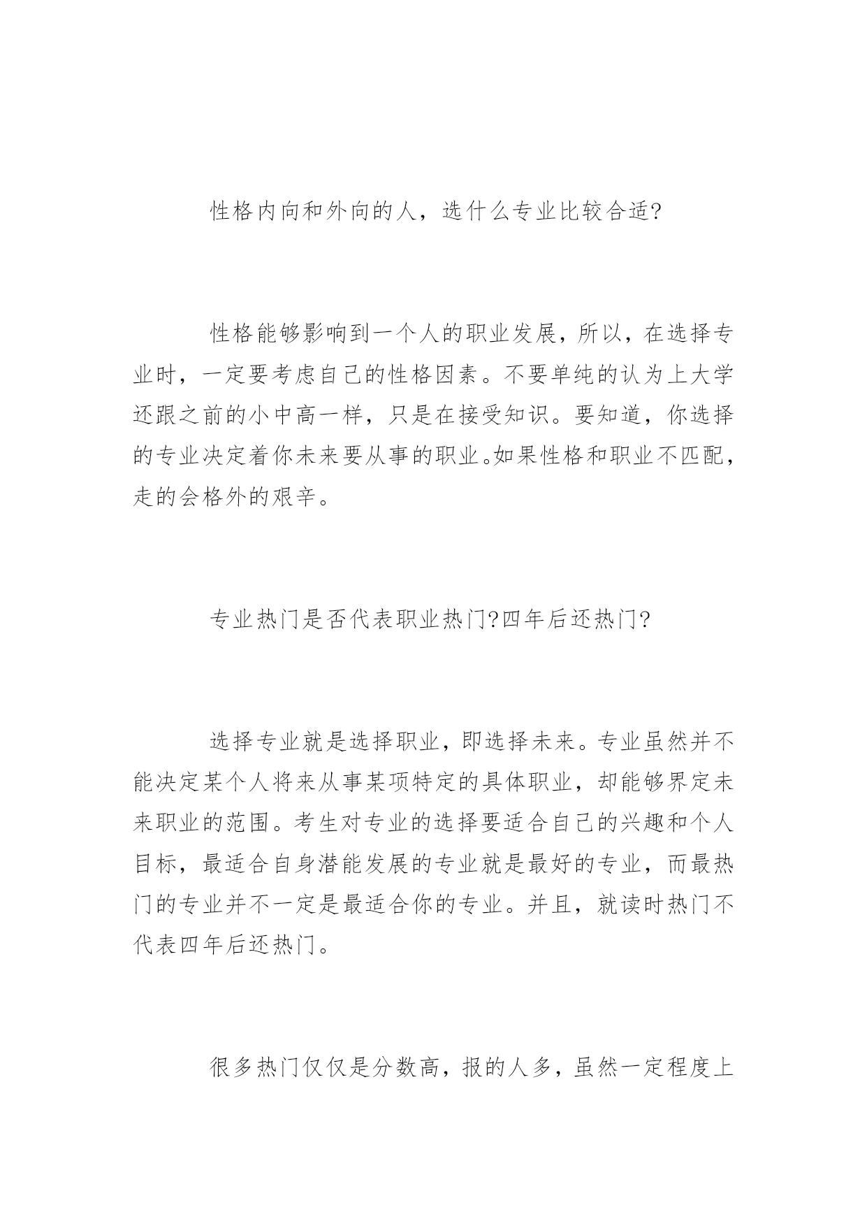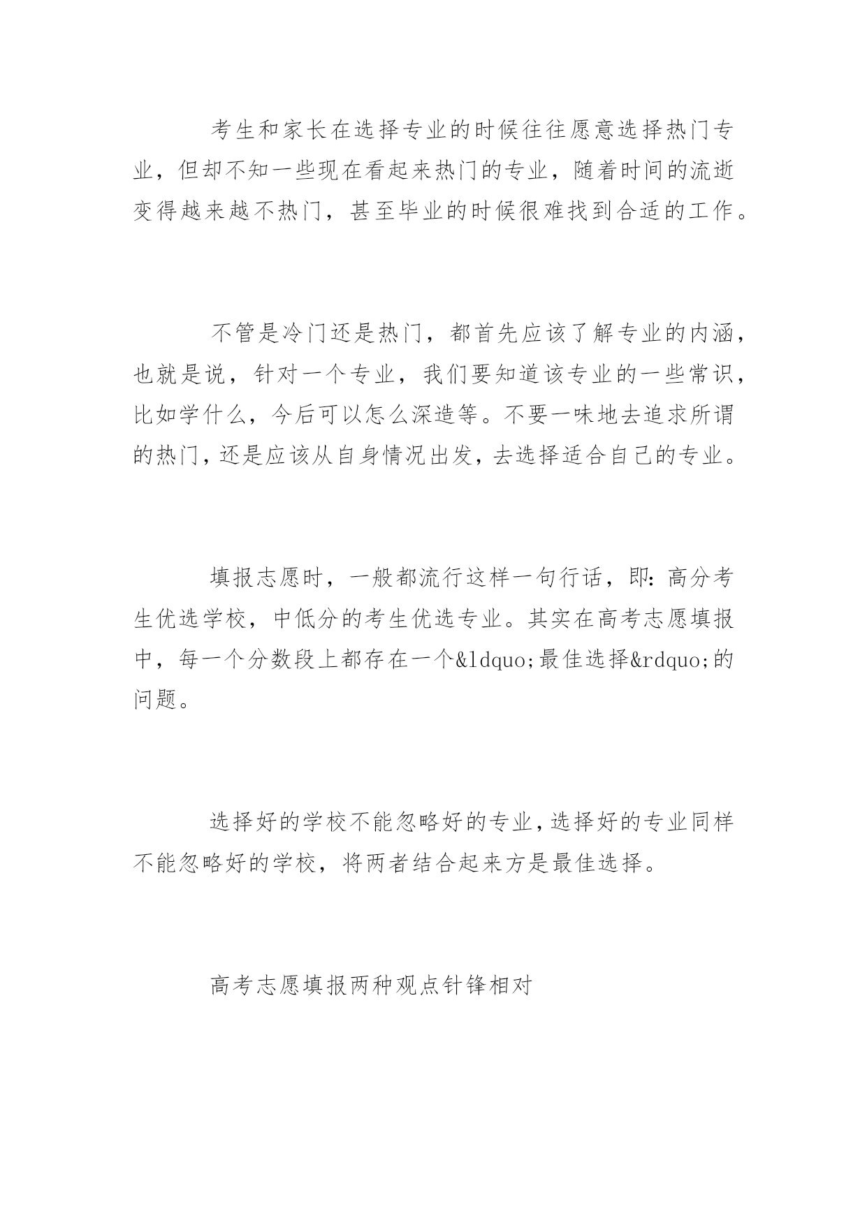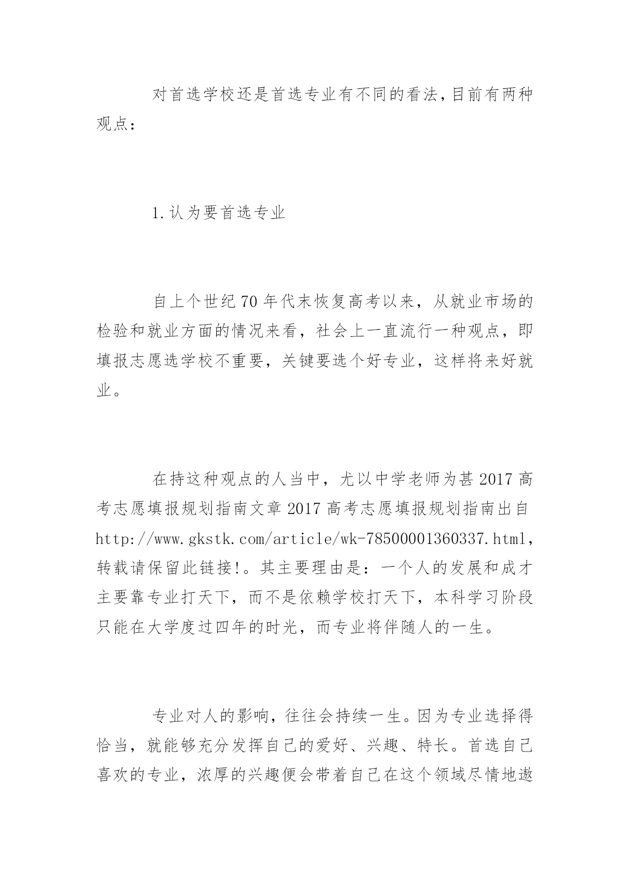高考志愿指导2017高考志愿指导高考的志愿填写是很多考生无从下手的,志愿填报有那些需要注意的,该怎么填?下面是阳光网小编为你整理的高考志愿填报指导内容,希望能够帮助到你。高考志愿填报指导专业选择是志愿填报的一个部分,一个关乎到你将来可能从事什么样的职业的重要选择。很对考生和家长对专业没有系统深刻的了解,在选择时只是随大流,认为大家都选的就是好的,正是在这种想法的支配下,很多孩子在接触到专业后就后悔了,也有些在步入社会后,才深深后悔当初的草率。为了不让这种情况再现,在专业选择前,我们应该了解哪些问题呢?性格内向和外向的人,选什么专业比较合适?性格能够影响到一个人的职业发展,所以,在选择专业时,一定要考虑自己的性格因素。不要单纯的认为上大学还跟之前的小中高一样,只是在接受知识。要知道,你选择的专业决定着你未来要从事的职业。如果性格和职业不匹配,走的会格外的艰辛。专业热门是否代表职业热门?四年后还热门?选择专业就是选择职业,即选择未来。专业虽然并不能决定某个人将来从事某项特定的具体职业,却能够界定未来职业的范围。考生对专业的选择要适合自己的兴趣和个人目标,最适合自身潜能发展的专业就是最好的专业,而最热门的专业并不一定是最适合你的专业。并且,就读时热门不代表四年后还热门。很多热门仅仅是分数高,报的人多,虽然一定程度上反映了“食客爆满的餐馆是好餐馆”的道理,但比如法学、市场营销、生物工程这些专业,很热门,实际上都是被炒出来的,就业形势非常严峻。对于专业,考生应该有一个对其发展前景的基本判断。要清楚地了解这些专业具体是学什么,难度如何,今后从事什么工作,工作内容是什么,就业好不好等等重要信息。判断热门专业是否适合自己?考生所面对的“热门”,以及来自周围亲友的舆论和善意的压力很大,还需要把握好自己,因为选报专业就可以说是选择职业、选择未来。“热门”可能适合别人,但不一定适合你。而应该冷静考虑以下几个问题:符合你的兴趣爱好吗?符合你的职业生涯规划吗?你有能力把这个专业的相关工作做好吗?做好它需要哪些能力?这些能力你具备吗?热门专业对其从业者的个性要求你了解吗?你的个性适合从事相关职业吗?俗话说,用10年的时间备战高考,用10天的时间收集信息,用10秒的时间填报志愿,其实志愿的选择将影响自己的一生。所以我们要慎重的考虑,这里是志愿填报三个考虑的角度。请大家跟学优网一起来看看专家为大家分享的志愿规划指南吧!高考志愿选城市:你认真考虑过吗?中国的家长是很看重大城市的,例如北京、上海、南京等,总认为到这些在经济、文化、政治等方面极具优越性的城市读书,不仅能够接受到最好的教育,享受优质的教学资源,而且还大大增加了未来就业的竞争力。这样的思路固然有其道理,但是却也同样忽略了一个问题:我们究竟是不是有这样的实力?这些大城市高校在录取上一再凸显“三高”分数高、要求高、消费高。考生和家长真该多掂量掂量,千万不要冲高冒险。另外,还需要提醒大家一定要搞清楚“距离换分数”原则。这是近几年流行起来的填报志愿的术语,主要针对某些考生和家长“非本省院校不上”的认识误区提出的。高考志愿选大学:两大误区你有没有?填报志愿之前,很少有家长和考生会去研究一下高校的历史和实力。往往是拿到志愿填报的“大本”之后,看哪个顺眼就报哪个。对于高校的理解充其量停留在从校名上“下定义”:比如看到“交通”大学,就觉得一定与公路、铁路相关。“望名识大学”成为选大学时最容易出现的误区之一。误区之二是根深蒂固的“名校情结”。很多考生和家长非常在意学校的排名,总给人一种非名牌或非重点不读的感觉。实际上,名校情结本不是什么坏事,可理想和现实总会存在差距。211大学虽然有100多所,但是具体分配到各省的招生计划就屈指可数了2017高考志愿填报规划指南2017高考志愿填报规划指南。冷静地分析一下,你的分数确有竞争力吗?高考志愿选专业:什么叫冷门什么叫热门?考生和家长在选择专业的时候往往愿意选择热门专业,但却不知一些现在看起来热门的专业,随着时间的流逝变得越来越不热门,甚至毕业的时候很难找到合适的工作。不管是冷门还是热门,都首先应该了解专业的内涵,也就是说,针对一个专业,我们要知道该专业的一些常识,比如学什么,今后可以怎么深造等。不要一味地去追求所谓的热门,还是应该从自身情况出发,去选择适合自己的专业。填报志愿时,一般都流行这样一句行话,即:高分考生优选学校,中低分的考生优选专业。其实在高考志愿填报中