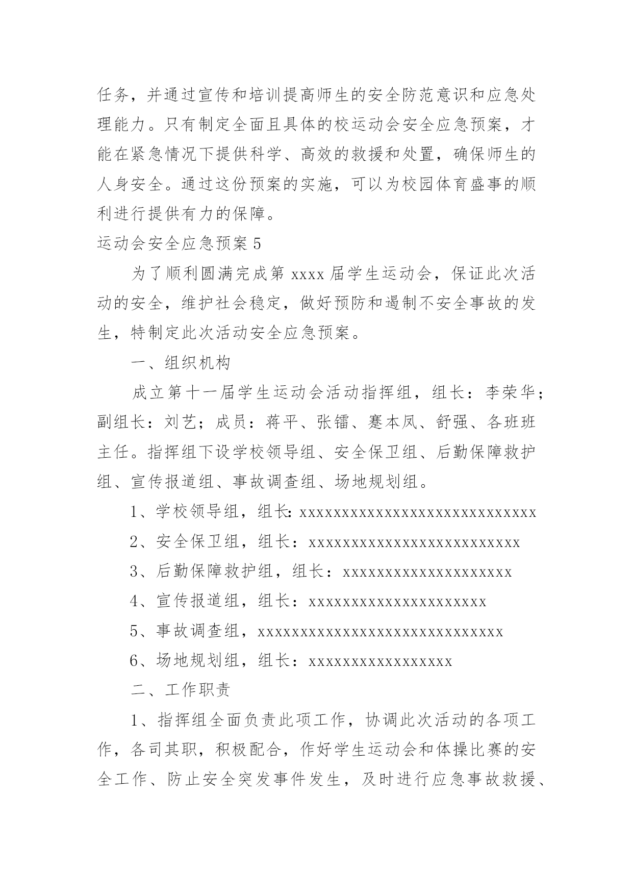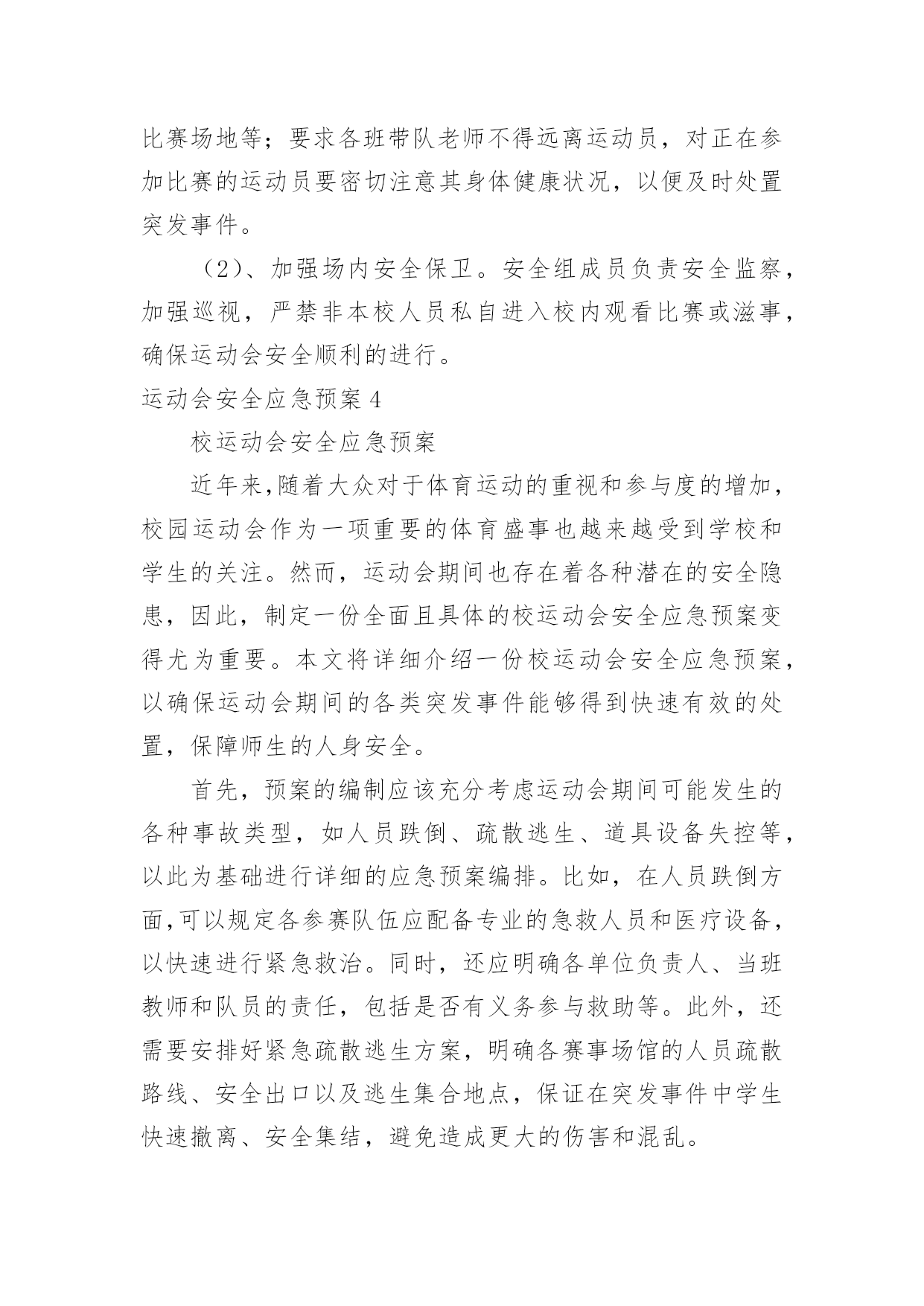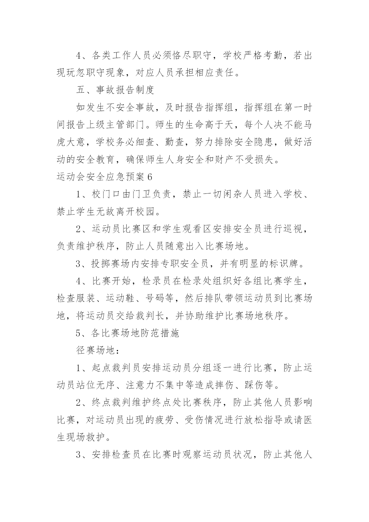 运动会安全应急预案在我们的学习、工作或生活中,难免会突发一些事故,为了避免事情往更坏的方向发展,就不得不需要事先制定应急预案。那么问题来了,应急预案应该怎么写?以下是小编整理的运动会安全应急预案,仅供参考,希望能够帮助到大家。运动会安全应急预案1xxx小学第十一届学生运动会,将于4月29日上午在石滩小学举行。为确保我校运动会顺利进行,确保学生人身安全,特制定石滩小学第十一届运动会安全预案。一、组织机构成立xxxx届学生运动会活动指挥组,组长:xxx;副组长:xxxxxxx、各班班主任。指挥组下设学校领导组、安全保卫组、后勤保障救护组、宣传报道组、事故调查组、场地规划组。一、安全工作的基本要求1.各班主任精心组织,严格把关。对所有参赛学生的身体健康状况,要进行全面细致的了解,做到底数清,情况明。对目前身体状况不适宜做剧烈运动的学生,其原有竞技运动成绩再好也不准参赛。对因盲目追求运动成绩而故意隐瞒参赛队员身体问题,出现意外的,要追究班主任等有关人员的责任。2.要全方位做好学生的安全教育工作。要求各班主任、体育老师在运动会前对本班学生进行田径运动会安全教育。要注意比赛安全。运动会前,班主任要向参赛者讲清运动前做准备活动的科学道理并教会学生做准备活动的方法,并讲明各项运动易出现的安全问题和要注意的事项。班主任老师要教育运动员在比赛中要听从指挥,不违章操作;教育非运动员在运动会期间,按照指定位置就座,文明观看比赛,不得擅自离开观看场地,严禁非运动员到比赛场地观看、接人、带跑。3.要切实加强安全保卫工作。一是增强裁判、班主任责任心。裁判员比赛前一定要认真检查场地和所用器材的'安全情况,做好负责维持比赛场地秩序,及时拾捡比赛器材,严格禁止非当时参赛的人员接近比赛场地等;要求各班班主任对正在参加比赛的运动员要密切注意其身体健康状况,以便及时处置突发事件。二是加强场内安全保卫。比赛现场由沈健、魏眀敏老师负责全天候安全监察,加强巡视,确保运动会安全顺利的进行。二、突发事件的处置1.比赛场地内出现摔伤等突发事件,首先由现场医务人员进行处置。处置有困难的及时通知家长,就近或急送市院进行救治。2.比赛场地之外出现突发事件,班主任老师要立即采取果断措施进行处置。处置有困难的,属于医疗急救方面的突发事件,要立即拨打120电话;运动会安全应急预案2开展“阳光体育展风采”为主题的校园活动,加强学生身体素质,让学生在活动中得到知识、发展能力、受到教育,得到美的'熏陶和感染,培养集体主义荣誉感。我校的艺体组筹备——20xx年春季运动会。春季运动会是安全性要求较高一种活动,必须精心组织,周密安排。为了让本次活动顺利开展特制定以下安全预案:一、春季运动会安全管理领导小组组长:XX副组长:XX组员:全体教师医务人员:镇卫生院医生一名安全保卫:XX各班班主任二、活动组织过程安全总调度:XX具体活动的安全由该项目的裁判调度。总裁判长:XX副总裁判长:XX田赛裁判长:XX径赛裁判长:XX安全保卫:XX各班主任后勤服务:XX三、安全事宜准备1、准备好应急治疗药品及器材,一旦有摔伤、跌伤、碰撞等及时处理,无法处理的及时送医院救治。2、准备好开水及葡萄糖等,预防学生脱水昏厥。3、安排部分学生做好搀扶等工作。四、应急处理:如遇学生遭受其它伤害,迅速启动学校安全事故应急处理预案,现场教师将伤病人员送往卫生院,其他教职工维护秩序,并按规定程序上报。卫生院电话:xxxxxxxxx教办电话:xxxxxxx学校电话:xxxxxxxx五、注意事项1、短跑活动中维持好跑道秩序、严禁其他学生乱窜跑道;2、所有比赛场地均划出警戒线,其他学生严禁跨越警戒线;3、严禁闲杂人进入学校和学生活动中途出校门。4、严禁学生上楼看比赛。5、各项运动比赛前要组织好运动员做好准备活动。6、运动会前分好组,反复强调注意事项,强调安全工作的重要,使学生从思想意识上高度重视。运动会安全应急预案31.各班主任精心组织,严格把关。对所有参赛学生的身体健康状况,要进行全面细致的了解,做到底数清,情况明。对目前身体状况不适宜做剧烈运动的学生,其原有竞技运动成绩再好也不准参赛。对因盲目追求运动成绩而故意隐瞒参赛队员身体问题,出现意外的,要追究班主任等有关人员的责任。2.要全方位做好学生的安全教育工作。要求各班主任、体育老师在运动会前对本班学生进行田径运动会安全教育。(1)、要注意比赛安全。运动会前,体育教师要向参赛者讲清运动前做准备活动的科学道理并教会学生做准备活动的方法,并讲明各项运动易出现的安全问题和要注意的事项。班主任老师要教育运动员在比赛中要听从指挥,不违章操作;教育非运动员在运动会期间,按照指定位置就座,文明观看比赛,若无班主任同意不得擅自离开观看场地。班主任要随时清点本班学生人数,对随便离开的.学生要及时查明原因。(2