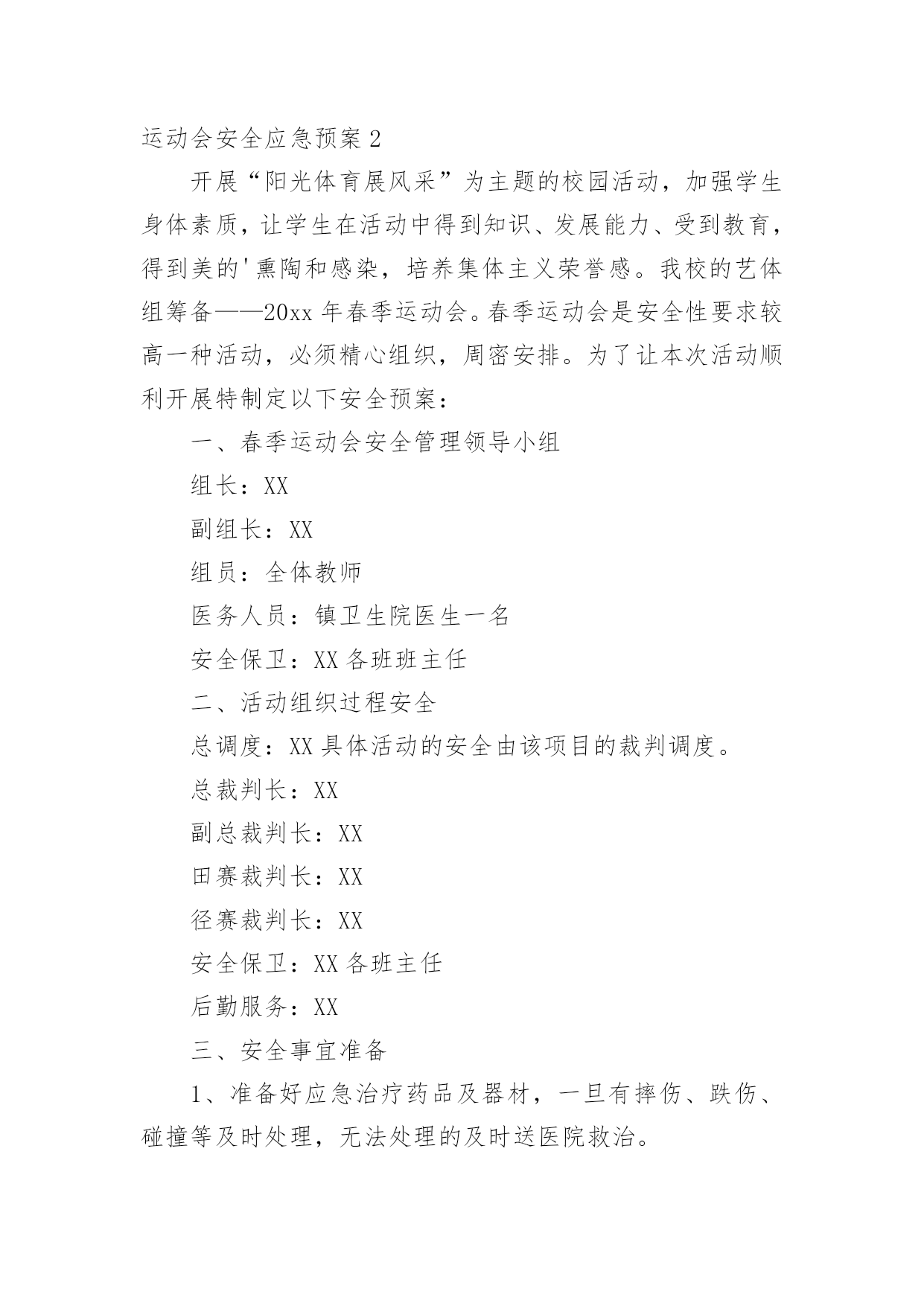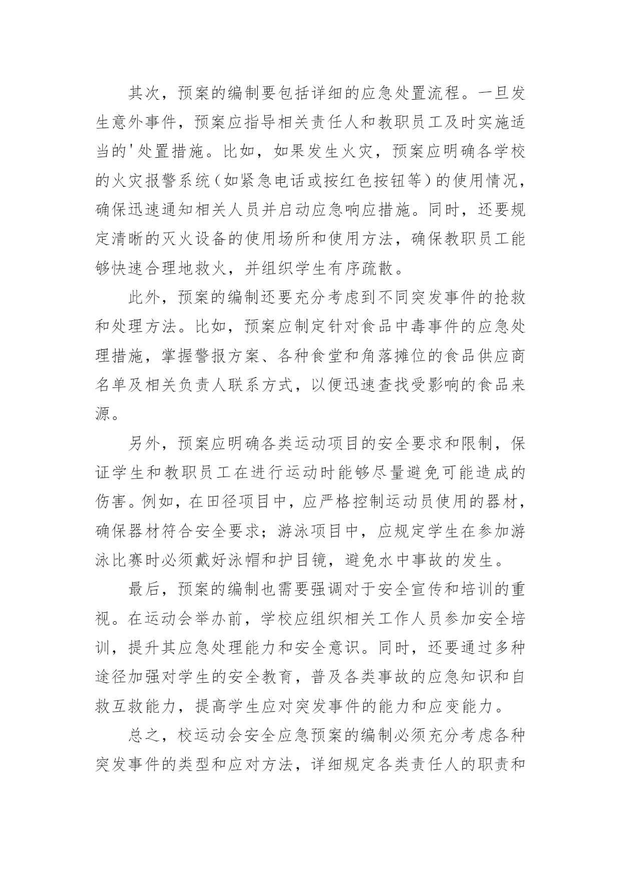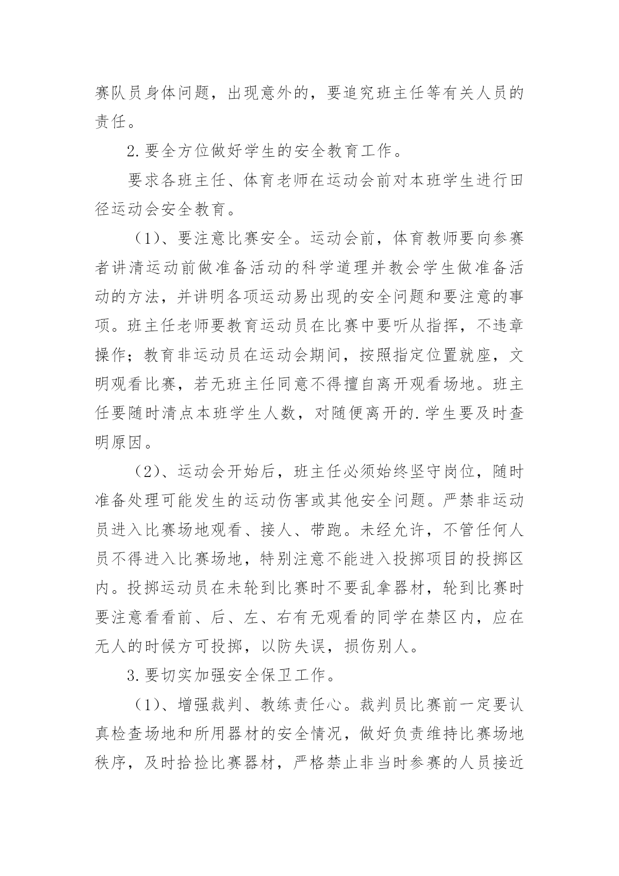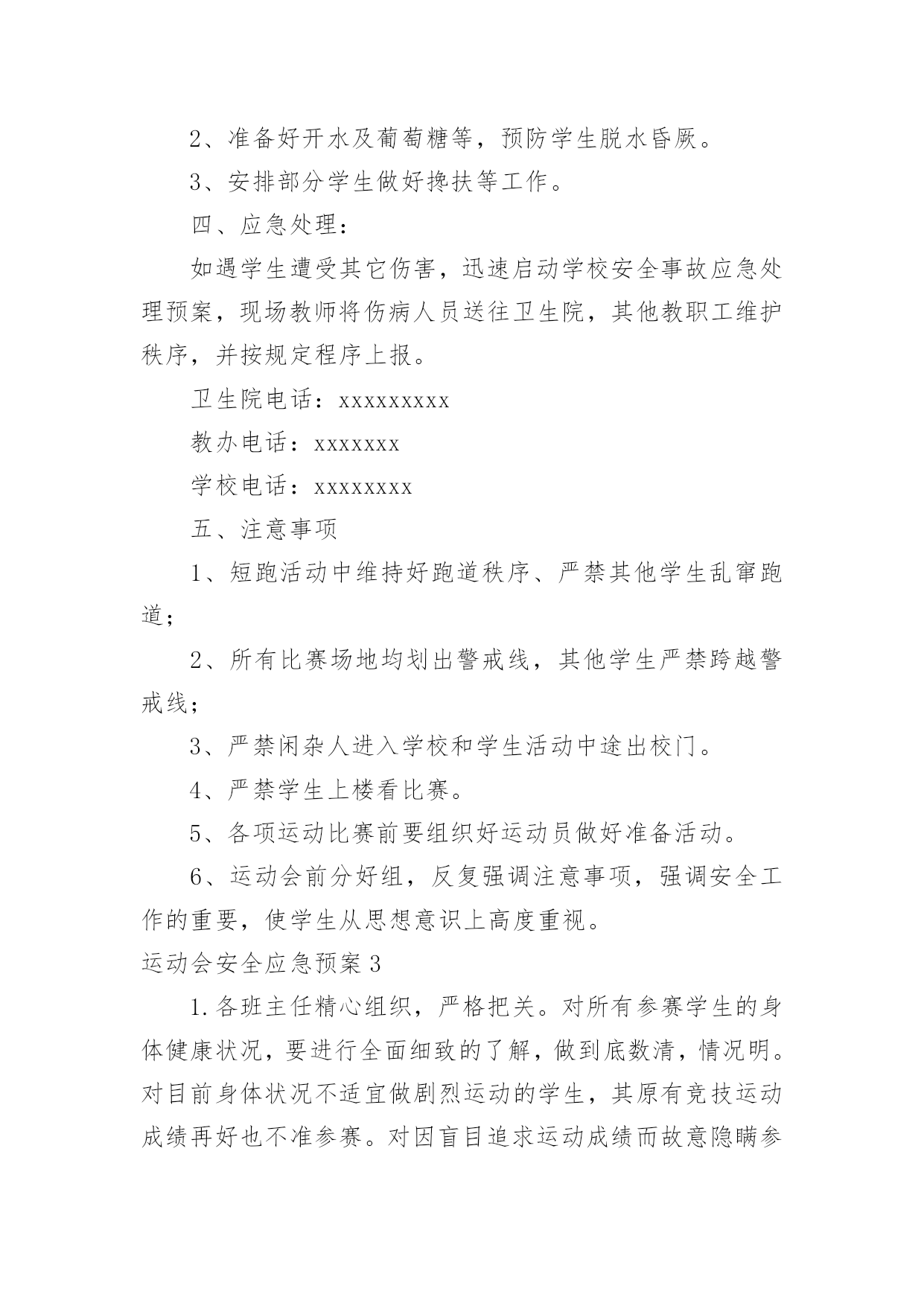运动会安全应急预案在我们的学习、工作或生活中,难免会突发一些事故,为了避免事情往更坏的方向发展,就不得不需要事先制定应急预案。那么问题来了,应急预案应该怎么写?以下是小编整理的运动会安全应急预案,仅供参考,希望能够帮助到大家。运动会安全应急预案1xxx小学第十一届学生运动会,将于4月29日上午在石滩小学举行。为确保我校运动会顺利进行,确保学生人身安全,特制定石滩小学第十一届运动会安全预案。一、组织机构成立xxxx届学生运动会活动指挥组,组长:xxx;副组长:xxxxxxx、各班班主任。指挥组下设学校领导组、安全保卫组、后勤保障救护组、宣传报道组、事故调查组、场地规划组。一、安全工作的基本要求1.各班主任精心组织,严格把关。对所有参赛学生的身体健康状况,要进行全面细致的了解,做到底数清,情况明。对目前身体状况不适宜做剧烈运动的学生,其原有竞技运动成绩再好也不准参赛。对因盲目追求运动成绩而故意隐瞒参赛队员身体问题,出现意外的,要追究班主任等有关人员的责任。2.要全方位做好学生的安全教育工作。要求各班主任、体育老师在运动会前对本班学生进行田径运动会安全教育。要注意比赛安全。运动会前,班主任要向参赛者讲清运动前做准备活动的科学道理并教会学生做准备活动的方法,并讲明各项运动易出现的安全问题和要注意的事项。班主任老师要教育运动员在比赛中要听从指挥,不违章操作;教育非运动员在运动会期间,按照指定位置就座,文明观看比赛,不得擅自离开观看场地,严禁非运动员到比赛场地观看、接人、带跑。3.要切实加强安全保卫工作。一是增强裁判、班主任责任心。裁判员比赛前一定要认真检查场地和所用器材的'安全情况,做好负责维持比赛场地秩序,及时拾捡比赛器材,严格禁止非当时参赛的人员接近比赛场地等;要求各班班主任对正在参加比赛的运动员要密切注意其身体健康状况,以便及时处置突发事件。二是加强场内安全保卫。比赛现场由沈健、魏眀敏老师负责全天候安全监察,加强巡视,确保运动会安全顺利的进行。二、突发事件的处置1.比赛场地内出现摔伤等突发事件,首先由现场医务人员进行处置。处置有困难的及时通知家长,就近或急送市院进行救治。2.比赛场地之外出现突发事件,班主任老师要立即采取果断措施进行处置。处置有困难的,属于医疗急救方面的突发事件,要立即拨打120电话;运动会安全应急预案2开展“阳光体育展风采”为主题的校园活动,加强学生身体素质,让学生在活动中得到知识、发展能力、受到教育,得到美的'熏陶和感染,培养集体主义荣誉感。我校的艺体组筹备——20xx年春季运动会。春季运动会是安全性要求较高一种活动,必须精心组织,周密安排。为了让本次活动顺利开展特制定以下安全预案:一、春季运动会安全管理领导小组组长:XX副组长:XX组员:全体教师医务人员:镇卫生院医生一名安全保卫:XX各班班主任二、活动组织过程安全总调度:XX具体活动的安全由该项目的裁判调度。总裁判长:XX副总裁判长:XX田赛裁判长:XX径赛裁判长:XX安全保卫:XX各班主任后勤服务:XX三、安全事宜准备1、准备好应急治疗药品及器材,一旦有摔伤、跌伤、碰撞等及时处理,无法处理的及时送医院救治。2、准备好开水及葡萄糖等,预防学生脱水昏厥。3、安排部分学生做好搀扶等工作。四、应急处理:如遇学生遭受其它伤害,迅速启动学校安全事故应急处理预案,现场教师将伤病人员送往卫生院,其他教职工维护秩序,并按规定程序上报。卫生院电话:xxxxxxxxx教办电话:xxxxxxx学校电话:xxxxxxxx五、注意事项1、短跑活动中维持好跑道秩序、严禁其他学生乱窜跑道;2、所有比赛场地均划出警戒线,其他学生严禁跨越警戒线;3、严禁闲杂人进入学校和学生活动中途出校门。4、严禁学生上楼看比赛。5、各项运动比赛前要组织好运动员做好准备活动。6、运动会前分好组,反复强调注意事项,强调安全工作的重要,使学生从思想意识上高度重视。运动会安全应急预案31.各班主任精心组织,严格把关。对所有参赛学生的身体健康状况,要进行全面细致的了解,做到底数清,情况明。对目前身体状况不适宜做剧烈运动的学生,其原有竞技运动成绩再好也不准参赛。对因盲目追求运动成绩而故意隐瞒参赛队员身体问题,出现意外的,要追究班主任等有关人员的责任。2.要全方位做好学生的安全教育工作。要求各班主任、体育老师在运动会前对本班学生进行田径运动会安全教育。(1)、要注意比赛安全。运动会前,体育教师要向参赛者讲清运动前做准备活动的科学道理并教会学生做准备活动的方法,并讲明各项运动易出现的安全问题和要注意的事项。班主任老师要教育运动员在比赛中要听从指挥,不违章操作;教育非运动员在运动会期间,按照指定位置就座,文明观看比赛,若无班主任同意不得擅自离开观看场地。班主任要随时清点本班学生人数,对随便离开的.学生要及时查明原因。(2
