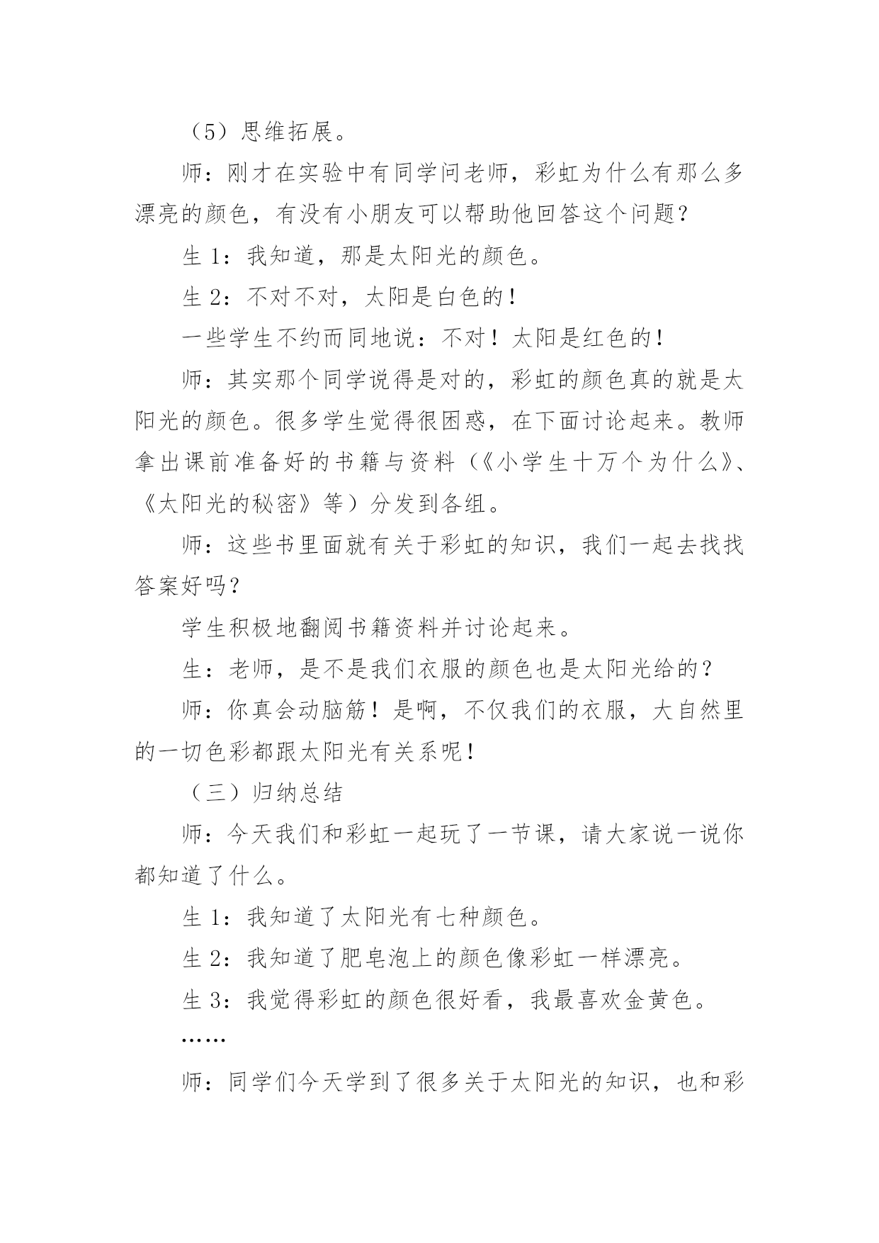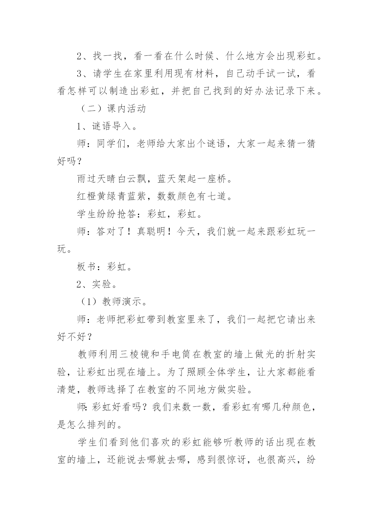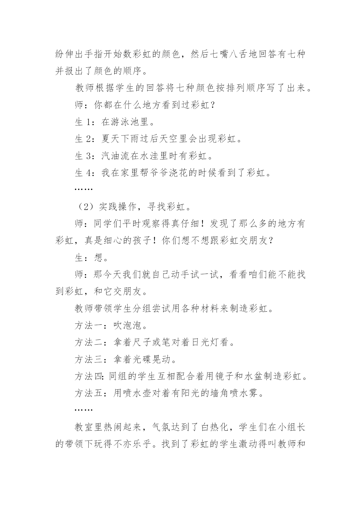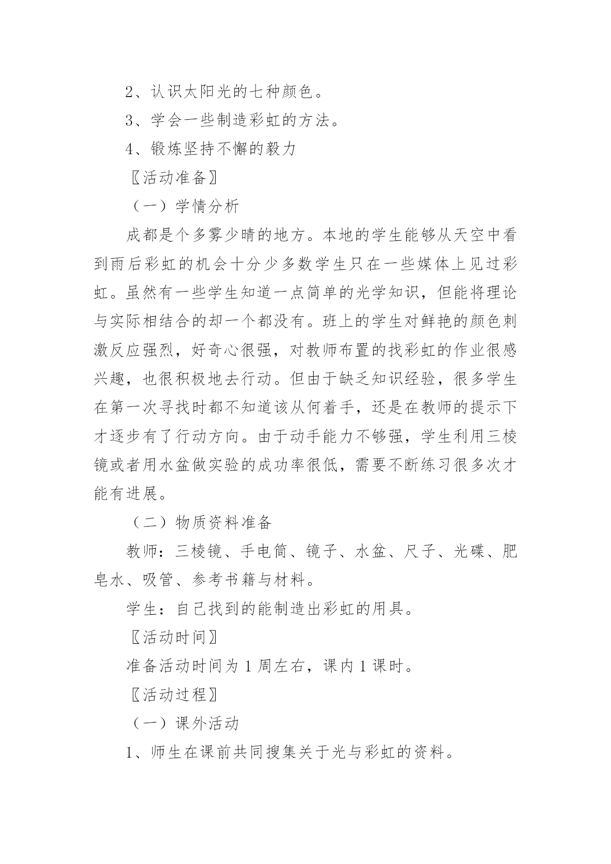 《彩虹》教学设计作为一名为他人授业解惑的教育工作者,时常需要用到教学设计,教学设计要遵循教学过程的基本规律,选择教学目标,以解决教什么的问题。怎样写教学设计才更能起到其作用呢?以下是小编为大家整理的《彩虹》教学设计,供大家参考借鉴,希望可以帮助到有需要的朋友。《彩虹》教学设计1一、复习检查课件出示:上一节课,我们学习了《彩虹》,我们知道了爸爸每天挑水浇田,很辛苦。小姑娘拿着爸爸浇花用的水壶来到彩虹桥上,洒水浇田,让爸爸变得更轻松,多么孝顺懂事的孩子啊!她还有哪些新奇有趣的想法呢?我们接着学习课文第2、3自然节。二、学习课文,边读边悟。回想读长句子的方法:注意停顿和重音1、学习第三自然段。(1)自由读第三自然段。(2)说说有几句话,你知道了什么?(本段共有3句话。“我”拿着镜子走到彩虹桥上,天上就多了一个月亮。多么丰富而充满童趣的想象!用月亮照妈妈梳头,妈妈一定高兴。)(板书:拿镜子照妈妈梳头)出示镜子和月亮照着妈妈梳头的图片,知道小姑娘的孝顺和懂事。(3)指导读。(“圆圆的镜子”重读,“天上不是多了一个月亮了吗”语调上扬。)(4)学生练读,指名读。2、学习第四自然段。(1)指名读第四自然段。(2)想象怎样把这段读好?(读出“我”在彩虹桥上荡秋千时的高兴。)(板书:荡秋千让哥哥高兴)(3)指名读,齐读。(4)词语练习:荡来荡去飘啊飘仿写造句三、回读课文、总结感悟:你觉得“我”是一个怎样的孩子?(“我”是一个关心父母、关爱家人的.人。)(板书:关心父母、关爱家人)四、拓展延伸1、知识链接:儿歌《彩虹》了解彩虹的特点和它的形成2、采摘彩虹心(生字考查)3、如果你走过彩虹桥,你希望做些什么?练习写一写。《彩虹》教学设计2〖活动目标〗1、对光的色彩有好奇心和浓厚的探索兴趣。2、认识太阳光的七种颜色。3、学会一些制造彩虹的方法。4、锻炼坚持不懈的毅力〖活动准备〗(一)学情分析成都是个多雾少晴的地方。本地的学生能够从天空中看到雨后彩虹的机会十分少多数学生只在一些媒体上见过彩虹。虽然有一些学生知道一点简单的光学知识,但能将理论与实际相结合的却一个都没有。班上的学生对鲜艳的颜色刺激反应强烈,好奇心很强,对教师布置的找彩虹的作业很感兴趣,也很积极地去行动。但由于缺乏知识经验,很多学生在第一次寻找时都不知道该从何着手,还是在教师的提示下才逐步有了行动方向。由于动手能力不够强,学生利用三棱镜或者用水盆做实验的成功率很低,需要不断练习很多次才能有进展。(二)物质资料准备教师:三棱镜、手电筒、镜子、水盆、尺子、光碟、肥皂水、吸管、参考书籍与材料。学生:自己找到的能制造出彩虹的用具。〖活动时间〗准备活动时间为1周左右,课内1课时。〖活动过程〗(一)课外活动1、师生在课前共同搜集关于光与彩虹的资料。2、找一找,看一看在什么时候、什么地方会出现彩虹。3、请学生在家里利用现有材料,自己动手试一试,看看怎样可以制造出彩虹,并把自己找到的好办法记录下来。(二)课内活动1、谜语导入。师:同学们,老师给大家出个谜语,大家一起来猜一猜好吗?雨过天晴白云飘,蓝天架起一座桥。红橙黄绿青蓝紫,数数颜色有七道。学生纷纷抢答:彩虹,彩虹。师:答对了!真聪明!今天,我们就一起来跟彩虹玩一玩。板书:彩虹。2、实验。(1)教师演示。师:老师把彩虹带到教室里来了,我们一起把它请出来好不好?教师利用三棱镜和手电筒在教室的墙上做光的折射实验,让彩虹出现在墙上。为了照顾全体学生,让大家都能看清楚,教师选择了在教室的不同地方做实验。师:彩虹好看吗?我们来数一数,看彩虹有哪几种颜色,是怎么排列的。学生们看到他们喜欢的彩虹能够听教师的话出现在教室的墙上,还能说去哪就去哪,感到很惊讶,也很高兴,纷纷伸出手指开始数彩虹的颜色,然后七嘴八舌地回答有七种并报出了颜色的顺序。教师根据学生的回答将七种颜色按排列顺序写了出来。师:你都在什么地方看到过彩虹?生1:在游泳池里。生2:夏天下雨过后天空里会出现彩虹。生3:汽油流在水洼里时有彩虹。生4:我在家里帮爷爷浇花的时候看到了彩虹。……(2)实践操作,寻找彩虹。师:同学们平时观察得真仔细!发现了那么多的地方有彩虹,真是细心的孩子!你们想不想跟彩虹交朋友?生:想。师:那今天我们就自己动手试一试,看看咱们能不能找到彩虹,和它交朋友。教师带领学生分组尝试用各种材料来制造彩虹。方法一:吹泡泡。方法二:拿着尺子或笔对着日光灯看。方法三:拿着光碟晃动。方法四:同组的学生互相配合着用镜子和水盆制造彩虹。方法五:用喷水壶对着有阳光的墙角喷水雾。……教室里热闹起来,气氛达到了白热化,学生们在小组长的带领下玩得不亦乐乎。找到了彩虹的学生激动得叫教师和其他同学看。有个学生一直找不到彩虹,很着急,组里的同学都放下自己的实验来帮助他,教师也过去鼓励他,并帮助他一起找。终于看到了彩虹,大家都