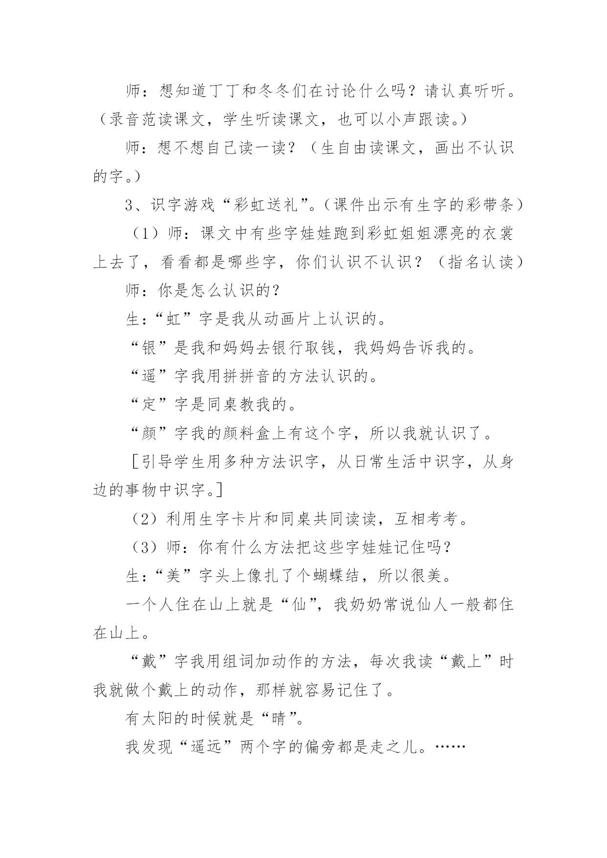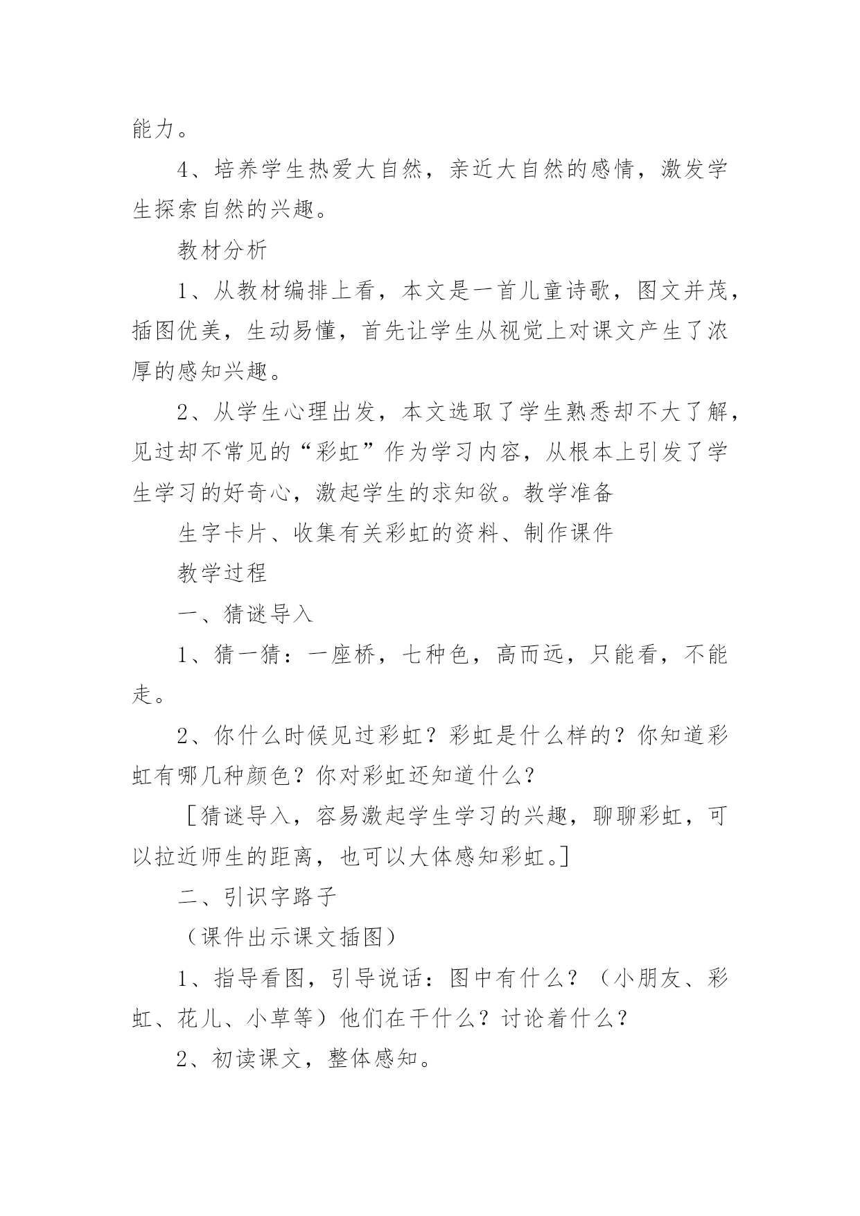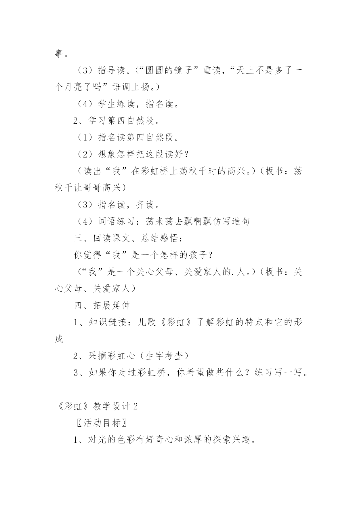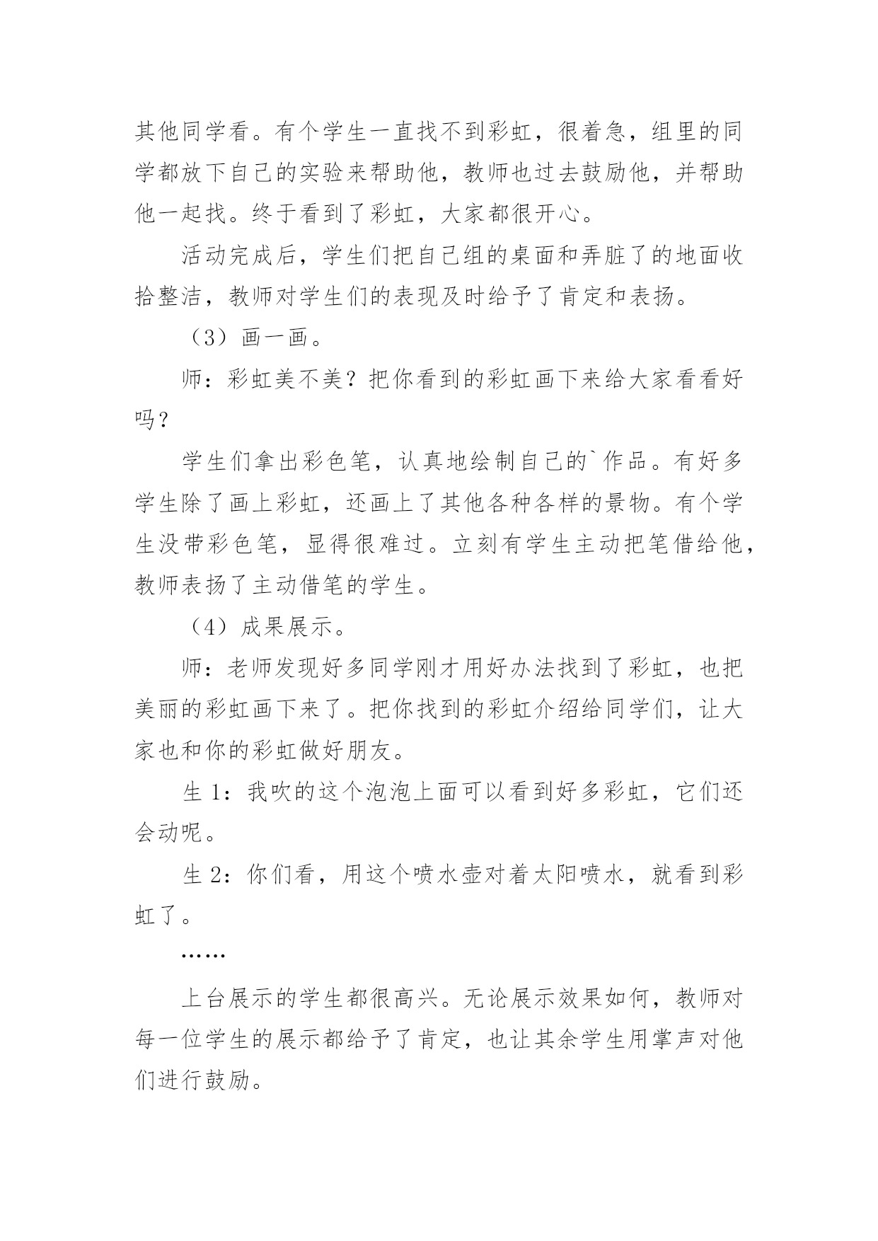 《彩虹》教学设计作为一名为他人授业解惑的教育工作者,时常需要用到教学设计,教学设计要遵循教学过程的基本规律,选择教学目标,以解决教什么的问题。怎样写教学设计才更能起到其作用呢?以下是小编为大家整理的《彩虹》教学设计,供大家参考借鉴,希望可以帮助到有需要的朋友。《彩虹》教学设计1一、复习检查课件出示:上一节课,我们学习了《彩虹》,我们知道了爸爸每天挑水浇田,很辛苦。小姑娘拿着爸爸浇花用的水壶来到彩虹桥上,洒水浇田,让爸爸变得更轻松,多么孝顺懂事的孩子啊!她还有哪些新奇有趣的想法呢?我们接着学习课文第2、3自然节。二、学习课文,边读边悟。回想读长句子的方法:注意停顿和重音1、学习第三自然段。(1)自由读第三自然段。(2)说说有几句话,你知道了什么?(本段共有3句话。“我”拿着镜子走到彩虹桥上,天上就多了一个月亮。多么丰富而充满童趣的想象!用月亮照妈妈梳头,妈妈一定高兴。)(板书:拿镜子照妈妈梳头)出示镜子和月亮照着妈妈梳头的图片,知道小姑娘的孝顺和懂事。(3)指导读。(“圆圆的镜子”重读,“天上不是多了一个月亮了吗”语调上扬。)(4)学生练读,指名读。2、学习第四自然段。(1)指名读第四自然段。(2)想象怎样把这段读好?(读出“我”在彩虹桥上荡秋千时的高兴。)(板书:荡秋千让哥哥高兴)(3)指名读,齐读。(4)词语练习:荡来荡去飘啊飘仿写造句三、回读课文、总结感悟:你觉得“我”是一个怎样的孩子?(“我”是一个关心父母、关爱家人的.人。)(板书:关心父母、关爱家人)四、拓展延伸1、知识链接:儿歌《彩虹》了解彩虹的特点和它的形成2、采摘彩虹心(生字考查)3、如果你走过彩虹桥,你希望做些什么?练习写一写。《彩虹》教学设计2〖活动目标〗1、对光的色彩有好奇心和浓厚的探索兴趣。2、认识太阳光的七种颜色。3、学会一些制造彩虹的方法。4、锻炼坚持不懈的毅力〖活动准备〗(一)学情分析成都是个多雾少晴的地方。本地的学生能够从天空中看到雨后彩虹的机会十分少多数学生只在一些媒体上见过彩虹。虽然有一些学生知道一点简单的光学知识,但能将理论与实际相结合的却一个都没有。班上的学生对鲜艳的颜色刺激反应强烈,好奇心很强,对教师布置的找彩虹的作业很感兴趣,也很积极地去行动。但由于缺乏知识经验,很多学生在第一次寻找时都不知道该从何着手,还是在教师的提示下才逐步有了行动方向。由于动手能力不够强,学生利用三棱镜或者用水盆做实验的成功率很低,需要不断练习很多次才能有进展。(二)物质资料准备教师:三棱镜、手电筒、镜子、水盆、尺子、光碟、肥皂水、吸管、参考书籍与材料。学生:自己找到的能制造出彩虹的用具。〖活动时间〗准备活动时间为1周左右,课内1课时。〖活动过程〗(一)课外活动1、师生在课前共同搜集关于光与彩虹的资料。2、找一找,看一看在什么时候、什么地方会出现彩虹。3、请学生在家里利用现有材料,自己动手试一试,看看怎样可以制造出彩虹,并把自己找到的好办法记录下来。(二)课内活动1、谜语导入。师:同学们,老师给大家出个谜语,大家一起来猜一猜好吗?雨过天晴白云飘,蓝天架起一座桥。红橙黄绿青蓝紫,数数颜色有七道。学生纷纷抢答:彩虹,彩虹。师:答对了!真聪明!今天,我们就一起来跟彩虹玩一玩。板书:彩虹。2、实验。(1)教师演示。师:老师把彩虹带到教室里来了,我们一起把它请出来好不好?教师利用三棱镜和手电筒在教室的墙上做光的折射实验,让彩虹出现在墙上。为了照顾全体学生,让大家都能看清楚,教师选择了在教室的不同地方做实验。师:彩虹好看吗?我们来数一数,看彩虹有哪几种颜色,是怎么排列的。学生们看到他们喜欢的彩虹能够听教师的话出现在教室的墙上,还能说去哪就去哪,感到很惊讶,也很高兴,纷纷伸出手指开始数彩虹的颜色,然后七嘴八舌地回答有七种并报出了颜色的顺序。教师根据学生的回答将七种颜色按排列顺序写了出来。师:你都在什么地方看到过彩虹?生1:在游泳池里。生2:夏天下雨过后天空里会出现彩虹。生3:汽油流在水洼里时有彩虹。生4:我在家里帮爷爷浇花的时候看到了彩虹。……(2)实践操作,寻找彩虹。师:同学们平时观察得真仔细!发现了那么多的地方有彩虹,真是细心的孩子!你们想不想跟彩虹交朋友?生:想。师:那今天我们就自己动手试一试,看看咱们能不能找到彩虹,和它交朋友。教师带领学生分组尝试用各种材料来制造彩虹。方法一:吹泡泡。方法二:拿着尺子或笔对着日光灯看。方法三:拿着光碟晃动。方法四:同组的学生互相配合着用镜子和水盆制造彩虹。方法五:用喷水壶对着有阳光的墙角喷水雾。……教室里热闹起来,气氛达到了白热化,学生们在小组长的带领下玩得不亦乐乎。找到了彩虹的学生激动得叫教师和其他同学看。有个学生一直找不到彩虹,很着急,组里的同学都放下自己的实验来帮助他,教师也过去鼓励他,并帮助他一起找。终于看到了彩虹,大家都