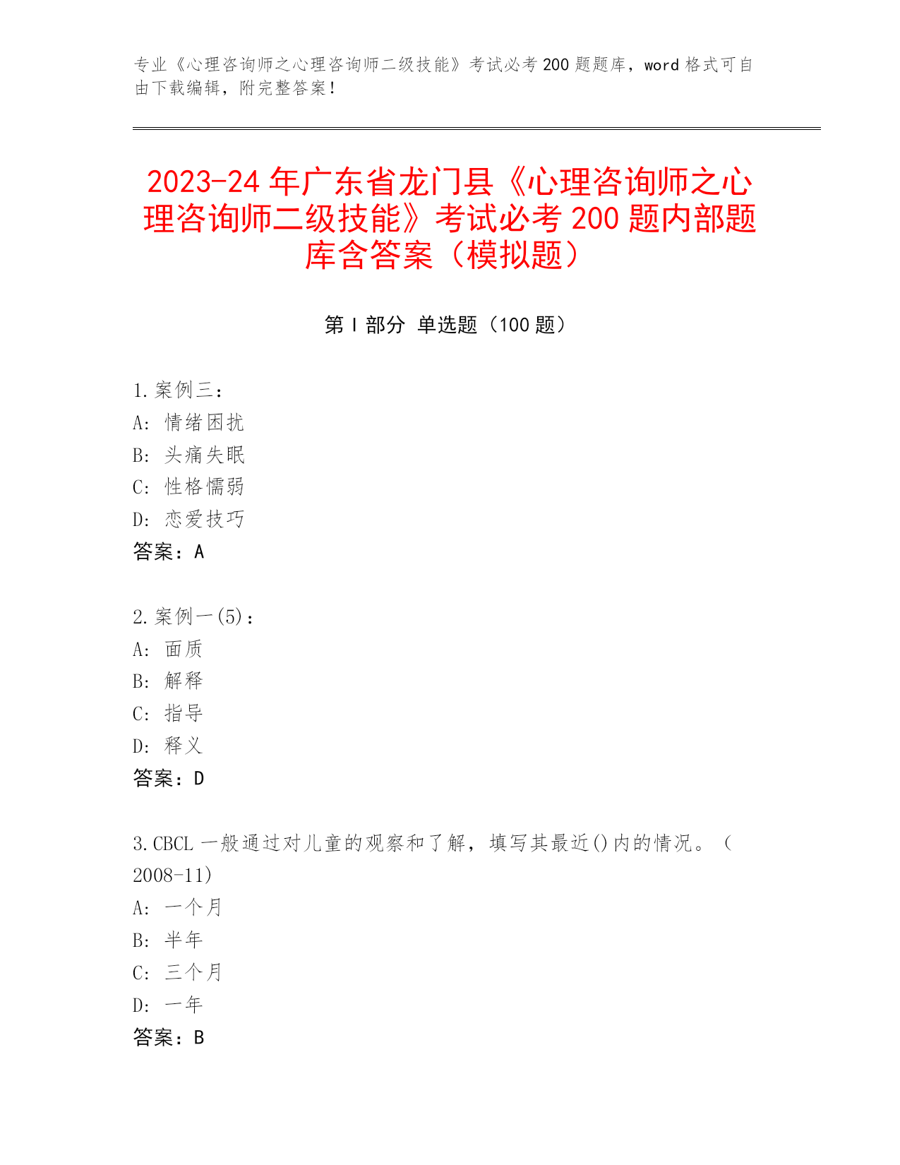 2023-24年广东省龙门县《心理咨询师之心理咨询师二级技能》考试必考200题内部题库含答案(模拟题)