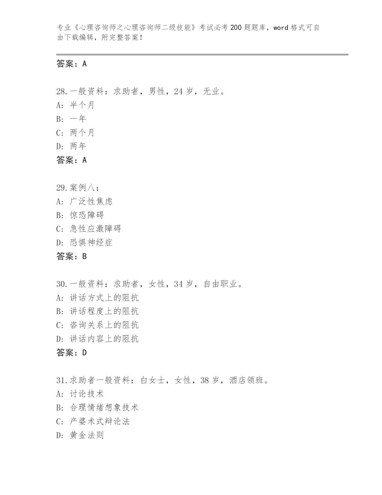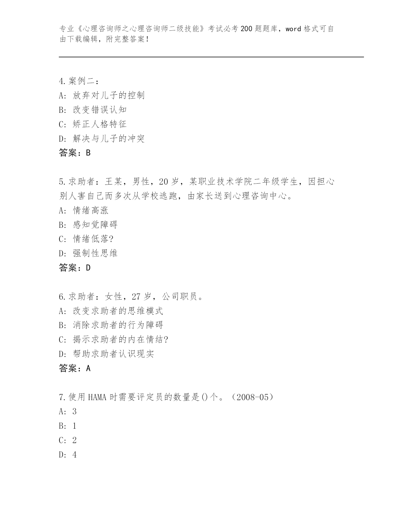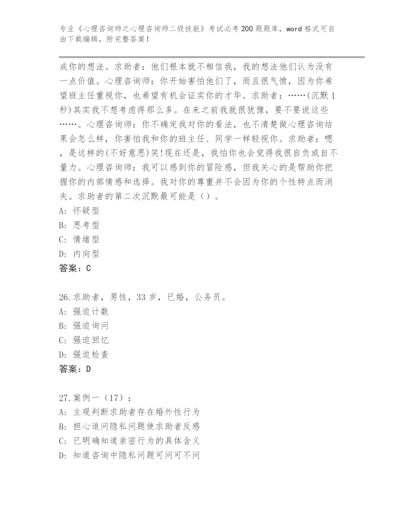 湖南省《心理咨询师之心理咨询师二级技能》考试必考200题内部题库(模拟题)
