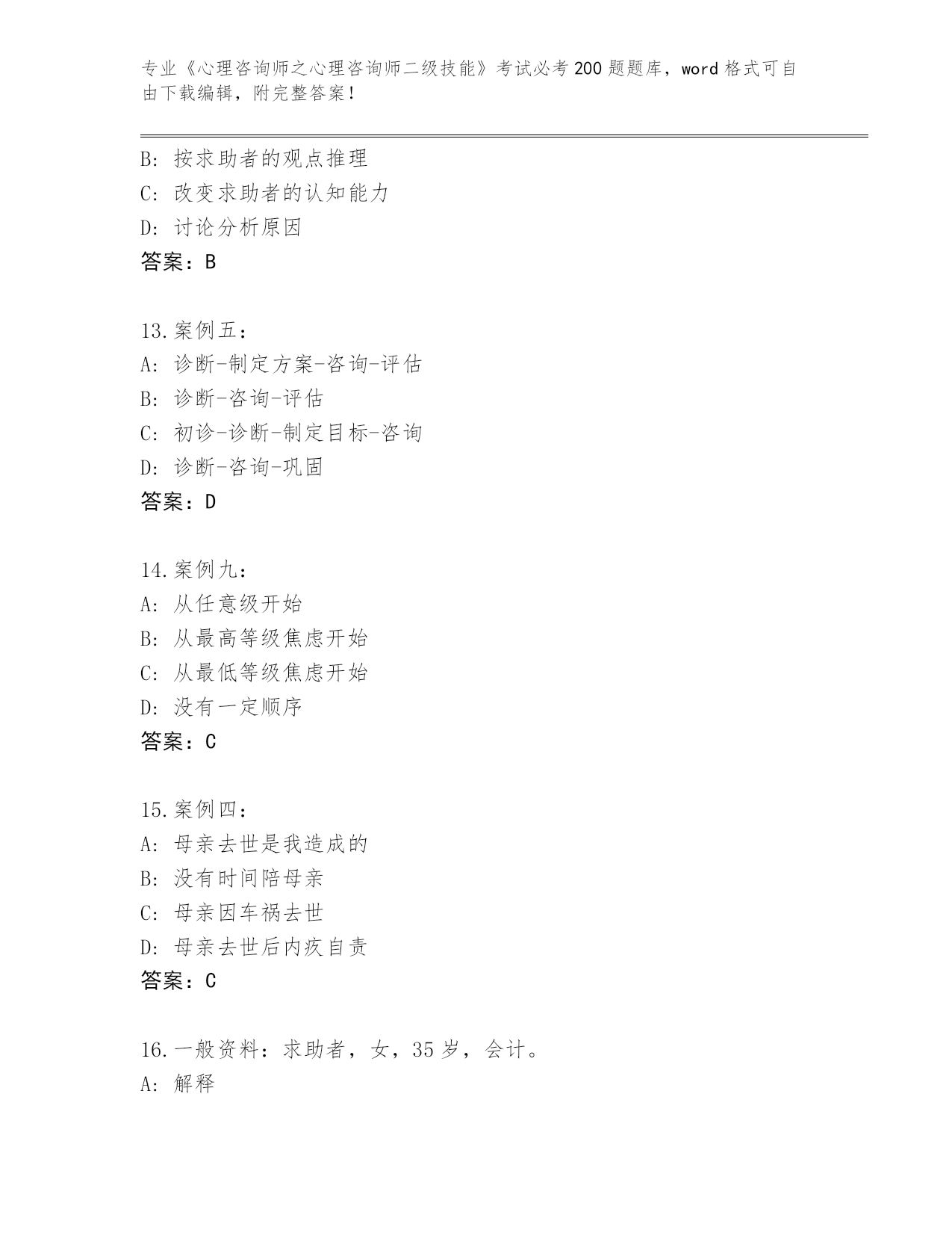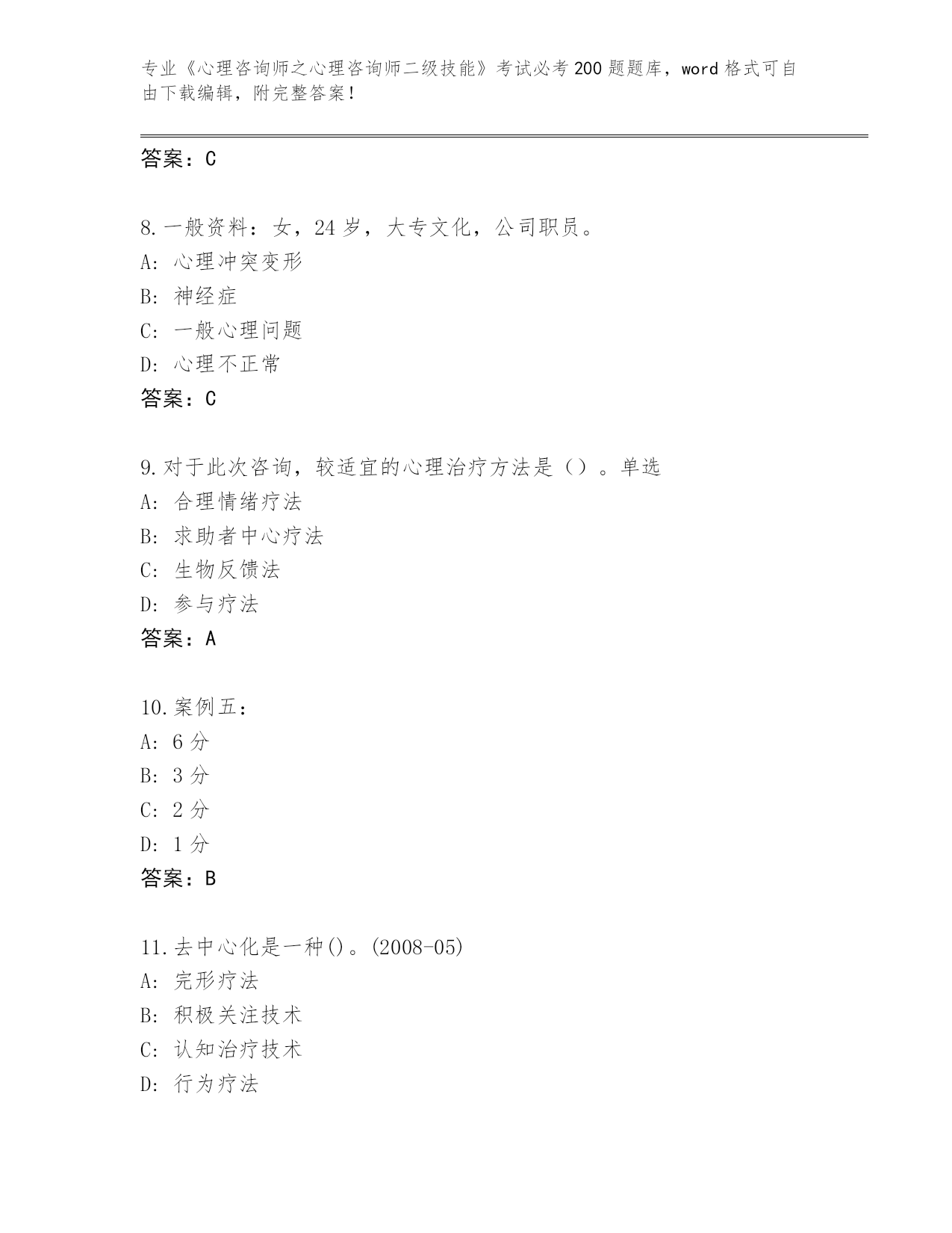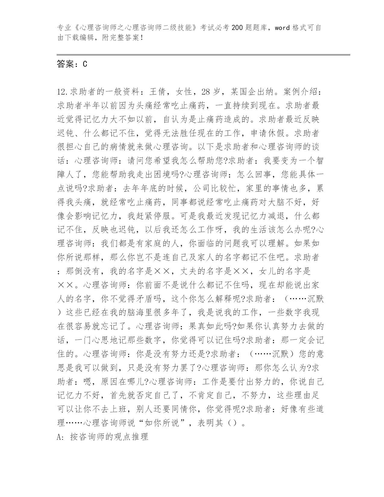 广东省2024年《心理咨询师之心理咨询师二级技能》考试必考200题内部题库及答案(真题汇编)