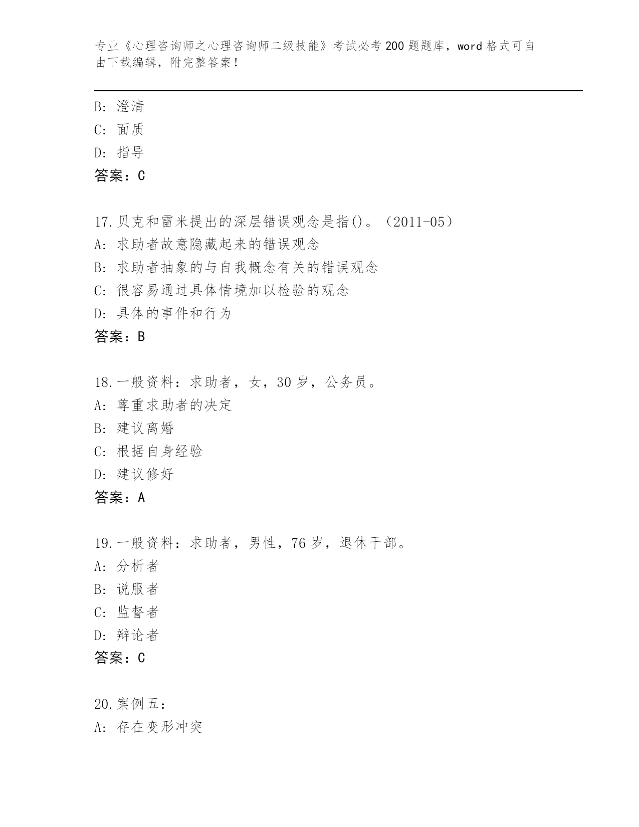 广东省浈江区内部使用《心理咨询师之心理咨询师二级技能》考试必考200题内部题库带答案下载