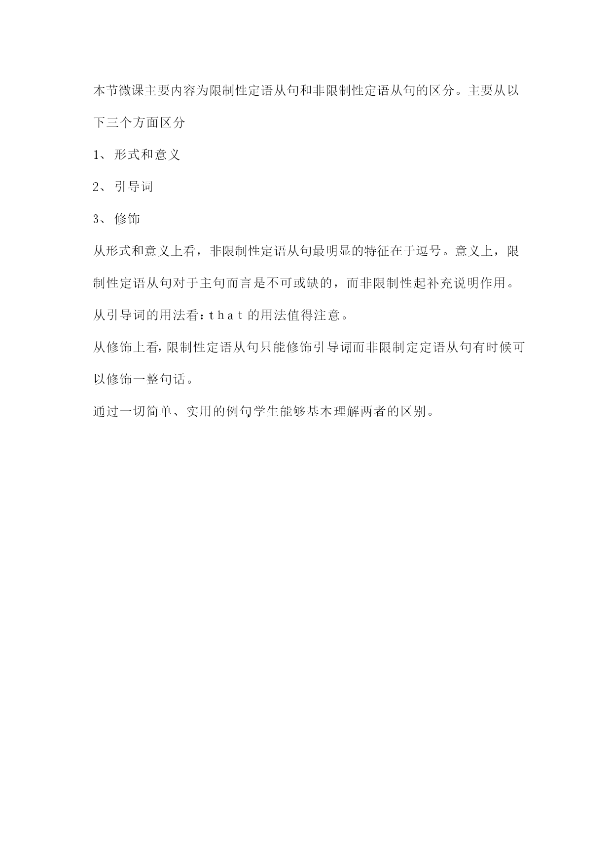 《桃花诗选读》教学设计教学目标:知识与技能目标让学生了解更多有关桃花的诗歌,以及这些诗歌中使用的主要技巧。过程与方法目标在诵读的过程中体会古代诗歌的语言美和意境美。3、情感态度与价值观目标激发学生对古代诗歌的兴趣,在诗歌中感受大自然的美和古人的情怀。教学重点:《诗经·桃夭》的解读;桃花源对后来诗人的影响;《桃花庵歌》的解读。三、教学难点:《诗经·桃夭》中比兴手法的运用,《桃花庵歌》抒发的思想情感。四、教学方法:诵读法、自主探究法、讨论分析法等。五、教学手段:借助多媒体进行写作背景和作者介绍,以期提高课堂效率。六、课时安排:1课时七、教学过程1、从歌曲《凉凉》导入,激发学生的学习兴趣,自然引出《诗经·桃夭》。2、具体赏析《诗经·桃夭》,了解这首诗的内容,比兴手法的运用,后人评价看法,以及这首诗对后世诗歌的影响。3、简要回顾《桃花源记》并向学生介绍《桃花源诗》,通过张旭的《桃花溪》和李白的《山中问答》让学生感受“桃花源”在古代文人心中的重要地位。4、具体赏析《桃花庵歌》,用知人论世的方法解读这首诗包含的思想情感,并体会这首诗中顶针和对比手法的妙处。八、布置作业1、从这些诗歌中选择至少两首背下来。2、思考:歌词《凉凉》还化用了哪些古诗词中的句子?九、板书设计《桃夭》桃花与女子比兴《桃花源记》《桃花源诗》桃花源——理想的隐居之地《桃花庵歌》自况自遣消极避世愤世嫉俗狂傲顶针对比主要教学内容文字说明本节微课主要内容为限制性定语从句和非限制性定语从句的区分。主要从以下三个方面区分形式和意义引导词修饰从形式和意义上看,非限制性定语从句最明显的特征在于逗号。意义上,限制性定语从句对于主句而言是不可或缺的,而非限制性起补充说明作用。从引导词的用法看:that的用法值得注意。从修饰上看,限制性定语从句只能修饰引导词,而非限制定定语从句有时候可以修饰一整句话。通过一切简单、实用的例句,学生能够基本理解两者的区别。