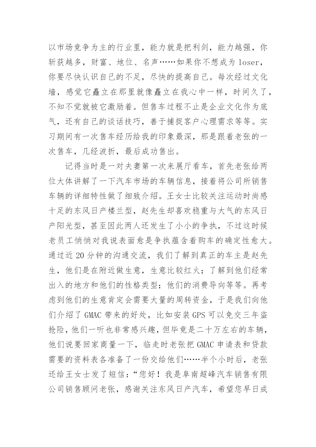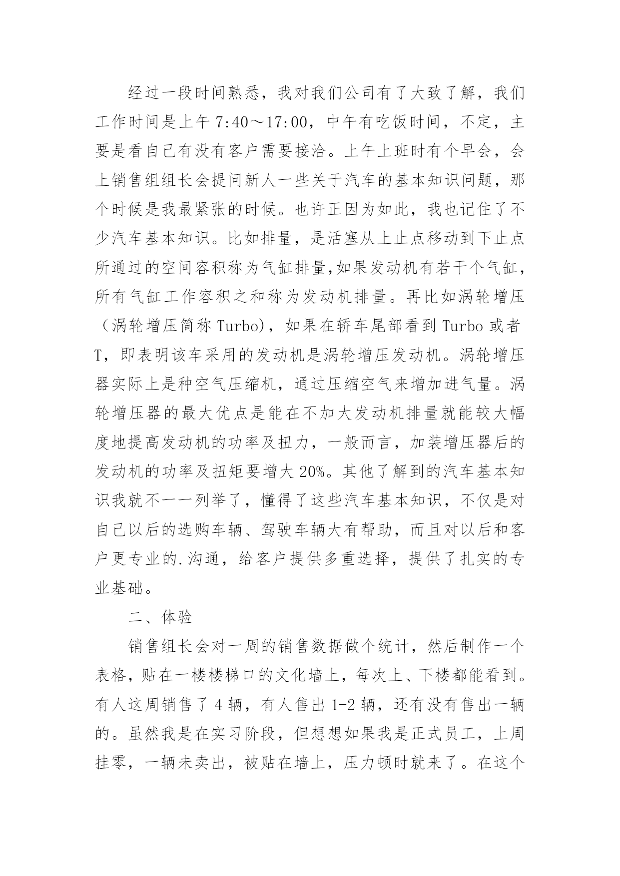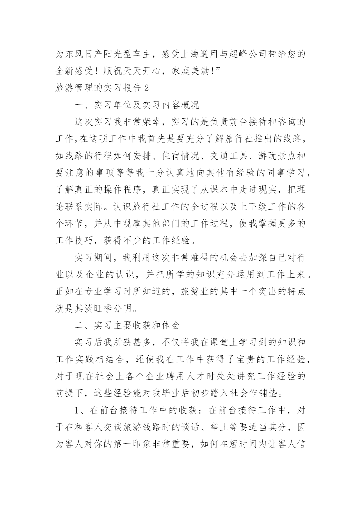 旅游管理的实习报告旅游管理的实习报告随着个人的文明素养不断提升,我们都不可避免地要接触到报告,不同种类的报告具有不同的用途。一听到写报告马上头昏脑涨?以下是小编为大家收集的旅游管理的实习报告,希望能够帮助到大家。旅游管理的实习报告1实习目的:历练自己,提升技能,运用在校期间的学习内容于实际,把握职业动态方向,毕业后在工作上能尽快适应职业环境实习时间:20xx年12月至20xx年3月实习地点:安徽省阜阳市阜南县实习内容:实习工作我选择了当一名汽车销售员,因为没有任何汽车销售经验,刚到阜南超峰汽车销售有限公司的时候,只能由老员工带着,大家都叫他老张,到陌生的环境难免紧张,我就向老张讨教公司的规章制度、功能分区及人员构成,因此而获得了职业的历练,提升了今后的职场适应能力。以下是我的详细实习经历:一、了解经过一段时间熟悉,我对我们公司有了大致了解,我们工作时间是上午7:40~17:00,中午有吃饭时间,不定,主要是看自己有没有客户需要接洽。上午上班时有个早会,会上销售组组长会提问新人一些关于汽车的基本知识问题,那个时候是我最紧张的时候。也许正因为如此,我也记住了不少汽车基本知识。比如排量,是活塞从上止点移动到下止点所通过的空间容积称为气缸排量,如果发动机有若干个气缸,所有气缸工作容积之和称为发动机排量。再比如涡轮增压(涡轮增压简称Turbo),如果在轿车尾部看到Turbo或者T,即表明该车采用的发动机是涡轮增压发动机。涡轮增压器实际上是种空气压缩机,通过压缩空气来增加进气量。涡轮增压器的最大优点是能在不加大发动机排量就能较大幅度地提高发动机的功率及扭力,一般而言,加装增压器后的发动机的功率及扭矩要增大20%。其他了解到的汽车基本知识我就不一一列举了,懂得了这些汽车基本知识,不仅是对自己以后的选购车辆、驾驶车辆大有帮助,而且对以后和客户更专业的.沟通,给客户提供多重选择,提供了扎实的专业基础。二、体验销售组长会对一周的销售数据做个统计,然后制作一个表格,贴在一楼楼梯口的文化墙上,每次上、下楼都能看到。有人这周销售了4辆,有人售出1-2辆,还有没有售出一辆的。虽然我是在实习阶段,但想想如果我是正式员工,上周挂零,一辆未卖出,被贴在墙上,压力顿时就来了。在这个以市场竞争为主的行业里,能力就是把利剑,能力越强,你斩获越多,财富、地位、名声……如果你不想成为loser,你要尽快认识自己的不足,尽快的提高自己。每次经过文化墙,感觉它矗立在那里就像矗立在我心中一样,时间久了,不知不觉就被它激励着。但售车过程不止是企业文化作为底气,还有自己的谈话技巧,善于捕捉客户心理需求等等。实习期间有一次售车经历给我的印象最深,那是跟着老张的一次售车,几经波折,最后成功售出。记得当时是一对夫妻第一次来展厅看车,首先老张给两位大体讲解了一下汽车市场的车辆信息,接着将公司所销售车辆的详细特性做了细致介绍。王女士比较关注运动时尚感十足的东风日产楼兰型,赵先生却喜欢稳重与大气的东风日产阳光型,甚至因此两人还发生了小小的争执,不过这时候老员工悄悄对我说表面愈是争执蕴含着购车的确定性愈大。通过近20分钟的沟通交流,我们了解到真正的车主是赵先生,他们是在附近做生意,生意比较红火;了解到他们经常出入的地方和他们的性格类型;他们的消费导向等等。再考虑到他们的生意肯定会需要大量的周转资金,于是我们向他们介绍了GMAC带来的好处,比如安装GPS可以免交三年盗抢险,他们一听也非常感兴趣,但毕竟是二十万左右的车辆,他们说要回家商量一下,临走时老张把GMAC申请表和贷款需要的资料表各准备了一份交给他们……半个小时后,老张还给王女士发了短信:“您好!我是阜南超峰汽车销售有限公司销售顾问老张,感谢关注东风日产汽车,希望您早日成为东风日产阳光型车主,感受上海通用与超峰公司带给您的全新感受!顺祝天天开心,家庭美满!”旅游管理的实习报告2一、实习单位及实习内容概况这次实习我非常荣幸,实习的是负责前台接待和咨询的工作,在这项工作中我首先是要充分了解旅行社推出的线路,如线路的行程如何安排、住宿情况、交通工具、游玩景点和要注意的事项等等我十分认真地向其他有经验的同事学习,了解真正的操作程序,真正实现了从课本中走进现实,把理论联系实际。认识旅行社工作的全过程以及上下级工作的各个环节,并从中观摩其他部门的工作过程,使我掌握更多的工作技巧,获得不少的工作经验。实习期间,我利用这次非常难得的机会去加深自己对行业以及企业的认识,并把所学的知识充分运用到工作上来。正如在专业学习时所知道的,旅游业的其中一个突出的特点就是其淡旺季分明。二、实习主要收获和体会实习后我所获甚多,不仅将我在课堂上学习到的知识和工作实践相结合,还使我在工作中获得了宝贵的工作经验,对于现在社会上各个企业聘用人才时处处讲究工作经验的前提下,这些经
