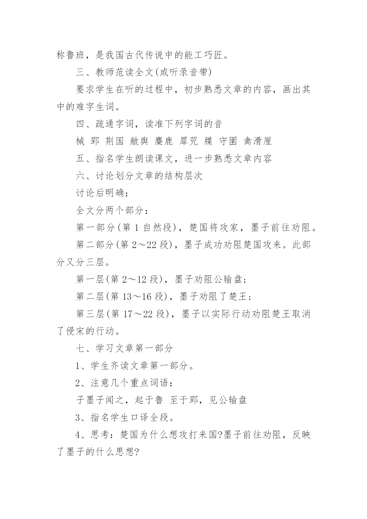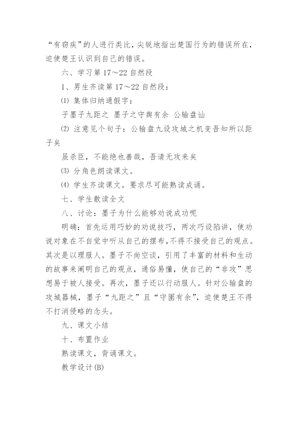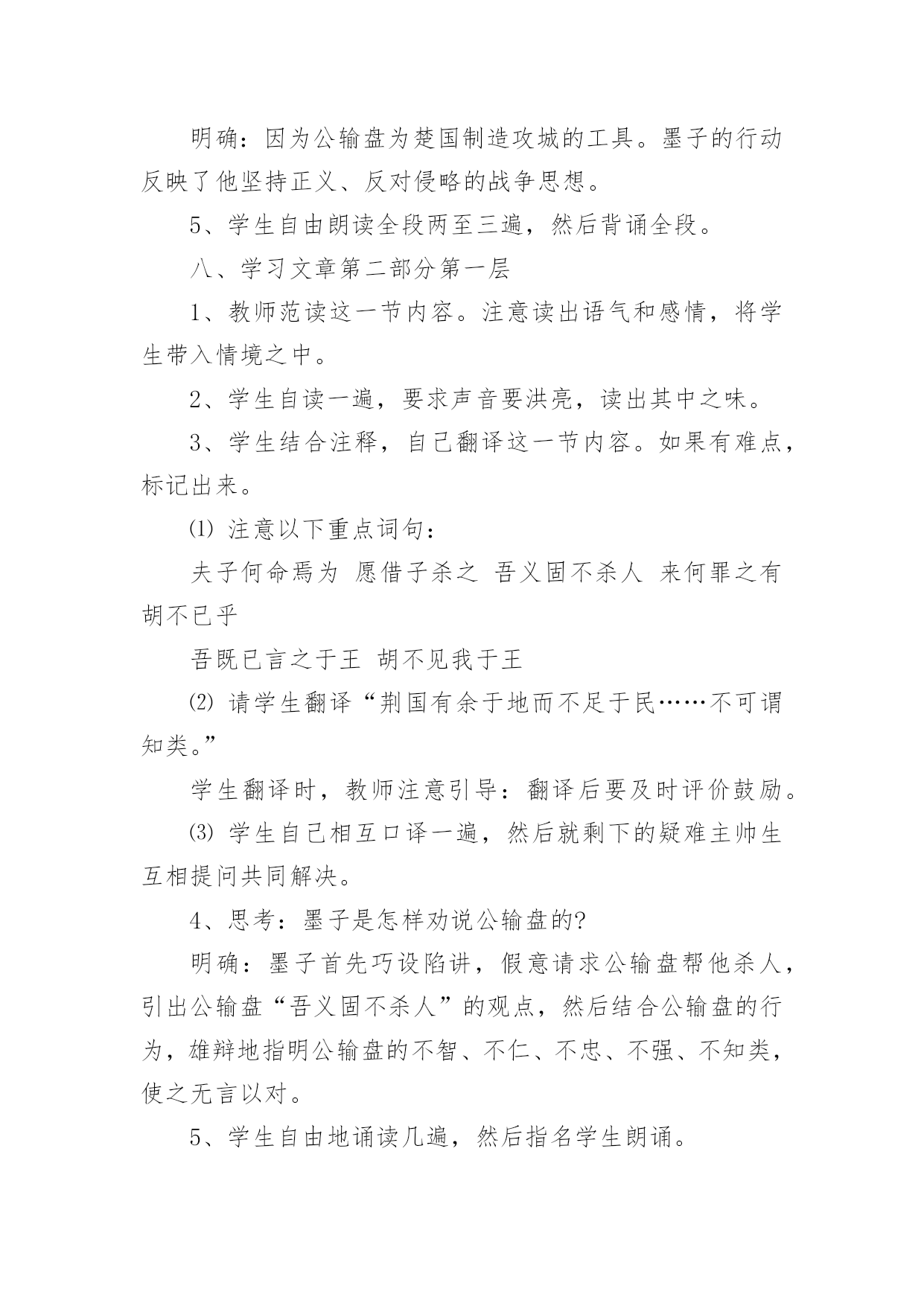 公输-教学设计【说明】这篇文章记述了墨子制止楚国攻来的故事。墨子不仅以“非攻”的主张说服了对方,而且以实际的守御力量制服了对方,终于迫使楚王取消了这次侵略行动。在论辩中,墨子引用了丰富的材料、通俗生动的故事来阐明自己的观点,劝说巧妙,言辞犀利,具有很强的故事性和逻辑性。教学时应以点拨为主,诵读要贯穿始终,疏通着眼于理解重点词句,强调整体感知。【课时安排】二课时。第一课时一、导入课文可由杜甫的《兵车行》或第一、二次世界大战的巨大损失,引出当今世界的两大主题:和平与发展。从和平中联系黑子的“非攻”思想,引出课题。二、介绍作者、释题1、《墨子》:是墨子和其弟子、再传弟子的言论总汇,现存53篇。全书思想严密,自成体系,文章质朴,逻辑性强。墨子,名翟,鲁国人,墨家学派的创始人,春秋战国之际的思想家。他的思想主要是“兼爱”“尚贤”“非攻”“节用”,基本上反映了劳动者、小生产者的利益和愿望。2、公输:名盘,一作“般”,或作“班”,鲁国人,又称鲁班,是我国古代传说中的能工巧匠。三、教师范读全文(或听录音带)要求学生在听的过程中,初步熟悉文章的内容,画出其中的难字生词。四、疏通字词,读准下列字词的音械郢荆国敝舆麋鹿犀兕牒守圉禽滑厘五、指名学生朗读课文,进一步熟悉文章内容六、讨论划分文章的结构层次讨论后明确:全文分两个部分:第一部分(第1自然段),楚国将攻家,墨子前往劝阻。第二部分(第2~22段),墨子成功劝阻楚国攻来。此部分又分三层。第一层(第2~12段),墨子劝阻公输盘;第二层(第13~16段),墨子劝阻了楚王;第三层(第17~22段),墨子以实际行动劝阻楚王取消了侵宋的行动。七、学习文章第一部分1、学生齐读文章第一部分。2、注意几个重点词语:子墨子闻之,起于鲁至于郢,见公输盘3、指名学生口译全段。4、思考:楚国为什么想攻打来国?墨子前往劝阻,反映了墨子的什么思想?明确:因为公输盘为楚国制造攻城的工具。墨子的行动反映了他坚持正义、反对侵略的战争思想。5、学生自由朗读全段两至三遍,然后背诵全段。八、学习文章第二部分第一层1、教师范读这一节内容。注意读出语气和感情,将学生带入情境之中。2、学生自读一遍,要求声音要洪亮,读出其中之味。3、学生结合注释,自己翻译这一节内容。如果有难点,标记出来。⑴注意以下重点词句:夫子何命焉为愿借子杀之吾义固不杀人来何罪之有胡不已乎吾既已言之于王胡不见我于王⑵请学生翻译“荆国有余于地而不足于民……不可谓知类。”学生翻译时,教师注意引导:翻译后要及时评价鼓励。⑶学生自己相互口译一遍,然后就剩下的疑难主帅生互相提问共同解决。4、思考:墨子是怎样劝说公输盘的?明确:墨子首先巧设陷讲,假意请求公输盘帮他杀人,引出公输盘“吾义固不杀人”的观点,然后结合公输盘的行为,雄辩地指明公输盘的不智、不仁、不忠、不强、不知类,使之无言以对。5、学生自由地诵读几遍,然后指名学生朗诵。6、师生齐读这一节内容。九、布置作业1、背诵所学的内容。2、翻译第三部分第一层。第二课时一、检查作业,简单回顾上课时所学内容二、学习第二部分第二层1、让学生听录音带,然后跟读,体会文章的语气、语调。2、请学生释泽重点语句。请注意以下语句:舍其文轩,邻有弊舆而欲窃之。必为有窗疾也。宋之地,方五百里,此犹文轩之与弊舆也。臣以王吏之攻家也,为与此同类。三、师生共同翻译第十三段和第十五段。注意老师声音要洪亮,学生轻声跟着翻译注意落实重点字词。四、分角色朗读这一节内容朗读时要注意各自的语气。楚王表现的是一种骄横之气,而墨子是进行劝说,话中多排比句,有理而气势磅键。五、学生散读该内容,然后思考:墨子是采用什么方法劝说楚王的明确:采用了类比的方法。首先同样巧设陷饼,引出楚王的判断:“必为有窃疾也。”然后将楚国的国势、行为与“有窃疾”的人进行类比,尖锐地指出楚国行为的错误所在,迫使楚王认识到自己的错误。六、学习第17~22自然段1、男生齐读第17~22自然段:⑴集体归纳通假字:子墨子九距之墨子之守舆有余公输盘讪⑵注意见个句子:公输盘九设攻城之机变吾知所以距子矣虽杀臣,不能绝也善哉,吾请无攻来矣⑶分角色朗读课文。⑷学生齐读课文。要求尽可能熟读成诵。七、学生散读全文八、讨论:墨子为什么能够劝说成功呢明确:首先运用巧妙的劝说技巧,两次巧设陷讲,使劝说对象在不自觉中听从自己的摆布,不得不接受自己的观点。其次是以理服人。墨子不尚空谈,引用了丰富的材料和生动的故事来阐明自己的观点,通俗易懂,使自己的“非攻”思想易于被人接受。再次,墨子还以行动服人。针对公输盘的攻城器械,墨子“九距之”且“守圉有余”,迫使楚王不得不打消侵略的念头。九、课文小结十、布置作业熟读课文,背诵课文。教学设计(B)第一课时一、课文导入,调动情绪二、教师有表情的范读课文教师范读一定要充分准备,把握语气、语调,力争把学