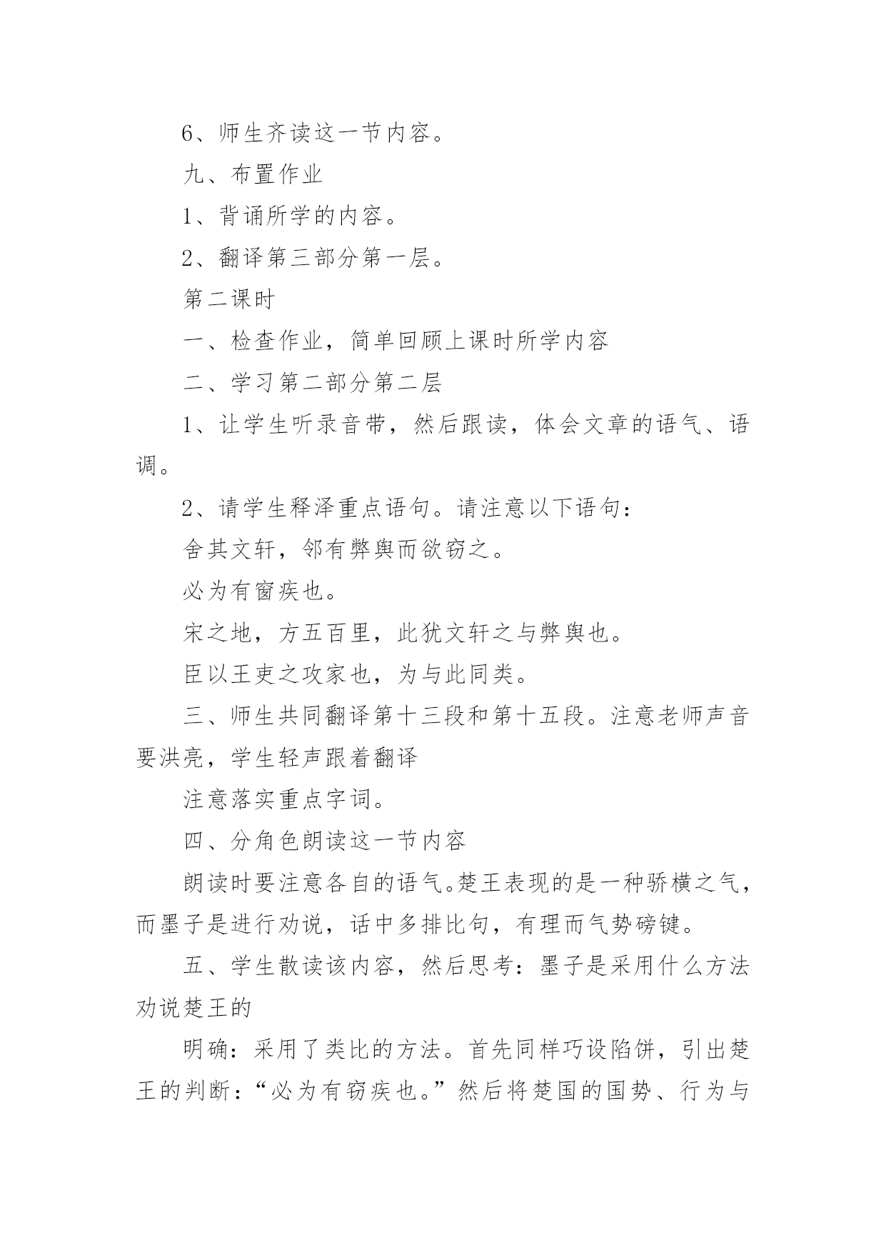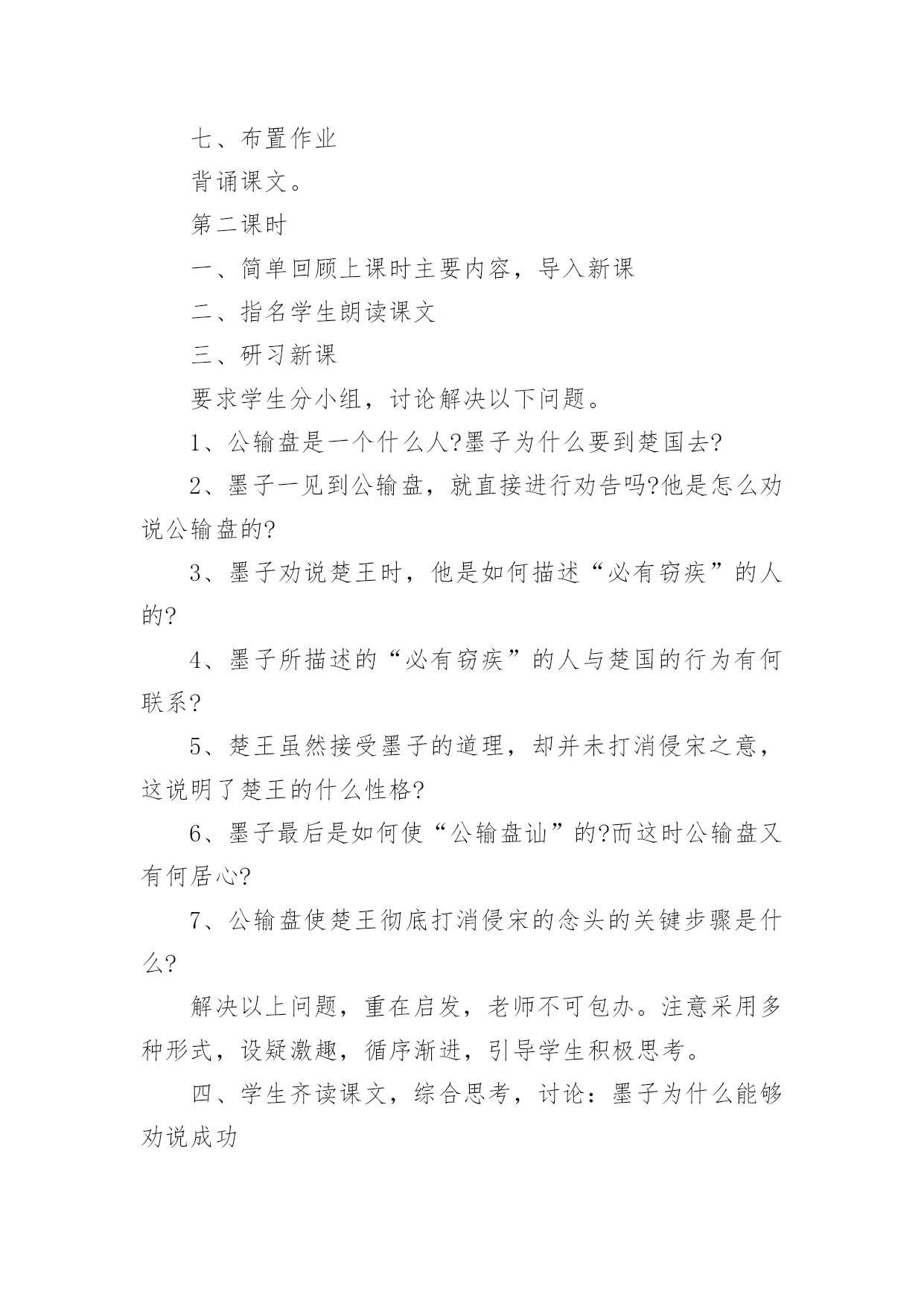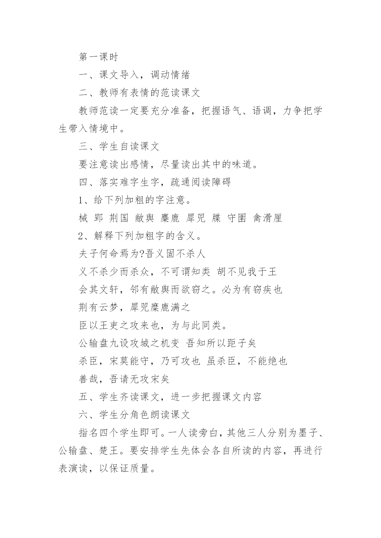 公输-教学设计【说明】这篇文章记述了墨子制止楚国攻来的故事。墨子不仅以“非攻”的主张说服了对方,而且以实际的守御力量制服了对方,终于迫使楚王取消了这次侵略行动。在论辩中,墨子引用了丰富的材料、通俗生动的故事来阐明自己的观点,劝说巧妙,言辞犀利,具有很强的故事性和逻辑性。教学时应以点拨为主,诵读要贯穿始终,疏通着眼于理解重点词句,强调整体感知。【课时安排】二课时。第一课时一、导入课文可由杜甫的《兵车行》或第一、二次世界大战的巨大损失,引出当今世界的两大主题:和平与发展。从和平中联系黑子的“非攻”思想,引出课题。二、介绍作者、释题1、《墨子》:是墨子和其弟子、再传弟子的言论总汇,现存53篇。全书思想严密,自成体系,文章质朴,逻辑性强。墨子,名翟,鲁国人,墨家学派的创始人,春秋战国之际的思想家。他的思想主要是“兼爱”“尚贤”“非攻”“节用”,基本上反映了劳动者、小生产者的利益和愿望。2、公输:名盘,一作“般”,或作“班”,鲁国人,又称鲁班,是我国古代传说中的能工巧匠。三、教师范读全文(或听录音带)要求学生在听的过程中,初步熟悉文章的内容,画出其中的难字生词。四、疏通字词,读准下列字词的音械郢荆国敝舆麋鹿犀兕牒守圉禽滑厘五、指名学生朗读课文,进一步熟悉文章内容六、讨论划分文章的结构层次讨论后明确:全文分两个部分:第一部分(第1自然段),楚国将攻家,墨子前往劝阻。第二部分(第2~22段),墨子成功劝阻楚国攻来。此部分又分三层。第一层(第2~12段),墨子劝阻公输盘;第二层(第13~16段),墨子劝阻了楚王;第三层(第17~22段),墨子以实际行动劝阻楚王取消了侵宋的行动。七、学习文章第一部分1、学生齐读文章第一部分。2、注意几个重点词语:子墨子闻之,起于鲁至于郢,见公输盘3、指名学生口译全段。4、思考:楚国为什么想攻打来国?墨子前往劝阻,反映了墨子的什么思想?明确:因为公输盘为楚国制造攻城的工具。墨子的行动反映了他坚持正义、反对侵略的战争思想。5、学生自由朗读全段两至三遍,然后背诵全段。八、学习文章第二部分第一层1、教师范读这一节内容。注意读出语气和感情,将学生带入情境之中。2、学生自读一遍,要求声音要洪亮,读出其中之味。3、学生结合注释,自己翻译这一节内容。如果有难点,标记出来。⑴注意以下重点词句:夫子何命焉为愿借子杀之吾义固不杀人来何罪之有胡不已乎吾既已言之于王胡不见我于王⑵请学生翻译“荆国有余于地而不足于民……不可谓知类。”学生翻译时,教师注意引导:翻译后要及时评价鼓励。⑶学生自己相互口译一遍,然后就剩下的疑难主帅生互相提问共同解决。4、思考:墨子是怎样劝说公输盘的?明确:墨子首先巧设陷讲,假意请求公输盘帮他杀人,引出公输盘“吾义固不杀人”的观点,然后结合公输盘的行为,雄辩地指明公输盘的不智、不仁、不忠、不强、不知类,使之无言以对。5、学生自由地诵读几遍,然后指名学生朗诵。6、师生齐读这一节内容。九、布置作业1、背诵所学的内容。2、翻译第三部分第一层。第二课时一、检查作业,简单回顾上课时所学内容二、学习第二部分第二层1、让学生听录音带,然后跟读,体会文章的语气、语调。2、请学生释泽重点语句。请注意以下语句:舍其文轩,邻有弊舆而欲窃之。必为有窗疾也。宋之地,方五百里,此犹文轩之与弊舆也。臣以王吏之攻家也,为与此同类。三、师生共同翻译第十三段和第十五段。注意老师声音要洪亮,学生轻声跟着翻译注意落实重点字词。四、分角色朗读这一节内容朗读时要注意各自的语气。楚王表现的是一种骄横之气,而墨子是进行劝说,话中多排比句,有理而气势磅键。五、学生散读该内容,然后思考:墨子是采用什么方法劝说楚王的明确:采用了类比的方法。首先同样巧设陷饼,引出楚王的判断:“必为有窃疾也。”然后将楚国的国势、行为与“有窃疾”的人进行类比,尖锐地指出楚国行为的错误所在,迫使楚王认识到自己的错误。六、学习第17~22自然段1、男生齐读第17~22自然段:⑴集体归纳通假字:子墨子九距之墨子之守舆有余公输盘讪⑵注意见个句子:公输盘九设攻城之机变吾知所以距子矣虽杀臣,不能绝也善哉,吾请无攻来矣⑶分角色朗读课文。⑷学生齐读课文。要求尽可能熟读成诵。七、学生散读全文八、讨论:墨子为什么能够劝说成功呢明确:首先运用巧妙的劝说技巧,两次巧设陷讲,使劝说对象在不自觉中听从自己的摆布,不得不接受自己的观点。其次是以理服人。墨子不尚空谈,引用了丰富的材料和生动的故事来阐明自己的观点,通俗易懂,使自己的“非攻”思想易于被人接受。再次,墨子还以行动服人。针对公输盘的攻城器械,墨子“九距之”且“守圉有余”,迫使楚王不得不打消侵略的念头。九、课文小结十、布置作业熟读课文,背诵课文。教学设计(B)第一课时一、课文导入,调动情绪二、教师有表情的范读课文教师范读一定要充分准备,把握语气、语调,力争把学