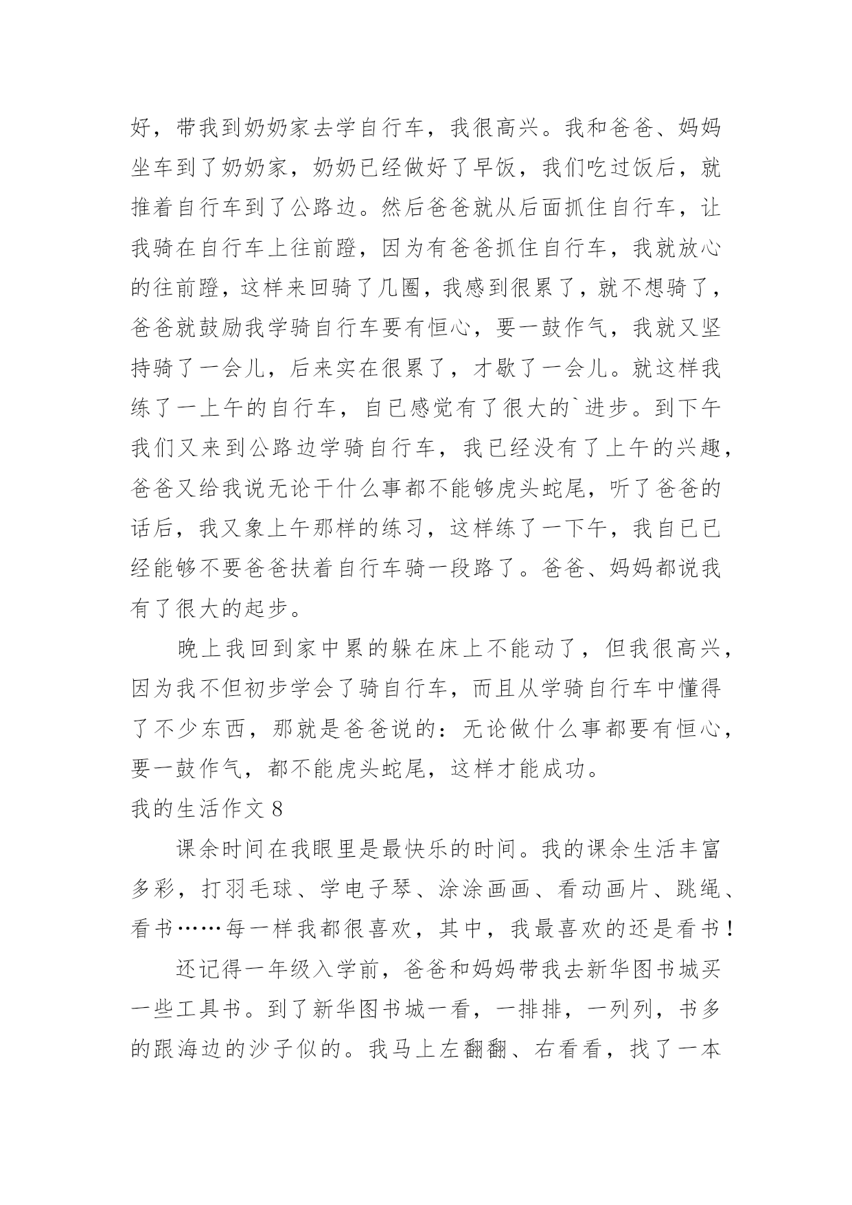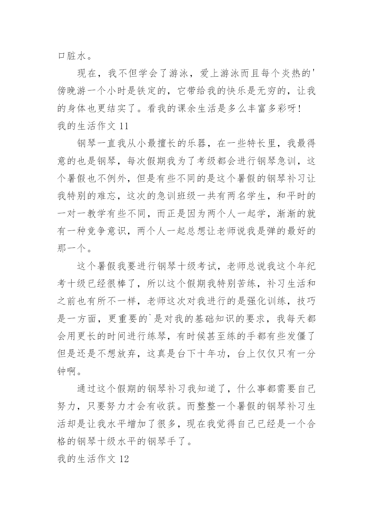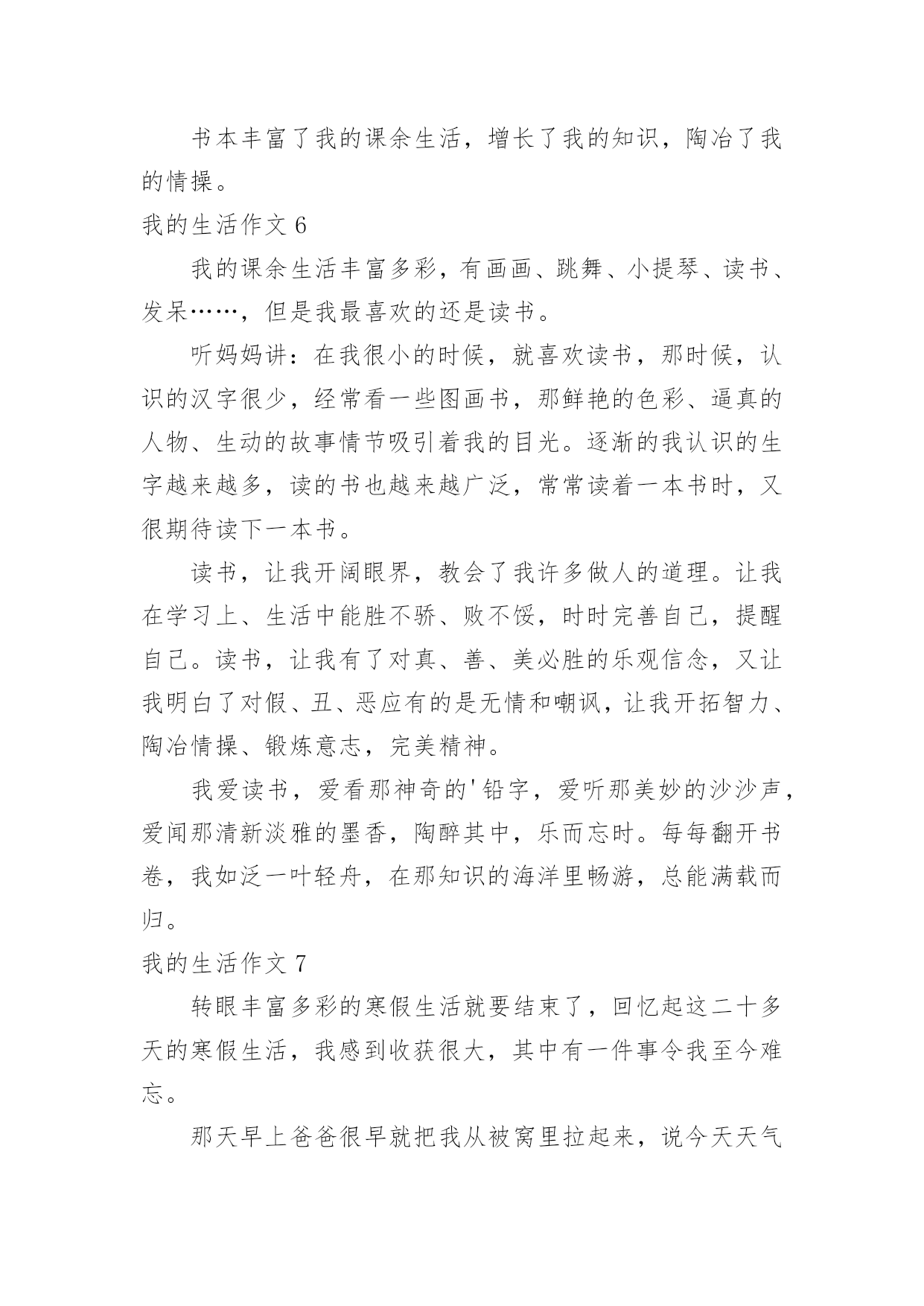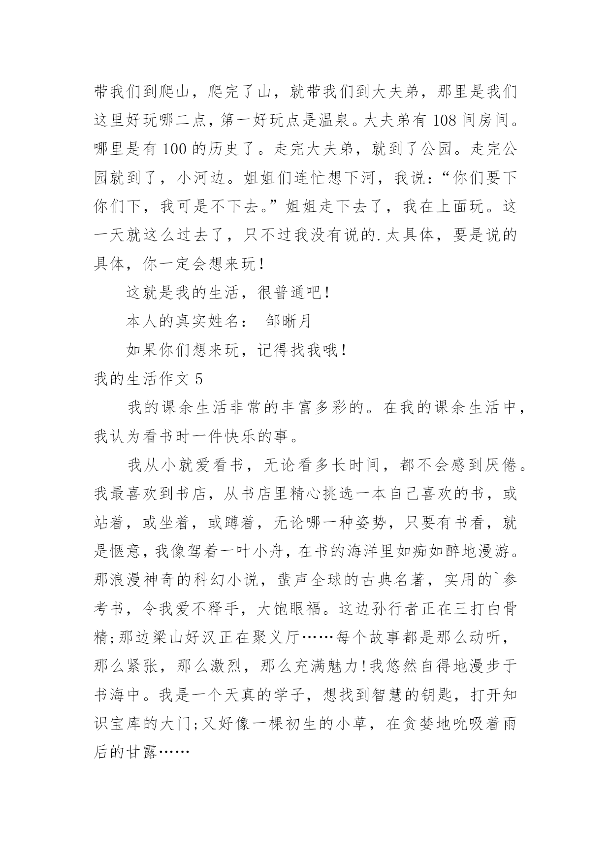 我的生活作文(优)我的生活作文在学习、工作或生活中,大家都有写作文的经历,对作文很是熟悉吧,通过作文可以把我们那些零零散散的思想,聚集在一块。写起作文来就毫无头绪?以下是小编为大家整理的我的生活作文,希望能够帮助到大家。我的生活作文1我想象的快乐生活没有太多现实中的不应该:每天早晨,小鸟对我笑,我便把这只小鸟关进一个无形的笼子,笼子会跟着他飞,只要我按下遥控器,小鸟就会瞬间移动到我的.身边。但这会拘束到小鸟的行为,我不想这样。上学了。我打开书包,书包里什么也没有,我打一个电话就让妈妈乘坐时空机来到我身边,把我的作业给我。但这会浪费妈妈的时间,我不想这样。中午,老师发给我们饭盒,,我拿起神奇笔在老师面前一晃,老师会舀我喜欢的菜。但这样会营养不良,我不想这样。晚上,我该做完作业弹琴,真希望妈妈会亲切地对我说:“乖乖,今天只弹3遍。”但这样跟没学有什么两样,我不想这样。到底什么样的生活才适合我:快乐、轻松、压力,我并不知道。小伙伴,你能告诉我吗?我的生活作文2你喜欢现在的生活吗?我不喜欢现在的生活,因为很无聊,每天都在做同样的事情,也许你会觉得过着普通的生活最好了,但这对我来说实在是很无聊,还不如直接结束算了。小时候,有个人问我要不要一起玩游戏,赌上秘密的游戏,输了就要把连家人都不知道的秘密说出来,我答应了,结果我们每一场都打的不相上下,打到小学毕业还是没有结果,都是以平手来结束一场又一场,真是没完没了,但因为他跟我搭上了话,我们才能一起玩那么久的游戏,这也是天意的一种吧。但是他现在走了,没有人能像他一样陪我玩游戏,至从他走以后,不管做什么都觉得无意义了,现在回想起来当时是多么快乐,他走了以后,我的心却像被掏走一般的痛,原本打开的'大门就这样重重的关了起来,锁起来,这样就不会有人可以再次打开。世界上,没有事像故事书一样的剧情,没有所谓的公主和王子,是不可能有什么浪漫故事的,要是有的话,世上就不可能有离婚等等事情发生,所以我绝不相信,我会有情感,我会伤心肯定是因为没游戏可以玩了,只有这个理由了。如果只是个假设,假设可以重来,我不知道还会不会答应他呢?这是每个人心中都会有的欲望,因为我们是“人类”嘛。我的生活作文3每次一到放假,还是那句,有人欢喜有人忧。父母早在放假前的一个星期就给报好了各种补习班,每天早晨一睁眼就想到几点要上课,今天轮到要补什么课。特别是到了我下个学期要读高三,家长就更为紧张了,害怕我浪费掉一点时间,一直都在担忧。暑假来临,补习是一定不可少的,爸妈早上给我安排了补英语,说是要把高中三年的语法点全是要狠狠地补上,以前漏掉的知识也要一一填补完整,希望能在高考时一展风采。在补习的同时,也面临着重大的压力,高三生活的逐步临近,班主任也时常提醒着我们,并用“准大学生们”来称呼我们,把很多希望都赋予在我们身上。在这么多学科当中,最让我纠结和烦的就是数学,特别是对于文科生来说,数学是最难拿分也是最为容易拉开差距的一个学科。在补数学的时候,好几次对着老师,就是一股要倒下的姿态,函数、导数等都让我们特为纠结。英语高考改革到我们这届还未实行,所以我们常常用来劝自己的一句话就是:“革命尚未成功,同志仍需努力。”暑期的.补习生活虽苦,但为了以后的“甜”我们还是需要再加把劲的。我的生活作文4我的生活普普通通,不平穷也不富裕。但是有一天,我感觉到了我很快乐。那天,哥哥带了几位姐姐们到家里玩。那几位姐姐我都认识,因为哥哥每次放假时,我还没有放假,他都会带我读书。而且每天都会带朋友来家里吃饭。所以我认得。哥哥带她们休息了一会儿,就说:“我们去玩吧!”姐姐们连声赞同,哥哥说:“妹妹,要不你也跟去。”我高兴地答应了。哥哥先带我们到爬山,爬完了山,就带我们到大夫弟,那里是我们这里好玩哪二点,第一好玩点是温泉。大夫弟有108间房间。哪里是有100的历史了。走完大夫弟,就到了公园。走完公园就到了,小河边。姐姐们连忙想下河,我说:“你们要下你们下,我可是不下去。”姐姐走下去了,我在上面玩。这一天就这么过去了,只不过我没有说的.太具体,要是说的具体,你一定会想来玩!这就是我的生活,很普通吧!本人的真实姓名:邹晰月如果你们想来玩,记得找我哦!我的生活作文5我的课余生活非常的丰富多彩的。在我的课余生活中,我认为看书时一件快乐的事。我从小就爱看书,无论看多长时间,都不会感到厌倦。我最喜欢到书店,从书店里精心挑选一本自己喜欢的书,或站着,或坐着,或蹲着,无论哪一种姿势,只要有书看,就是惬意,我像驾着一叶小舟,在书的海洋里如痴如醉地漫游。那浪漫神奇的科幻小说,蜚声全球的古典名著,实用的`参考书,令我爱不释手,大饱眼福。这边孙行者正在三打白骨精;那边梁山好汉正在聚义厅……每个故事都是那么动听,那么紧张,那么激烈,那么充满魅力!我悠然自得地漫步于书海中。我是一个天真的学子,
