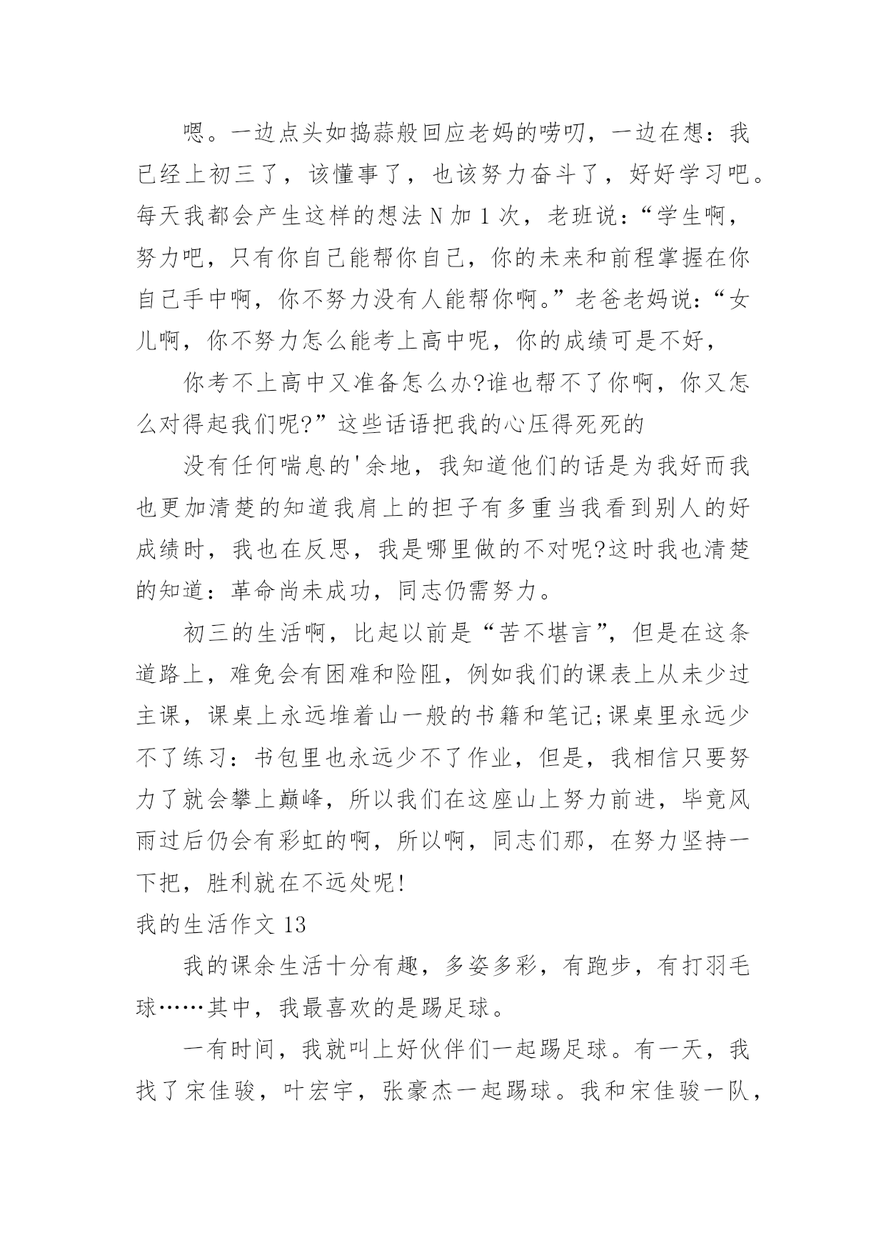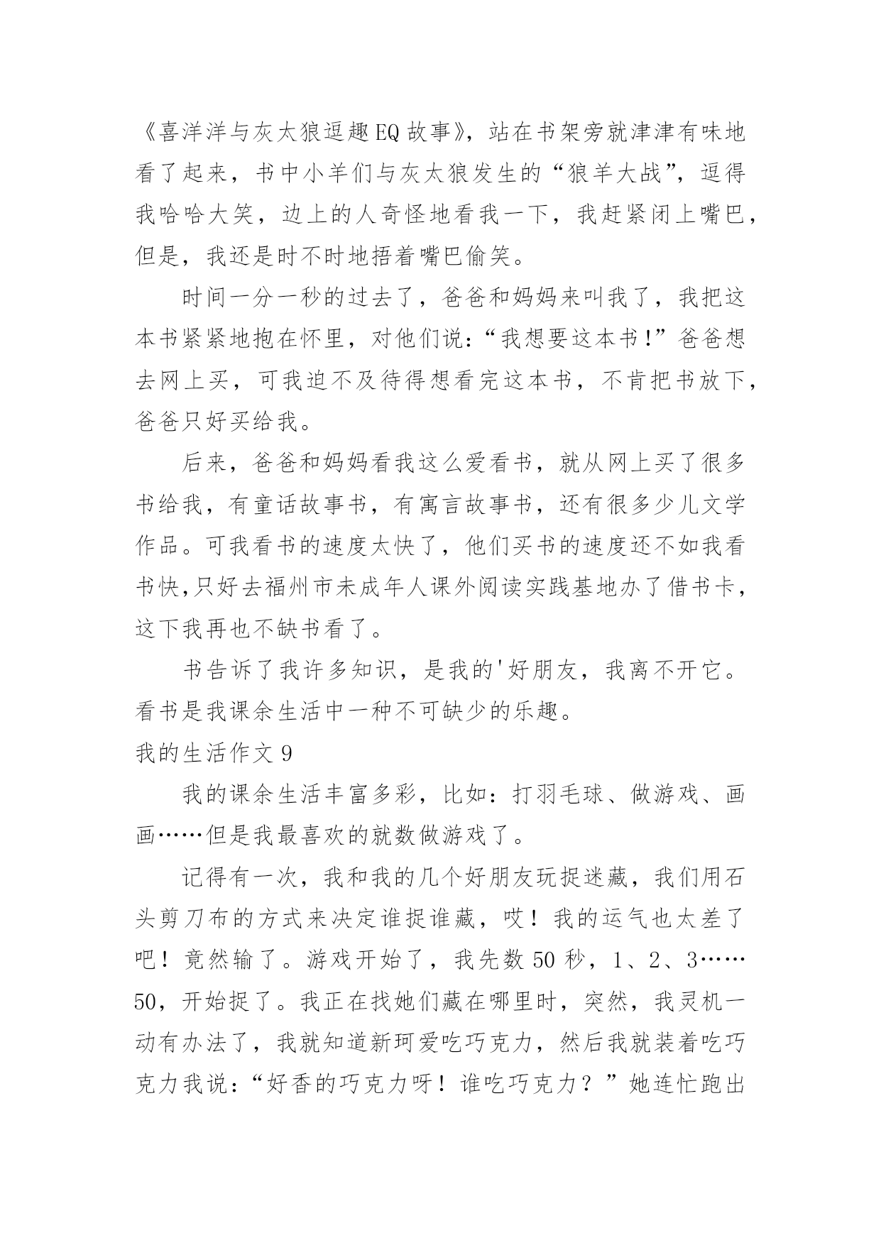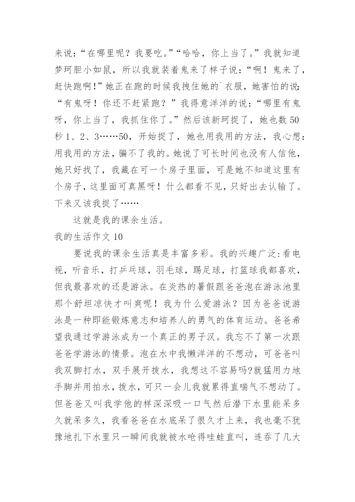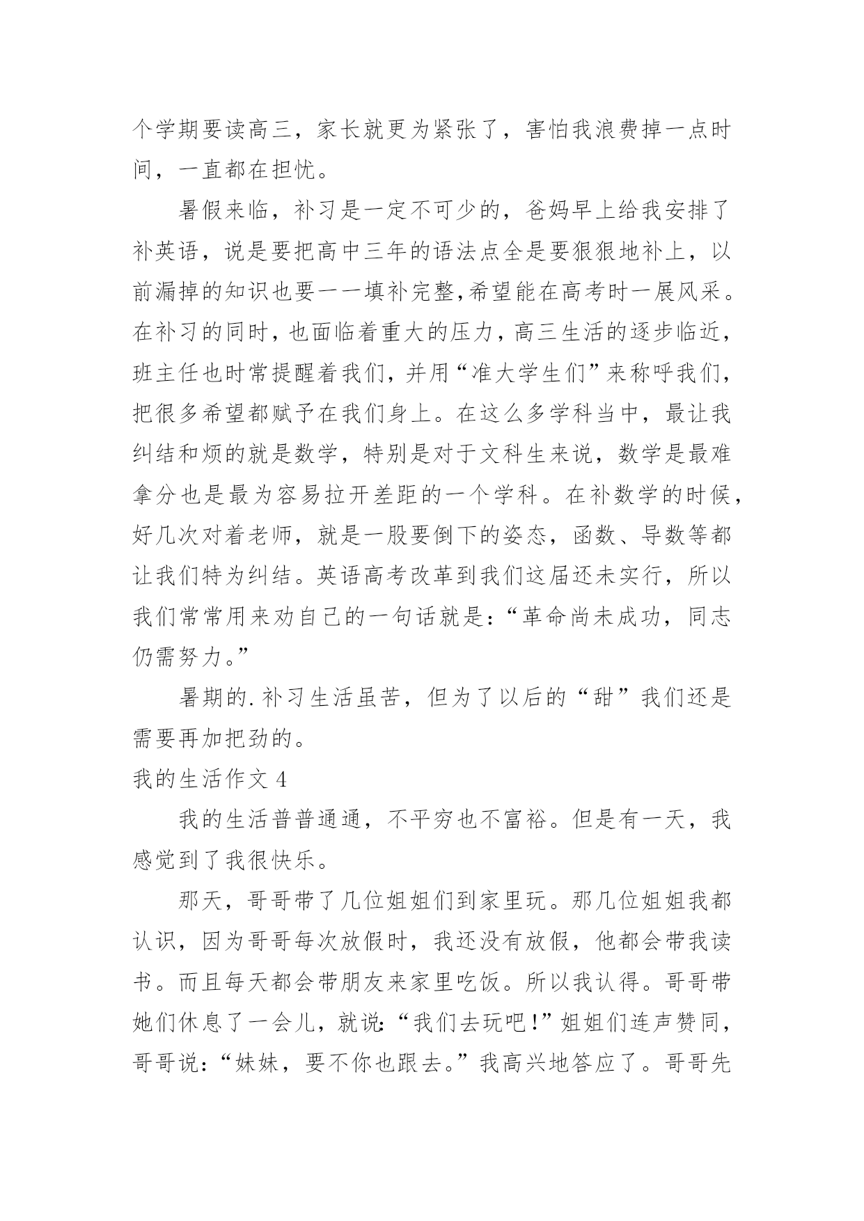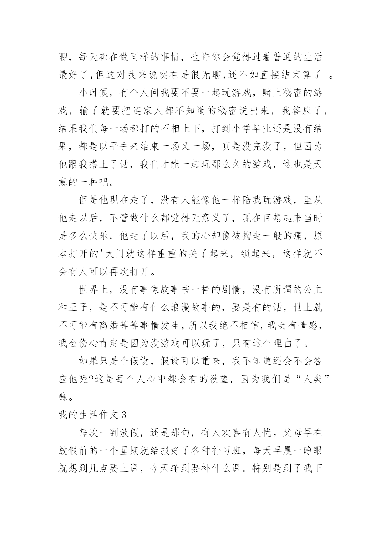 我的生活作文(优)我的生活作文在学习、工作或生活中,大家都有写作文的经历,对作文很是熟悉吧,通过作文可以把我们那些零零散散的思想,聚集在一块。写起作文来就毫无头绪?以下是小编为大家整理的我的生活作文,希望能够帮助到大家。我的生活作文1我想象的快乐生活没有太多现实中的不应该:每天早晨,小鸟对我笑,我便把这只小鸟关进一个无形的笼子,笼子会跟着他飞,只要我按下遥控器,小鸟就会瞬间移动到我的.身边。但这会拘束到小鸟的行为,我不想这样。上学了。我打开书包,书包里什么也没有,我打一个电话就让妈妈乘坐时空机来到我身边,把我的作业给我。但这会浪费妈妈的时间,我不想这样。中午,老师发给我们饭盒,,我拿起神奇笔在老师面前一晃,老师会舀我喜欢的菜。但这样会营养不良,我不想这样。晚上,我该做完作业弹琴,真希望妈妈会亲切地对我说:“乖乖,今天只弹3遍。”但这样跟没学有什么两样,我不想这样。到底什么样的生活才适合我:快乐、轻松、压力,我并不知道。小伙伴,你能告诉我吗?我的生活作文2你喜欢现在的生活吗?我不喜欢现在的生活,因为很无聊,每天都在做同样的事情,也许你会觉得过着普通的生活最好了,但这对我来说实在是很无聊,还不如直接结束算了。小时候,有个人问我要不要一起玩游戏,赌上秘密的游戏,输了就要把连家人都不知道的秘密说出来,我答应了,结果我们每一场都打的不相上下,打到小学毕业还是没有结果,都是以平手来结束一场又一场,真是没完没了,但因为他跟我搭上了话,我们才能一起玩那么久的游戏,这也是天意的一种吧。但是他现在走了,没有人能像他一样陪我玩游戏,至从他走以后,不管做什么都觉得无意义了,现在回想起来当时是多么快乐,他走了以后,我的心却像被掏走一般的痛,原本打开的'大门就这样重重的关了起来,锁起来,这样就不会有人可以再次打开。世界上,没有事像故事书一样的剧情,没有所谓的公主和王子,是不可能有什么浪漫故事的,要是有的话,世上就不可能有离婚等等事情发生,所以我绝不相信,我会有情感,我会伤心肯定是因为没游戏可以玩了,只有这个理由了。如果只是个假设,假设可以重来,我不知道还会不会答应他呢?这是每个人心中都会有的欲望,因为我们是“人类”嘛。我的生活作文3每次一到放假,还是那句,有人欢喜有人忧。父母早在放假前的一个星期就给报好了各种补习班,每天早晨一睁眼就想到几点要上课,今天轮到要补什么课。特别是到了我下个学期要读高三,家长就更为紧张了,害怕我浪费掉一点时间,一直都在担忧。暑假来临,补习是一定不可少的,爸妈早上给我安排了补英语,说是要把高中三年的语法点全是要狠狠地补上,以前漏掉的知识也要一一填补完整,希望能在高考时一展风采。在补习的同时,也面临着重大的压力,高三生活的逐步临近,班主任也时常提醒着我们,并用“准大学生们”来称呼我们,把很多希望都赋予在我们身上。在这么多学科当中,最让我纠结和烦的就是数学,特别是对于文科生来说,数学是最难拿分也是最为容易拉开差距的一个学科。在补数学的时候,好几次对着老师,就是一股要倒下的姿态,函数、导数等都让我们特为纠结。英语高考改革到我们这届还未实行,所以我们常常用来劝自己的一句话就是:“革命尚未成功,同志仍需努力。”暑期的.补习生活虽苦,但为了以后的“甜”我们还是需要再加把劲的。我的生活作文4我的生活普普通通,不平穷也不富裕。但是有一天,我感觉到了我很快乐。那天,哥哥带了几位姐姐们到家里玩。那几位姐姐我都认识,因为哥哥每次放假时,我还没有放假,他都会带我读书。而且每天都会带朋友来家里吃饭。所以我认得。哥哥带她们休息了一会儿,就说:“我们去玩吧!”姐姐们连声赞同,哥哥说:“妹妹,要不你也跟去。”我高兴地答应了。哥哥先带我们到爬山,爬完了山,就带我们到大夫弟,那里是我们这里好玩哪二点,第一好玩点是温泉。大夫弟有108间房间。哪里是有100的历史了。走完大夫弟,就到了公园。走完公园就到了,小河边。姐姐们连忙想下河,我说:“你们要下你们下,我可是不下去。”姐姐走下去了,我在上面玩。这一天就这么过去了,只不过我没有说的.太具体,要是说的具体,你一定会想来玩!这就是我的生活,很普通吧!本人的真实姓名:邹晰月如果你们想来玩,记得找我哦!我的生活作文5我的课余生活非常的丰富多彩的。在我的课余生活中,我认为看书时一件快乐的事。我从小就爱看书,无论看多长时间,都不会感到厌倦。我最喜欢到书店,从书店里精心挑选一本自己喜欢的书,或站着,或坐着,或蹲着,无论哪一种姿势,只要有书看,就是惬意,我像驾着一叶小舟,在书的海洋里如痴如醉地漫游。那浪漫神奇的科幻小说,蜚声全球的古典名著,实用的`参考书,令我爱不释手,大饱眼福。这边孙行者正在三打白骨精;那边梁山好汉正在聚义厅……每个故事都是那么动听,那么紧张,那么激烈,那么充满魅力!我悠然自得地漫步于书海中。我是一个天真的学子,