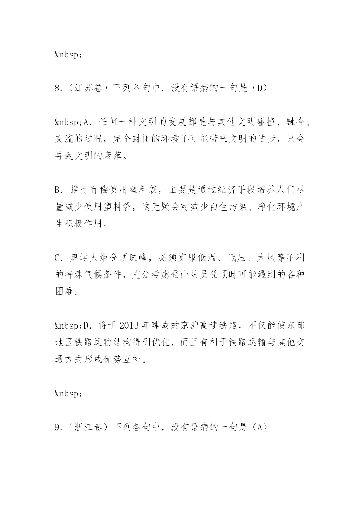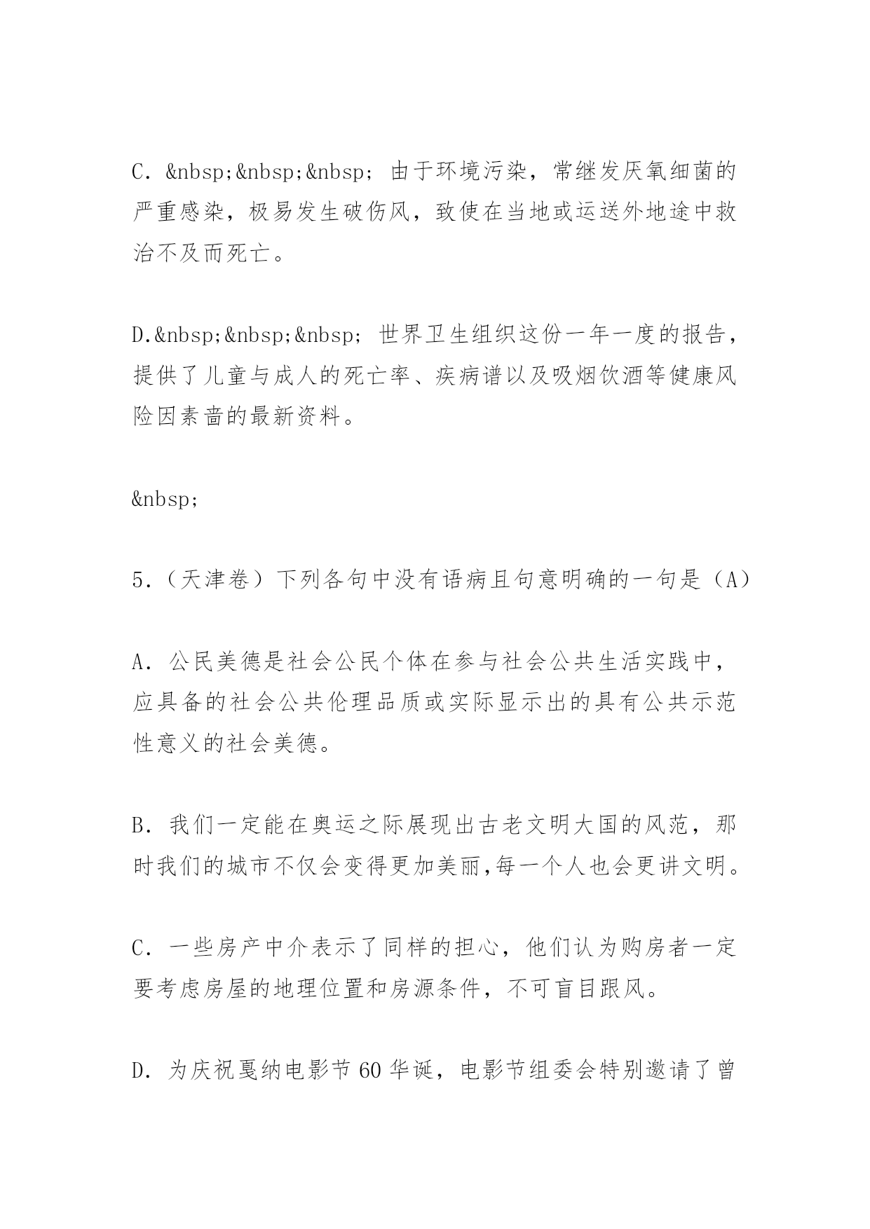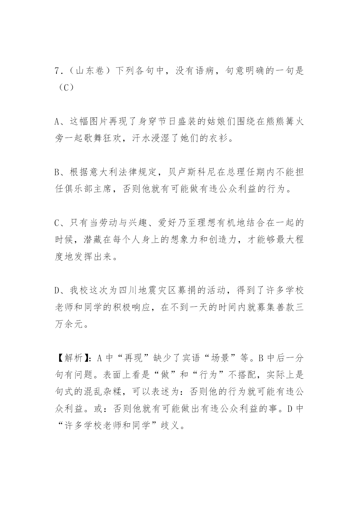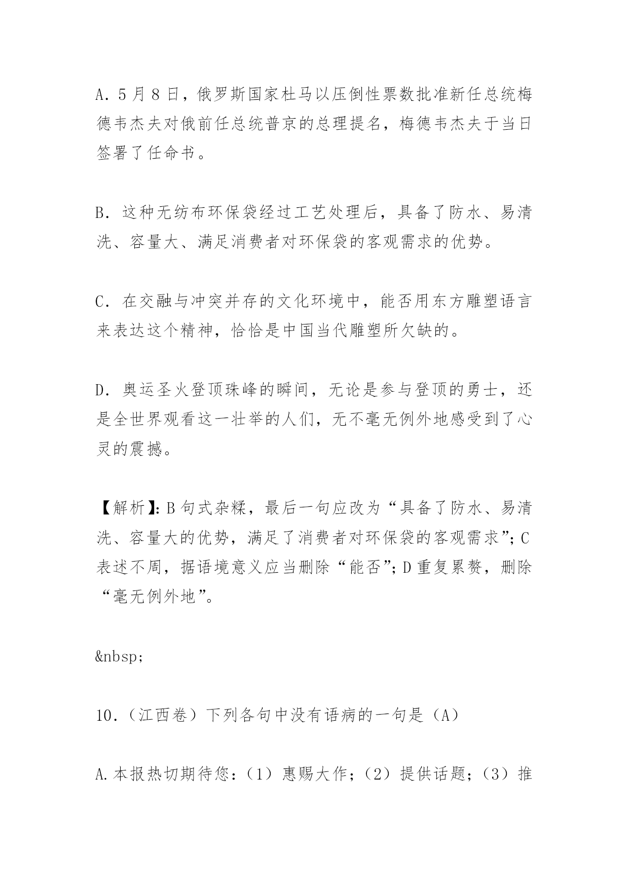 08年高考病句08年高考病句汇编1.(全国I卷)下列各句中,没有语病的一句是(A)A.葛振华大学毕业后回农村当起了村支书,他积极寻找本村经济的切入点,考虑问题与众不同,给村里带来一股清新的气息。B.荞麦具有降低毛细血管脆性、改善微循环、增加免疫力的作用,可用于高血压、高血脂、冠心病、中风发作等疾病的辅助治疗。C.王羽除了班里和学生会的工作外,还承担了广播站“音乐不断”、“英语角”栏目主持,居然没有影响学习成绩,真让人佩服。D.阅览室图书经常出现“开天窗”现象,我们可以从这一现象反映两个问题,一是阅读者素质有待提高,一是管理历度有待加强。 2.(全国II卷)下列各句中,没有语病的一句是(C)A.金乌炭雕工艺精湛,采用纯天然颜料着色,具有高雅、时尚、个性的艺术享受,还能吸附有毒有害气体,是一种环保艺术品。B.该县认真实施“村村通”这一全省规划的八件实事之一,到10月底,在全地区率先解决了农村百姓听广播看电视难的问题。C.中俄两国元首在致辞中一致表示,要以举办“国家年”为契机,增进两国人民的相互了解和友谊,深化两国各领域的交流合作。D.听说博士村官潘汪聪要给大家讲农技课,大家兴致很高,还没到时间,村委会会议室就挤满了很多村民来听课,场面好不热闹。 3.(全国新课标卷)下列各句中,没有语病的一句是(C)A.城关中学的学生在老师带领下,为山区百姓义务投递邮件,几年来没有丢失一封信,推动了村民之间的联系,弥补了当地交通发展的局限。B.馨园社区居委会在展示的普法板报中,用通俗易懂的语言剖析了生动典型的案例现实,让读者在轻松的阅读中领略到法律精神的独特魅力。C.粮食不同于其他产品,其生产环节明显的季节性决定了它不能像工业产品流通一样可以零库存周转,因而储备粮食以备不时之需十分重要。D.为了露出琉璃瓦深蓝色的瓦体,去年盖的办公楼没有在屋檐外设墙体遮挡,这是成为楼顶覆冰融化时容易整体滑落砸到过路人的原因之一。 4.(北京卷)下列句子中,没有语病的一句是(D)A. 我国水墨画的主要万分是墨,加以清水,在宣纸上浸染,互渗,通过不同浓淡反映不同审美趣味,被国人称为“墨宝”。B. 一名韩国官员透露,有关成员国已达成一致意见,同意建立该项基金,以防止1997年那样的金融危机不要再次发生。C. 由于环境污染,常继发厌氧细菌的严重感染,极易发生破伤风,致使在当地或运送外地途中救治不及而死亡。D. 世界卫生组织这份一年一度的报告,提供了儿童与成人的死亡率、疾病谱以及吸烟饮酒等健康风险因素啬的最新资料。 5.(天津卷)下列各句中没有语病且句意明确的一句是(A)A.公民美德是社会公民个体在参与社会公共生活实践中,应具备的社会公共伦理品质或实际显示出的具有公共示范性意义的社会美德。B.我们一定能在奥运之际展现出古老文明大国的风范,那时我们的城市不仅会变得更加美丽,每一个人也会更讲文明。C.一些房产中介表示了同样的担心,他们认为购房者一定要考虑房屋的地理位置和房源条件,不可盲目跟风。D.为庆祝戛纳电影节60华诞,电影节组委会特别邀请了曾经摘取过戛纳金棕榈奖的35位导演,每人拍摄一部3分钟的纪念短片。 6.(辽宁卷)下列各句中,没有语病的一句是(D)A.中国皮影戏的艺术魅力曾经倾倒和政府了无数热爱它的人民,它的传播对中国近代电影艺术也有着不可忽视的启示作用。B.这篇文章其中分析了形式,辨证地回答了在大开放、大交往、大融合大世界里,我们迫切需要一种全心的观念来协调各种关系。C.交通台日前播报说,有的人在小轿车内开着空调过夜,由此发生窒息死亡时间每年都有发生,应该引起司机朋友们的高度重视。D.大学毕业后去农村应聘村官的人当中,多数人希望能在建设新农村这一大环境中找到施展才华、创立事业、实现理想的有效途径。 7.(山东卷)下列各句中,没有语病,句意明确的一句是(C)A、这幅图片再现了身穿节日盛装的姑娘们围绕在熊熊篝火旁一起歌舞狂欢,汗水浸湿了她们的衣衫。B、根据意大利法律规定,贝卢斯科尼在总理任期内不能担任俱乐部主席,否则他就有可能做有违公众利益的行为。C、只有当劳动与兴趣、爱好乃至理想有机地结合在一起的时候,潜藏在每个人身上的想象力和创造力,才能够最大程度地发挥出来。D、我校这次为四川地震灾区募捐的活动,得到了许多学校老师和同学的积极响应,在不到一天的时间内就募集善款三万余元。【解析】:A中“再现”缺少了宾语“场景”等。B中后一分句有问题。表面上看是“做”和“行为”不搭配,实际上是句式的混乱杂糅,可以表述为:否则他的行为就可能有违公众利益。或:否则他就有可能做出有违公众利益的事。