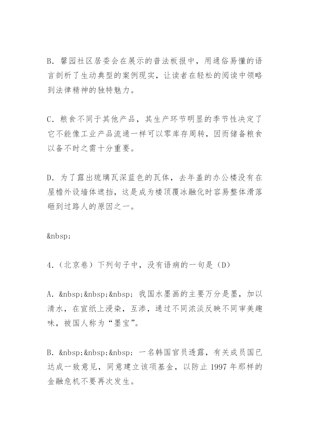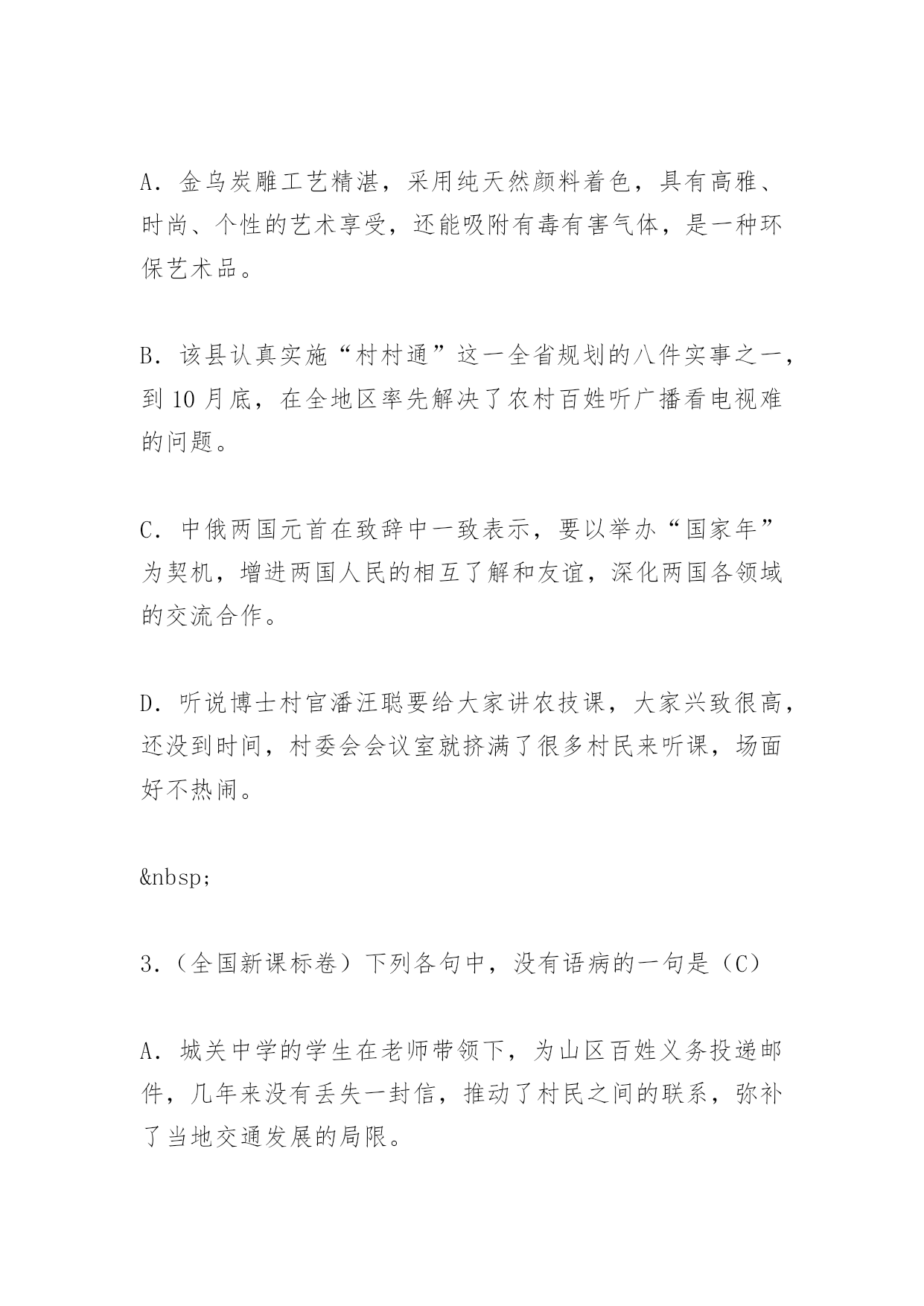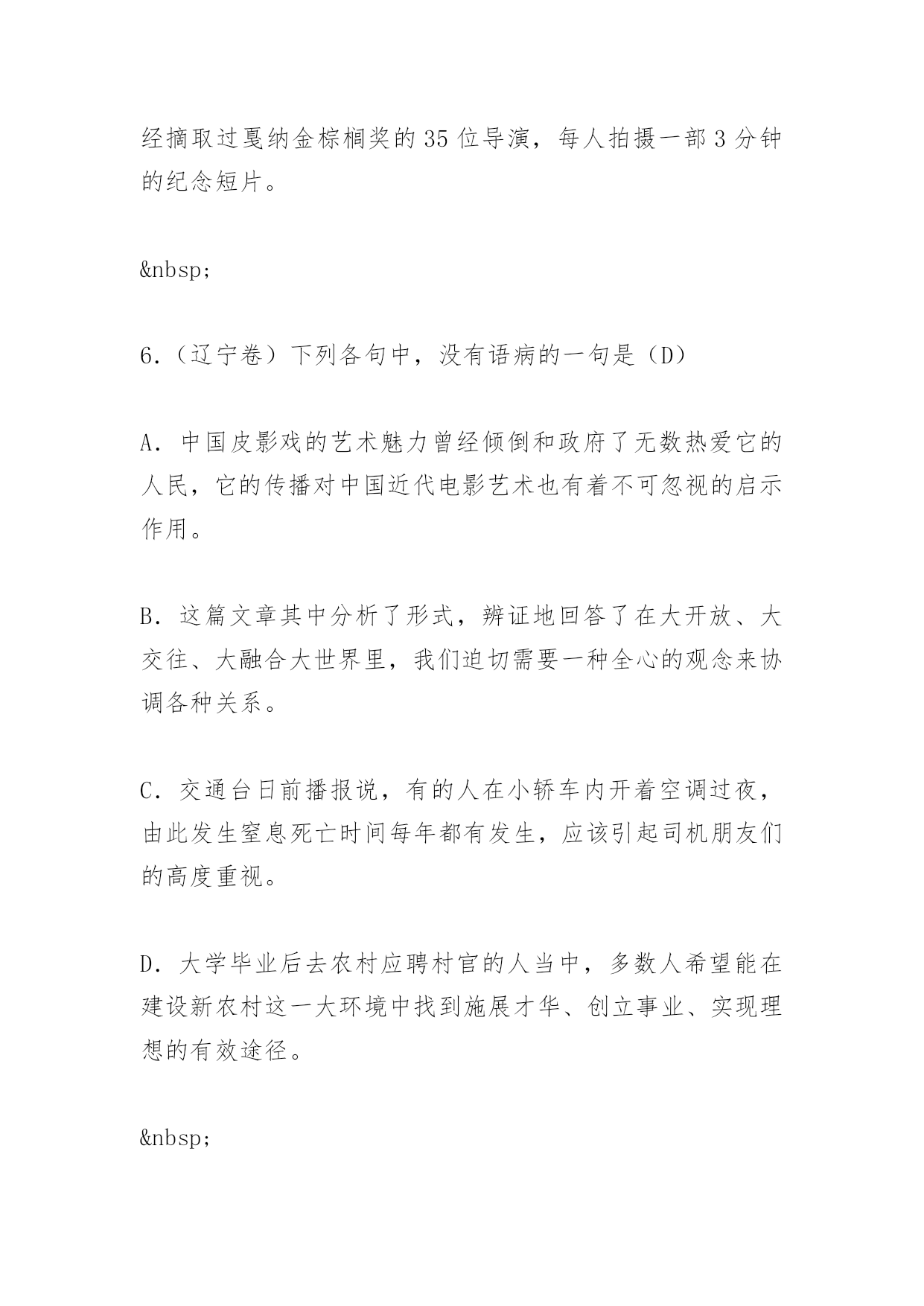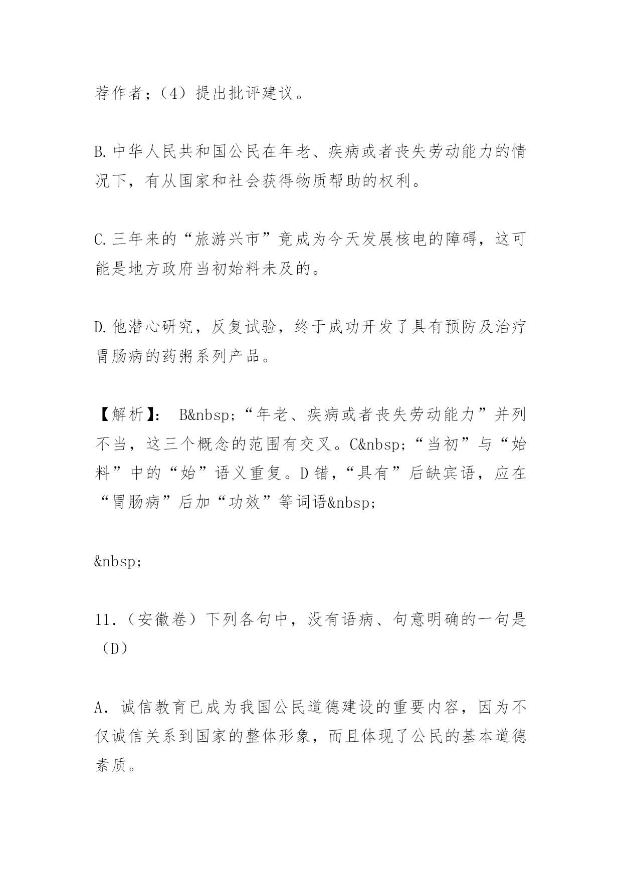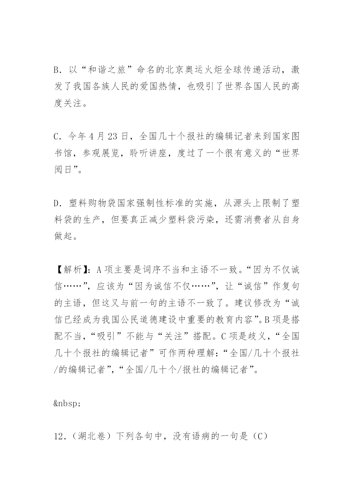 08年高考病句08年高考病句汇编1.(全国I卷)下列各句中,没有语病的一句是(A)A.葛振华大学毕业后回农村当起了村支书,他积极寻找本村经济的切入点,考虑问题与众不同,给村里带来一股清新的气息。B.荞麦具有降低毛细血管脆性、改善微循环、增加免疫力的作用,可用于高血压、高血脂、冠心病、中风发作等疾病的辅助治疗。C.王羽除了班里和学生会的工作外,还承担了广播站“音乐不断”、“英语角”栏目主持,居然没有影响学习成绩,真让人佩服。D.阅览室图书经常出现“开天窗”现象,我们可以从这一现象反映两个问题,一是阅读者素质有待提高,一是管理历度有待加强。 2.(全国II卷)下列各句中,没有语病的一句是(C)A.金乌炭雕工艺精湛,采用纯天然颜料着色,具有高雅、时尚、个性的艺术享受,还能吸附有毒有害气体,是一种环保艺术品。B.该县认真实施“村村通”这一全省规划的八件实事之一,到10月底,在全地区率先解决了农村百姓听广播看电视难的问题。C.中俄两国元首在致辞中一致表示,要以举办“国家年”为契机,增进两国人民的相互了解和友谊,深化两国各领域的交流合作。D.听说博士村官潘汪聪要给大家讲农技课,大家兴致很高,还没到时间,村委会会议室就挤满了很多村民来听课,场面好不热闹。 3.(全国新课标卷)下列各句中,没有语病的一句是(C)A.城关中学的学生在老师带领下,为山区百姓义务投递邮件,几年来没有丢失一封信,推动了村民之间的联系,弥补了当地交通发展的局限。B.馨园社区居委会在展示的普法板报中,用通俗易懂的语言剖析了生动典型的案例现实,让读者在轻松的阅读中领略到法律精神的独特魅力。C.粮食不同于其他产品,其生产环节明显的季节性决定了它不能像工业产品流通一样可以零库存周转,因而储备粮食以备不时之需十分重要。D.为了露出琉璃瓦深蓝色的瓦体,去年盖的办公楼没有在屋檐外设墙体遮挡,这是成为楼顶覆冰融化时容易整体滑落砸到过路人的原因之一。 4.(北京卷)下列句子中,没有语病的一句是(D)A. 我国水墨画的主要万分是墨,加以清水,在宣纸上浸染,互渗,通过不同浓淡反映不同审美趣味,被国人称为“墨宝”。B. 一名韩国官员透露,有关成员国已达成一致意见,同意建立该项基金,以防止1997年那样的金融危机不要再次发生。C. 由于环境污染,常继发厌氧细菌的严重感染,极易发生破伤风,致使在当地或运送外地途中救治不及而死亡。D. 世界卫生组织这份一年一度的报告,提供了儿童与成人的死亡率、疾病谱以及吸烟饮酒等健康风险因素啬的最新资料。 5.(天津卷)下列各句中没有语病且句意明确的一句是(A)A.公民美德是社会公民个体在参与社会公共生活实践中,应具备的社会公共伦理品质或实际显示出的具有公共示范性意义的社会美德。B.我们一定能在奥运之际展现出古老文明大国的风范,那时我们的城市不仅会变得更加美丽,每一个人也会更讲文明。C.一些房产中介表示了同样的担心,他们认为购房者一定要考虑房屋的地理位置和房源条件,不可盲目跟风。D.为庆祝戛纳电影节60华诞,电影节组委会特别邀请了曾经摘取过戛纳金棕榈奖的35位导演,每人拍摄一部3分钟的纪念短片。 6.(辽宁卷)下列各句中,没有语病的一句是(D)A.中国皮影戏的艺术魅力曾经倾倒和政府了无数热爱它的人民,它的传播对中国近代电影艺术也有着不可忽视的启示作用。B.这篇文章其中分析了形式,辨证地回答了在大开放、大交往、大融合大世界里,我们迫切需要一种全心的观念来协调各种关系。C.交通台日前播报说,有的人在小轿车内开着空调过夜,由此发生窒息死亡时间每年都有发生,应该引起司机朋友们的高度重视。D.大学毕业后去农村应聘村官的人当中,多数人希望能在建设新农村这一大环境中找到施展才华、创立事业、实现理想的有效途径。 7.(山东卷)下列各句中,没有语病,句意明确的一句是(C)A、这幅图片再现了身穿节日盛装的姑娘们围绕在熊熊篝火旁一起歌舞狂欢,汗水浸湿了她们的衣衫。B、根据意大利法律规定,贝卢斯科尼在总理任期内不能担任俱乐部主席,否则他就有可能做有违公众利益的行为。C、只有当劳动与兴趣、爱好乃至理想有机地结合在一起的时候,潜藏在每个人身上的想象力和创造力,才能够最大程度地发挥出来。D、我校这次为四川地震灾区募捐的活动,得到了许多学校老师和同学的积极响应,在不到一天的时间内就募集善款三万余元。【解析】:A中“再现”缺少了宾语“场景”等。B中后一分句有问题。表面上看是“做”和“行为”不搭配,实际上是句式的混乱杂糅,可以表述为:否则他的行为就可能有违公众利益。或:否则他就有可能做出有违公众利益的事。