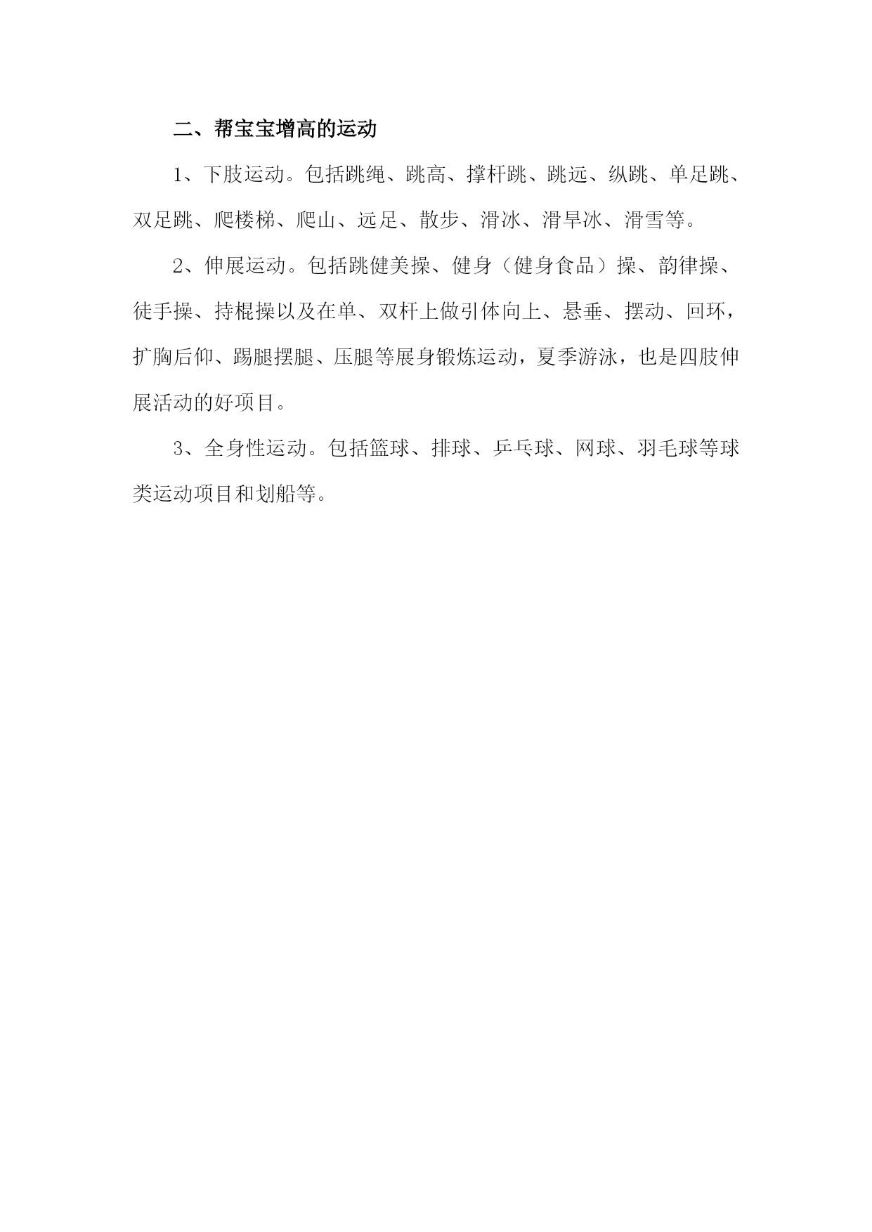 帮宝宝增高的食物和运动2013年06月21日家庭医生在线为宝宝HYPERLINK"http://baby.familydoctor.com.cn/hot/zg.html"增高,你有妙招吗?其实,宝宝增高不仅要讲究效率还要注意方法的科学性哦。HYPERLINK"http://yyk.familydoctor.com.cn/6118/"\t"blank"一、帮宝宝增高的食物1、绿色食物菠菜是HYPERLINK"http://ypk.familydoctor.com.cn/Info33299.html"\t"blank"维生素的宝库。每天吃100克菠菜,就可以满足生长发育的需要。另外也可多吃含维生素比较多的油菜、莴苣和辣椒等。2、橙色食物胡萝卜含大量的维生素B1、B2、B12、咽酸,它被称为红色的金花。儿童的菜肴里每天加入100克的胡萝卜,大有益处。3、白色食物牛奶是一种全营养品,它含有丰富的蛋白质、氨基酸、钙、磷等,对增高极为有利。4、棕色食物沙丁鱼是蛋白质的宝库。另外也可以食用鱿鱼、鲍鱼、鲤鱼和含钙、磷比较丰富的鱼松等。5、黄色食物柑桔当中维生素A、B1、C含量分别是苹果的3倍,那么酸桔、广柑、香橙、柠檬都是属于柑桔类的食品,每天吃二个新鲜的柑桔类水果,是非常好的。接下来,再来看看那些运动可以帮助宝宝增高吧。二、帮宝宝增高的运动1、下肢运动。包括跳绳、跳高、撑杆跳、跳远、纵跳、单足跳、双足跳、爬楼梯、爬山、远足、散步、滑冰、滑旱冰、滑雪等。2、伸展运动。包括跳健美操、健身(健身食品)操、韵律操、徒手操、持棍操以及在单、双杆上做引体向上、悬垂、摆动、回环,扩胸后仰、踢腿摆腿、压腿等展身锻炼运动,夏季游泳,也是四肢伸展活动的好项目。3、全身性运动。包括篮球、排球、乒乓球、网球、羽毛球等球类运动项目和划船等。