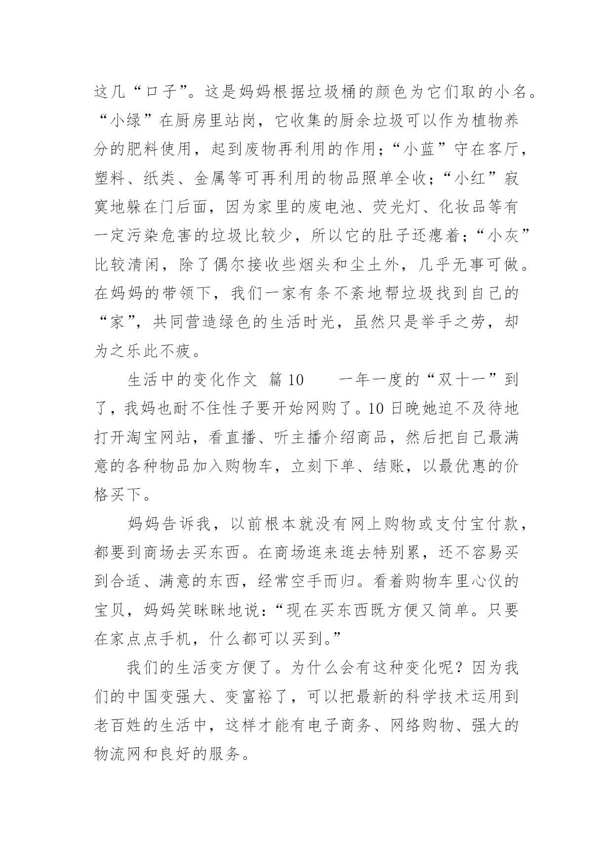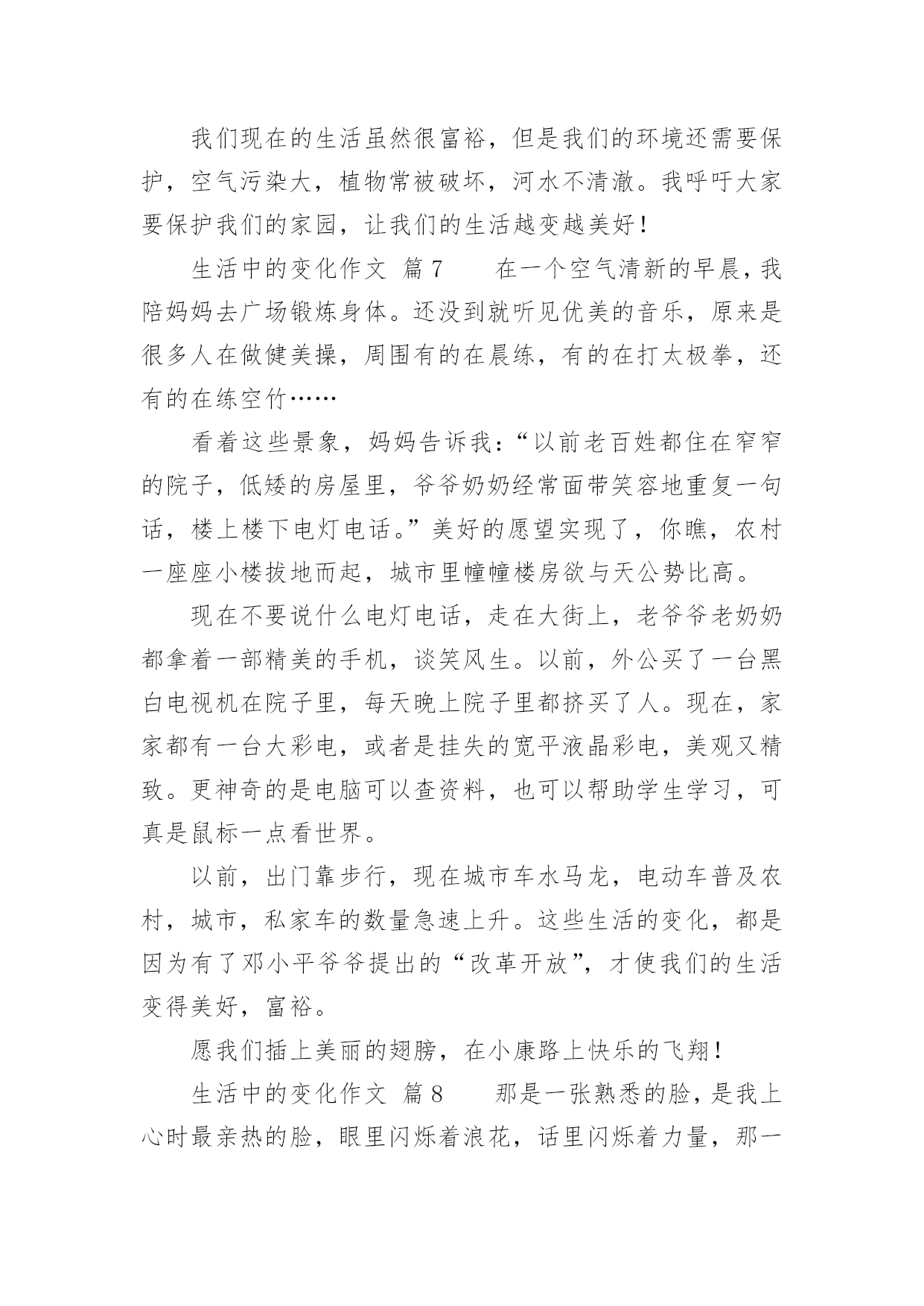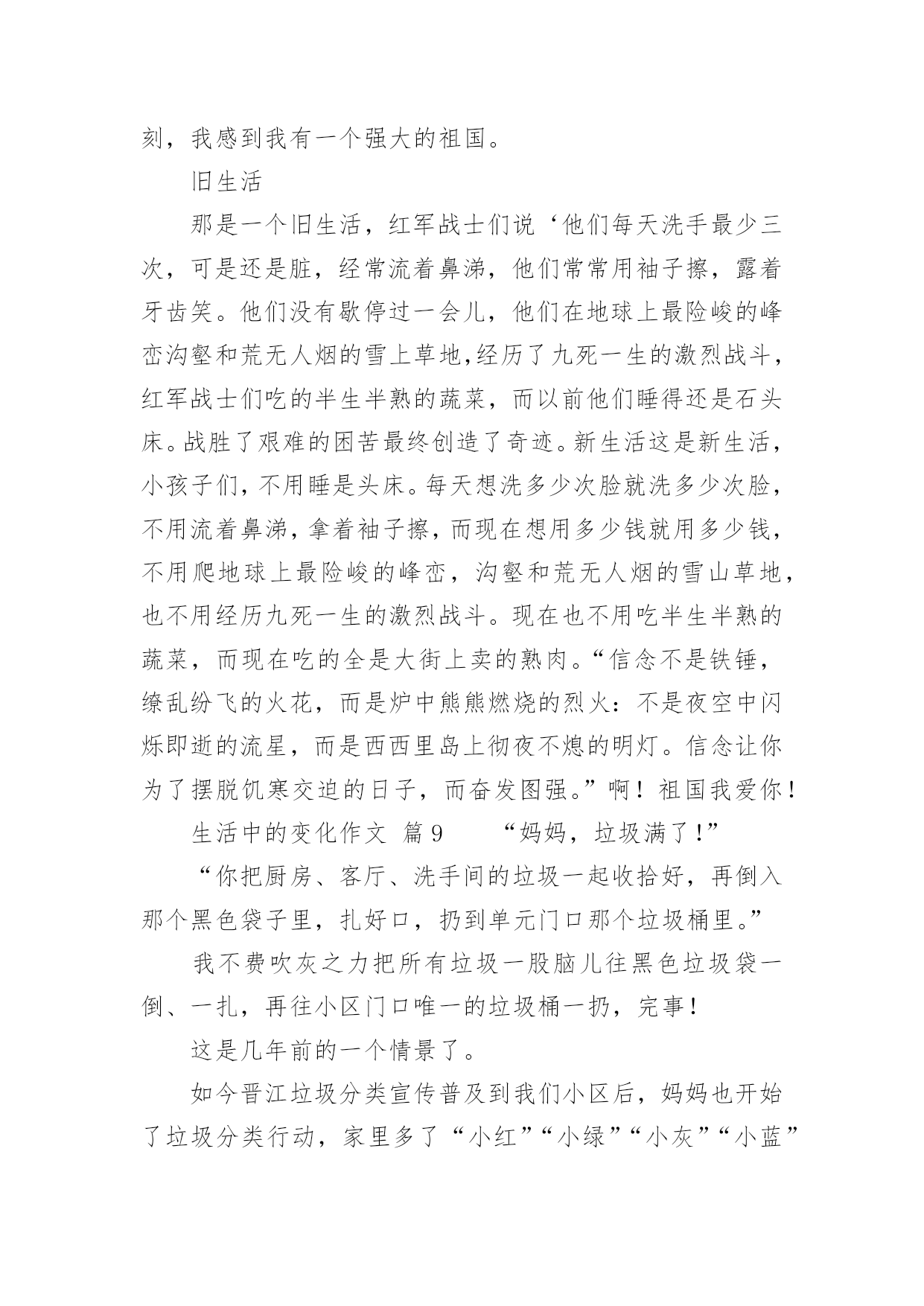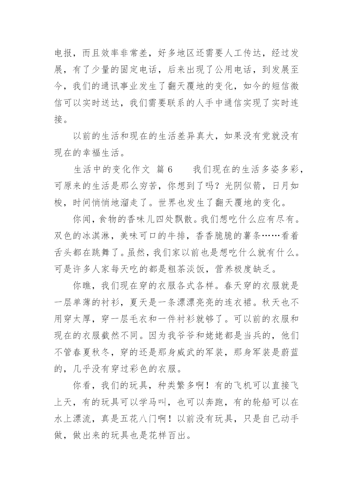 生活中的变化作文生活中的变化作文(精选27篇)在生活、工作和学习中,大家都有写作文的经历,对作文很是熟悉吧,作文是人们以书面形式表情达意的言语活动。相信很多朋友都对写作文感到非常苦恼吧,以下是小编为大家收集的生活中的变化作文,希望能够帮助到大家。生活中的变化作文篇1原来马路上一天也看不见几辆车。现在能看见数百台车。家乡的变化太大了。用淳朴装致,用自然点缀。路边的大树犹如窈窕淑女,君子好逑。结婚的喜车伴着大树的景象,飞的一下过去又一台,有二十多台车,轿车,都是豪华的车。在妈妈那时,连摩托车多没有,妈妈那是就一台大马车。在爷爷那根本就没有。婚纱,在新娘下车时人人都看到那美丽,漂亮的婚纱,裙边是丝边。新郎的西装。穿起来帅极了。在三十年前没有,只有布做一件新衣服。在六十年前没有这些,摆酒席,在饭店里定上几时桌,或者是在自家院子里摆酒席。在妈妈那时只是自家人在一两桌子就行了。现在的方远十里的人都来了。生活的怎么样,鱼、肉、烤鸭、烤鸡、虾、海货,都有,有二十多个菜。以前妈妈那时,三四个菜都不错了。结婚,女方要耧,一栋楼五十多万元,要地方好的、又大的楼。在以前妈妈要一个小瓦房都没有,都跟爷爷奶奶住一起。到了我出生前一年,我们家才住上属于自己的一个破破的房子。又要买车,买不起就不嫁,男方不得不买。以前找一个男人,就不得不嫁,不要车,那时她们连轿车都没见过,都不知道什么样。又要买家具,衣柜、床、饭桌、电视、电器。要买到好看的家具,把房子弄的漂亮级了。在以前就有一个缝辽机就是很好了。这是生活中变化的一小部分,还要很多。生活中的变化作文篇2变化应该每个人都知道,因为变化就在我们身边,我们身边在无声无息地、无时无刻地变化着。生活中无不体现着变化。变化的例子太多了,举不胜举。人的品格会变化;四季会变化;天气会变化,时阴时雨;人的长相会随着年龄的增长在变化;地位也会变化,你可能会从天上落到地下;心情也会变化,表扬一个人,他一定会高兴,相反,如果他受批评,一定会不高兴,所以心情也在变化着;身体也在变化着,你上午还好好的,到了下午便病倒了,这也是变化;名誉也会变化,现在你如天上的太阳,可一百年后、一千年后你可能是受人唾弃的一个对象呢,别说我胡说,秦桧不就是这样的人吗?最切合实际的变化,那便是时间了。借用朱自清的一句话吧“天黑时,我躺在床上,他便伶伶俐俐的从我身上跨过,从我脚边飞去了。等我睁开眼和太阳再见,这算又溜走了一日”。以上例子表明了一个问题:生活之中无不体现着变化。变化,是时间进军的步伐;变化,也是一件成就,只为它改变了原来的,变成了现在的。每个人干一件事都应有变化。让我说说人类的成就造成的变化吧:以前住的是小平房,只有一层;现在一幢幢楼房拔地而起,高达二三十层;这不是变化吗?以前出门的交通工具是马车,速度慢;现在大部分人家都有汽车,很快了。不说小的,如果你从西藏要去吉林,你坐马车要走上几年呢!变成飞机,几小时便到了。这不是变化吗?以上的成就表现出一个标题:人类的成就也是变化。发现变化,是看你有没有一双善于发现的眼睛,并不是凭空出现的。正是因为时代的变化,所以生活为了适应时代才有如此多的变化。我相信:再过一百年,变化一定更多。记住,变化始终在继续着。生活中的变化作文篇3“你们这一代的孩子都是生活在蜜罐里的,我们要是小时候在这样的年代生活那就好了。”这是我的奶奶经常挂在嘴边的一句话。原来我并不理解这句话的含义,通过奶奶他们的诉说,是我深有感慨。记得有一天,我在家写作业,奶奶就怀念起她小时候的事情,奶奶说:“我们小时候吃上一顿饭都非常困难,早上吃包子,还要两分钱一个,那时的两分钱是个不小的数字呢!”没有米面吃的时候,饿极了就吃树皮、树上长的蘑菇、榆树的叶子等等,在当时,能够吃上包子是我们的梦想啊。现在的孩子能够经常洗头洗澡,还灯这些取暖设施,我们那时一个冬天没有洗澡有浴霸暖的,身上的灰都一把一把的,洗头发只能用肥皂,头发洗的是硬邦邦的。说到这,奶奶叹了好大的一口气。还有一次,我们一家人都坐在一起吃饭,中午妈妈做了很多菜,我和弟弟在桌子上大口大口的吃看着我们吃的这么香,爸爸说:“我们小的时候,吃菜都是分着吃的,香肉这样的美味大餐,都是你奶奶一块一块给分到碗里的,谁也不敢多吃。”听了爸爸的话,我和弟弟相互看了看,露出了同情的表情。听了奶奶和爸爸的讲述,我觉得现在的生活真是太好了,我们不仅衣食无忧,还都吃好的穿好的,有舒适的温暖的家,有供我们上学的美丽校园,有各种各样的活动设施。难怪奶奶说:“我们是生活在蜜罐里的呢!”虽然我是位小学生,但我知道,这样的幸福生活是祖国给予我们的,祖国的强大富裕才让我们有了天堂般的生活。我一定要好好学习,用好的学习成绩来回报我们亲爱的祖国,我会努力的!生活中的变化作文篇4我们的生活正一天天发生着变化……以前,在几亿中国人的衣柜里