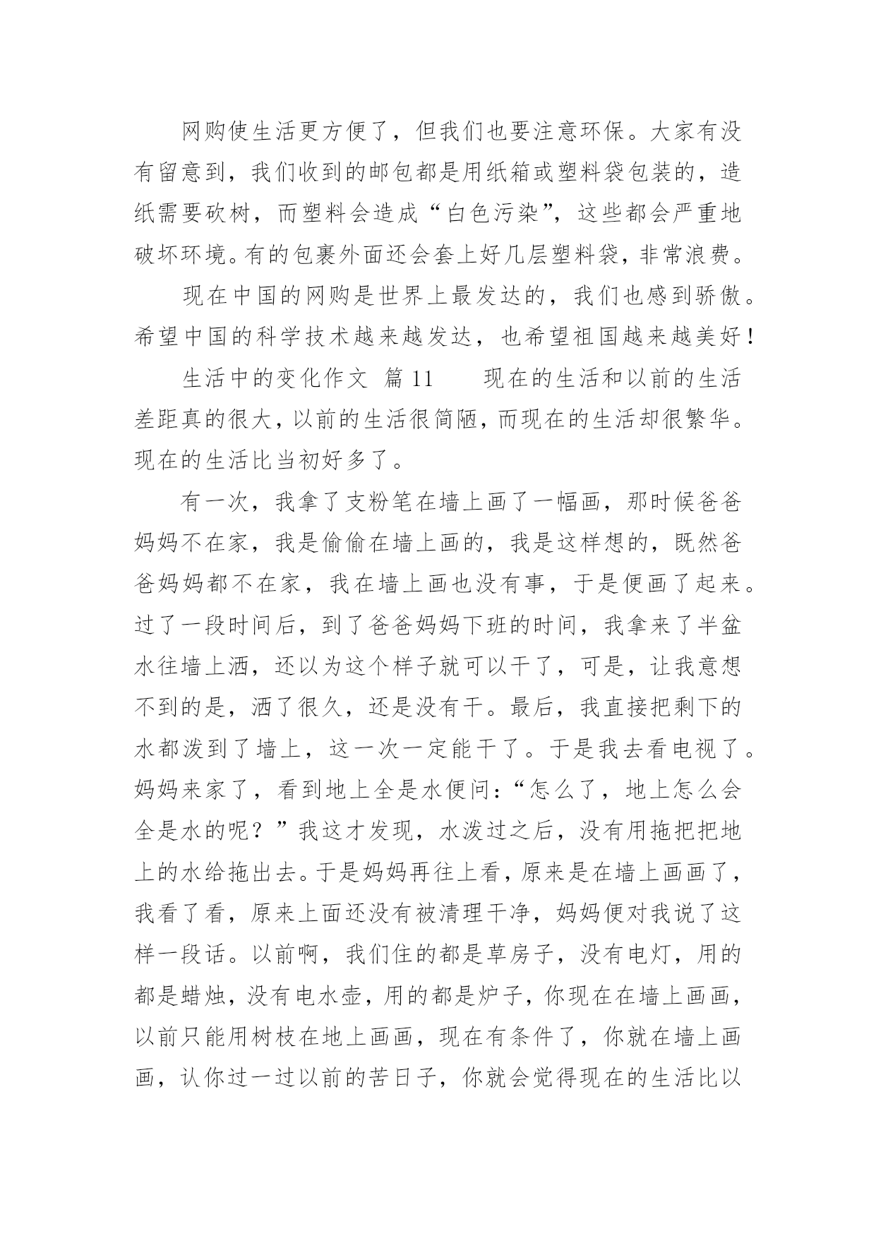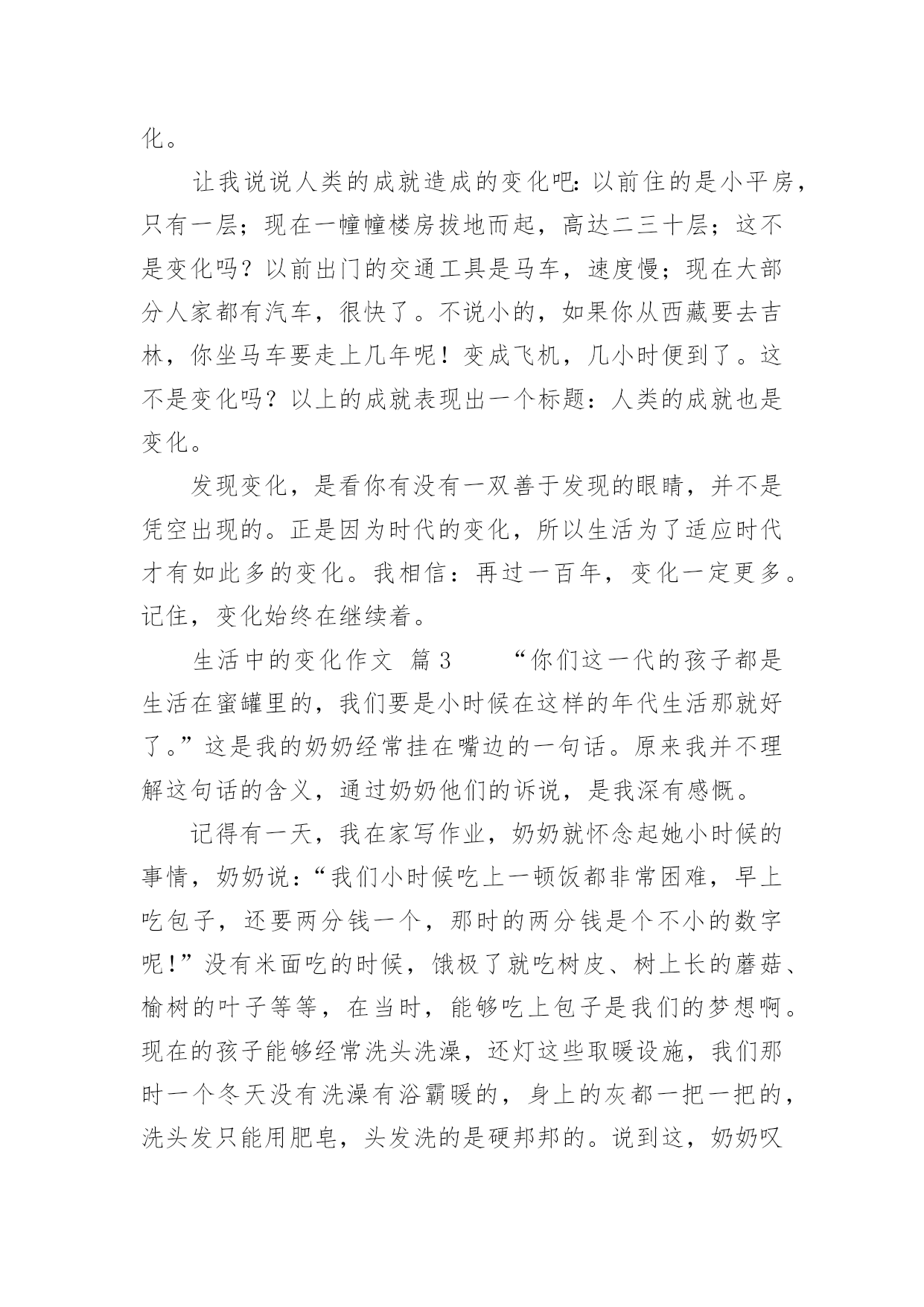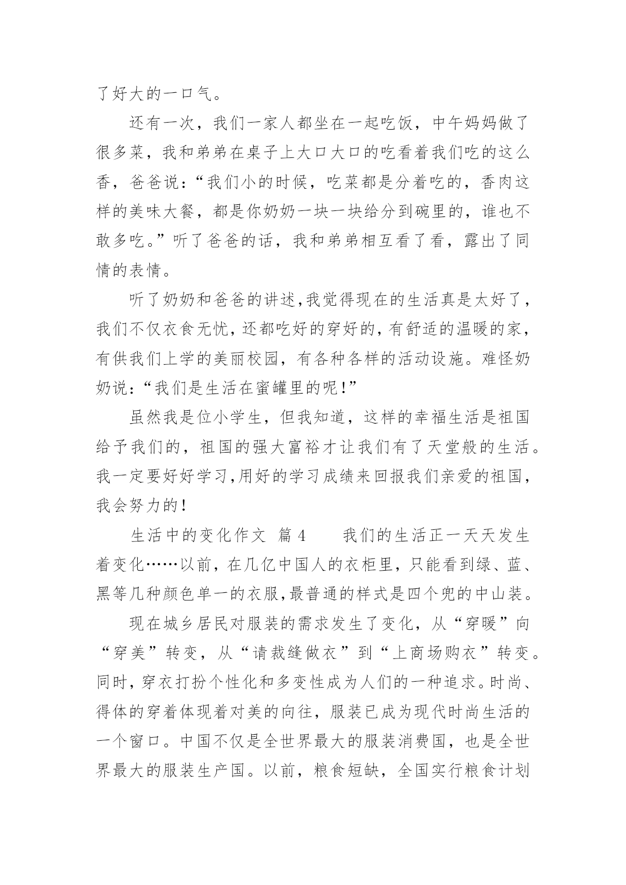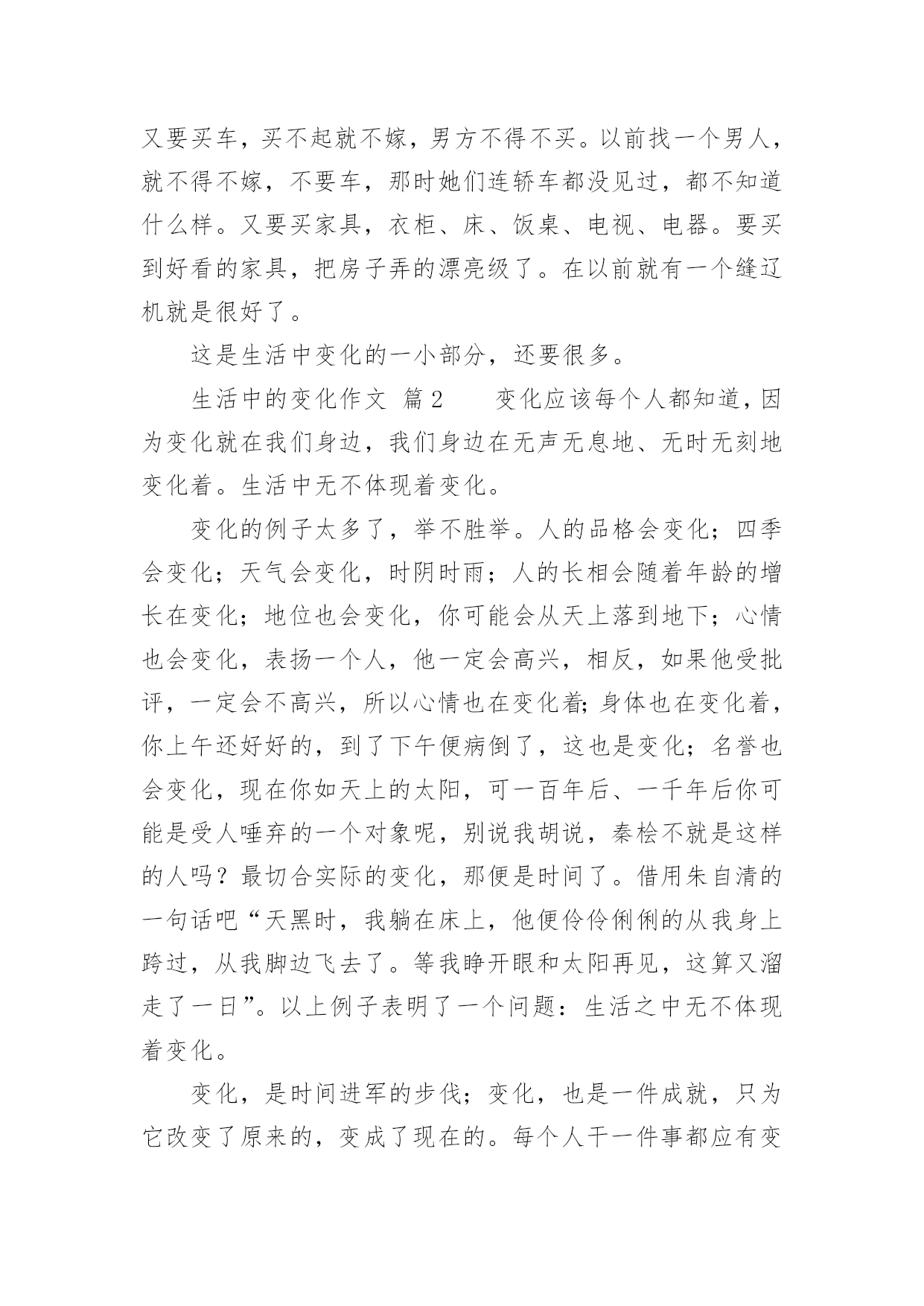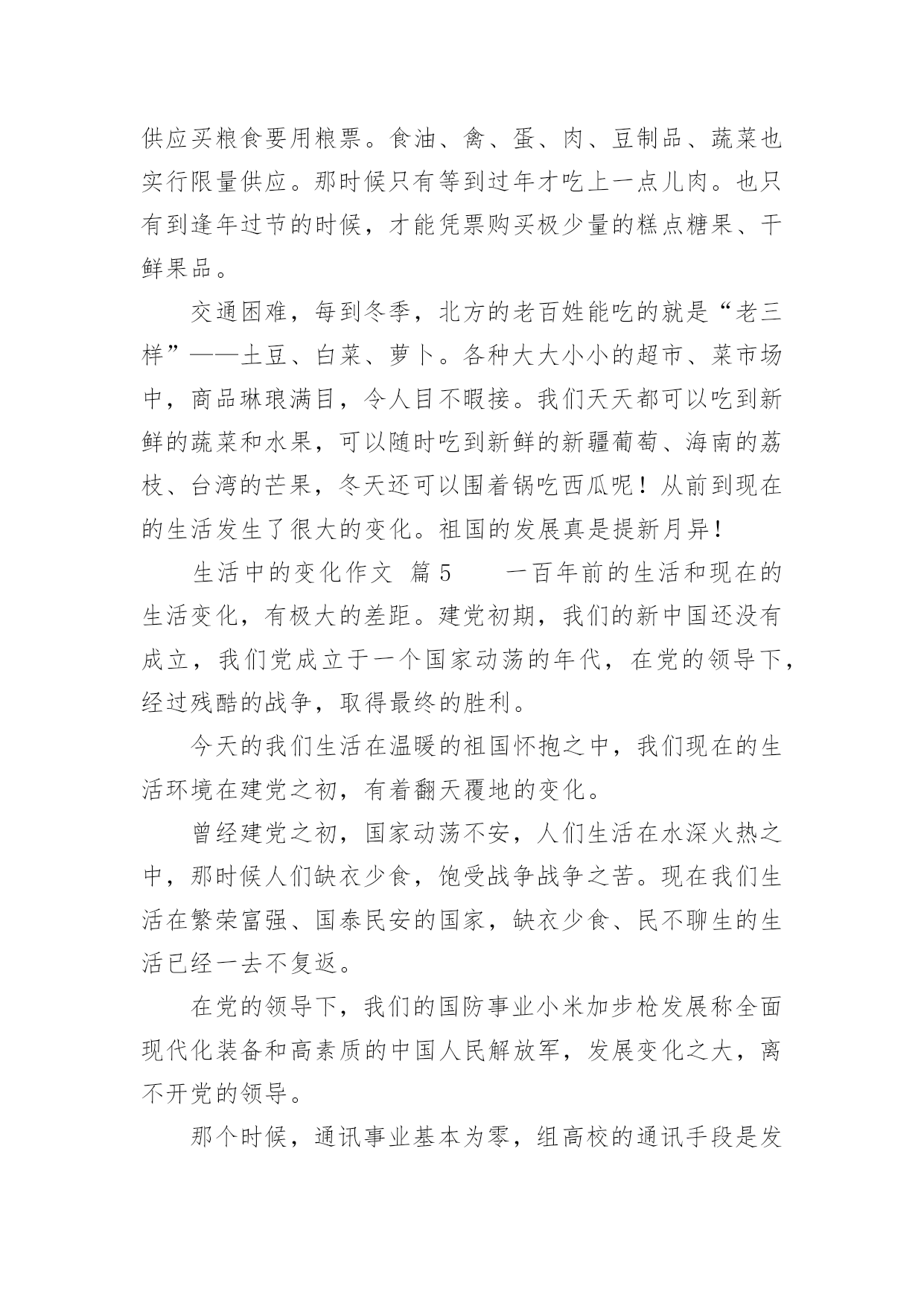 生活中的变化作文生活中的变化作文(精选27篇)在生活、工作和学习中,大家都有写作文的经历,对作文很是熟悉吧,作文是人们以书面形式表情达意的言语活动。相信很多朋友都对写作文感到非常苦恼吧,以下是小编为大家收集的生活中的变化作文,希望能够帮助到大家。生活中的变化作文篇1原来马路上一天也看不见几辆车。现在能看见数百台车。家乡的变化太大了。用淳朴装致,用自然点缀。路边的大树犹如窈窕淑女,君子好逑。结婚的喜车伴着大树的景象,飞的一下过去又一台,有二十多台车,轿车,都是豪华的车。在妈妈那时,连摩托车多没有,妈妈那是就一台大马车。在爷爷那根本就没有。婚纱,在新娘下车时人人都看到那美丽,漂亮的婚纱,裙边是丝边。新郎的西装。穿起来帅极了。在三十年前没有,只有布做一件新衣服。在六十年前没有这些,摆酒席,在饭店里定上几时桌,或者是在自家院子里摆酒席。在妈妈那时只是自家人在一两桌子就行了。现在的方远十里的人都来了。生活的怎么样,鱼、肉、烤鸭、烤鸡、虾、海货,都有,有二十多个菜。以前妈妈那时,三四个菜都不错了。结婚,女方要耧,一栋楼五十多万元,要地方好的、又大的楼。在以前妈妈要一个小瓦房都没有,都跟爷爷奶奶住一起。到了我出生前一年,我们家才住上属于自己的一个破破的房子。又要买车,买不起就不嫁,男方不得不买。以前找一个男人,就不得不嫁,不要车,那时她们连轿车都没见过,都不知道什么样。又要买家具,衣柜、床、饭桌、电视、电器。要买到好看的家具,把房子弄的漂亮级了。在以前就有一个缝辽机就是很好了。这是生活中变化的一小部分,还要很多。生活中的变化作文篇2变化应该每个人都知道,因为变化就在我们身边,我们身边在无声无息地、无时无刻地变化着。生活中无不体现着变化。变化的例子太多了,举不胜举。人的品格会变化;四季会变化;天气会变化,时阴时雨;人的长相会随着年龄的增长在变化;地位也会变化,你可能会从天上落到地下;心情也会变化,表扬一个人,他一定会高兴,相反,如果他受批评,一定会不高兴,所以心情也在变化着;身体也在变化着,你上午还好好的,到了下午便病倒了,这也是变化;名誉也会变化,现在你如天上的太阳,可一百年后、一千年后你可能是受人唾弃的一个对象呢,别说我胡说,秦桧不就是这样的人吗?最切合实际的变化,那便是时间了。借用朱自清的一句话吧“天黑时,我躺在床上,他便伶伶俐俐的从我身上跨过,从我脚边飞去了。等我睁开眼和太阳再见,这算又溜走了一日”。以上例子表明了一个问题:生活之中无不体现着变化。变化,是时间进军的步伐;变化,也是一件成就,只为它改变了原来的,变成了现在的。每个人干一件事都应有变化。让我说说人类的成就造成的变化吧:以前住的是小平房,只有一层;现在一幢幢楼房拔地而起,高达二三十层;这不是变化吗?以前出门的交通工具是马车,速度慢;现在大部分人家都有汽车,很快了。不说小的,如果你从西藏要去吉林,你坐马车要走上几年呢!变成飞机,几小时便到了。这不是变化吗?以上的成就表现出一个标题:人类的成就也是变化。发现变化,是看你有没有一双善于发现的眼睛,并不是凭空出现的。正是因为时代的变化,所以生活为了适应时代才有如此多的变化。我相信:再过一百年,变化一定更多。记住,变化始终在继续着。生活中的变化作文篇3“你们这一代的孩子都是生活在蜜罐里的,我们要是小时候在这样的年代生活那就好了。”这是我的奶奶经常挂在嘴边的一句话。原来我并不理解这句话的含义,通过奶奶他们的诉说,是我深有感慨。记得有一天,我在家写作业,奶奶就怀念起她小时候的事情,奶奶说:“我们小时候吃上一顿饭都非常困难,早上吃包子,还要两分钱一个,那时的两分钱是个不小的数字呢!”没有米面吃的时候,饿极了就吃树皮、树上长的蘑菇、榆树的叶子等等,在当时,能够吃上包子是我们的梦想啊。现在的孩子能够经常洗头洗澡,还灯这些取暖设施,我们那时一个冬天没有洗澡有浴霸暖的,身上的灰都一把一把的,洗头发只能用肥皂,头发洗的是硬邦邦的。说到这,奶奶叹了好大的一口气。还有一次,我们一家人都坐在一起吃饭,中午妈妈做了很多菜,我和弟弟在桌子上大口大口的吃看着我们吃的这么香,爸爸说:“我们小的时候,吃菜都是分着吃的,香肉这样的美味大餐,都是你奶奶一块一块给分到碗里的,谁也不敢多吃。”听了爸爸的话,我和弟弟相互看了看,露出了同情的表情。听了奶奶和爸爸的讲述,我觉得现在的生活真是太好了,我们不仅衣食无忧,还都吃好的穿好的,有舒适的温暖的家,有供我们上学的美丽校园,有各种各样的活动设施。难怪奶奶说:“我们是生活在蜜罐里的呢!”虽然我是位小学生,但我知道,这样的幸福生活是祖国给予我们的,祖国的强大富裕才让我们有了天堂般的生活。我一定要好好学习,用好的学习成绩来回报我们亲爱的祖国,我会努力的!生活中的变化作文篇4我们的生活正一天天发生着变化……以前,在几亿中国人的衣柜里