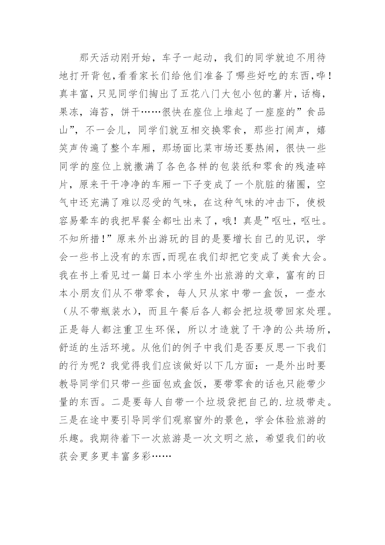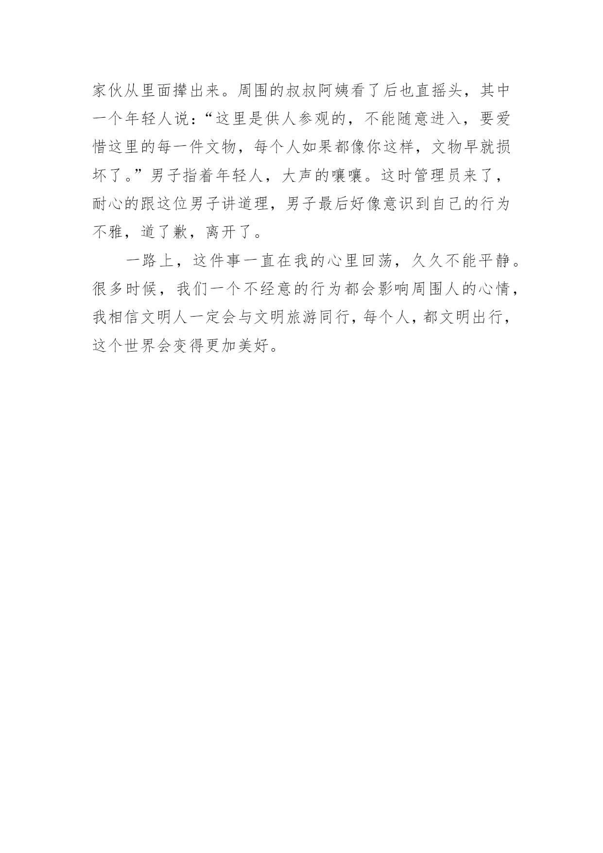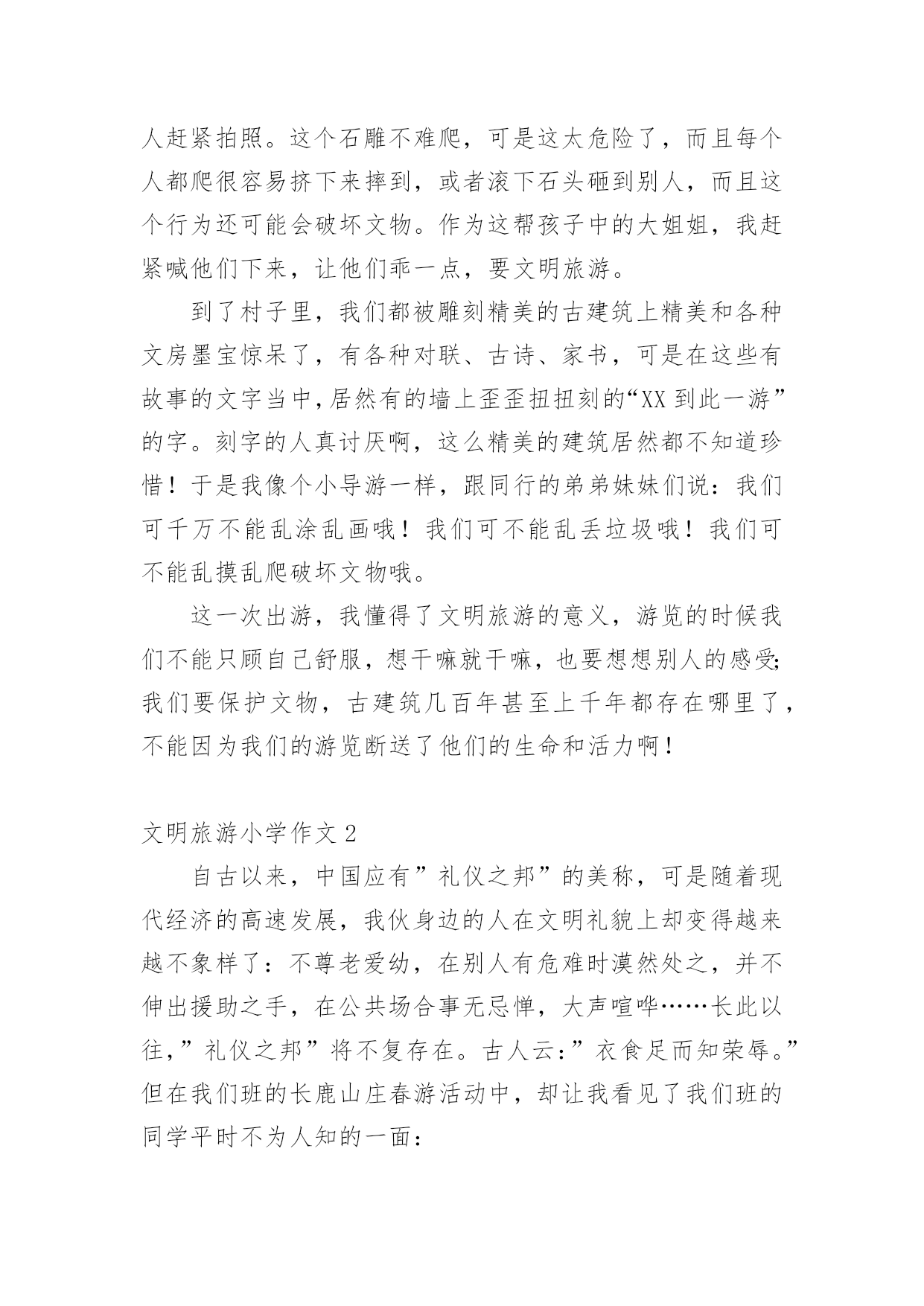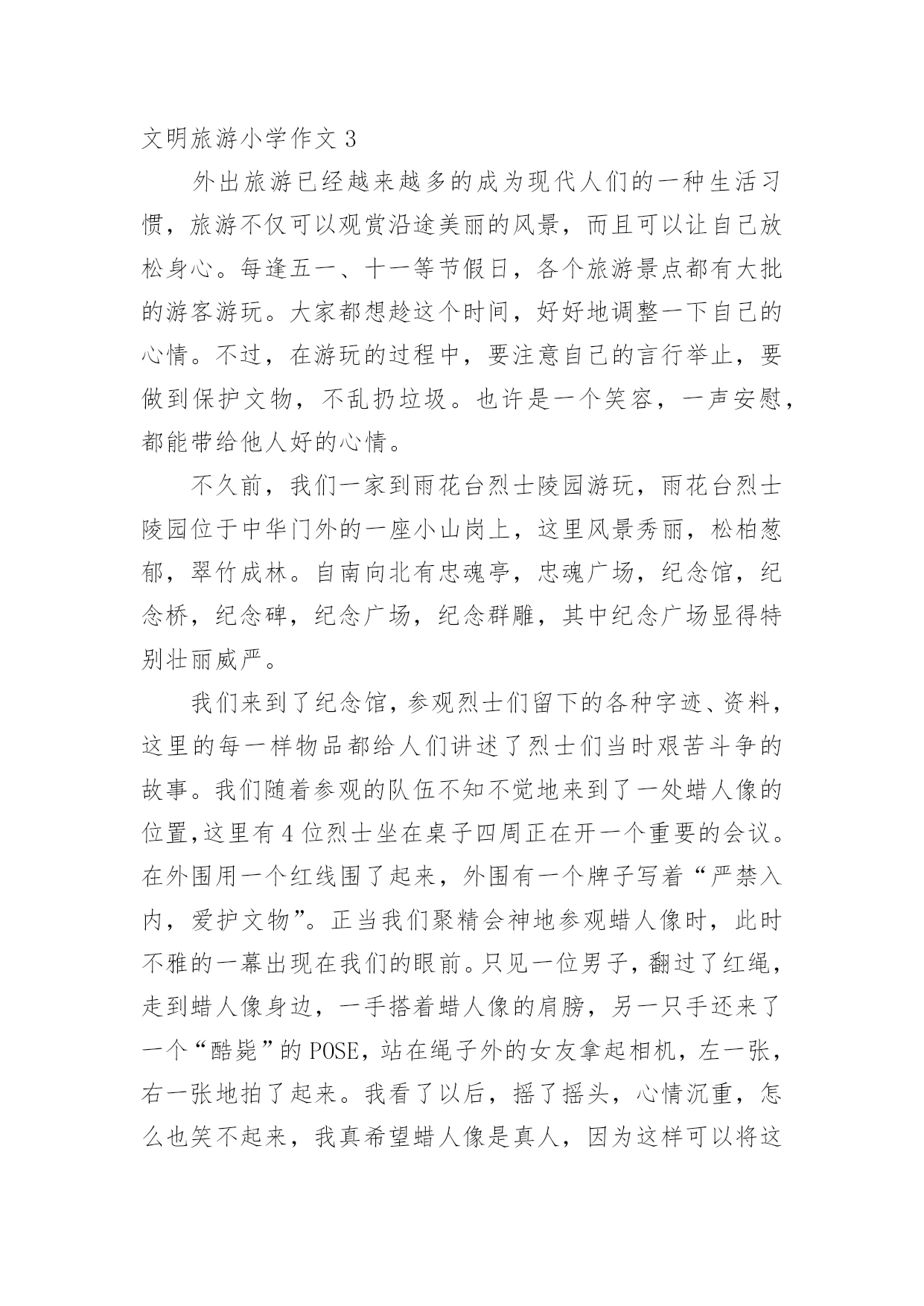 文明旅游小学作文在学习、工作或生活中,大家最不陌生的就是作文了吧,作文根据写作时限的不同可以分为限时作文和非限时作文。那么一般作文是怎么写的呢?下面是小编为大家整理的文明旅游小学作文,希望能够帮助到大家。文明旅游小学作文1小长假时,妈妈单位组织了旅游,去西递古村玩儿。去的路上,导游就对我们介绍说,这里风景如画,西递是世界文化遗产、中国历史文明古村,并且介绍了这里是保存完好的徽派古建筑村,让我们充满了期待。到村口了,远远看过去,古村真热闹啊,白天游人如织,各种店铺叫卖声此起彼伏。我们排在门口的广场等待买票,这时候我们几个一起去的小孩子在大广场嬉戏打闹。我们发现有一个大石头,足有大象那么大,雕刻着“西递古村”几个鲜红大字,很多人围在前面拍照,但是他们千篇一律都是剪刀手的姿势,真没劲。这时我们当中有一个调皮的男孩发现这个大石头是拼起来的,像假山,他就像孙悟空到了花果山一样自如灵巧的爬了上去,看他在大石雕上摆出那么有趣的姿势,其他几个孩子也跟着往上爬,不一会石头上就大大小小有四五个小孩了。刚才还觉的像大象一样庞大的假山,顿时就显得拥挤了,那拼起来的石头也摇摇欲坠仿佛随时都要滚落下来一样,可是还没爬上去的孩还想往上挤,喊着大人赶紧拍照。这个石雕不难爬,可是这太危险了,而且每个人都爬很容易挤下来摔到,或者滚下石头砸到别人,而且这个行为还可能会破坏文物。作为这帮孩子中的大姐姐,我赶紧喊他们下来,让他们乖一点,要文明旅游。到了村子里,我们都被雕刻精美的古建筑上精美和各种文房墨宝惊呆了,有各种对联、古诗、家书,可是在这些有故事的文字当中,居然有的墙上歪歪扭扭刻的“XX到此一游”的字。刻字的人真讨厌啊,这么精美的建筑居然都不知道珍惜!于是我像个小导游一样,跟同行的弟弟妹妹们说:我们可千万不能乱涂乱画哦!我们可不能乱丢垃圾哦!我们可不能乱摸乱爬破坏文物哦。这一次出游,我懂得了文明旅游的意义,游览的时候我们不能只顾自己舒服,想干嘛就干嘛,也要想想别人的感受;我们要保护文物,古建筑几百年甚至上千年都存在哪里了,不能因为我们的游览断送了他们的生命和活力啊!文明旅游小学作文2自古以来,中国应有”礼仪之邦”的美称,可是随着现代经济的高速发展,我伙身边的人在文明礼貌上却变得越来越不象样了:不尊老爱幼,在别人有危难时漠然处之,并不伸出援助之手,在公共场合事无忌惮,大声喧哗……长此以往,”礼仪之邦”将不复存在。古人云:”衣食足而知荣辱。”但在我们班的长鹿山庄春游活动中,却让我看见了我们班的同学平时不为人知的一面:那天活动刚开始,车子一起动,我们的同学就迫不用待地打开背包,看看家长们给他们准备了哪些好吃的东西,哗!真丰富,只见同学们掏出了五花八门大包小包的薯片,话梅,果冻,海苔,饼干……很快在座位上堆起了一座座的”食品山”,不一会儿,同学们就互相交换零食,那些打闹声,嬉笑声传遍了整个车厢,那场面比菜市场还要热闹,很快一些同学的座位上就撒满了各色各样的包装纸和零食的残渣碎片,原来干干净净的车厢一下子变成了一个肮脏的猪圈,空气中还充满了难以忍受的气味,在这种气味的冲击下,使极容易晕车的我把早餐全都吐出来了,哦!真是”呕吐,呕吐。不知所措!”原来外出游玩的目的是要增长自己的见识,学会一些书上没有的东西,而现在我们却把它变成了美食大会。我在书上看见过一篇日本小学生外出旅游的文章,富有的日本小朋友们从不带零食,每人只从家中带一盒饭,一壶水(从不带瓶装水),而且午餐后各人都会把垃圾带回家处理。正是每人都注重卫生环保,所以才造就了干净的公共场所,舒适的生活环境。从他们的例子中我们是否要反思一下我们的行为呢?我觉得我们应该做好以下几方面:一是外出时要教导同学们只带一些面包或盒饭,要带零食的话也只能带少量的东西。二是要每人自带一个垃圾袋把自己的.垃圾带走。三是在途中要引导同学们观察窗外的景色,学会体验旅游的乐趣。我期待着下一次旅游是一次文明之旅,希望我们的收获会更多更丰富多彩……文明旅游小学作文3外出旅游已经越来越多的成为现代人们的一种生活习惯,旅游不仅可以观赏沿途美丽的风景,而且可以让自己放松身心。每逢五一、十一等节假日,各个旅游景点都有大批的游客游玩。大家都想趁这个时间,好好地调整一下自己的心情。不过,在游玩的过程中,要注意自己的言行举止,要做到保护文物,不乱扔垃圾。也许是一个笑容,一声安慰,都能带给他人好的心情。不久前,我们一家到雨花台烈士陵园游玩,雨花台烈士陵园位于中华门外的一座小山岗上,这里风景秀丽,松柏葱郁,翠竹成林。自南向北有忠魂亭,忠魂广场,纪念馆,纪念桥,纪念碑,纪念广场,纪念群雕,其中纪念广场显得特别壮丽威严。我们来到了纪念馆,参观烈士们留下的各种字迹、资料,这里的每一样物品都给人们讲述了烈士们当时艰苦斗争的故事。我们随着参观的队伍不知不觉地来到了一处蜡人像的