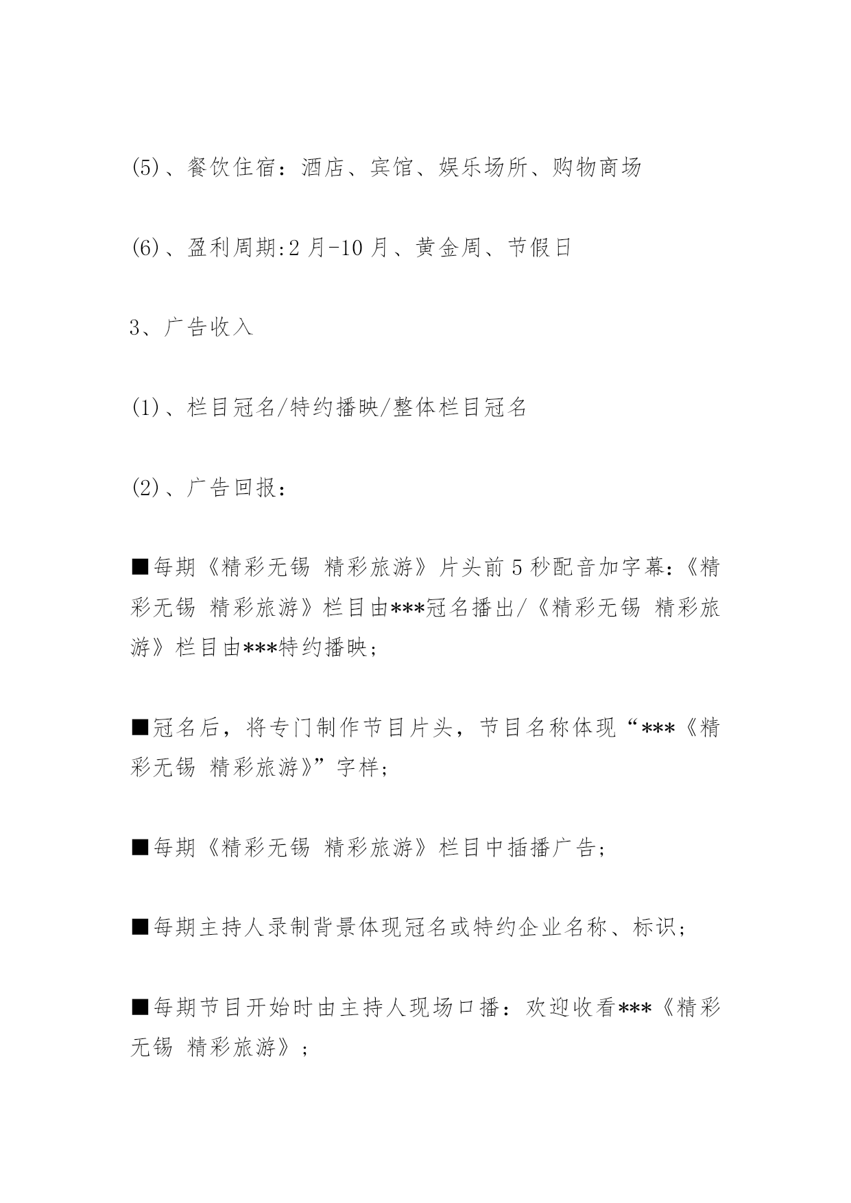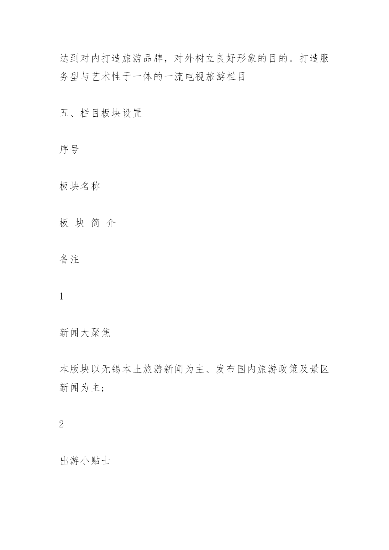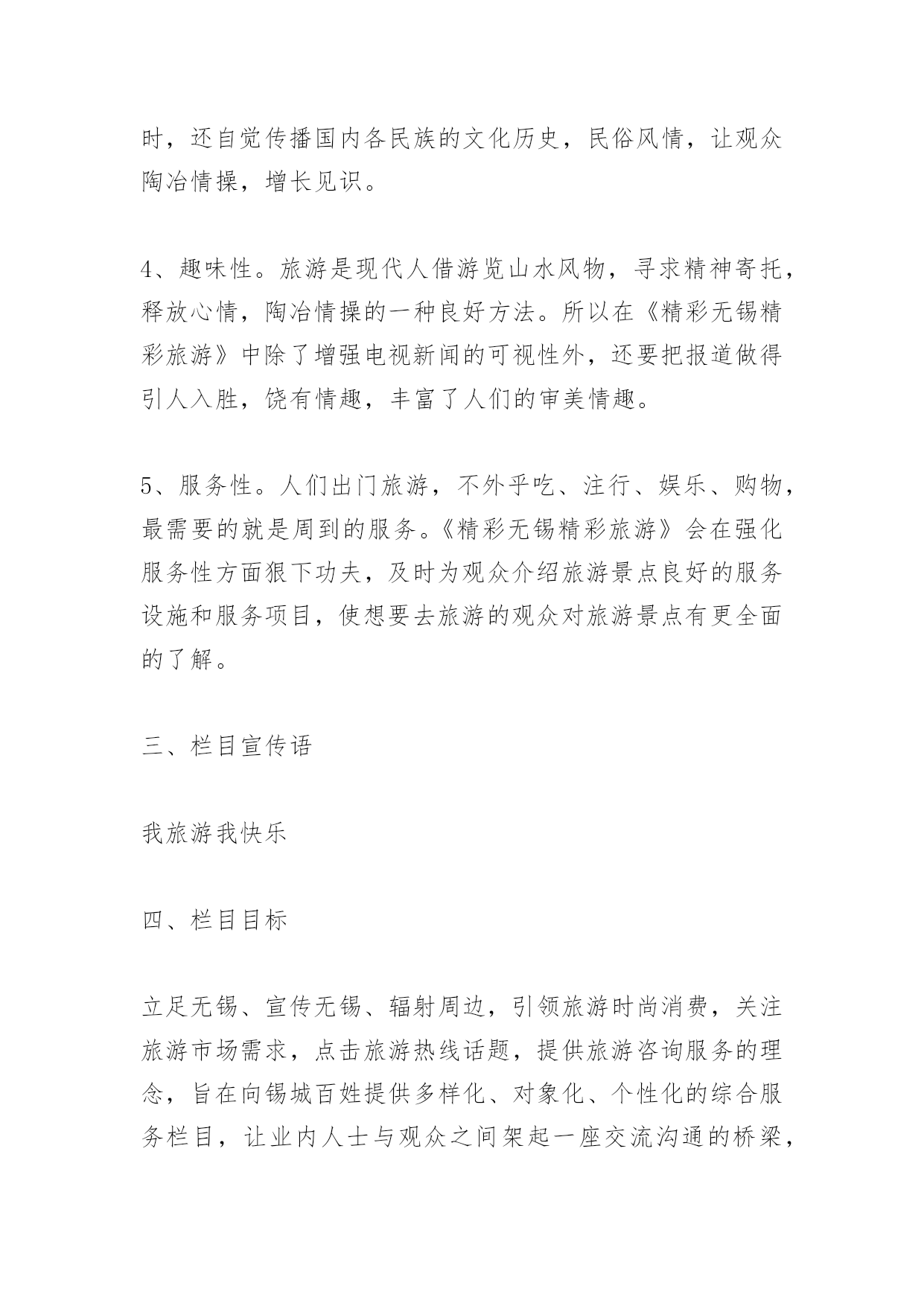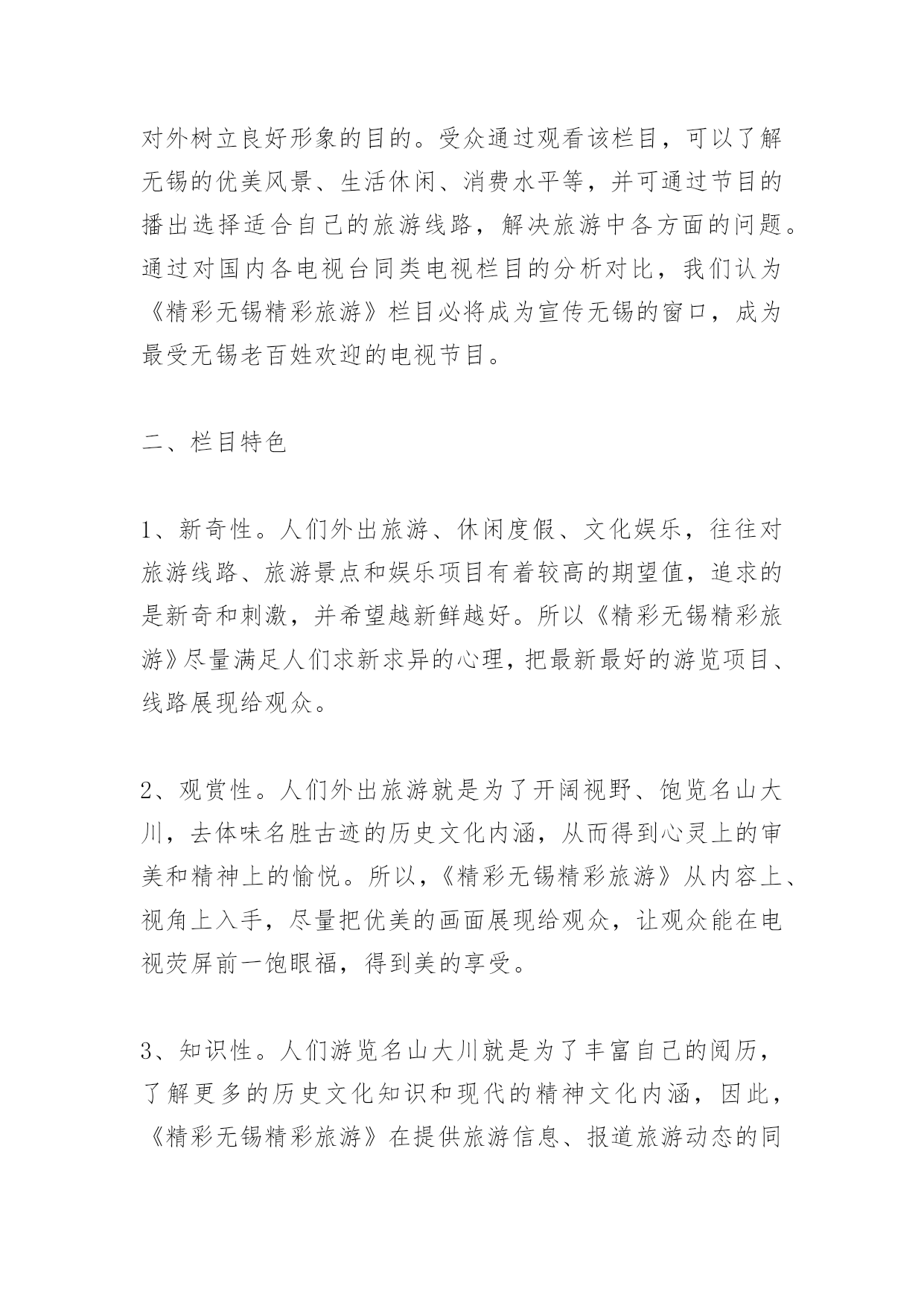 旅游栏目策划书旅游栏目策划书《精彩无锡精彩旅游》旅游电视栏目策划提案栏目名称:精彩无锡精彩旅游策划单位:无锡蓝天文化传媒有限公司策划人:张文杰正文一、栏目定位随着无锡旅游业发展再次提升到一个新的高度,打造一个集新奇性、观赏性、知识性、趣味性、服务性于一体的全新旅游类节目显得尤为重要,本栏目本着立足无锡、宣传无锡、辐射周边,引领旅游时尚消费,关注旅游市场需求,点击旅游热线话题,提供旅游咨询服务的理念,旨在向锡城百姓提供多样化、对象化、个性化的综合服务栏目,让业内人士与观众之间架起一座交流沟通的桥梁,达到对内打造旅游品牌,对外树立良好形象的目的。受众通过观看该栏目,可以了解无锡的优美风景、生活休闲、消费水平等,并可通过节目的播出选择适合自己的旅游线路,解决旅游中各方面的问题。通过对国内各电视台同类电视栏目的分析对比,我们认为《精彩无锡精彩旅游》栏目必将成为宣传无锡的窗口,成为最受无锡老百姓欢迎的电视节目。二、栏目特色1、新奇性。人们外出旅游、休闲度假、文化娱乐,往往对旅游线路、旅游景点和娱乐项目有着较高的期望值,追求的是新奇和刺激,并希望越新鲜越好。所以《精彩无锡精彩旅游》尽量满足人们求新求异的心理,把最新最好的游览项目、线路展现给观众。2、观赏性。人们外出旅游就是为了开阔视野、饱览名山大川,去体味名胜古迹的历史文化内涵,从而得到心灵上的审美和精神上的愉悦。所以,《精彩无锡精彩旅游》从内容上、视角上入手,尽量把优美的画面展现给观众,让观众能在电视荧屏前一饱眼福,得到美的享受。3、知识性。人们游览名山大川就是为了丰富自己的阅历,了解更多的历史文化知识和现代的精神文化内涵,因此,《精彩无锡精彩旅游》在提供旅游信息、报道旅游动态的同时,还自觉传播国内各民族的文化历史,民俗风情,让观众陶冶情操,增长见识。4、趣味性。旅游是现代人借游览山水风物,寻求精神寄托,释放心情,陶冶情操的一种良好方法。所以在《精彩无锡精彩旅游》中除了增强电视新闻的可视性外,还要把报道做得引人入胜,饶有情趣,丰富了人们的审美情趣。5、服务性。人们出门旅游,不外乎吃、注行、娱乐、购物,最需要的就是周到的服务。《精彩无锡精彩旅游》会在强化服务性方面狠下功夫,及时为观众介绍旅游景点良好的服务设施和服务项目,使想要去旅游的观众对旅游景点有更全面的了解。三、栏目宣传语我旅游我快乐四、栏目目标立足无锡、宣传无锡、辐射周边,引领旅游时尚消费,关注旅游市场需求,点击旅游热线话题,提供旅游咨询服务的理念,旨在向锡城百姓提供多样化、对象化、个性化的综合服务栏目,让业内人士与观众之间架起一座交流沟通的桥梁,达到对内打造旅游品牌,对外树立良好形象的目的。打造服务型与艺术性于一体的一流电视旅游栏目五、栏目板块设置序号板块名称板块简介备注1新闻大聚焦本版块以无锡本土旅游新闻为主、发布国内旅游政策及景区新闻为主;2出游小贴士引导旅游消费,针对人们旅游中的“吃、注行、游、购、娱”进行引导性友情提示3魅力当家人主要围绕旅游界知名人士进行专访,搭建业内人士与普通受众之间交流的桥梁和平台4专家来支招旅游解惑板块,邀请业内资深人士进行旅游方面的答疑解惑,向受众提供权威信息5旅途故事多传播旅游界、人们旅游途中发生的感人故事、奇闻轶事,展现旅途中的幸福快乐6短信互动地带针对手机短信平台和《无锡旅游网》进行观众互动,获取观众对栏目的关注信息7有多远走多远以一个精华旅游为背景,以行程中的体验为线索,采撷大江南北风采,展现华夏文明8精彩线路推介及时发布旅行社精品线路,提供导向性信息播出时间17:45--18:00隔日重播3次。六、栏目基本构架:VTR方式+演播室1、节目导视:用凝炼的语言和经典的修辞,给观众一个明确的旅游信息。2、主持人串场:主持人在风格上要讲究对话的艺术,讲求平视,能够调动观众,幽默睿智。宣传好旅游业的新信息、新动态、新气象、新风貌。改变过去报道旅游的陈旧方法,力争使旅游报道能多侧面、多层次、多角度、全方位地反映现代旅游业给社会所带来的崭新变化,以及旅游业对人们生活所带来的巨大影响。七、栏目可行性分析1、栏目运营模式——市场化路线,企业化运作2、栏目产出分析(1)、盈利渠道:景点、旅行社、旅游公司:(2)、电子设备商:数码相机、摄像机等,苏宁、国美;(3)、活动赞助商:品牌饮料、纯净水、矿泉水(4)、媒体:联合营销(5)、餐饮住宿:酒店、宾馆、娱乐场所、购物商场(6)、盈利周期:2月-10月、黄金周、节假日3、广告收入(1)、栏目冠名/特约播映/整体栏目冠名(2)、广告回报:■每期《精彩无锡精彩旅游》片头前5秒配音加字幕:《精彩无锡精彩旅游》栏目由***冠名播出/《精彩无锡精彩旅游》栏目由***特约播映;■冠名后,将专门制作节目片头,节目名称体现“***《精彩无锡精彩旅游》”字样;■每期《精彩无