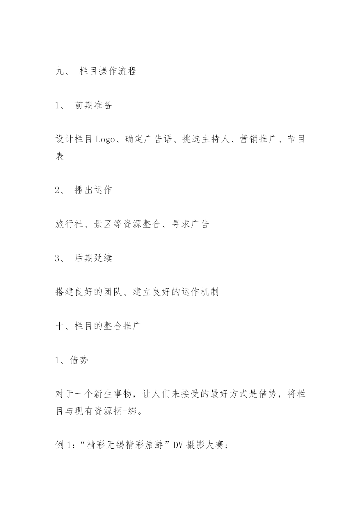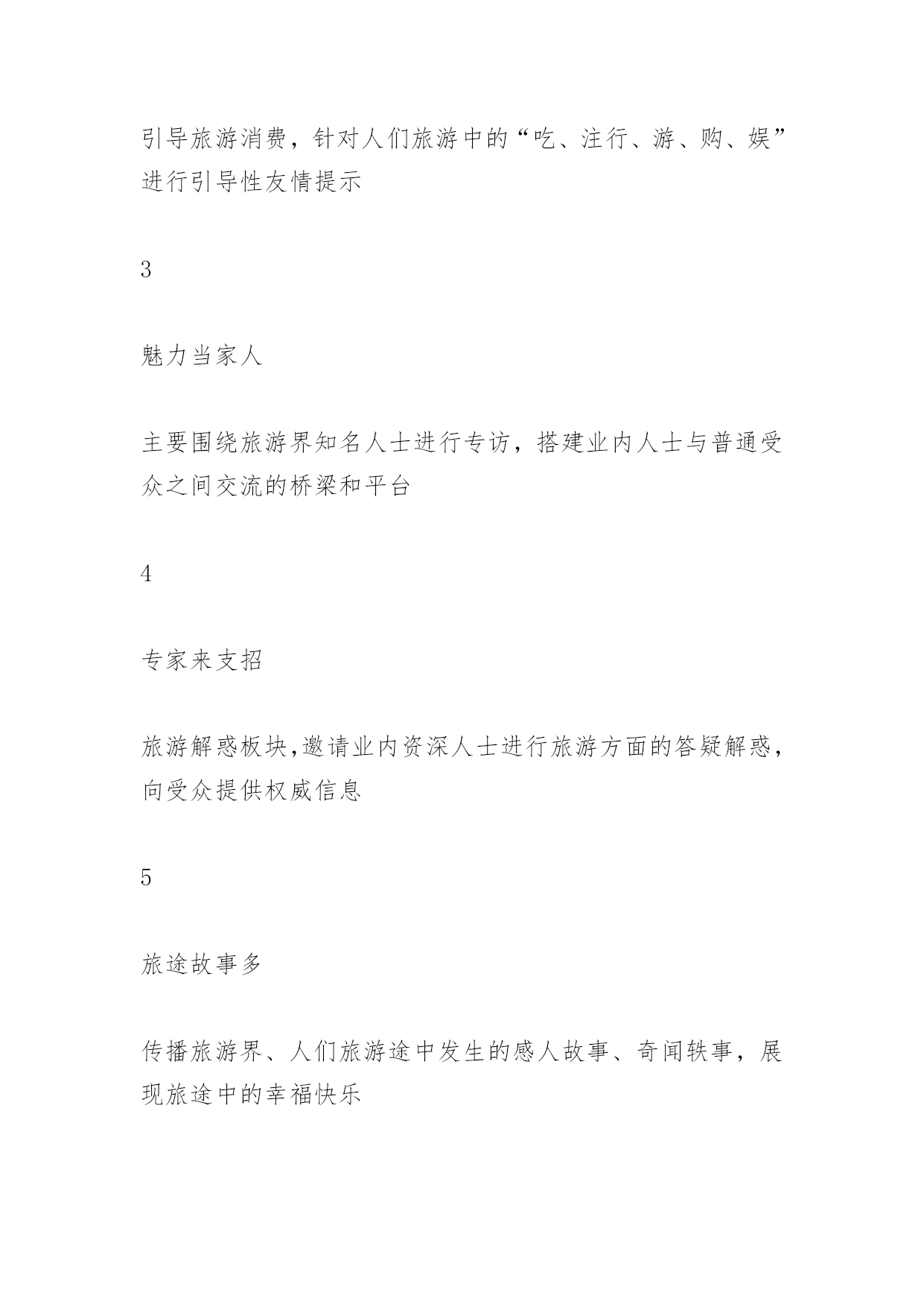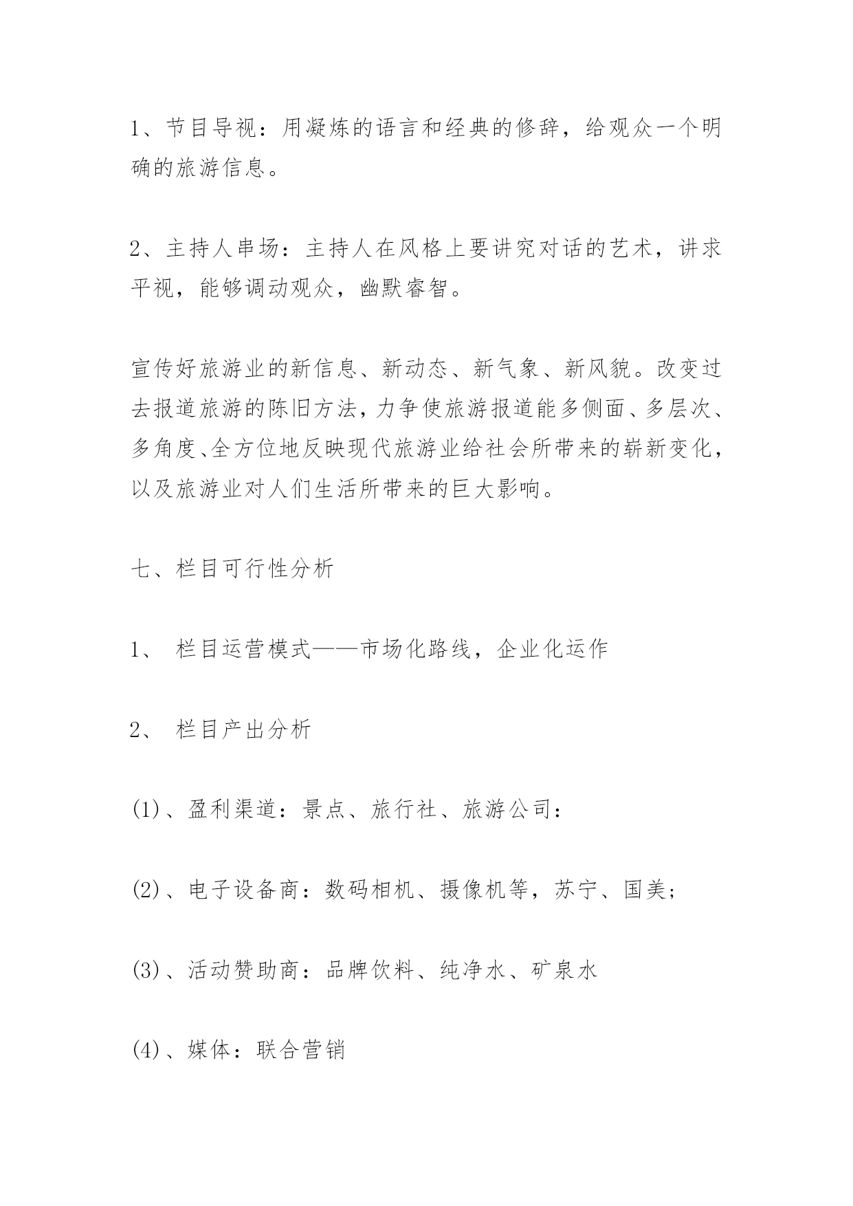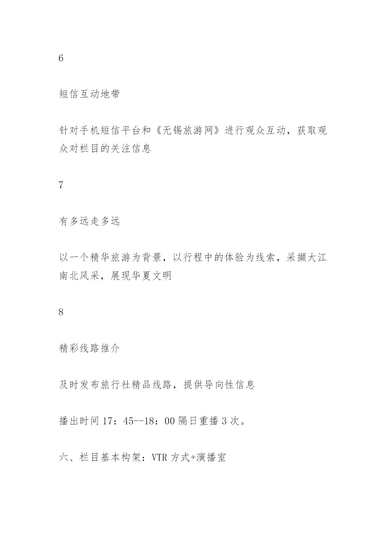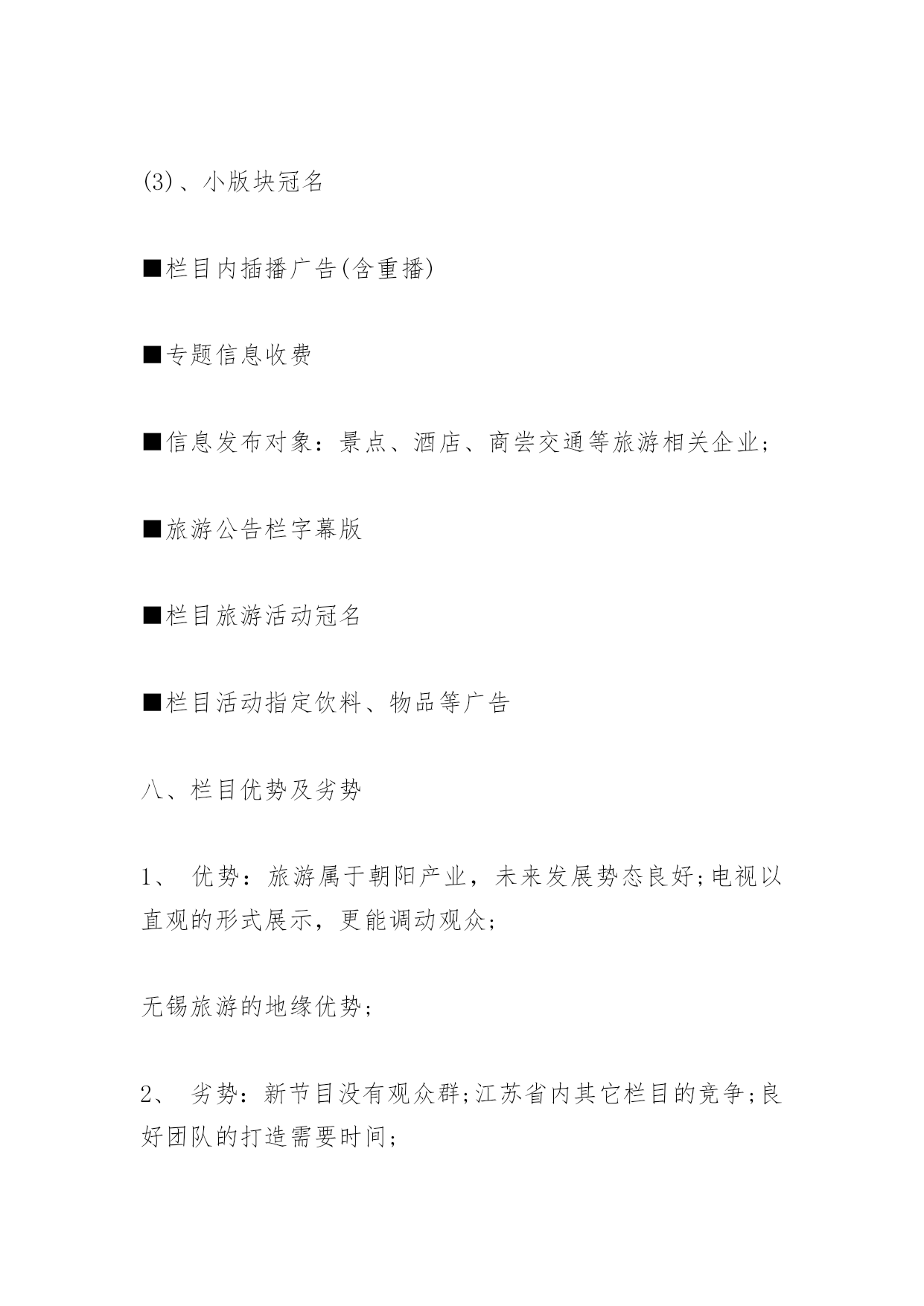 旅游栏目策划书旅游栏目策划书《精彩无锡精彩旅游》旅游电视栏目策划提案栏目名称:精彩无锡精彩旅游策划单位:无锡蓝天文化传媒有限公司策划人:张文杰正文一、栏目定位随着无锡旅游业发展再次提升到一个新的高度,打造一个集新奇性、观赏性、知识性、趣味性、服务性于一体的全新旅游类节目显得尤为重要,本栏目本着立足无锡、宣传无锡、辐射周边,引领旅游时尚消费,关注旅游市场需求,点击旅游热线话题,提供旅游咨询服务的理念,旨在向锡城百姓提供多样化、对象化、个性化的综合服务栏目,让业内人士与观众之间架起一座交流沟通的桥梁,达到对内打造旅游品牌,对外树立良好形象的目的。受众通过观看该栏目,可以了解无锡的优美风景、生活休闲、消费水平等,并可通过节目的播出选择适合自己的旅游线路,解决旅游中各方面的问题。通过对国内各电视台同类电视栏目的分析对比,我们认为《精彩无锡精彩旅游》栏目必将成为宣传无锡的窗口,成为最受无锡老百姓欢迎的电视节目。二、栏目特色1、新奇性。人们外出旅游、休闲度假、文化娱乐,往往对旅游线路、旅游景点和娱乐项目有着较高的期望值,追求的是新奇和刺激,并希望越新鲜越好。所以《精彩无锡精彩旅游》尽量满足人们求新求异的心理,把最新最好的游览项目、线路展现给观众。2、观赏性。人们外出旅游就是为了开阔视野、饱览名山大川,去体味名胜古迹的历史文化内涵,从而得到心灵上的审美和精神上的愉悦。所以,《精彩无锡精彩旅游》从内容上、视角上入手,尽量把优美的画面展现给观众,让观众能在电视荧屏前一饱眼福,得到美的享受。3、知识性。人们游览名山大川就是为了丰富自己的阅历,了解更多的历史文化知识和现代的精神文化内涵,因此,《精彩无锡精彩旅游》在提供旅游信息、报道旅游动态的同时,还自觉传播国内各民族的文化历史,民俗风情,让观众陶冶情操,增长见识。4、趣味性。旅游是现代人借游览山水风物,寻求精神寄托,释放心情,陶冶情操的一种良好方法。所以在《精彩无锡精彩旅游》中除了增强电视新闻的可视性外,还要把报道做得引人入胜,饶有情趣,丰富了人们的审美情趣。5、服务性。人们出门旅游,不外乎吃、注行、娱乐、购物,最需要的就是周到的服务。《精彩无锡精彩旅游》会在强化服务性方面狠下功夫,及时为观众介绍旅游景点良好的服务设施和服务项目,使想要去旅游的观众对旅游景点有更全面的了解。三、栏目宣传语我旅游我快乐四、栏目目标立足无锡、宣传无锡、辐射周边,引领旅游时尚消费,关注旅游市场需求,点击旅游热线话题,提供旅游咨询服务的理念,旨在向锡城百姓提供多样化、对象化、个性化的综合服务栏目,让业内人士与观众之间架起一座交流沟通的桥梁,达到对内打造旅游品牌,对外树立良好形象的目的。打造服务型与艺术性于一体的一流电视旅游栏目五、栏目板块设置序号板块名称板块简介备注1新闻大聚焦本版块以无锡本土旅游新闻为主、发布国内旅游政策及景区新闻为主;2出游小贴士引导旅游消费,针对人们旅游中的“吃、注行、游、购、娱”进行引导性友情提示3魅力当家人主要围绕旅游界知名人士进行专访,搭建业内人士与普通受众之间交流的桥梁和平台4专家来支招旅游解惑板块,邀请业内资深人士进行旅游方面的答疑解惑,向受众提供权威信息5旅途故事多传播旅游界、人们旅游途中发生的感人故事、奇闻轶事,展现旅途中的幸福快乐6短信互动地带针对手机短信平台和《无锡旅游网》进行观众互动,获取观众对栏目的关注信息7有多远走多远以一个精华旅游为背景,以行程中的体验为线索,采撷大江南北风采,展现华夏文明8精彩线路推介及时发布旅行社精品线路,提供导向性信息播出时间17:45--18:00隔日重播3次。六、栏目基本构架:VTR方式+演播室1、节目导视:用凝炼的语言和经典的修辞,给观众一个明确的旅游信息。2、主持人串场:主持人在风格上要讲究对话的艺术,讲求平视,能够调动观众,幽默睿智。宣传好旅游业的新信息、新动态、新气象、新风貌。改变过去报道旅游的陈旧方法,力争使旅游报道能多侧面、多层次、多角度、全方位地反映现代旅游业给社会所带来的崭新变化,以及旅游业对人们生活所带来的巨大影响。七、栏目可行性分析1、栏目运营模式——市场化路线,企业化运作2、栏目产出分析(1)、盈利渠道:景点、旅行社、旅游公司:(2)、电子设备商:数码相机、摄像机等,苏宁、国美;(3)、活动赞助商:品牌饮料、纯净水、矿泉水(4)、媒体:联合营销(5)、餐饮住宿:酒店、宾馆、娱乐场所、购物商场(6)、盈利周期:2月-10月、黄金周、节假日3、广告收入(1)、栏目冠名/特约播映/整体栏目冠名(2)、广告回报:■每期《精彩无锡精彩旅游》片头前5秒配音加字幕:《精彩无锡精彩旅游》栏目由***冠名播出/《精彩无锡精彩旅游》栏目由***特约播映;■冠名后,将专门制作节目片头,节目名称体现“***《精彩无锡精彩旅游》”字样;■每期《精彩无
