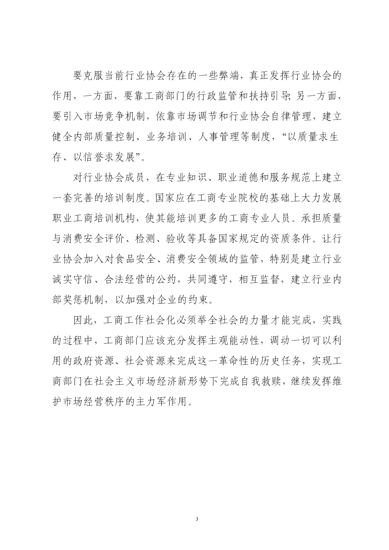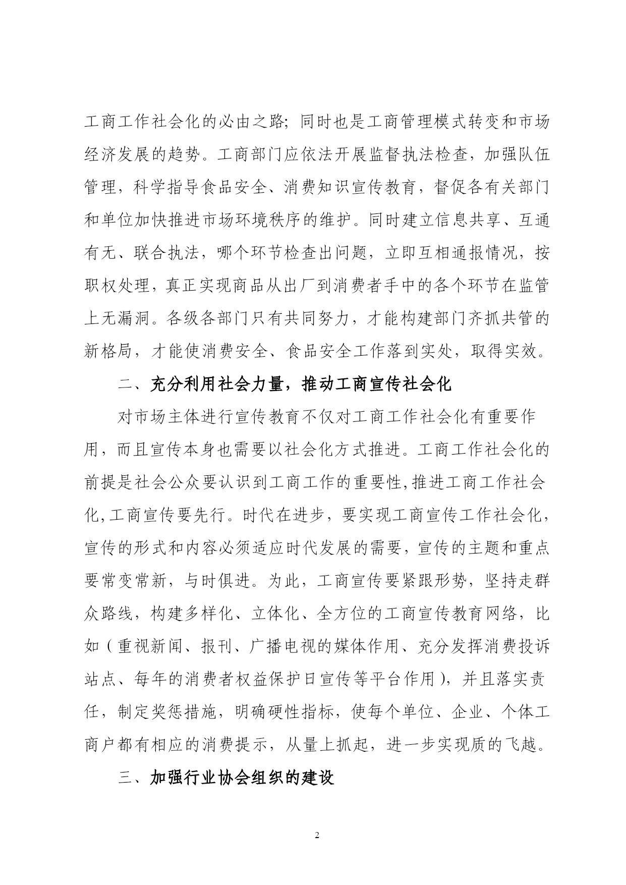 PAGEPAGE3浅谈工商社会化工作实践措施王海英随着经济体制改革的不断深入,社会经济成分呈现多元化,个体、私营等市场主体的大量增加,增加了工商管理的难度,加之工商人员相对不足、设备相对落后,工商工作面临着许多新情况、新问题,从而对工商工作提出了更高更新的要求,给我国工商工作带来了前所未有的挑战。针对这些问题,应该用发展的眼光看待,要拓宽思路,突破常规,必须打破工商部门“唱主角”、其他单位“当陪衬”或“看热闹”的现状,必须最广泛地调动和发挥全社会的力量。实现政府统一领导、部门依法监管、单位全面负责、公民积极参与,这是工商工作的原则。然而由于我国工商工作社会化程度不高,制约因素也很多,也存在一些模糊认识,滞后于经济与社会发展,许多管理资源没有得到利用,许多社会化手段没有得到充分发挥,因此提出以下对策及具体措施。一、政府主导,社会联动各级政府务必从讲政治、保稳定、促发展的高度出发,切实加强对工商工作的领导,把工商工作纳入政府的任期目标,列入重要的议事日程,及时研究解决公共工商设施建设,工商专业人才队伍的发展以保证工商事业与经济建设同步发展,同时,加强部门联动,建立社会联动互助的工作机制是开展工商工作,实现工商工作社会化的必由之路;同时也是工商管理模式转变和市场经济发展的趋势。工商部门应依法开展监督执法检查,加强队伍管理,科学指导食品安全、消费知识宣传教育,督促各有关部门和单位加快推进市场环境秩序的维护。同时建立信息共享、互通有无、联合执法,哪个环节检查出问题,立即互相通报情况,按职权处理,真正实现商品从出厂到消费者手中的各个环节在监管上无漏洞。各级各部门只有共同努力,才能构建部门齐抓共管的新格局,才能使消费安全、食品安全工作落到实处,取得实效。二、充分利用社会力量,推动工商宣传社会化对市场主体进行宣传教育不仅对工商工作社会化有重要作用,而且宣传本身也需要以社会化方式推进。工商工作社会化的前提是社会公众要认识到工商工作的重要性,推进工商工作社会化,工商宣传要先行。时代在进步,要实现工商宣传工作社会化,宣传的形式和内容必须适应时代发展的需要,宣传的主题和重点要常变常新,与时俱进。为此,工商宣传要紧跟形势,坚持走群众路线,构建多样化、立体化、全方位的工商宣传教育网络,比如(重视新闻、报刊、广播电视的媒体作用、充分发挥消费投诉站点、每年的消费者权益保护日宣传等平台作用),并且落实责任,制定奖惩措施,明确硬性指标,使每个单位、企业、个体工商户都有相应的消费提示,从量上抓起,进一步实现质的飞越。三、加强行业协会组织的建设要克服当前行业协会存在的一些弊端,真正发挥行业协会的作用,一方面,要靠工商部门的行政监管和扶持引导;另一方面,要引入市场竞争机制,依靠市场调节和行业协会自律管理,建立健全内部质量控制、业务培训、人事管理等制度,“以质量求生存、以信誉求发展”。对行业协会成员,在专业知识、职业道德和服务规范上建立一套完善的培训制度。国家应在工商专业院校的基础上大力发展职业工商培训机构,使其能培训更多的工商专业人员。承担质量与消费安全评价、检测、验收等具备国家规定的资质条件。让行业协会加入对食品安全、消费安全领域的监管,特别是建立行业诚实守信、合法经营的公约,共同遵守,相互监督,建立行业内部奖惩机制,以加强对企业的约束。因此,工商工作社会化必须举全社会的力量才能完成,实践的过程中,工商部门应该充分发挥主观能动性,调动一切可以利用的政府资源、社会资源来完成这一革命性的历史任务,实现工商部门在社会主义市场经济新形势下完成自我救赎,继续发挥维护市场经营秩序的主力军作用。