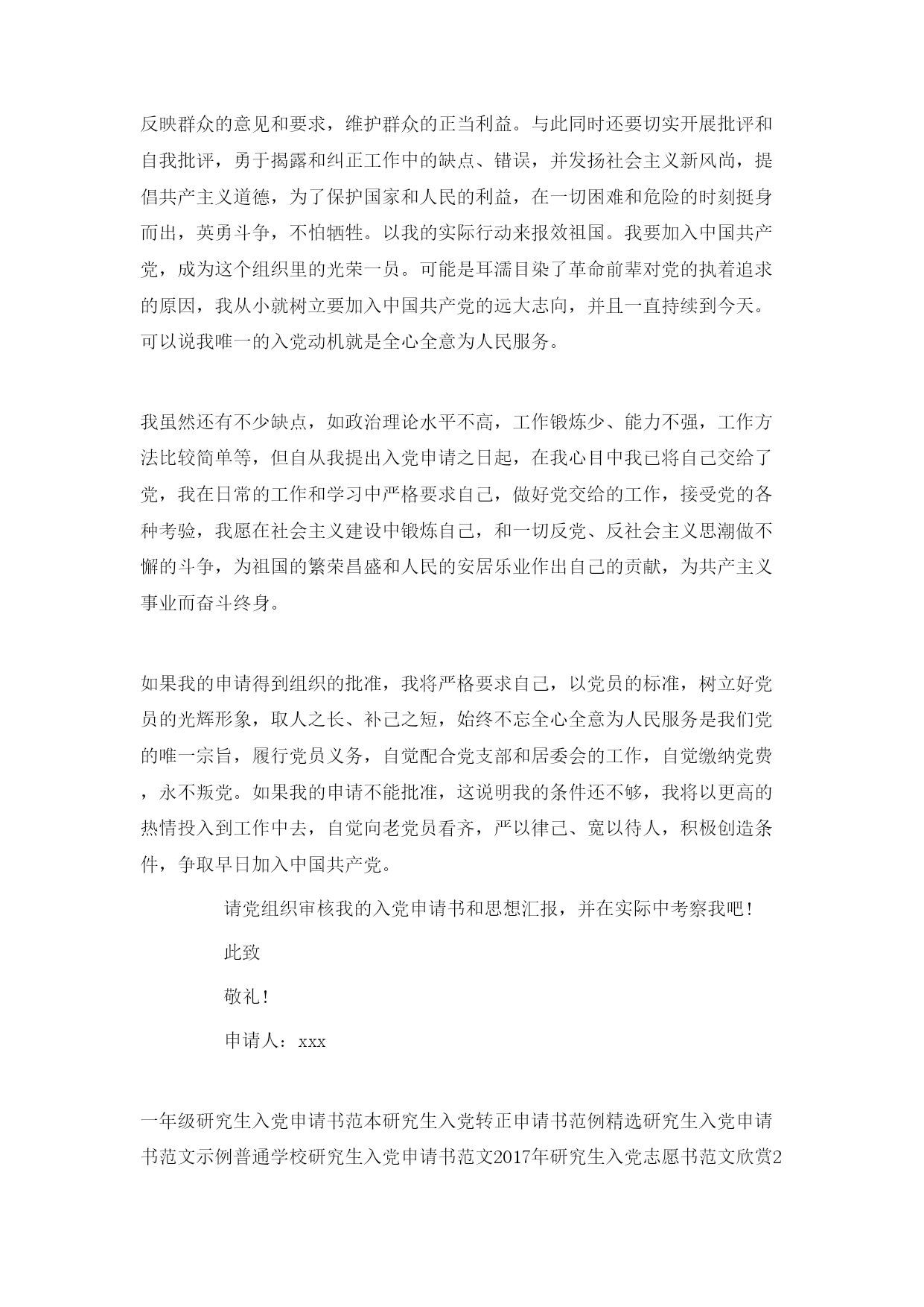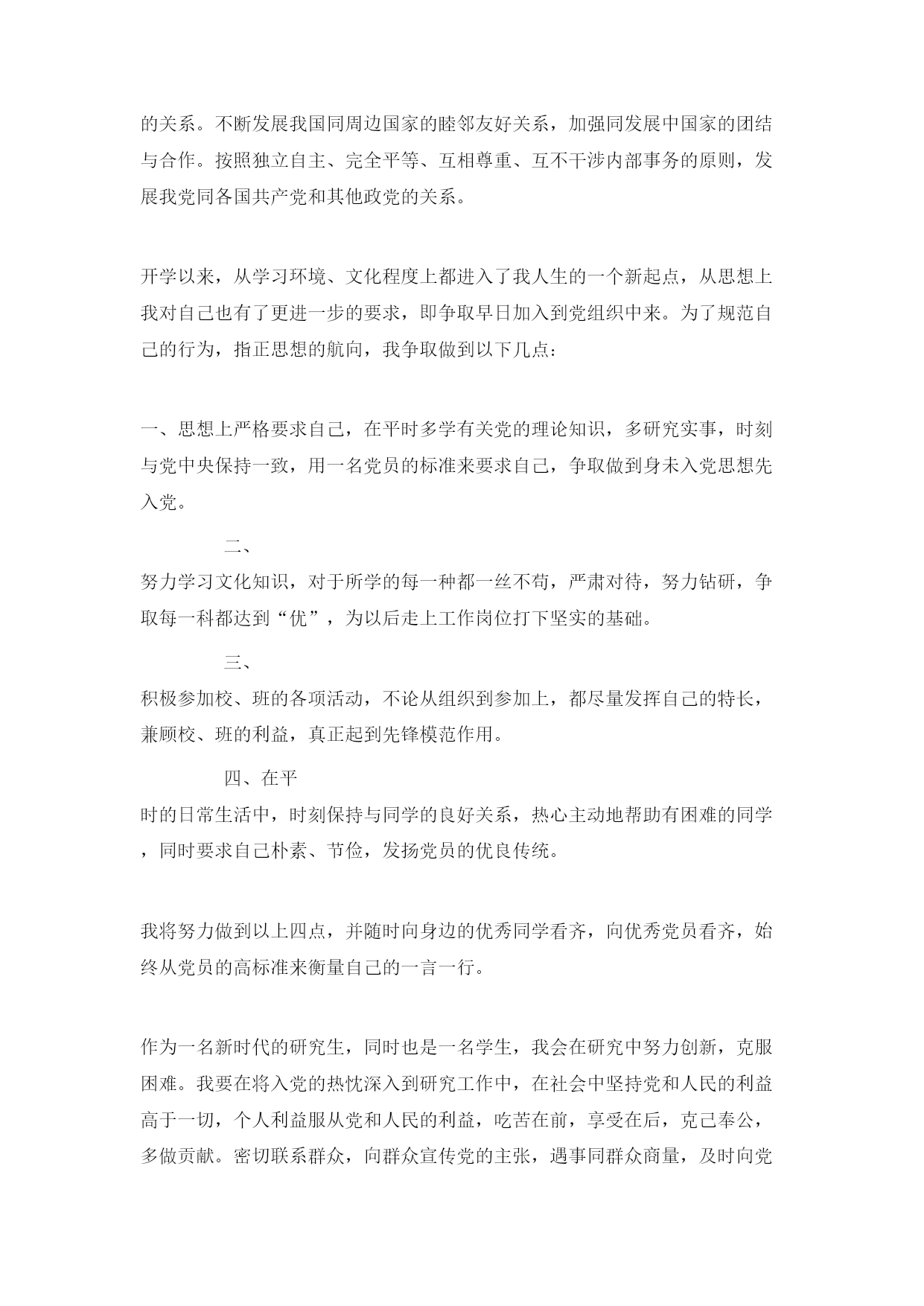 20XX年最新研究生入党申请书例文敬爱的党组织:我叫陈新然,是清华大学××专业的硕士研究生,我申请加入中国共产党。我志愿加入中国共产党,拥护党的纲领,遵守党的章程,履行党员义务,执行党的决定,严守党的纪律,保守党的秘密,对党忠诚,积极工作,为共产主义奋斗终身,随时准备为党和人民牺牲一切,永不叛党。中国共产党是中国工人阶级的先锋队,是中国各族人民利益的踏实代表,是中国社会主义事业的领导核心。党的最终目的是实现共产主义的社会制度。我们党是以马列主义、毛泽东思想、邓小平理论为指导思想的,是解救贫苦人民于水深火热的民族灾难中的唯一伟大的力量,是一心一意服务全体劳动人民,创造先进生产力和先进文明的核心力量。中国共产党是无产阶级先锋队,是我们社会主义革命成功的根本保证,是社会主义现代化建设的领导核心,是全国各族人民团结一致,致力于改革开放、振兴中华,实现“四化“的领导核心。无疑,她也是人民心目中的指路明灯。中国共产党是一个伟大、光荣、正确的党,是一个能够克服自身缺点不断进步的党。九十一年的光辉历程中,中国共产党领导全国各族人民经过长期的反对帝国主义、封建主义、官僚资本主义的革命斗争,取得了新民主主义革命的胜利,建立了人民民主专政的国家;顺利地进行了社会主义改造,完成了从新民主主义到社会主义的过渡,确立了社会主义制度,发展了社会主义的经济、政治和文化;十一届三中全会以来,我党把马克思主义的基本原理同中国革命和建设的具体实践相结合,逐步形成了建设中国特色社会主义的路线、方针、政策,阐明了在中国建设社会主义、巩固和发展社会主义的基本问题,创立了邓小平理论;十三届四中全会以来,我党在建设中国特色社会主义的实践中,加深了对什么是社会主义、怎样建设社会主义和建设什么样的党、怎样建设党的认识,积累了治党治国新的宝贵经验,形成了“三个代表”重要思想;xx大以来,党中央坚持以邓小平理论和“三个代表”重要思想为指导,根据新的发展要求,集中全党智慧,提出了以人为本、全面协调可持续发展的科学发展观。科学发展观,是同马克思列宁主义、毛泽东思想、邓小平理论和“三个代表”重要思想既一脉相承又与时俱进的科学理论,是我国经济社会发展的重要指导方针,是发展中国特色社会主义必须坚持和贯彻的重大战略思想;党的xx大的召开,对党章进行修改,及时在党章中体现重大理论创新成果,更好的规范和指导当前和今后一个时期党的工作和党的建设,充分体现了科学发展观这一重大战略思想;xx届三中全会的召开,肯定了三十年改革开放的成果,党把农业、农村和农民问题作为主要内容,专题研究新形势下推进农村改革发展问题,充分体现了党对“三农”高度重视。这次大会的召开,对于全面贯彻党的十七的精神,坚持以邓小平理论和“三个代表”重要思想为指导,深入贯彻科学发展观,夺取全面建设小康社会新胜利,开创中国特色社会主义新局面,具有重大而深远的意义,也更增强了我对党的信念。近年来发生了许多大事,xx年初的南方大雪,拉萨3.14事件、汶川5.12大地震等一系列的事件都给国家和人民造成了巨大的损失。在这么多的困难面前,中国共产党作为代表人民最更本利益的执政党没有惊慌失措,表现出惊人的镇定和勇气,团结全国人民共同解决困难,“多难兴邦”“任何困难都难不倒英雄的中国人民”一句句生动而又坚定地话语震撼着我的心灵。中国共产党维护和发展国内各民族的平等、团结、互助关系,坚持实行和不断完善民族区域自治制度,积极培养、选拔少数民族干部,帮助各少数民族地区发展经济、文化,实现各民族的共同繁荣和全面进步。在互相尊重主权和领土完整、互不侵犯、互不干涉内政、平等互利、和平共处五项原则的基础上,发展我国同世界各国的关系。不断发展我国同周边国家的睦邻友好关系,加强同发展中国家的团结与合作。按照独立自主、完全平等、互相尊重、互不干涉内部事务的原则,发展我党同各国共产党和其他政党的关系。开学以来,从学习环境、文化程度上都进入了我人生的一个新起点,从思想上我对自己也有了更进一步的要求,即争取早日加入到党组织中来。为了规范自己的行为,指正思想的航向,我争取做到以下几点:一、思想上严格要求自己,在平时多学有关党的理论知识,多研究实事,时刻与党中央保持一致,用一名党员的标准来要求自己,争取做到身未入党思想先入党。二、努力学习文化知识,对于所学的每一种都一丝不苟,严肃对待,努力钻研,争取每一科都达到“优”,为以后走上工作岗位打下坚实的基础。三、积极参加校、班的各项活动,不论从组织到参加上,都尽量发挥自己的特长,兼顾校、班的利益,真正起到先锋模范作用。四、在平时的日常生活中,时刻保持与同学的良好关系,热心主动地帮助有困难的同学,同时要求自己朴素、节俭,发扬党员的优良传统。我将努力做到以上四点,并随时向身边的优秀同学看齐,向优秀党员看齐,始终从党