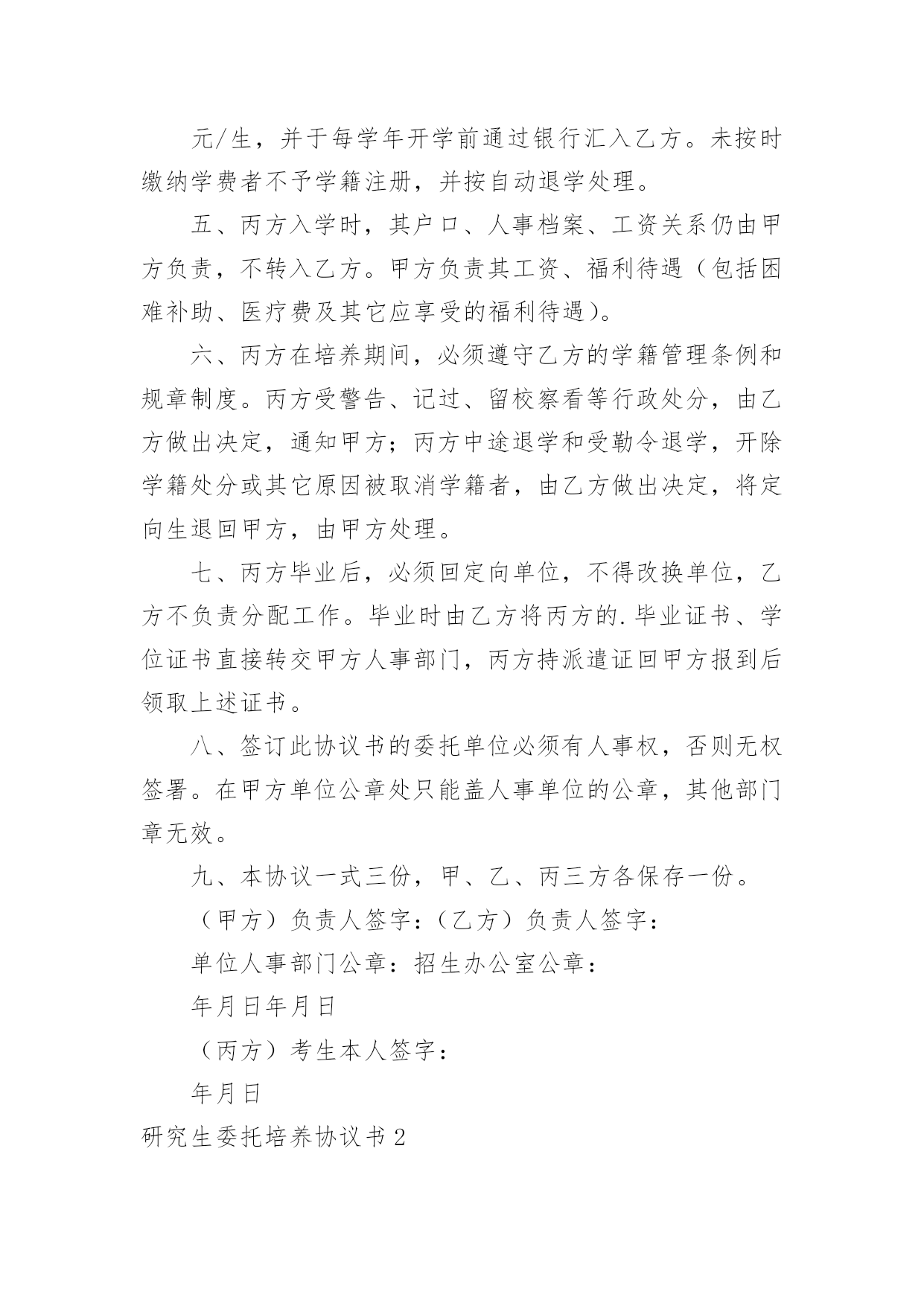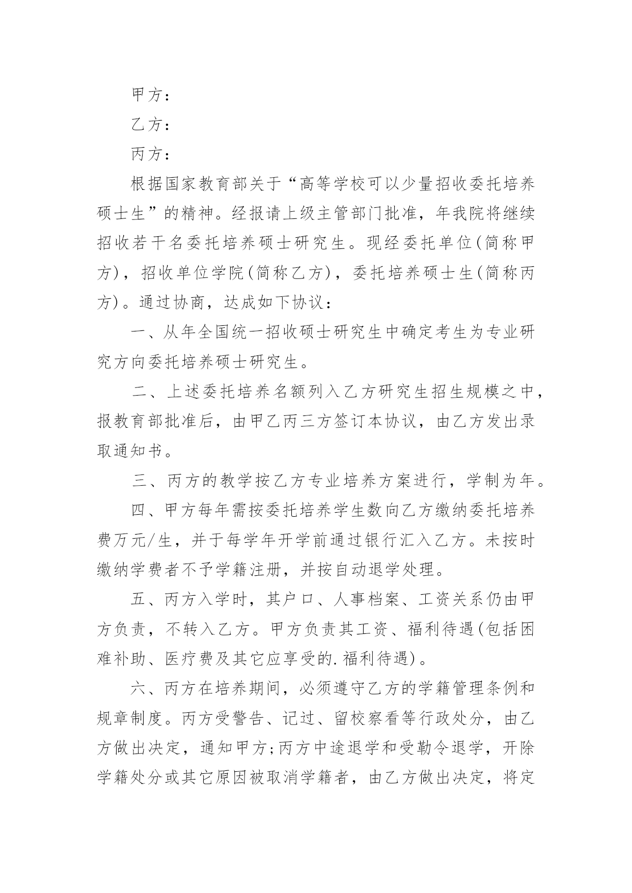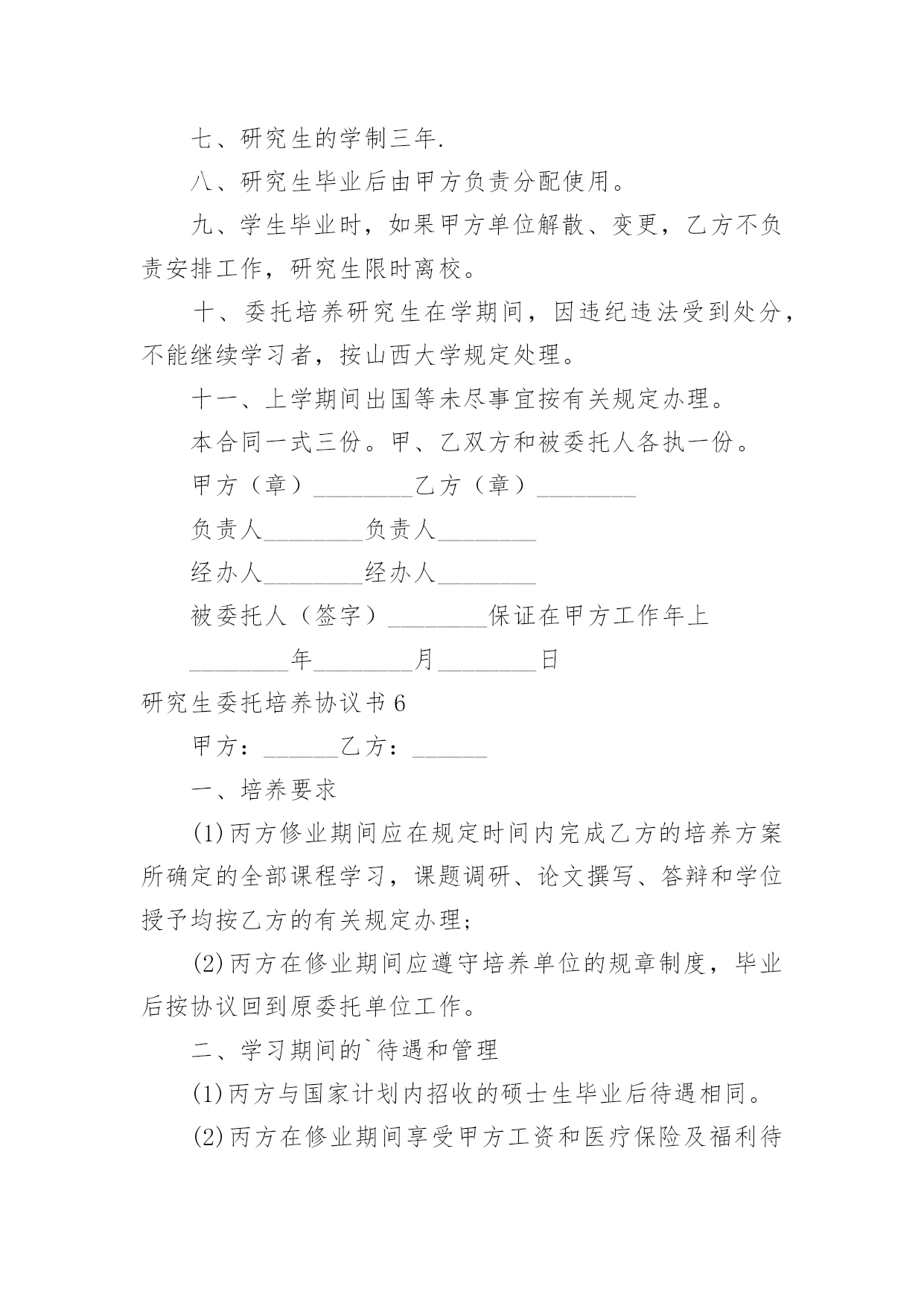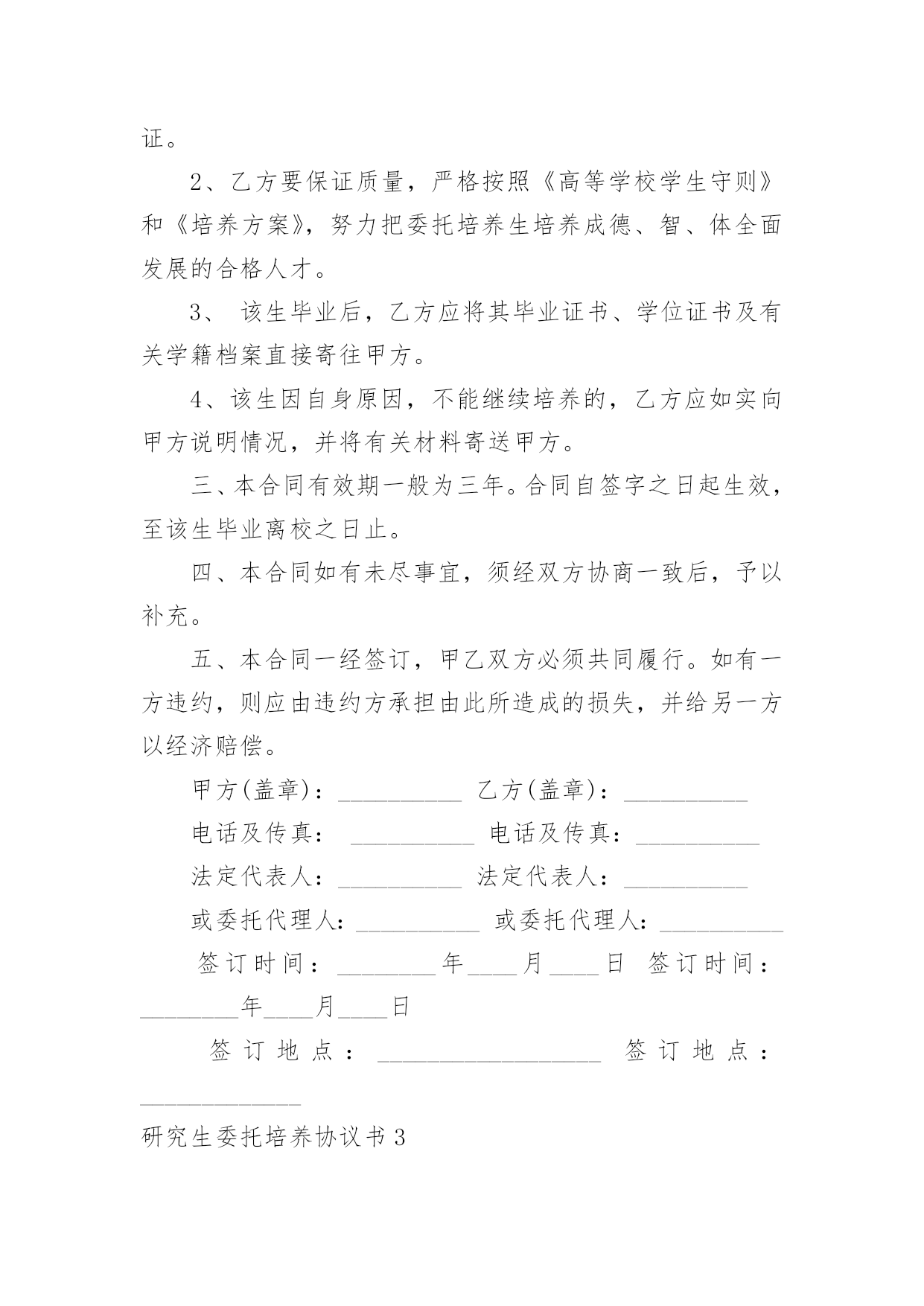 研究生委托培养协议书研究生委托培养协议书现如今,各种协议频频出现,签订协议可以保障自身的权益不被侵害。写协议需要注意哪些问题呢?下面是小编为大家收集的研究生委托培养协议书,仅供参考,大家一起来看看吧。研究生委托培养协议书1根据国家教育部关于“高等学校可以少量招收委托培养硕士生”的精神。经报请上级主管部门批准,20xx年我院将继续招收若干名委托培养硕士研究生。现经委托单位(简称甲方),招收单位中央美术学院(简称乙方),委托培养硕士生(简称丙方)。通过协商,达成如下协议:一、从20xx年全国统一招收硕士研究生中确定考生为专业研究方向委托培养硕士研究生。二、上述委托培养名额列入乙方研究生招生规模之中,报教育部批准后,由甲乙丙三方签订本协议,由乙方发出录取通知书。三、丙方的教学按乙方专业培养方案进行,学制为三年。四、甲方每年需按委托培养学生数向乙方缴纳委托培养费二万元/生,并于每学年开学前通过银行汇入乙方。未按时缴纳学费者不予学籍注册,并按自动退学处理。五、丙方入学时,其户口、人事档案、工资关系仍由甲方负责,不转入乙方。甲方负责其工资、福利待遇(包括困难补助、医疗费及其它应享受的福利待遇)。六、丙方在培养期间,必须遵守乙方的学籍管理条例和规章制度。丙方受警告、记过、留校察看等行政处分,由乙方做出决定,通知甲方;丙方中途退学和受勒令退学,开除学籍处分或其它原因被取消学籍者,由乙方做出决定,将定向生退回甲方,由甲方处理。七、丙方毕业后,必须回定向单位,不得改换单位,乙方不负责分配工作。毕业时由乙方将丙方的.毕业证书、学位证书直接转交甲方人事部门,丙方持派遣证回甲方报到后领取上述证书。八、签订此协议书的委托单位必须有人事权,否则无权签署。在甲方单位公章处只能盖人事单位的公章,其他部门章无效。九、本协议一式三份,甲、乙、丙三方各保存一份。(甲方)负责人签字:(乙方)负责人签字:单位人事部门公章:招生办公室公章:年月日年月日(丙方)考生本人签字:年月日研究生委托培养协议书2甲方(委托单位):乙方(培养单位):根据教育部关于______年招收硕士研究生的有关规定,考生______符合委托培养硕士研究生录取标准。经甲方与考生协商,委托乙方培养该生为______专业委托培养硕士研究生。现经甲乙双方协商,签定以下合同:一、甲方应承担的责任:1、委托培养者被正式录取前,甲方应向乙方一次性付清培养费______元。(开户名:______大学_帐号:______开户行:建行西安市翠华路分理处)并注明委托培养研究生费。2委托培养的硕士研究生按规定享受的奖学金,由甲方与所委托培养的研究生协商解决。3委托培养研究生入学时,甲方应将其本人的党、团组织关系转至乙方。4在该委托培养研究生学习期间,甲方应关心其思想、学习和生活情况,并尽可能提供必要的'条件,使之能顺利完成学习任务。5该委培生在学习期间,因自身原因终止学习或不能获得学位,甲方应将委托培养的研究生予以妥善安置,并不得向乙方索要培养费用。二、乙方应承担的责任:1、委托培养研究生是国家招生规模内的研究生,对毕业时符合条件的,发给与计划内研究生相同的毕业证、学位证。2、乙方要保证质量,严格按照《高等学校学生守则》和《培养方案》,努力把委托培养生培养成德、智、体全面发展的合格人才。3、该生毕业后,乙方应将其毕业证书、学位证书及有关学籍档案直接寄往甲方。4、该生因自身原因,不能继续培养的,乙方应如实向甲方说明情况,并将有关材料寄送甲方。三、本合同有效期一般为三年。合同自签字之日起生效,至该生毕业离校之日止。四、本合同如有未尽事宜,须经双方协商一致后,予以补充。五、本合同一经签订,甲乙双方必须共同履行。如有一方违约,则应由违约方承担由此所造成的损失,并给另一方以经济赔偿。甲方(盖章):__________乙方(盖章):__________电话及传真:__________电话及传真:__________法定代表人:__________法定代表人:__________或委托代理人:__________或委托代理人:__________签订时间:________年____月____日签订时间:________年____月____日签订地点:__________________签订地点:_____________研究生委托培养协议书3甲方:乙方:丙方:根据国家教育部关于“高等学校可以少量招收委托培养硕士生”的精神。经报请上级主管部门批准,年我院将继续招收若干名委托培养硕士研究生。现经委托单位(简称甲方),招收单位学院(简称乙方),委托培养硕士生(简称丙方)。通过协商,达成如下协议:一、从年全国统一招收硕士研究生中确定考生为专业研究方向委托培养硕士研究生。二、上述委托培养名额列入乙方研究生招生规模之中,报教育部批准后,由甲乙丙