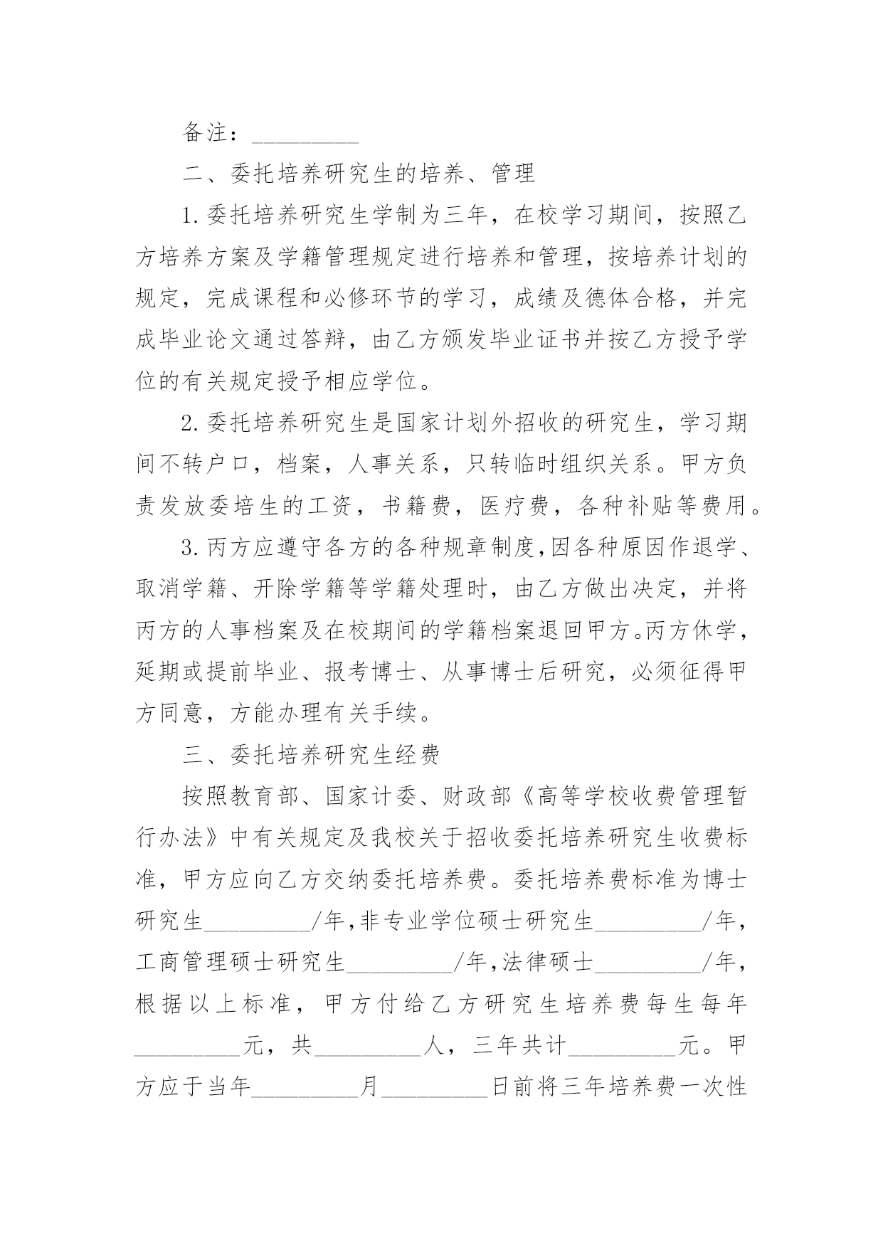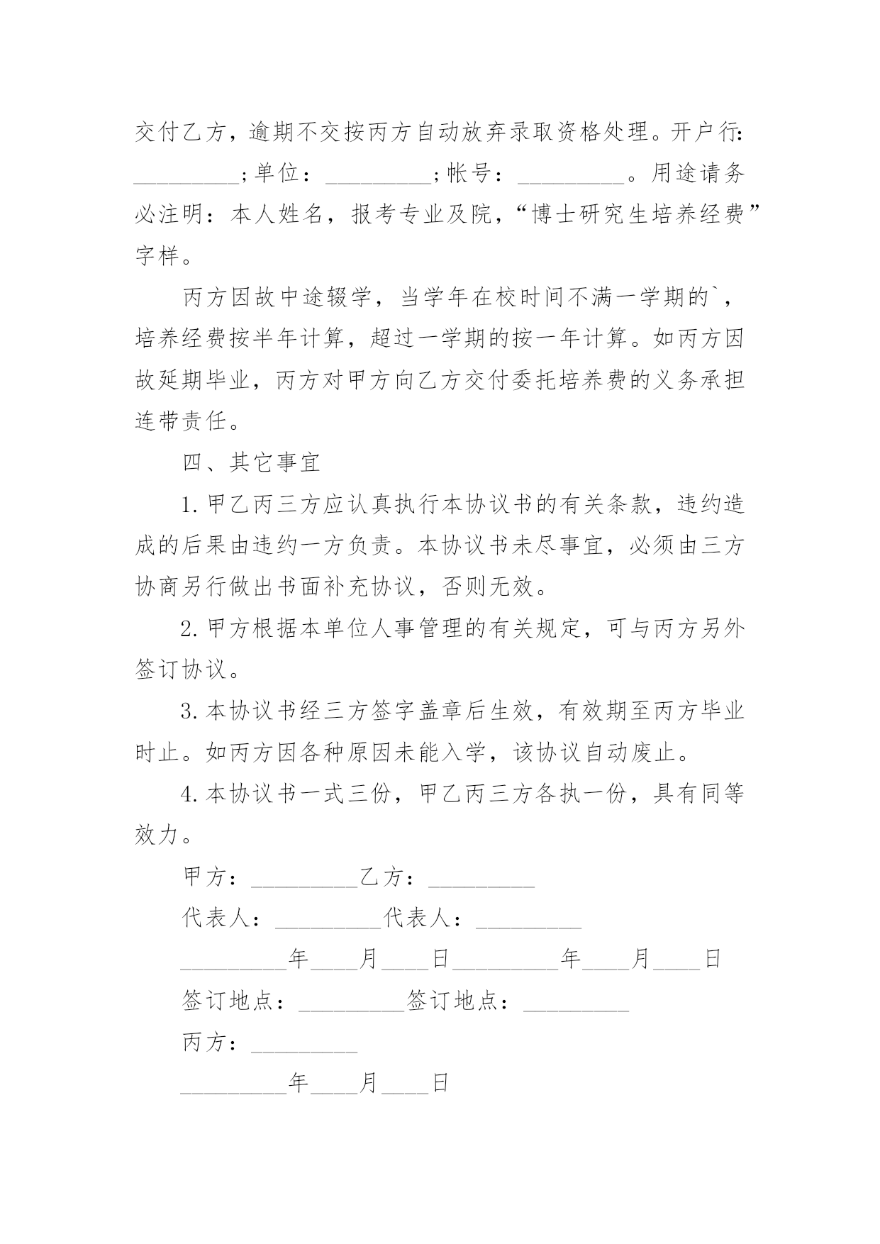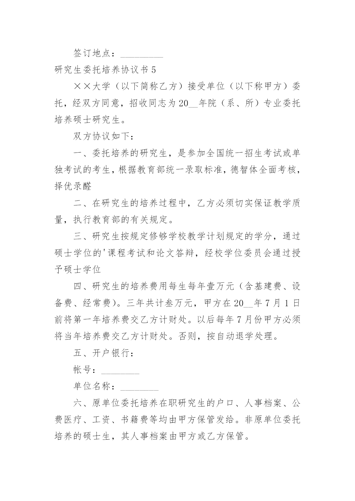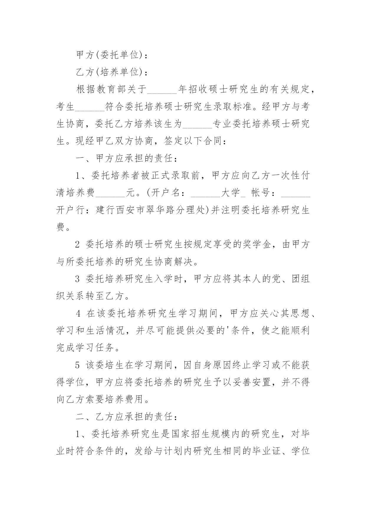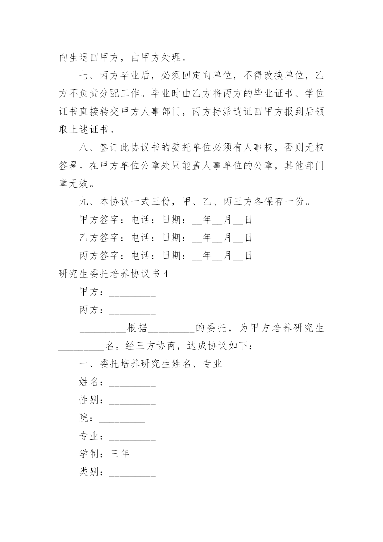 研究生委托培养协议书研究生委托培养协议书现如今,各种协议频频出现,签订协议可以保障自身的权益不被侵害。写协议需要注意哪些问题呢?下面是小编为大家收集的研究生委托培养协议书,仅供参考,大家一起来看看吧。研究生委托培养协议书1根据国家教育部关于“高等学校可以少量招收委托培养硕士生”的精神。经报请上级主管部门批准,20xx年我院将继续招收若干名委托培养硕士研究生。现经委托单位(简称甲方),招收单位中央美术学院(简称乙方),委托培养硕士生(简称丙方)。通过协商,达成如下协议:一、从20xx年全国统一招收硕士研究生中确定考生为专业研究方向委托培养硕士研究生。二、上述委托培养名额列入乙方研究生招生规模之中,报教育部批准后,由甲乙丙三方签订本协议,由乙方发出录取通知书。三、丙方的教学按乙方专业培养方案进行,学制为三年。四、甲方每年需按委托培养学生数向乙方缴纳委托培养费二万元/生,并于每学年开学前通过银行汇入乙方。未按时缴纳学费者不予学籍注册,并按自动退学处理。五、丙方入学时,其户口、人事档案、工资关系仍由甲方负责,不转入乙方。甲方负责其工资、福利待遇(包括困难补助、医疗费及其它应享受的福利待遇)。六、丙方在培养期间,必须遵守乙方的学籍管理条例和规章制度。丙方受警告、记过、留校察看等行政处分,由乙方做出决定,通知甲方;丙方中途退学和受勒令退学,开除学籍处分或其它原因被取消学籍者,由乙方做出决定,将定向生退回甲方,由甲方处理。七、丙方毕业后,必须回定向单位,不得改换单位,乙方不负责分配工作。毕业时由乙方将丙方的.毕业证书、学位证书直接转交甲方人事部门,丙方持派遣证回甲方报到后领取上述证书。八、签订此协议书的委托单位必须有人事权,否则无权签署。在甲方单位公章处只能盖人事单位的公章,其他部门章无效。九、本协议一式三份,甲、乙、丙三方各保存一份。(甲方)负责人签字:(乙方)负责人签字:单位人事部门公章:招生办公室公章:年月日年月日(丙方)考生本人签字:年月日研究生委托培养协议书2甲方(委托单位):乙方(培养单位):根据教育部关于______年招收硕士研究生的有关规定,考生______符合委托培养硕士研究生录取标准。经甲方与考生协商,委托乙方培养该生为______专业委托培养硕士研究生。现经甲乙双方协商,签定以下合同:一、甲方应承担的责任:1、委托培养者被正式录取前,甲方应向乙方一次性付清培养费______元。(开户名:______大学_帐号:______开户行:建行西安市翠华路分理处)并注明委托培养研究生费。2委托培养的硕士研究生按规定享受的奖学金,由甲方与所委托培养的研究生协商解决。3委托培养研究生入学时,甲方应将其本人的党、团组织关系转至乙方。4在该委托培养研究生学习期间,甲方应关心其思想、学习和生活情况,并尽可能提供必要的'条件,使之能顺利完成学习任务。5该委培生在学习期间,因自身原因终止学习或不能获得学位,甲方应将委托培养的研究生予以妥善安置,并不得向乙方索要培养费用。二、乙方应承担的责任:1、委托培养研究生是国家招生规模内的研究生,对毕业时符合条件的,发给与计划内研究生相同的毕业证、学位证。2、乙方要保证质量,严格按照《高等学校学生守则》和《培养方案》,努力把委托培养生培养成德、智、体全面发展的合格人才。3、该生毕业后,乙方应将其毕业证书、学位证书及有关学籍档案直接寄往甲方。4、该生因自身原因,不能继续培养的,乙方应如实向甲方说明情况,并将有关材料寄送甲方。三、本合同有效期一般为三年。合同自签字之日起生效,至该生毕业离校之日止。四、本合同如有未尽事宜,须经双方协商一致后,予以补充。五、本合同一经签订,甲乙双方必须共同履行。如有一方违约,则应由违约方承担由此所造成的损失,并给另一方以经济赔偿。甲方(盖章):__________乙方(盖章):__________电话及传真:__________电话及传真:__________法定代表人:__________法定代表人:__________或委托代理人:__________或委托代理人:__________签订时间:________年____月____日签订时间:________年____月____日签订地点:__________________签订地点:_____________研究生委托培养协议书3甲方:乙方:丙方:根据国家教育部关于“高等学校可以少量招收委托培养硕士生”的精神。经报请上级主管部门批准,年我院将继续招收若干名委托培养硕士研究生。现经委托单位(简称甲方),招收单位学院(简称乙方),委托培养硕士生(简称丙方)。通过协商,达成如下协议:一、从年全国统一招收硕士研究生中确定考生为专业研究方向委托培养硕士研究生。二、上述委托培养名额列入乙方研究生招生规模之中,报教育部批准后,由甲乙丙