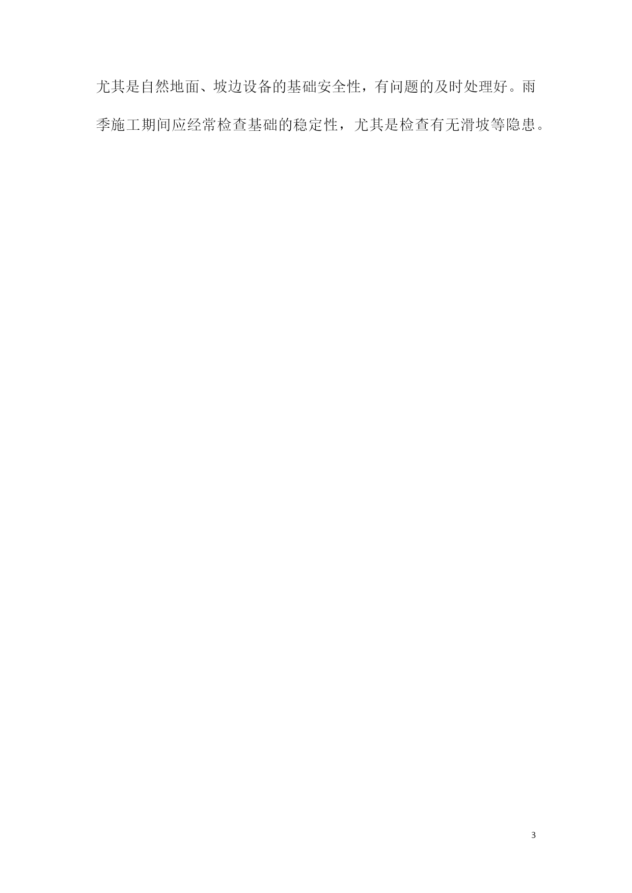 PAGEPAGE3冬雨季环保安全措施1.1冬雨季环保安全措施冬、雨季期间,气象条件复杂,严寒、炎热、雨雪、雷电等天气现象出现频繁,为此,我们将采取以下措施,杜绝或降低恶劣气象条件导致的安全隐患及环境污染隐患。1、冬季办公区全部采用分体式空调采暖,职工宿舍采用节能环保型空调。2、雨季采用现场排水设施对雨水进行排放,排放的雨水需经过沉淀过滤,现场出入口均设置车辆冲洗池,出入现场的车辆进行清洗,清洗后的污水经过沉淀再进行排除,沉淀池内的淤泥等定时清除。3、现场及生活区均设置封闭垃圾站,并配备足够数量的垃圾封闭容器,雨季防止雨水浸泡,对现场垃圾定期进行清理外运。雨天后,对现场残留的雨水组织人员进行清理,防止滋生蚊虫。4、现场露天堆放的材料、设备等雨雪天气采用阻燃防水油布进行覆盖。氧气、乙炔瓶均放置于阴凉处,避免阳光曝晒。冬季来临前,对现场所有设备、管线、管道进行全面检查,并对室外低温环境使用的设备、管道采用环保、阻燃保温材料进行保温。5、夏季高温天气从事高空作业的人员适当缩短工作时间,增加班次。雨、雪天气后,进行高空作业之前对操作面进行检查、清理,人员通道、操作平台等部位铺设麻袋片防滑。6、加强防火管理工作,现场焊接等严格执行用火申请制度,做到班前交底,班后检查,焊接前备好消防器材,清理易燃物品,焊接时设专人看火。7、现场禁止使用明火取暖,生活区内禁止使用电采暖。8、冬、雨季使用电动设备必须保证绝缘良好,使用手持电工工具的操作人员需穿绝缘鞋、带绝缘手套,脚下垫干燥木板或绝缘胶皮。9、雨季施工重点做好防雷设施,利用井架避雷针及结构钢筋作避雷针,并派电工每天对避雷电阻进行测试。10、冬季、雨季施工对动力、照明线路及供配电设备进行全面检查,杜绝漏电现象。配电箱及电闸箱有防雪防潮措施并且外壳有接地保护。11、每天收工前及雷雨、大雪来临前,将施工用电设备放置到较高的地方并盖好,保管好,施工前先由电工检查后再进行施工作业。12、冬季、雨季施工前,对现场所有照明动力及照明线路、供配电电器设施进行一次全面的检查,对线路老化、安装不良、瓷瓶裂纹以及跑漏现象,必须及时修理和更换,严禁迁就使用。防止火灾事件发生。13、雨季施工前,应严格检查机械、电气设备等基础的安全性,尤其是自然地面、坡边设备的基础安全性,有问题的及时处理好。雨季施工期间应经常检查基础的稳定性,尤其是检查有无滑坡等隐患。