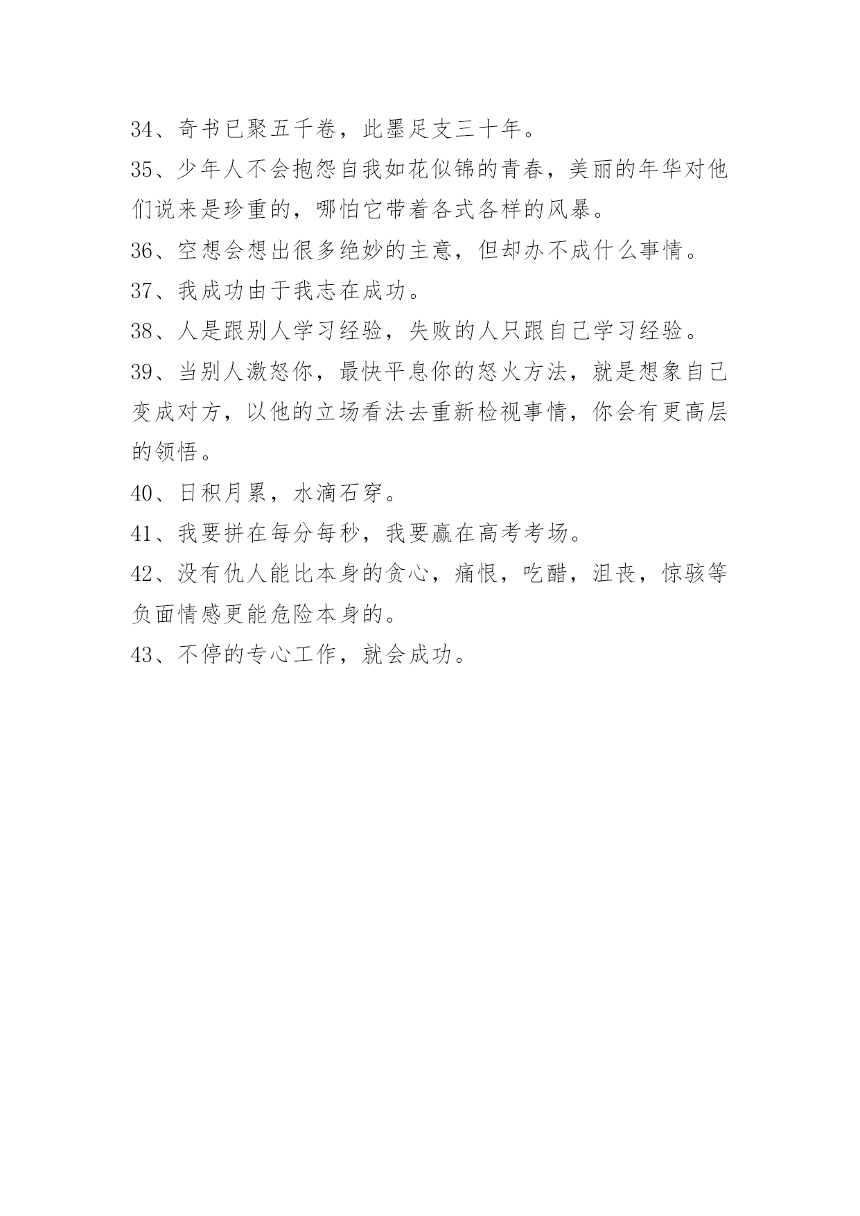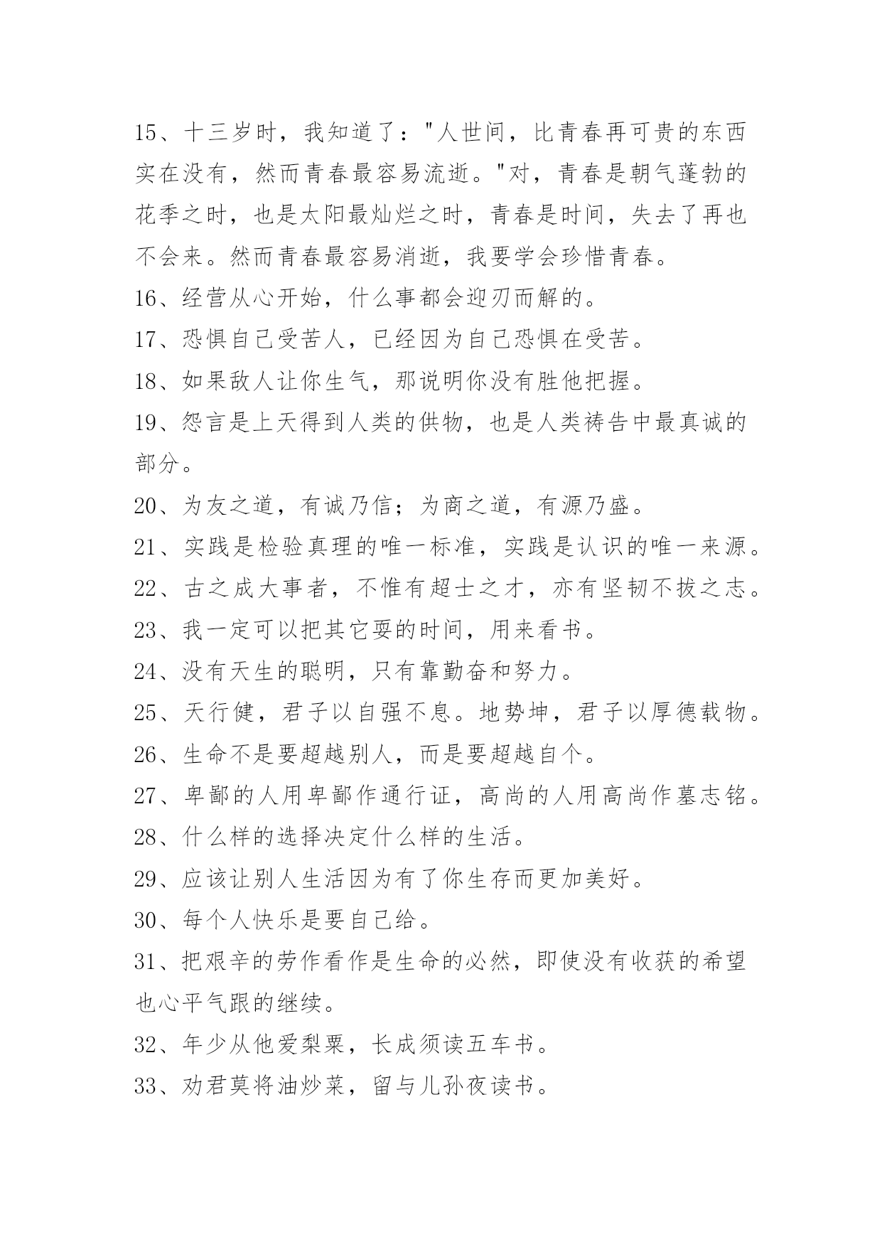 实用的励志座右铭43条2024年实用的励志座右铭汇编43条努力图树立,孰几终有成。以下是小编帮大家整理的励志座右铭43条,欢迎参考。1、宁可清贫,不可浊富。[中国·明代小说家]罗贯中2、有劳动有欢乐,有好景有坏运,这就是人生。3、世界上的一切伟大运动都与某种伟大理想有关。4、有奇迹的道路上没有终点。5、小利不争,小忿不发,可以和众。6、总以为岁月漫长总有时间来挽回和原谅。7、既然不能改变风向,那就改变航向。8、挑战自我,丰富自我,成就自我。9、似水年华,青春是最美丽的风景,也是最值得珍惜的年华。10、珍惜时间,拼搏进取。11、在最好的青春年华里,为了心中的梦想,坚定地努力前行吧。12、只要有信心,人永远不会挫败。13、爱我或者很我由你选取,这就是生活。有的人厌恶我的比赛,恨我的嚣张,恨我的后仰跳投,恨我比较赛的痴狂,恨我总有冠军戒指戴……但是也有很多人喜欢我,理由却和恨我的人一样。14、用爱得到全世界,你也可以用恨失去全世界。15、十三岁时,我知道了:"人世间,比青春再可贵的东西实在没有,然而青春最容易流逝。"对,青春是朝气蓬勃的花季之时,也是太阳最灿烂之时,青春是时间,失去了再也不会来。然而青春最容易消逝,我要学会珍惜青春。16、经营从心开始,什么事都会迎刃而解的。17、恐惧自己受苦人,已经因为自己恐惧在受苦。18、如果敌人让你生气,那说明你没有胜他把握。19、怨言是上天得到人类的供物,也是人类祷告中最真诚的部分。20、为友之道,有诚乃信;为商之道,有源乃盛。21、实践是检验真理的唯一标准,实践是认识的唯一来源。22、古之成大事者,不惟有超士之才,亦有坚韧不拔之志。23、我一定可以把其它耍的时间,用来看书。24、没有天生的聪明,只有靠勤奋和努力。25、天行健,君子以自强不息。地势坤,君子以厚德载物。26、生命不是要超越别人,而是要超越自个。27、卑鄙的人用卑鄙作通行证,高尚的人用高尚作墓志铭。28、什么样的选择决定什么样的生活。29、应该让别人生活因为有了你生存而更加美好。30、每个人快乐是要自己给。31、把艰辛的劳作看作是生命的必然,即使没有收获的希望也心平气跟的继续。32、年少从他爱梨粟,长成须读五车书。33、劝君莫将油炒菜,留与儿孙夜读书。34、奇书已聚五千卷,此墨足支三十年。35、少年人不会抱怨自我如花似锦的青春,美丽的年华对他们说来是珍重的,哪怕它带着各式各样的风暴。36、空想会想出很多绝妙的主意,但却办不成什么事情。37、我成功由于我志在成功。38、人是跟别人学习经验,失败的人只跟自己学习经验。39、当别人激怒你,最快平息你的怒火方法,就是想象自己变成对方,以他的立场看法去重新检视事情,你会有更高层的领悟。40、日积月累,水滴石穿。41、我要拼在每分每秒,我要赢在高考考场。42、没有仇人能比本身的贪心,痛恨,吃醋,沮丧,惊骇等负面情感更能危险本身的。43、不停的专心工作,就会成功。