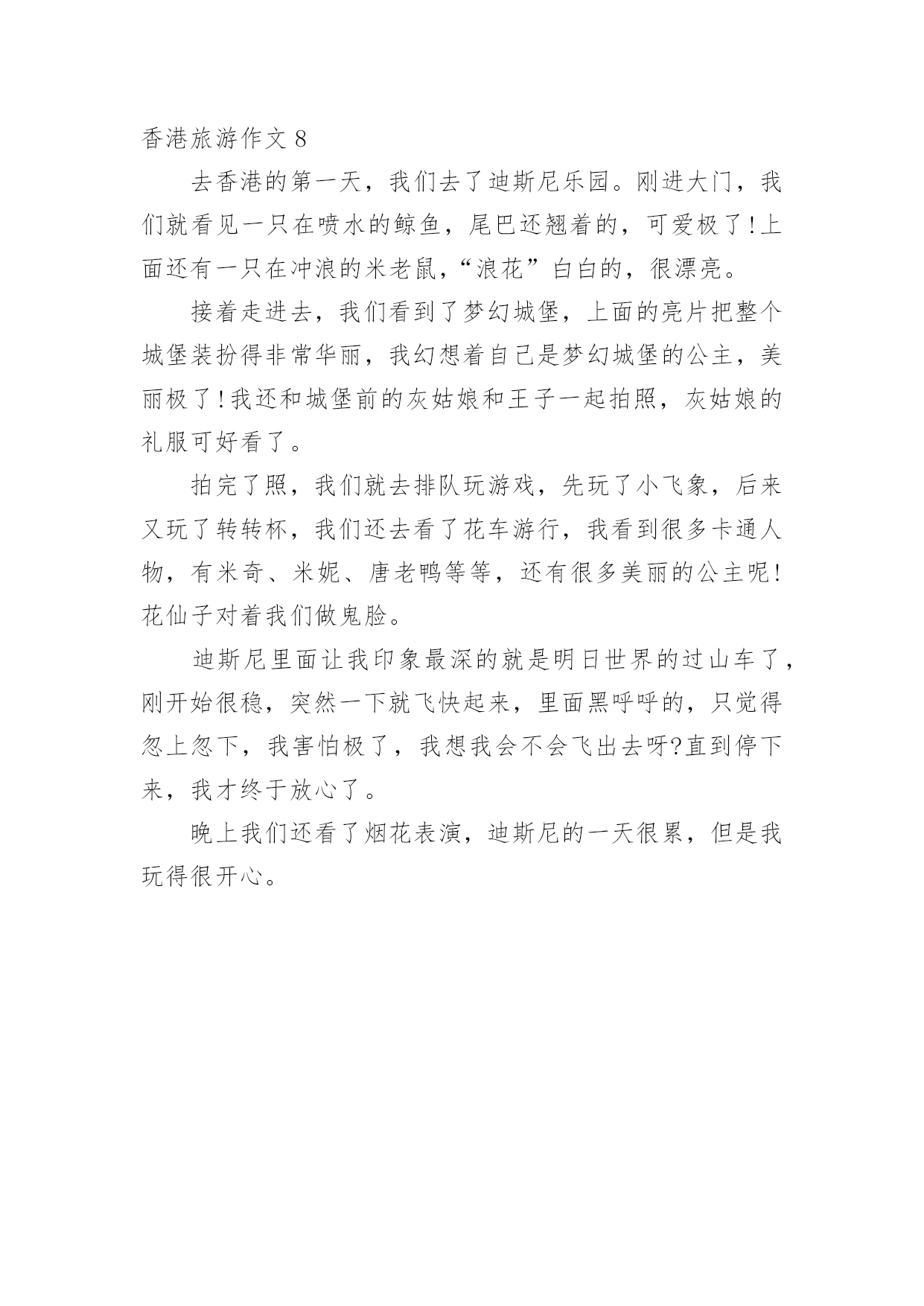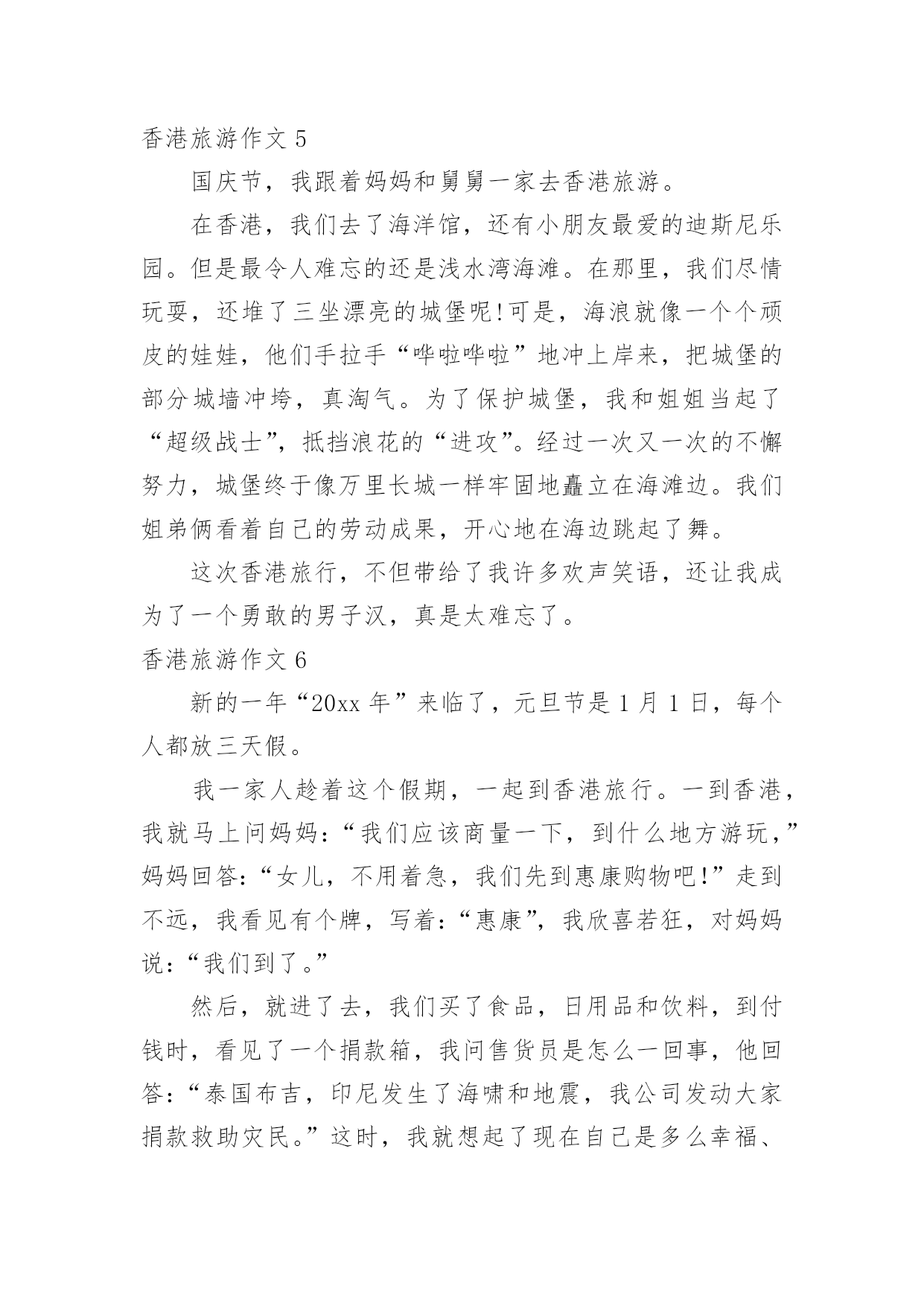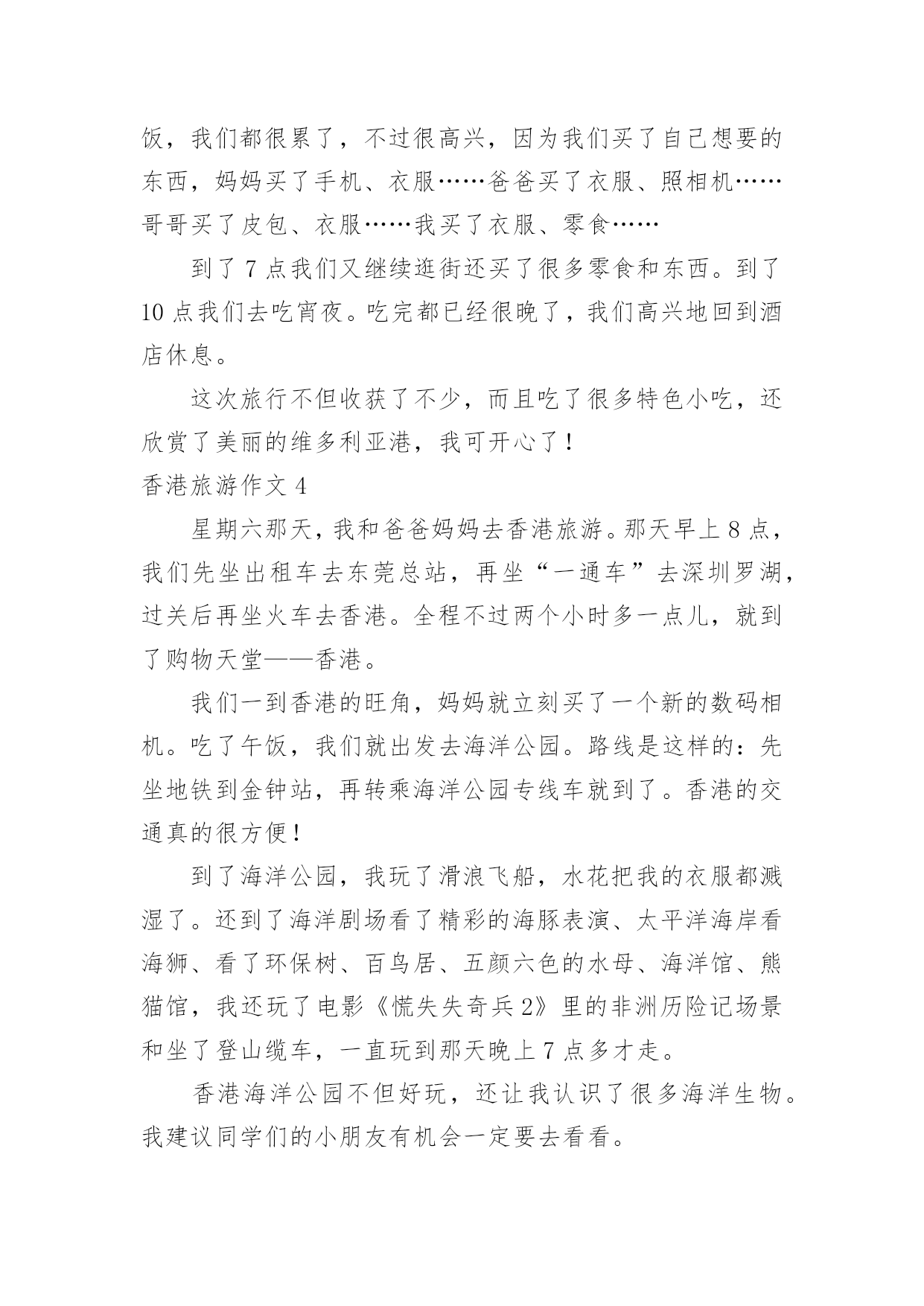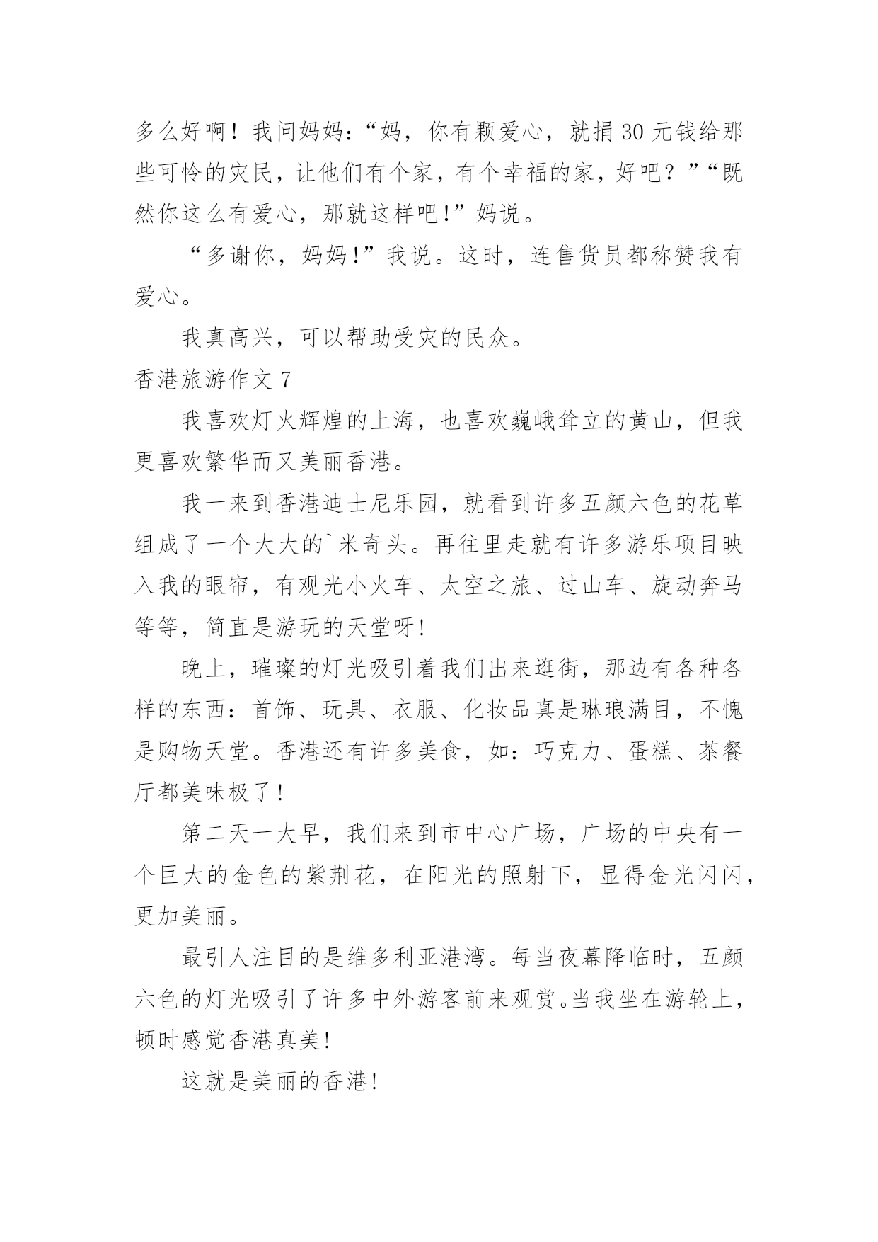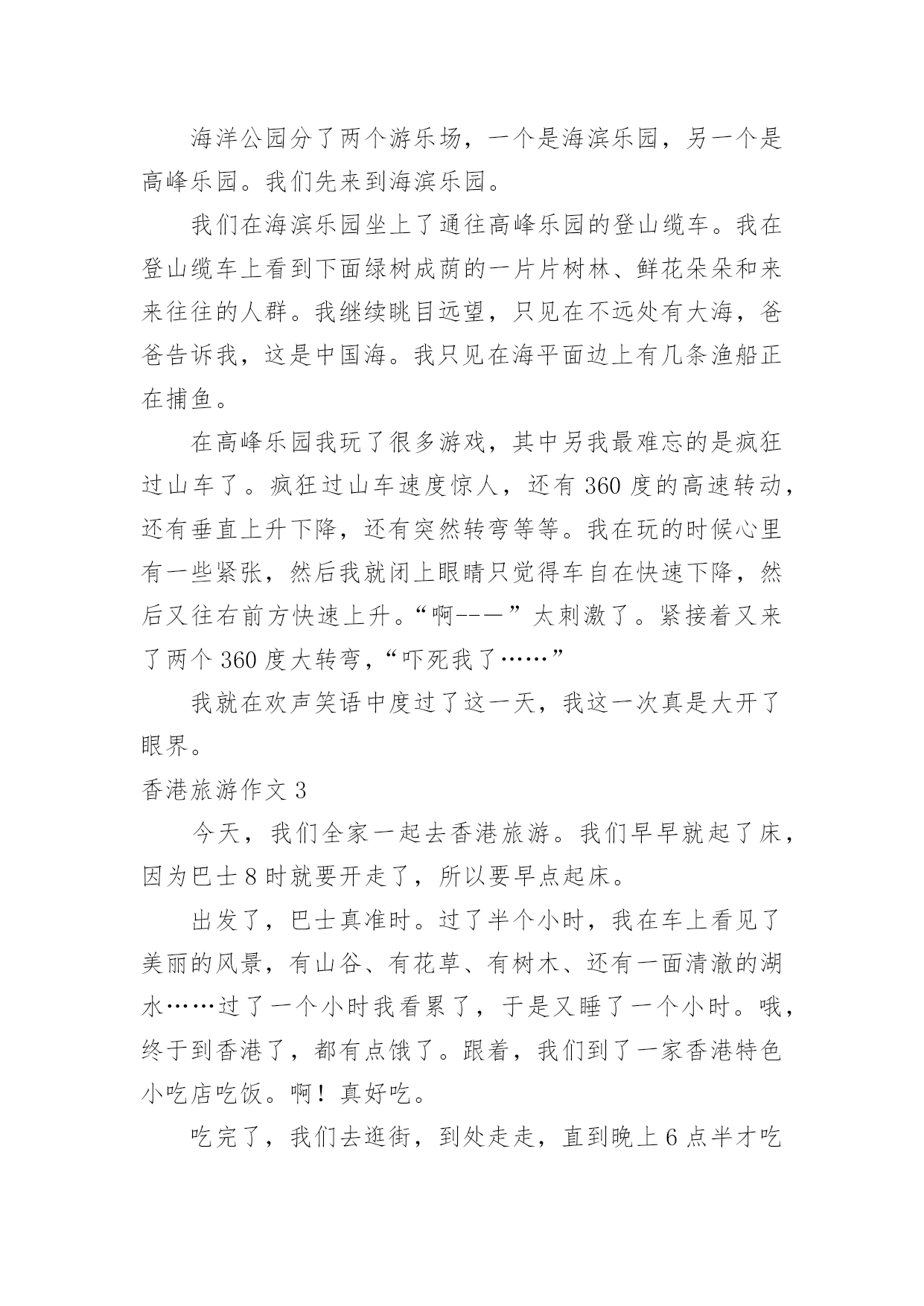 香港旅游作文香港旅游作文在学习、工作乃至生活中,说到作文,大家肯定都不陌生吧,作文根据体裁的不同可以分为记叙文、说明文、应用文、议论文。还是对作文一筹莫展吗?下面是小编为大家收集的香港旅游作文,欢迎大家借鉴与参考,希望对大家有所帮助。香港旅游作文1今天,我三姑姑带我去南白办港澳通行证和护照。我非常的开心,因为办好后下一个暑假就可以去香港玩了。我们坐了两个小时的车后到了南白。可是当我们到了目的地的时候,公安局的人在开会,让我们下午2点半的时候再去。于是我们去了大姑姑家。可是大姑姑不在家,所以我们得自己做饭吃。所以三姑姑就去菜市场买菜做饭了。三姑姑做的饭很好吃,我吃了三碗饭,很饱噢。吃完饭后,我们又去了公安局,可是到了那后,那里的人说不能办。必须得有自己的爸爸妈妈来才可以办到,所以我和三姑姑就回家了。今天,我没有办到证,我白开心了一场。香港旅游作文2这一天,我们一家来到香港海洋公园游玩。阳光明媚,万里无云。夏日当头,骄阳似火,我们来到海洋公园门口,只见眼前的景色真美啊!海洋公园分了两个游乐场,一个是海滨乐园,另一个是高峰乐园。我们先来到海滨乐园。我们在海滨乐园坐上了通往高峰乐园的登山缆车。我在登山缆车上看到下面绿树成荫的一片片树林、鲜花朵朵和来来往往的人群。我继续眺目远望,只见在不远处有大海,爸爸告诉我,这是中国海。我只见在海平面边上有几条渔船正在捕鱼。在高峰乐园我玩了很多游戏,其中另我最难忘的是疯狂过山车了。疯狂过山车速度惊人,还有360度的高速转动,还有垂直上升下降,还有突然转弯等等。我在玩的时候心里有一些紧张,然后我就闭上眼睛只觉得车自在快速下降,然后又往右前方快速上升。“啊--―”太刺激了。紧接着又来了两个360度大转弯,“吓死我了……”我就在欢声笑语中度过了这一天,我这一次真是大开了眼界。香港旅游作文3今天,我们全家一起去香港旅游。我们早早就起了床,因为巴士8时就要开走了,所以要早点起床。出发了,巴士真准时。过了半个小时,我在车上看见了美丽的风景,有山谷、有花草、有树木、还有一面清澈的湖水……过了一个小时我看累了,于是又睡了一个小时。哦,终于到香港了,都有点饿了。跟着,我们到了一家香港特色小吃店吃饭。啊!真好吃。吃完了,我们去逛街,到处走走,直到晚上6点半才吃饭,我们都很累了,不过很高兴,因为我们买了自己想要的东西,妈妈买了手机、衣服……爸爸买了衣服、照相机……哥哥买了皮包、衣服……我买了衣服、零食……到了7点我们又继续逛街还买了很多零食和东西。到了10点我们去吃宵夜。吃完都已经很晚了,我们高兴地回到酒店休息。这次旅行不但收获了不少,而且吃了很多特色小吃,还欣赏了美丽的维多利亚港,我可开心了!香港旅游作文4星期六那天,我和爸爸妈妈去香港旅游。那天早上8点,我们先坐出租车去东莞总站,再坐“一通车”去深圳罗湖,过关后再坐火车去香港。全程不过两个小时多一点儿,就到了购物天堂——香港。我们一到香港的旺角,妈妈就立刻买了一个新的数码相机。吃了午饭,我们就出发去海洋公园。路线是这样的:先坐地铁到金钟站,再转乘海洋公园专线车就到了。香港的交通真的很方便!到了海洋公园,我玩了滑浪飞船,水花把我的衣服都溅湿了。还到了海洋剧场看了精彩的海豚表演、太平洋海岸看海狮、看了环保树、百鸟居、五颜六色的水母、海洋馆、熊猫馆,我还玩了电影《慌失失奇兵2》里的非洲历险记场景和坐了登山缆车,一直玩到那天晚上7点多才走。香港海洋公园不但好玩,还让我认识了很多海洋生物。我建议同学们的小朋友有机会一定要去看看。香港旅游作文5国庆节,我跟着妈妈和舅舅一家去香港旅游。在香港,我们去了海洋馆,还有小朋友最爱的迪斯尼乐园。但是最令人难忘的还是浅水湾海滩。在那里,我们尽情玩耍,还堆了三坐漂亮的城堡呢!可是,海浪就像一个个顽皮的娃娃,他们手拉手“哗啦哗啦”地冲上岸来,把城堡的部分城墙冲垮,真淘气。为了保护城堡,我和姐姐当起了“超级战士”,抵挡浪花的“进攻”。经过一次又一次的不懈努力,城堡终于像万里长城一样牢固地矗立在海滩边。我们姐弟俩看着自己的劳动成果,开心地在海边跳起了舞。这次香港旅行,不但带给了我许多欢声笑语,还让我成为了一个勇敢的男子汉,真是太难忘了。香港旅游作文6新的一年“20xx年”来临了,元旦节是1月1日,每个人都放三天假。我一家人趁着这个假期,一起到香港旅行。一到香港,我就马上问妈妈:“我们应该商量一下,到什么地方游玩,”妈妈回答:“女儿,不用着急,我们先到惠康购物吧!”走到不远,我看见有个牌,写着:“惠康”,我欣喜若狂,对妈妈说:“我们到了。”然后,就进了去,我们买了食品,日用品和饮料,到付钱时,看见了一个捐款箱,我问售货员是怎么一回事,他回答:“泰国布吉,印尼发生了海啸和地震,我公司发动大家捐款救助灾民。”这时,我就想起了现在自己是多么幸福、多么好啊!