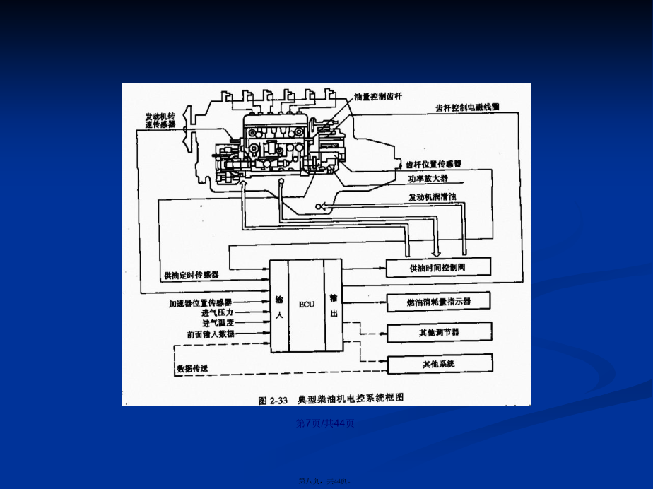 会计学第四章柴油机电子(diànzǐ)喷射系统第四章柴油机电子(diànzǐ)喷射系统第四章柴油机电子喷射(pēnshè)系统第四章柴油机电子(diànzǐ)喷射系统第四章柴油机电子喷射(pēnshè)系统4.1柴油机电子(diànzǐ)喷射系统4.1位置(wèizhi)控制系统4.1位置(wèizhi)控制系统电子控制直列泵电子调速器:利用电磁力调节齿杆位置控制油量,提供齿杆位置信号(xìnhào)和发动机转速信号(xìnhào),并放大信号(xìnhào)。电子(diànzǐ)控制直列泵电子(diànzǐ)调速器原理简图电子控制(kòngzhì)直列泵电子提前器电子(diànzǐ)控制分配泵喷油器原理电子控制分配(fēnpèi)泵电动调速器4.2时间(shíjiān)控制系统时间(shíjiān)控制型电子控制分配泵时间(shíjiān)控制型电子控制分配泵电子(diànzǐ)控制分配泵的电磁溢流阀电子控制分配泵的电磁溢流阀工作(gōngzuò)原理电子(diànzǐ)控制泵喷嘴系统工作原理电子控制(kòngzhì)泵喷嘴系统工作原理(时间控制(kòngzhì)型)电子(diànzǐ)控制泵喷嘴结构示意图预喷油预喷油结束主喷油主喷油结束高压腔进油4.3共轨控制系统(kònɡzhìxìtǒnɡ)4.3共轨控制系统(kònɡzhìxìtǒnɡ)高压(gāoyā)电子控制共轨系统的组成电子(diànzǐ)控制共轨系统的燃油供给系统组成电子(diànzǐ)控制喷油器4.3共轨控制系统(kònɡzhìxìtǒnɡ)4.3共轨控制系统(kònɡzhìxìtǒnɡ)4.4柴油机电子喷射系统(xìtǒng)的控制功能4.4柴油机电子喷射系统的控制(kòngzhì)功能4.4柴油机电子喷射(pēnshè)系统的控制功能4.4柴油机电子(diànzǐ)喷射系统的控制功能4.4柴油机电子喷射(pēnshè)系统的控制功能4.4柴油机电子喷射(pēnshè)系统的控制功能4.4柴油机电子喷射系统(xìtǒng)的控制功能4.4柴油机电子喷射(pēnshè)系统的控制功能
