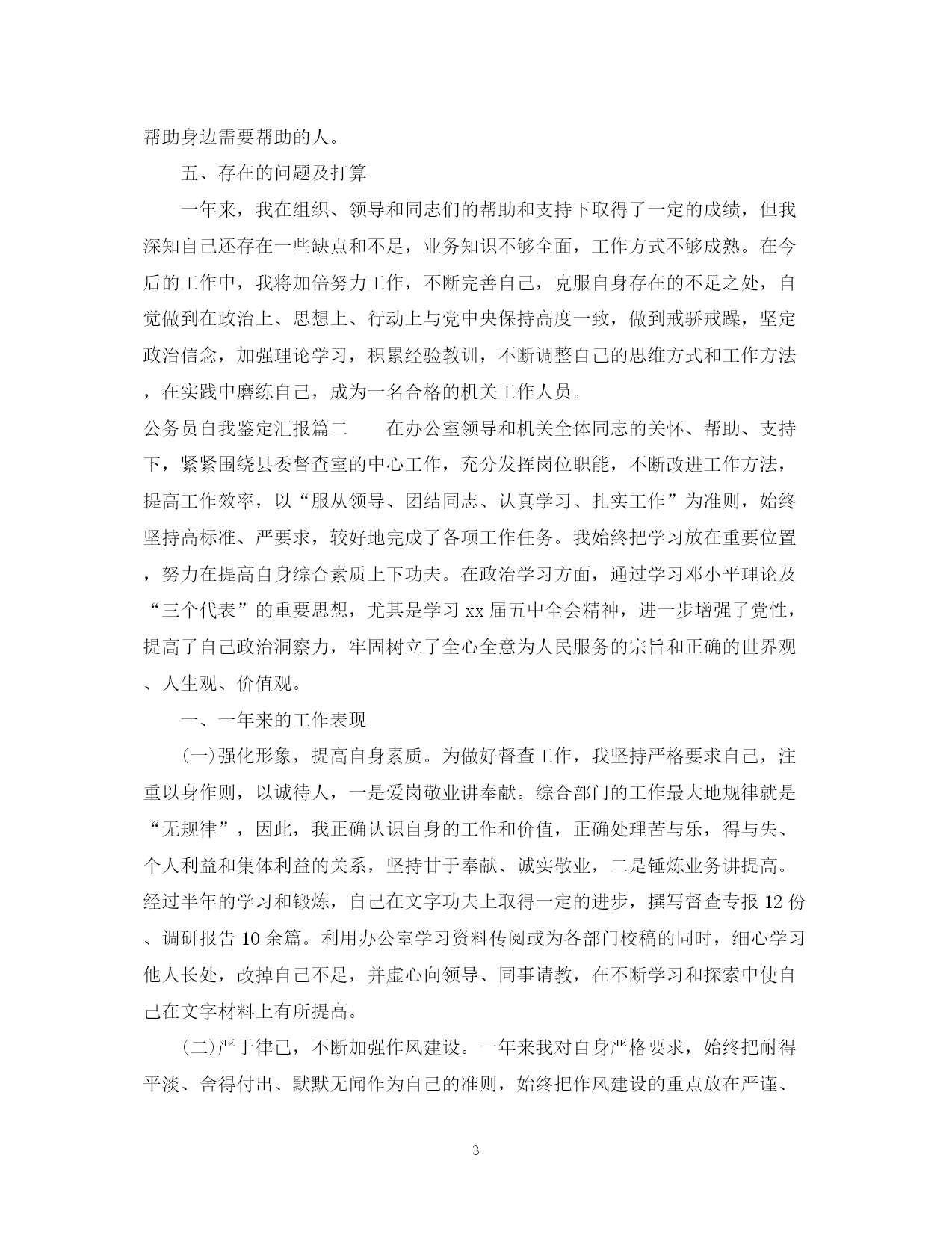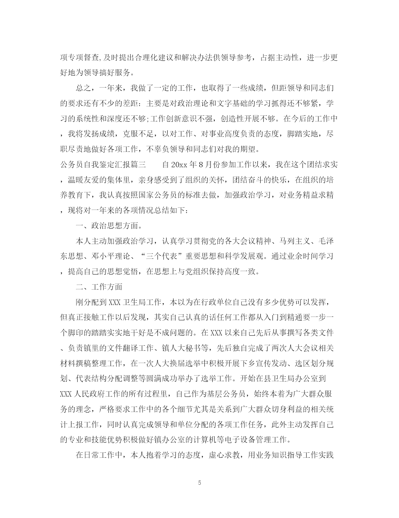 此资料由网络收集而来,如有侵权请告知上传者立即删除。资料共分享,我们负责传递知识。PAGEPAGE6公务员自我鉴定汇报身为公务员要始终保持严谨认真的工作态度和一丝不苟的工作作风,勤勤恳恳,任劳任怨。那么你要怎么去写公务员自我鉴定汇报呢?下面由本小编精心整理的公务员自我鉴定汇报,希望可以帮到你哦!公务员自我鉴定汇报篇一我于**年**月通过县乡事业单位工作人员考试考到区政法委,被安排在政法委综治维稳信息中心工作。工作一年来,在委领导的言传身教、关心培养下,在同事的支持帮助、密切配合下,我不断加强思想政治学习,对工作精益求精,个人思想政治素质和业务工作能力都取得了一定的进步,为今后的工作和学习打下了良好的基础,现将工作学习情况总结如下:一、政治思想方面认真加强思想政治学习,不断提高自己的政治理论水平。始终坚持以邓小平理论和“三个代表”重要思想为指导,认真贯彻党的xx大精神,深入领会执行中央、省和市委、市政府的一系列重大方针、政策、措施。牢固树立全心全意为人民服务的宗旨和正确的世界观、人生观和价值观,以开展保持共产党员先进性教育、政法干警核心价值观教育活动为重要契机,加强对马列理论、社会主义市场经济理论及现代经济、科技、法律等与工作领域相关的专业知识的学习,使思想认识和自身素质都有了新的提高。二、学习方面今年以来,我在认真完成学习任务的基础上,还非常注重个人自学,深化了对“三个代表”重要思想和《宪法》、《行政许可法》等法律法规及任长霞、徐正虎、李林森等先进事迹的学习,认真领会精神实质,并自觉地贯彻落实到行动中去,统一到区委的重大决策上来。坚持每天阅读各类文章,并认真做好读书笔记,努力做到融会贯通,联系实际,举一反三。注重学习效果,做到活学活用,学以致用。并根据日新月异的形势发展变化,注重学习新知识,熟悉新学科,努力适应新形势、新任务对本职工作的要求,不断拓宽知识视野。在工作中我有强烈的工作事业心和责任感,有多做事、干好工作的强烈愿望。敢于面对困难,能吃苦耐劳,加班加点毫无怨言。三、业务方面我作为政法委的综治维稳信息中心工作人员,主动为分管领导服好务。今年以来,我认真收集各项信息资料,全面、准确地了解和掌握各方面工作的开展情况,分析工作存在的主要问题,总结工作经验,及时向领导汇报,让领导尽量能全面、准确地了解和掌握最近工作的实际情况,为解决问题作出科学的、正确的决策。认真完成了领导交办讲话及各种汇报、通知、总结、经验交流材料等材料的起草校对工作,及时编写了各类政法方面的信息;对领导交办的各类信访案件做到及时处理、及时报送。全年跟随领导5次下基层进行调研,并撰写了有价值的调研。听从领导,服从安排,今年根据工作的安排,我参加了20xx年度综治考核,在考核过程中,我逐步完善提高业务知识,认真完成考核任务;参与了20xx年区公安协勤人员的招录考试,圆满完成了各项任务,受到了委领导的表扬,年底获得了社会管理创新先进个人奖励。四、学习生活方面今年以来,我严格要求自己,认真遵守办公室的各项规章制度,自觉做到值好班,上班不迟,下班不早退,按要求及时签到,特别是在有急事、到其它单位办事、下单位调研等情况都自觉向办公室请假。在工作过程中,我深深感到加强自身学习、提高自身素质的紧迫性,一是向书本学习,坚持每天挤出一定的时间不断充实自己,端正态度,改进方法,广泛汲取各种“营养”;二是向周围的同志学习,工作中我始终保持谦虚谨慎、虚心求教的态度,主动向领导、同事们请教,学习他们任劳任怨、求真务实的工作作风和处理问题的方法;三是向实践学习,把所学的知识运用于实际工作中,在实践中检验所学知识,查找不足,提高自己,防止和克服浅尝辄止、一知半解的倾向。作为一名机关工作者,我时刻提醒自己,要不断加强自身思想道德的修养和人格品质的锻炼,增强奉献意识,把清正廉洁作为人格修养的重点。不受社会上一些不良风气的影响,从一点一滴的小事做起,生活中勤俭节朴,宽以待人;工作中严以律己,忠于职守,防微杜渐。牢固树立全心全意为人民服务的宗旨意识,帮助身边需要帮助的人。五、存在的问题及打算一年来,我在组织、领导和同志们的帮助和支持下取得了一定的成绩,但我深知自己还存在一些缺点和不足,业务知识不够全面,工作方式不够成熟。在今后的工作中,我将加倍努力工作,不断完善自己,克服自身存在的不足之处,自觉做到在政治上、思想上、行动上与党中央保持高度一致,做到戒骄戒躁,坚定政治信念,加强理论学习,积累经验教训,不断调整自己的思维方式和工作方法,在实践中磨练自己,成为一名合格的机关工作人员。公务员自我鉴定汇报篇二在办公室领导和机关全体同志的关怀、帮助、支持下,紧紧围绕县委督查室的中心工作,充分发挥岗位职能,不断改进工作方法,提高工作效率,以“服从领导、团结同志、