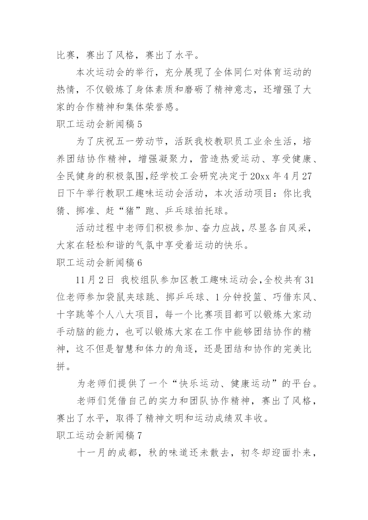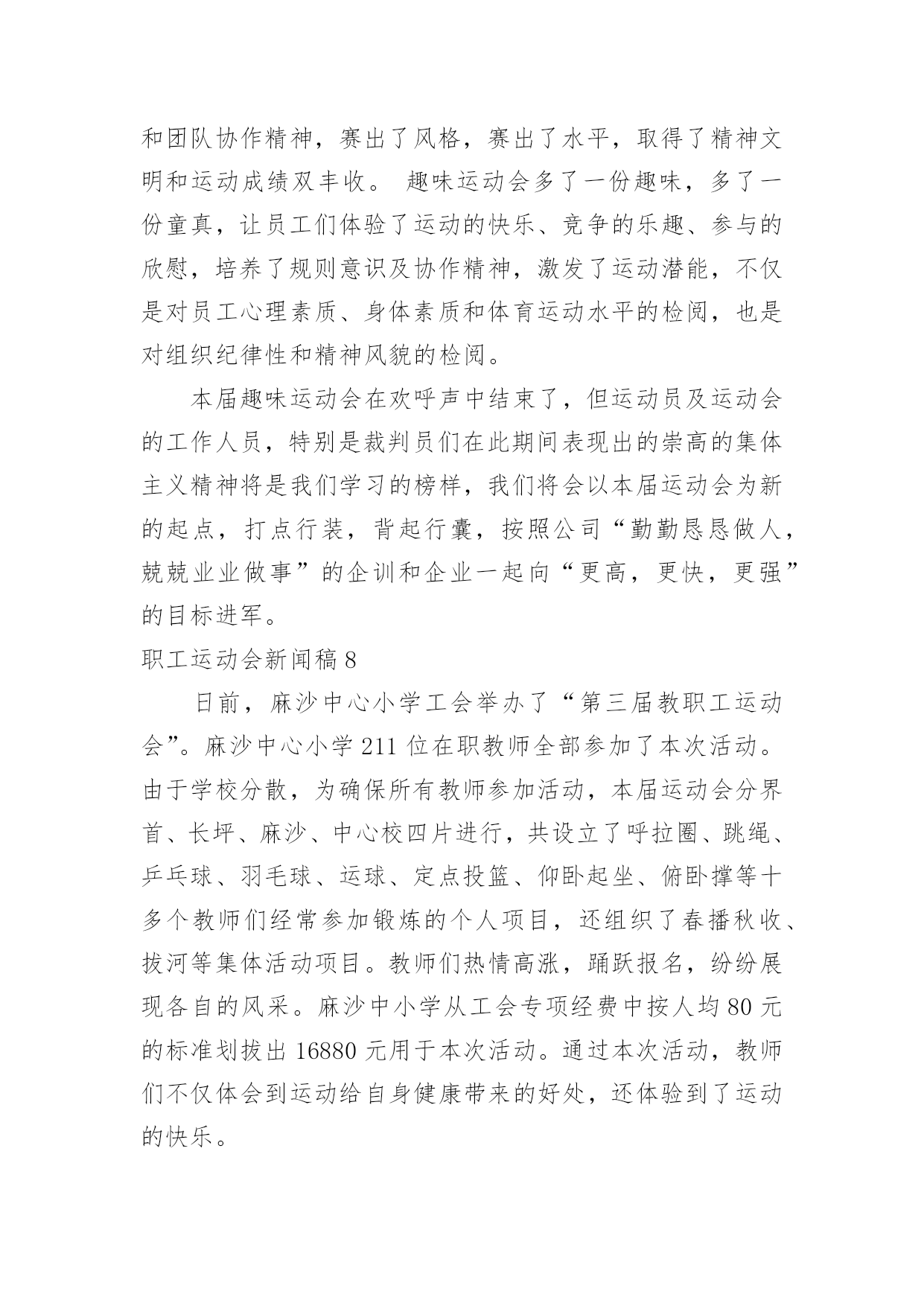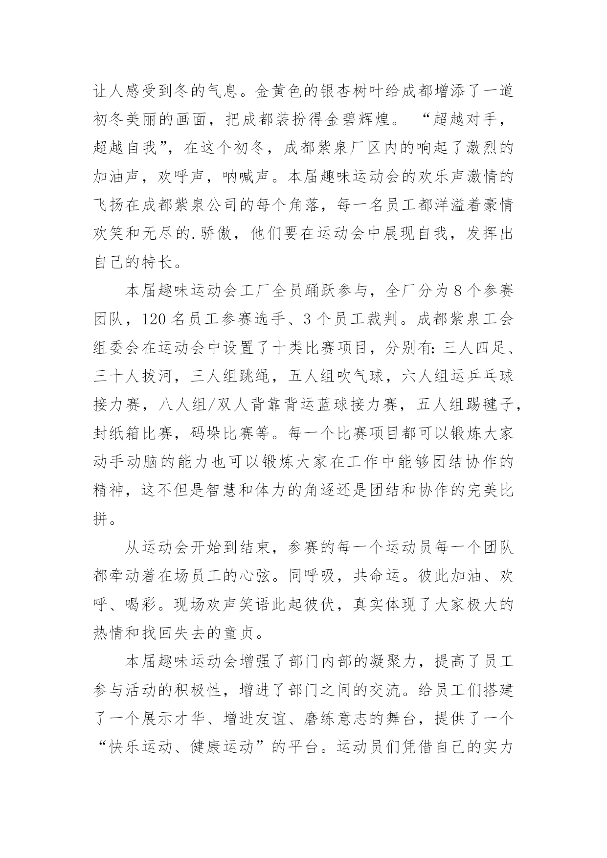 职工运动会新闻稿职工运动会新闻稿在人们物质精神需求不断增长的今天,需要使用新闻稿的场合越来越多,新闻稿是对新近发生事实的报道。这是目前最被认可的一种新闻定义。写起新闻稿来就毫无头绪?下面是小编帮大家整理的职工运动会新闻稿,供大家参考借鉴,希望可以帮助到有需要的朋友。职工运动会新闻稿1在这美丽的3月,“我运动,我健康,我快乐”的青春号角在xx公司的每一个角落吹响,22日下午1点,重庆高科体育场上,彩旗飘扬,人头攒动,xx公司第四届运动会的大幕即将拉开。别样的风采,高昂的斗志,跟随者《运动员进行曲》的节拍,运动健儿们身着统一的文化衫,迈着有力的步伐跃进出场,他们给自己的队伍取了响亮的名字。整齐的步伐印证着他们同心协力的信念;响亮的口号,喊出了他们永不言败的决心。“多少次挥汗如雨,伤痛曾填满记忆,只因为始终相信,去拼搏才能胜利,总是在鼓舞自己,要成功就得努力,热血在赛场沸腾,新媒在重庆升起”一曲改编自零点乐队的《相信自己》,由公司四大人气歌手激情献唱,为赛场上所有的队员们带来奋力拼搏力量和雄心!运动健儿拼搏的姿态开场表演结束,广播体操比赛正式开始,各队领操员在主持人的介绍下登上领操台,随着第八台广播体操音乐的节奏,各队整理好队形,做操的音乐响起,队员们全情投入,认真地做动作。放眼望去,所有的健儿们精神抖擞,动作整齐划一,刚劲有力,成为美丽蓝天下最亮丽的风景线。速度·技巧——乒乓球“乒乒乓乓,乒乒乓乓”,早在3月x日,乒乓球男单和女单预决赛已在湘江狮堡二楼打响。48选手谁都不甘示弱,使出了自己的看家本领。搓球、刁球、旋转球、反手球,你来我当,一组球打了十几个回合也分不出胜负,看得人眼花缭乱。经过两个小时的激烈角逐,比赛最终决出了男子和女子乒乓球的前三名。沉稳·谋略——台球楼上的乒乓球进行的如火如荼,楼下的台球赛也在静静展开。24位选手通过抽签方式进行对决,和运动会其他的比赛不同,台球比赛中不需要力量的比拼和快速的反应,更多的是需要沉着的性格和精心的布局。握杆、架桥、出杆、击球,每一个动作都彰显出台球健儿们的优良品性和非凡智慧。力量·对决——羽毛球3月x日,羽毛球男单和女单比赛在凯建羽毛球馆正式上演。选手们摩拳擦掌,一场力量与速度的较量全面展开。有力的“高空发球”、灵活的反手接球、猛烈的扣球攻击、巧妙的“海底捞月”,健儿们一次次有力地挥动球拍,让飞扬的羽毛球时而像出膛的子弹,像离弦的弓箭,气势汹涌,锐不可当。团队·较量——足球足球赛让我们见识到团结协作,坚持不懈的运动精神,各队在场上展开激烈比拼,队员们沉着应战,默契配合,快速传球,稳定的后线防守、巧妙地中场进攻、精彩的开花攻门,经过激烈对战,二队最终冲破层层障碍,勇夺足球比赛第一名。潇洒·激情——篮球每一个回旋传球,每一个三步上篮,每一个精准投球,都引起现场观众一阵阵喝彩与掌声。篮球,是激情飞扬的精灵,来回穿梭,在场上划出一道道美丽的弧线。激烈的比分不断翻动,观众的心情也波动起伏!快乐·协作——趣味比赛在趣味体育比赛的赛场上,有趣的规则设置和团队竞赛形式,让大家在欢笑中体验协作精神。乒乓球接力赛各队4位员协作共进,往返接力;袋鼠跳诙谐的比赛动作引得观众开怀大笑;集体跳绳项目需要在8位成员的默契配合下完成跳绳任务;闯关达人中设置了有趣的小游戏让大家在轻松比赛中闯过六关收获胜利的喜悦。趣味比赛让大家加懂得,只要拥有热爱运动的精神和乐观的心态,生活中随处可见的简单道具都能成为我们锻炼身体的工具和快乐的源泉!工作人员辛勤的身影如果说在运动场上拼搏的运动员是闪亮明星,拥有着耀眼的光芒,那么在台下辛勤付出的志愿者、裁判和摄影师们就是辽阔的天空,让这一切光芒拥有绽放的地方。下午五点,随着趣味比赛的结束,运动会也即将落下帷幕。在运动会最后一项,荣誉和丰收的环节——颁奖典礼荣耀展开。所有的获奖选手和团队都收获了精美的奖状和实用的奖品。颁奖典礼结束,公司第四届运动会圆满落幕。运动会虽然结束,但是运动健儿们爽朗的笑声还在场上回荡,关于“运动健康快乐”的美丽梦想仍在延续。职工运动会新闻稿25月21日下午,我校一年一度的教职工趣味运动会在本部体育场举行,图书馆分工会积极组织了近50名教职工参赛,图书馆与科技平台党总支书记彭雷、水文水资源与水利工程科学国家重点实验室副主任丁寿祥参加了此次活动。图书馆分工会凭借跳大绳、二人三足接力、30米抱足球接力等项目的出色发挥,获得了团队二等奖的佳绩。在此次活动上,共有5个活动项目:跳大绳、二人三足接力、足球绕杆接力、呼啦圈30米接力、30米抱足球接力。尽管烈日炎炎,但教职工们依然兴致盎然,争分夺秒练习比赛项目,认真进行热身等赛前准备。在跳绳比赛、呼啦圈30米接力大家更是玩得不亦乐乎。二人三足接力、足球绕杆接力、呼啦圈30米接力、30米抱足球接力项目的比赛异常激烈,参赛队员