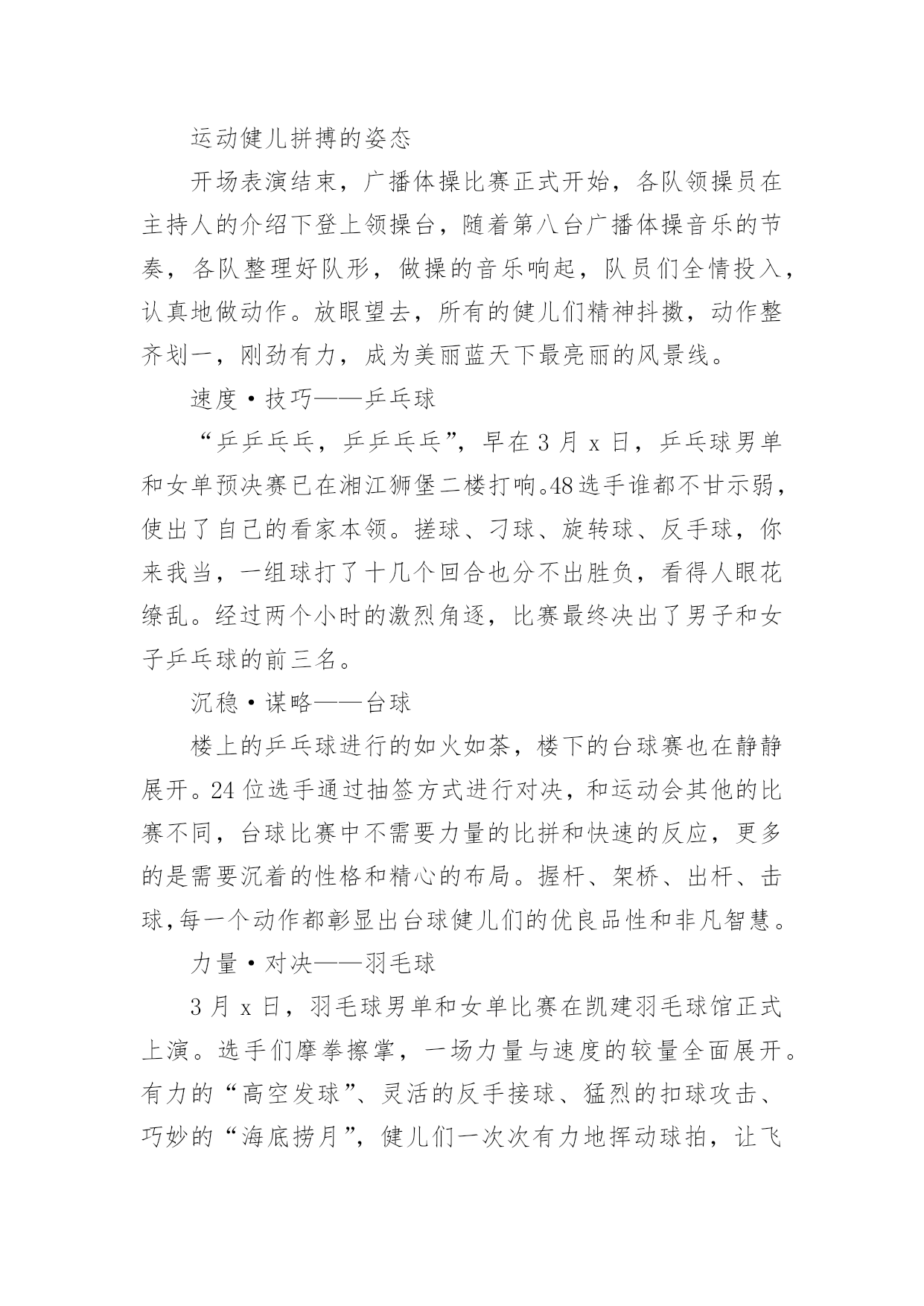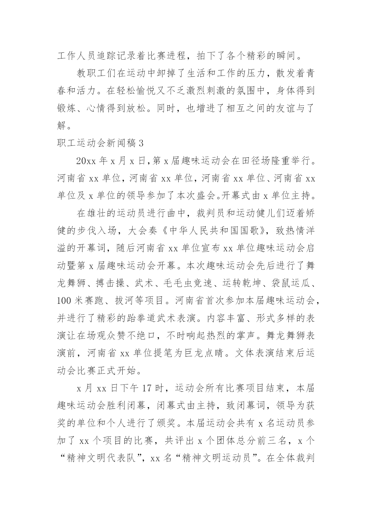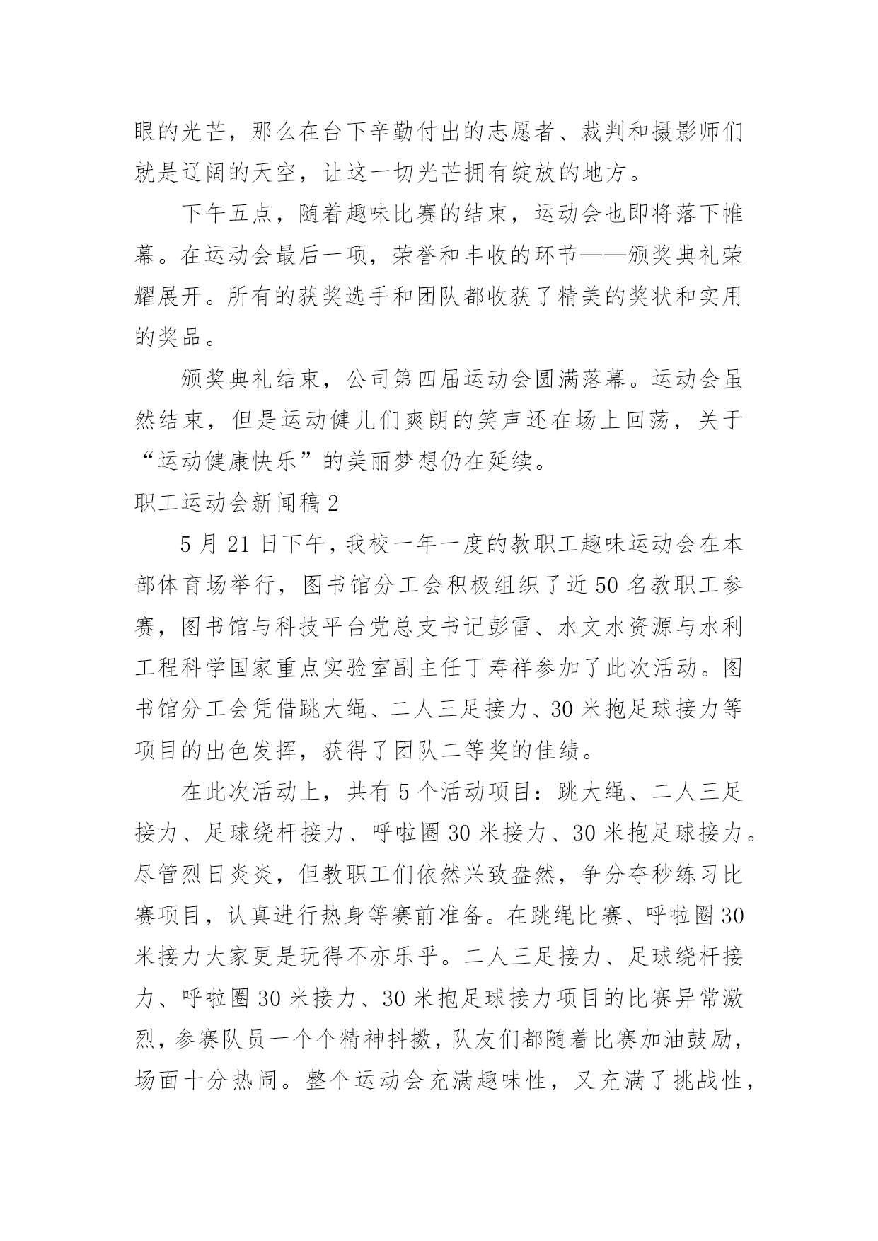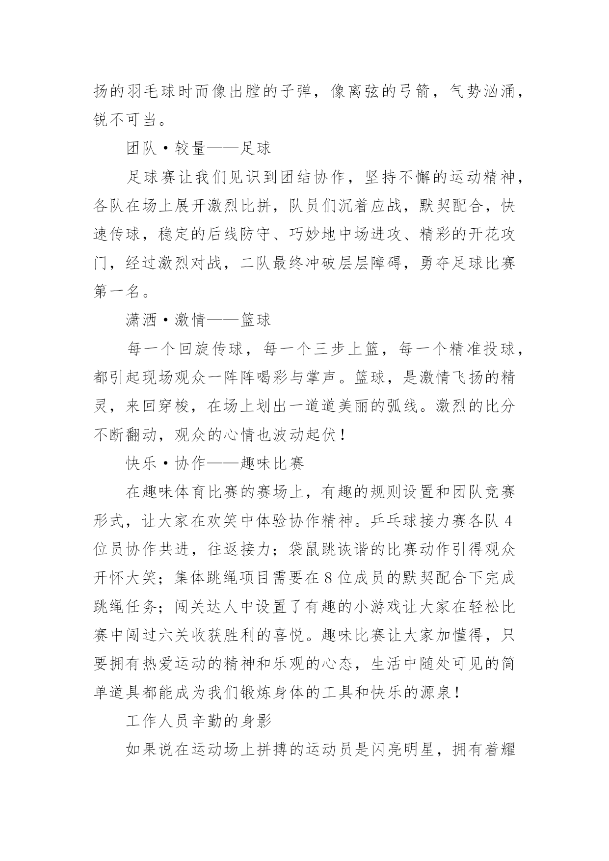 职工运动会新闻稿职工运动会新闻稿在人们物质精神需求不断增长的今天,需要使用新闻稿的场合越来越多,新闻稿是对新近发生事实的报道。这是目前最被认可的一种新闻定义。写起新闻稿来就毫无头绪?下面是小编帮大家整理的职工运动会新闻稿,供大家参考借鉴,希望可以帮助到有需要的朋友。职工运动会新闻稿1在这美丽的3月,“我运动,我健康,我快乐”的青春号角在xx公司的每一个角落吹响,22日下午1点,重庆高科体育场上,彩旗飘扬,人头攒动,xx公司第四届运动会的大幕即将拉开。别样的风采,高昂的斗志,跟随者《运动员进行曲》的节拍,运动健儿们身着统一的文化衫,迈着有力的步伐跃进出场,他们给自己的队伍取了响亮的名字。整齐的步伐印证着他们同心协力的信念;响亮的口号,喊出了他们永不言败的决心。“多少次挥汗如雨,伤痛曾填满记忆,只因为始终相信,去拼搏才能胜利,总是在鼓舞自己,要成功就得努力,热血在赛场沸腾,新媒在重庆升起”一曲改编自零点乐队的《相信自己》,由公司四大人气歌手激情献唱,为赛场上所有的队员们带来奋力拼搏力量和雄心!运动健儿拼搏的姿态开场表演结束,广播体操比赛正式开始,各队领操员在主持人的介绍下登上领操台,随着第八台广播体操音乐的节奏,各队整理好队形,做操的音乐响起,队员们全情投入,认真地做动作。放眼望去,所有的健儿们精神抖擞,动作整齐划一,刚劲有力,成为美丽蓝天下最亮丽的风景线。速度·技巧——乒乓球“乒乒乓乓,乒乒乓乓”,早在3月x日,乒乓球男单和女单预决赛已在湘江狮堡二楼打响。48选手谁都不甘示弱,使出了自己的看家本领。搓球、刁球、旋转球、反手球,你来我当,一组球打了十几个回合也分不出胜负,看得人眼花缭乱。经过两个小时的激烈角逐,比赛最终决出了男子和女子乒乓球的前三名。沉稳·谋略——台球楼上的乒乓球进行的如火如荼,楼下的台球赛也在静静展开。24位选手通过抽签方式进行对决,和运动会其他的比赛不同,台球比赛中不需要力量的比拼和快速的反应,更多的是需要沉着的性格和精心的布局。握杆、架桥、出杆、击球,每一个动作都彰显出台球健儿们的优良品性和非凡智慧。力量·对决——羽毛球3月x日,羽毛球男单和女单比赛在凯建羽毛球馆正式上演。选手们摩拳擦掌,一场力量与速度的较量全面展开。有力的“高空发球”、灵活的反手接球、猛烈的扣球攻击、巧妙的“海底捞月”,健儿们一次次有力地挥动球拍,让飞扬的羽毛球时而像出膛的子弹,像离弦的弓箭,气势汹涌,锐不可当。团队·较量——足球足球赛让我们见识到团结协作,坚持不懈的运动精神,各队在场上展开激烈比拼,队员们沉着应战,默契配合,快速传球,稳定的后线防守、巧妙地中场进攻、精彩的开花攻门,经过激烈对战,二队最终冲破层层障碍,勇夺足球比赛第一名。潇洒·激情——篮球每一个回旋传球,每一个三步上篮,每一个精准投球,都引起现场观众一阵阵喝彩与掌声。篮球,是激情飞扬的精灵,来回穿梭,在场上划出一道道美丽的弧线。激烈的比分不断翻动,观众的心情也波动起伏!快乐·协作——趣味比赛在趣味体育比赛的赛场上,有趣的规则设置和团队竞赛形式,让大家在欢笑中体验协作精神。乒乓球接力赛各队4位员协作共进,往返接力;袋鼠跳诙谐的比赛动作引得观众开怀大笑;集体跳绳项目需要在8位成员的默契配合下完成跳绳任务;闯关达人中设置了有趣的小游戏让大家在轻松比赛中闯过六关收获胜利的喜悦。趣味比赛让大家加懂得,只要拥有热爱运动的精神和乐观的心态,生活中随处可见的简单道具都能成为我们锻炼身体的工具和快乐的源泉!工作人员辛勤的身影如果说在运动场上拼搏的运动员是闪亮明星,拥有着耀眼的光芒,那么在台下辛勤付出的志愿者、裁判和摄影师们就是辽阔的天空,让这一切光芒拥有绽放的地方。下午五点,随着趣味比赛的结束,运动会也即将落下帷幕。在运动会最后一项,荣誉和丰收的环节——颁奖典礼荣耀展开。所有的获奖选手和团队都收获了精美的奖状和实用的奖品。颁奖典礼结束,公司第四届运动会圆满落幕。运动会虽然结束,但是运动健儿们爽朗的笑声还在场上回荡,关于“运动健康快乐”的美丽梦想仍在延续。职工运动会新闻稿25月21日下午,我校一年一度的教职工趣味运动会在本部体育场举行,图书馆分工会积极组织了近50名教职工参赛,图书馆与科技平台党总支书记彭雷、水文水资源与水利工程科学国家重点实验室副主任丁寿祥参加了此次活动。图书馆分工会凭借跳大绳、二人三足接力、30米抱足球接力等项目的出色发挥,获得了团队二等奖的佳绩。在此次活动上,共有5个活动项目:跳大绳、二人三足接力、足球绕杆接力、呼啦圈30米接力、30米抱足球接力。尽管烈日炎炎,但教职工们依然兴致盎然,争分夺秒练习比赛项目,认真进行热身等赛前准备。在跳绳比赛、呼啦圈30米接力大家更是玩得不亦乐乎。二人三足接力、足球绕杆接力、呼啦圈30米接力、30米抱足球接力项目的比赛异常激烈,参赛队员