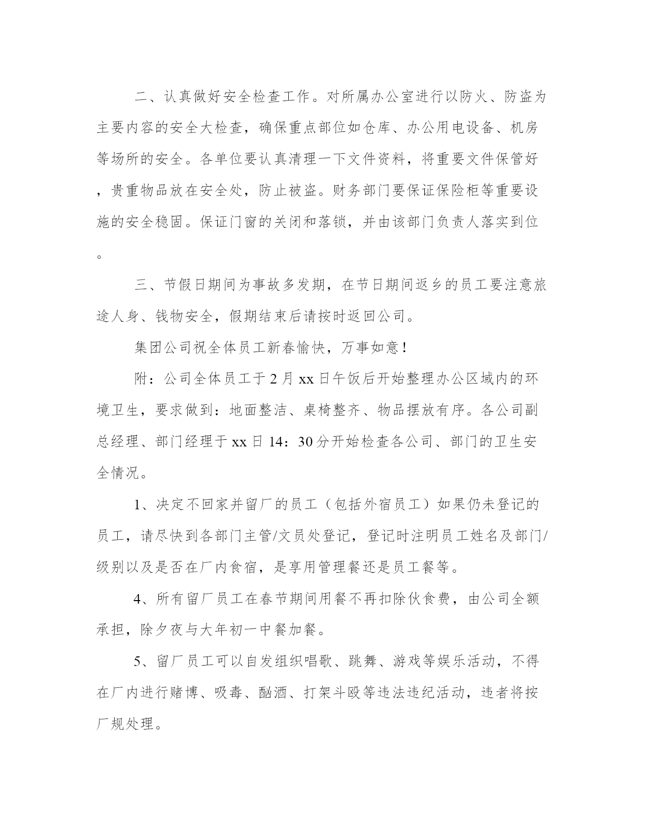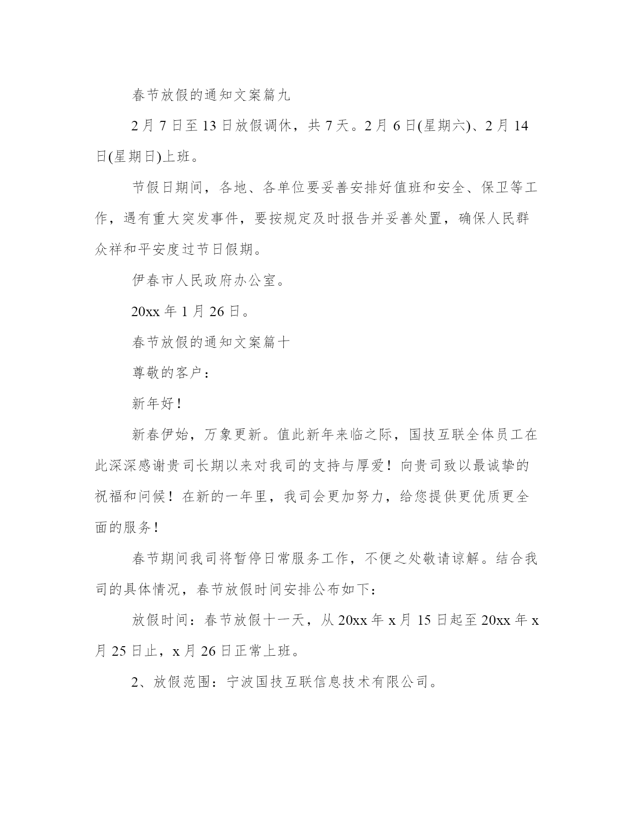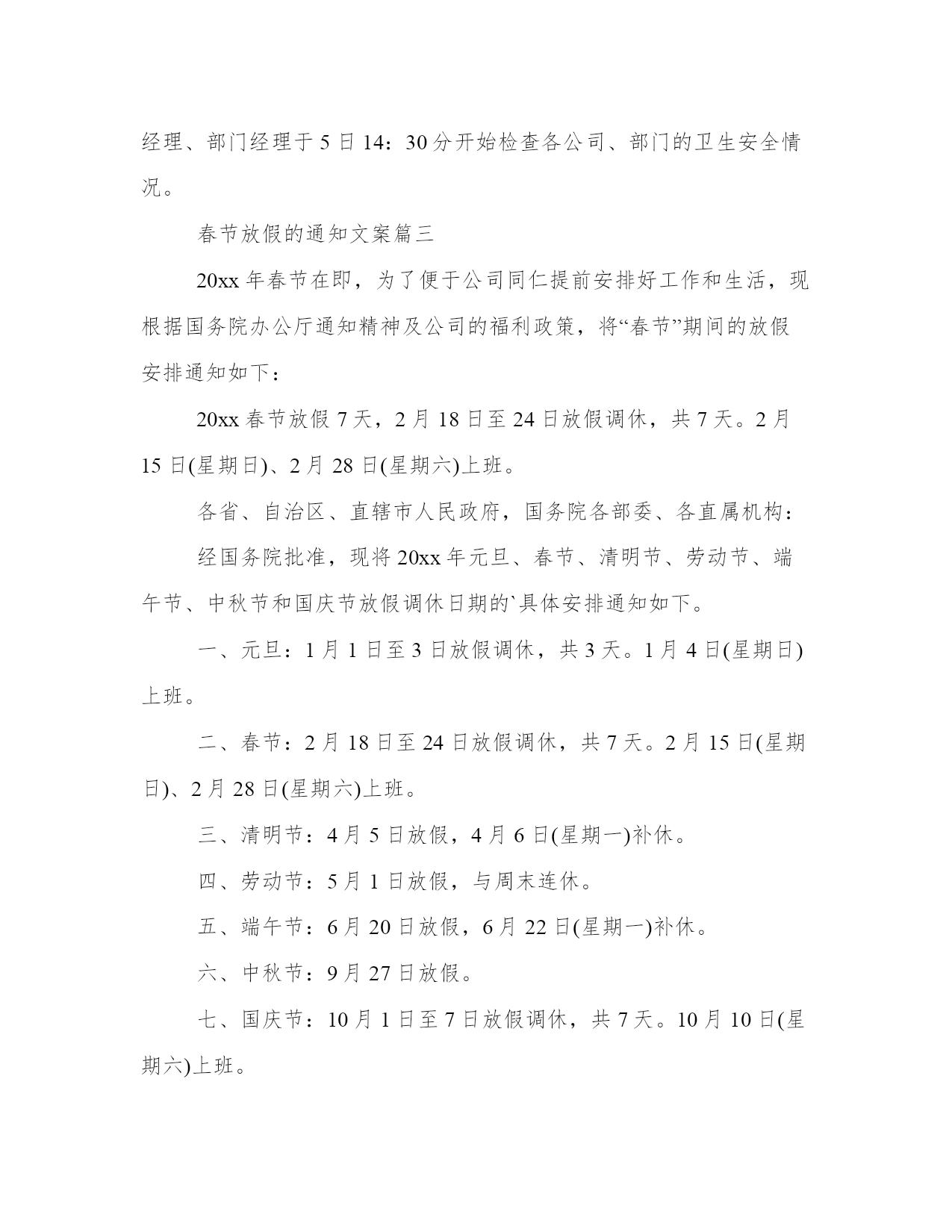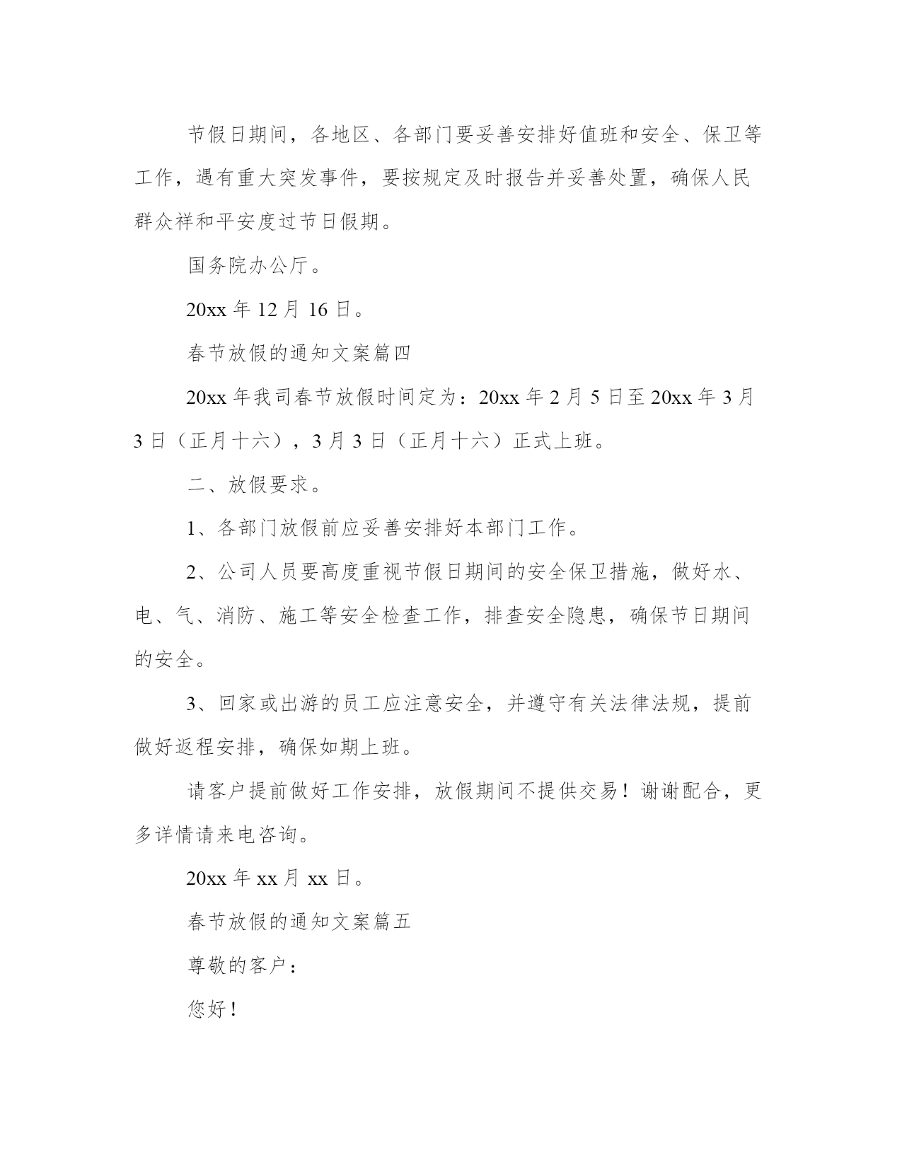 春节放假的通知文案(模板15篇)生活中总有一些突如其来的事情需要我们总结和概括。一个简洁明了的总结能够让读者快速了解主要内容。下面是一些保护环境的实用方法,希望大家都能积极参与到环保中来。春节放假的通知文案篇一20xx年春节将至,为使公司和员工共同度过一个欢乐、祥和、平安的新春佳节,切实做好节日期间的安全工作,现将有关事宜通知如下:一、放假时间:2月18日至24日放假调休,共7天。2月15日(星期日)、2月28日(星期六)上班。20xx年除夕是2月18日,是属于国家法定节假日。二、认真做好安全检查工作。对所属办公室进行以防火、防盗为主要内容的安全大检查,确保重点部位如仓库、办公用电设备、机房等场所的安全。各单位要认真清理一下文件资料,将重要文件保管好,贵重物品放在安全处,防止被盗。财务部门要保证保险柜等重要设施的安全稳固。保证门窗的关闭和落锁,并由该部门负责人落实到位。三、节假日期间为事故多发期,在节日期间返乡的员工要注意旅途人身、钱物安全,假期结束后请按时返回公司。集团公司祝全体员工新春愉快,万事如意!春节放假的通知文案篇二新春佳节渐近,为欢度中华民族的传统佳节,使全体人员能够开开心心地过上一个欢乐、祥和的20xx年春节,尽可能的与家人一起享受节日的欢乐和喜悦;结合生产情况,经公司分析决定:公司定于1月**日起开始放年假,年假共计天,截止时间为*月*日,*月*日正式上班。同时,公司要求所有的员工必须在*月*日到达深圳,确保*月*日能够正常上班;届时公司一律不接受电话请假,逾期未到者按旷工处理。为了让不回家的员工过一个欢乐祥和的春节,同时也方便公司在春节期间的食宿安排和管理工作的开展,特通告好下:1、决定不回家并留厂的员工(包括外宿员工)如果仍未登记的员工,请尽快到各部门主管/文员处登记,登记时注明员工姓名及部门/级别以及是否在厂内食宿,是享用管理餐还是员工餐等。2、各部门文员/主管请将增加的统计名单于元月xx日前将留厂人中名单交到行政部。3、行政部将根据留厂人员情况安排用餐及住宿保安相关事宜,请员工决定后再行登记。4、所有留厂员工在春节期间用餐不再扣除伙食费,由公司全额承担,除夕夜与大年初一中餐加餐。5、留厂员工可以自发组织唱歌、跳舞、游戏等娱乐活动,不得在厂内进行赌博、吸毒、酗酒、打架斗殴等违法违纪活动,违者将按厂规处理。有限责任公司。20xx年1月*日。20xx年春节将至,为使公司和员工共同度过一个欢乐、祥和、平安的新春佳节,切实做好节日期间的安全工作,现将有关事宜通知如下:一、放假时间:自20xx年1月26日(农历腊月二十六)至20xx年2月6日放假,共12天。2月6日(星期一)上班。。二、认真做好安全检查工作。对所属办公室进行以防火、防盗为主要内容的安全大检查,确保重点部位如仓库、办公用电设备、机房等场所的安全。各单位要认真清理一下文件资料,将重要文件保管好,贵重物品放在安全处,防止被盗。财务部门要保证保险柜等重要设施的安全稳固。保证门窗的关闭和落锁,并由该部门负责人落实到位。三、节假日期间为事故多发期,在节日期间返乡的员工要注意旅途人身、钱物安全,假期结束后请按时返回公司。集团公司祝全体员工新春愉快,万事如意!附:公司全体员工于2月5日午饭后开始整理办公区域内的环境卫生,要求做到:地面整洁、桌椅整齐、物品摆放有序。各公司副总经理、部门经理于5日14:30分开始检查各公司、部门的卫生安全情况。春节放假的通知文案篇三20xx年春节在即,为了便于公司同仁提前安排好工作和生活,现根据国务院办公厅通知精神及公司的福利政策,将“春节”期间的放假安排通知如下:20xx春节放假7天,2月18日至24日放假调休,共7天。2月15日(星期日)、2月28日(星期六)上班。各省、自治区、直辖市人民政府,国务院各部委、各直属机构:经国务院批准,现将20xx年元旦、春节、清明节、劳动节、端午节、中秋节和国庆节放假调休日期的`具体安排通知如下。一、元旦:1月1日至3日放假调休,共3天。1月4日(星期日)上班。二、春节:2月18日至24日放假调休,共7天。2月15日(星期日)、2月28日(星期六)上班。三、清明节:4月5日放假,4月6日(星期一)补休。四、劳动节:5月1日放假,与周末连休。五、端午节:6月20日放假,6月22日(星期一)补休。六、中秋节:9月27日放假。七、国庆节:10月1日至7日放假调休,共7天。10月10日(星期六)上班。节假日期间,各地区、各部门要妥善安排好值班和安全、保卫等工作,遇有重大突发事件,要按规定及时报告并妥善处置,确保人民群众祥和平安度过节日假期。国务院办公厅。20xx年12月16日。春节放假的通知文案篇四20xx年我司春节放假