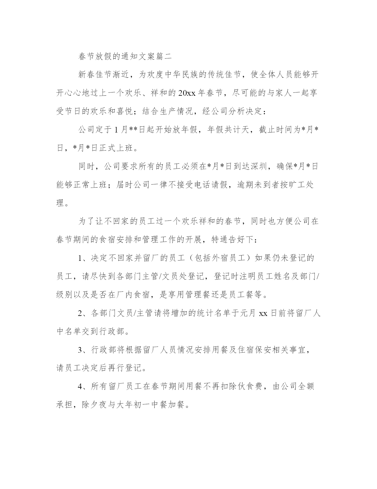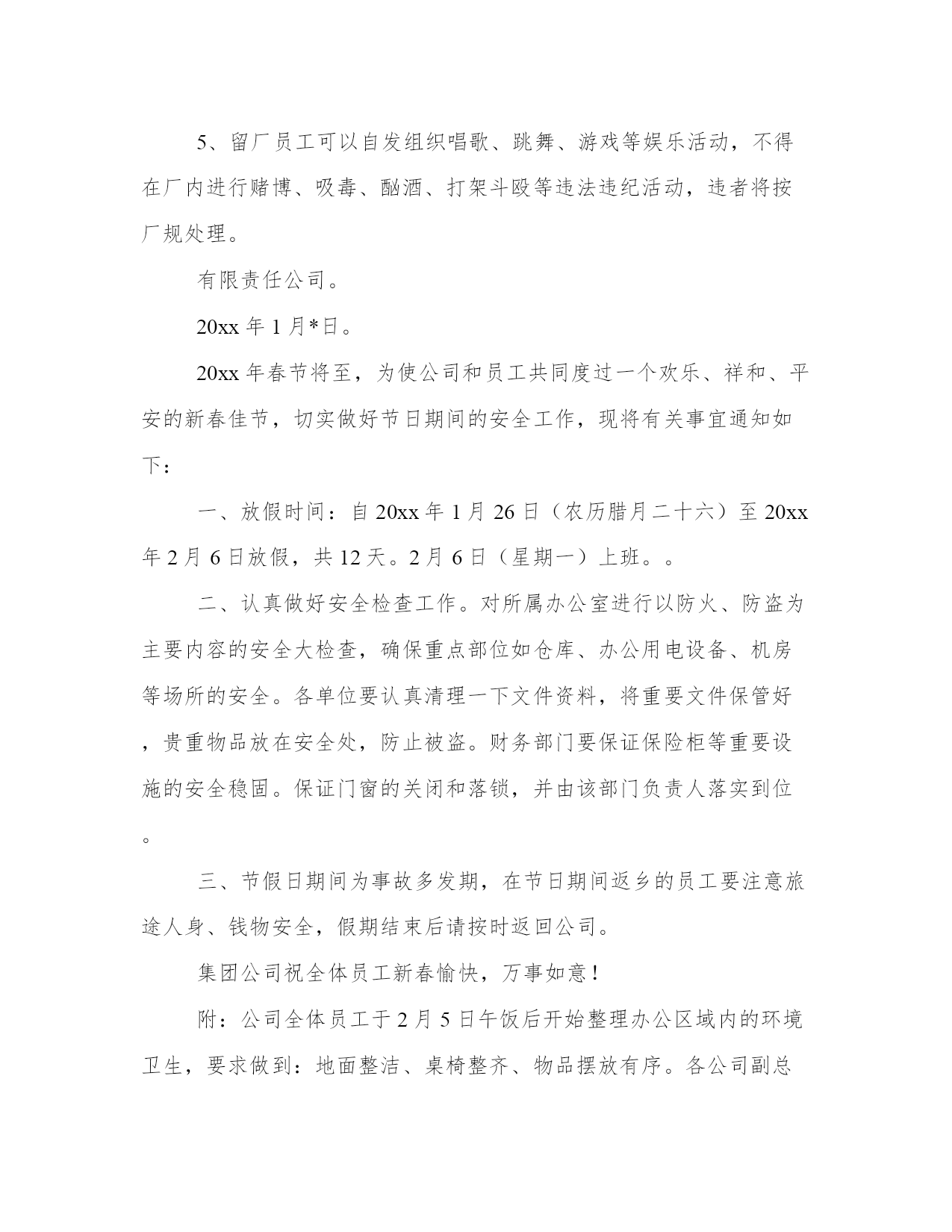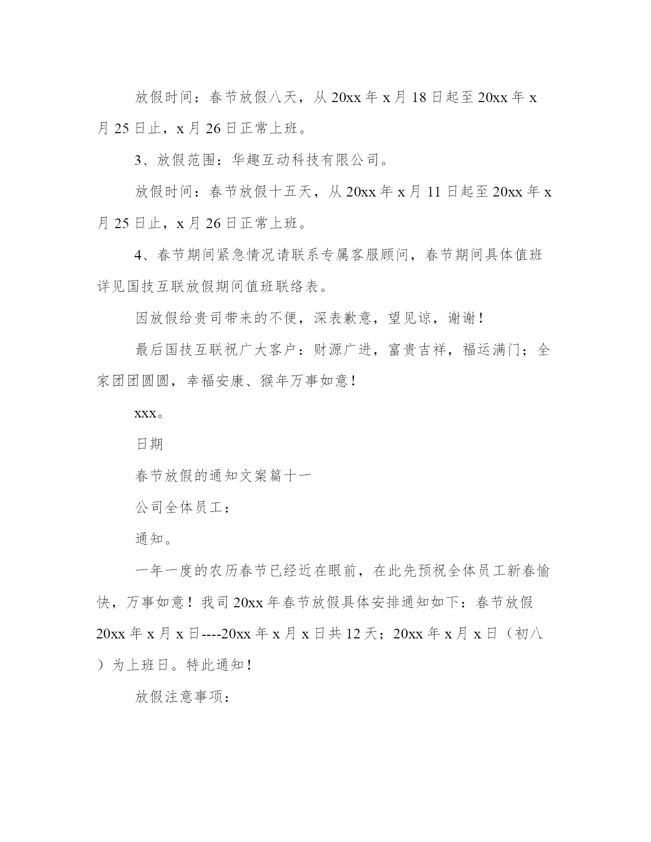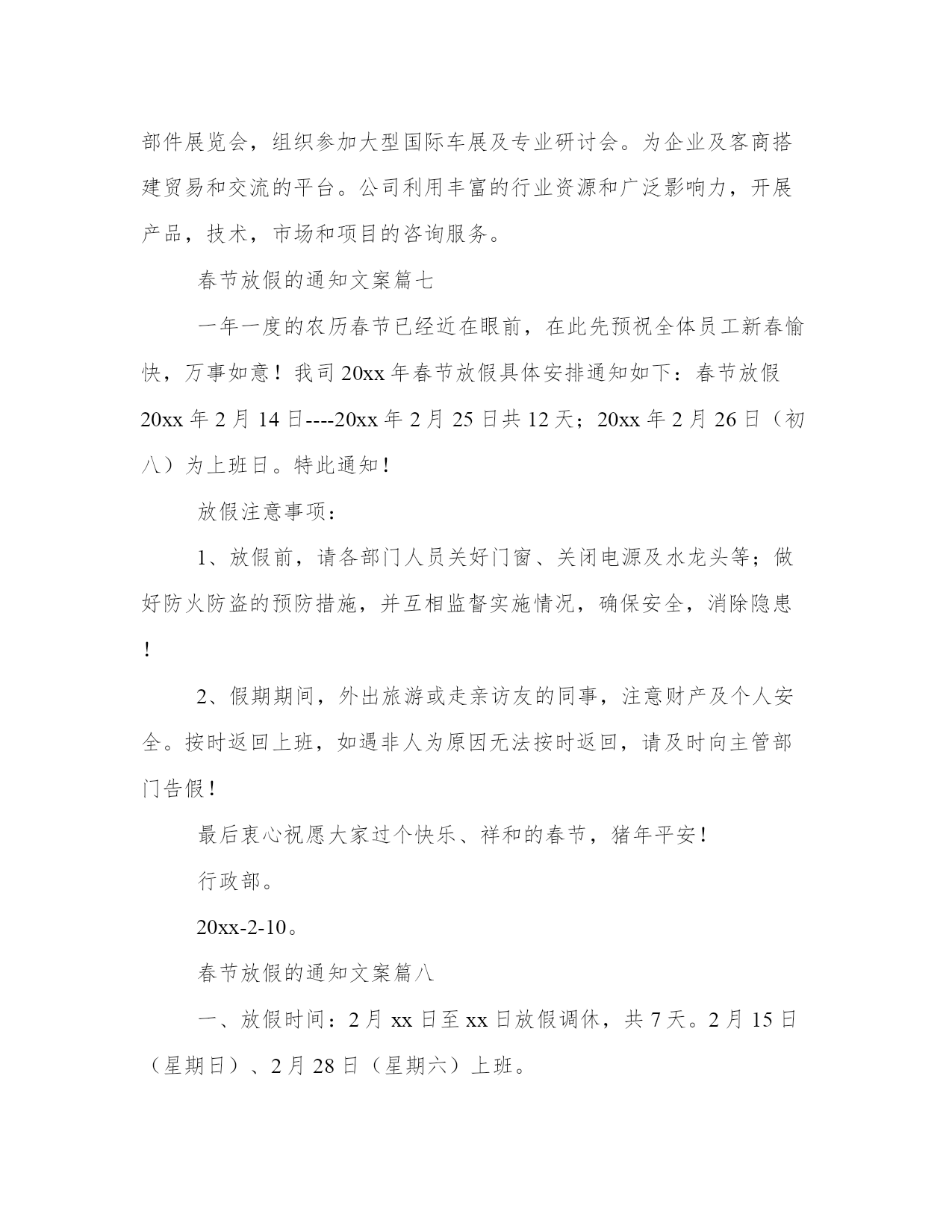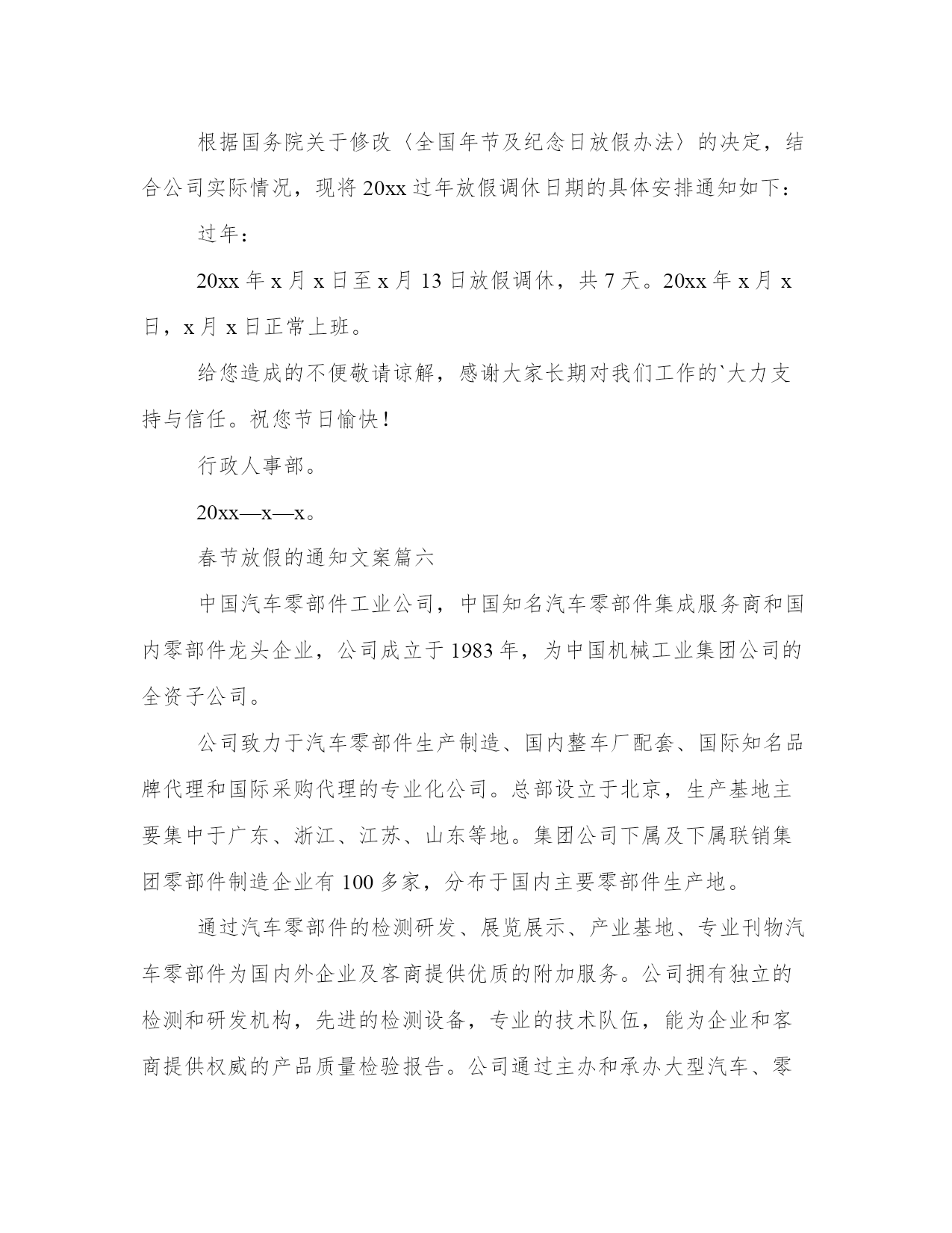 春节放假的通知文案(模板15篇)生活中总有一些突如其来的事情需要我们总结和概括。一个简洁明了的总结能够让读者快速了解主要内容。下面是一些保护环境的实用方法,希望大家都能积极参与到环保中来。春节放假的通知文案篇一20xx年春节将至,为使公司和员工共同度过一个欢乐、祥和、平安的新春佳节,切实做好节日期间的安全工作,现将有关事宜通知如下:一、放假时间:2月18日至24日放假调休,共7天。2月15日(星期日)、2月28日(星期六)上班。20xx年除夕是2月18日,是属于国家法定节假日。二、认真做好安全检查工作。对所属办公室进行以防火、防盗为主要内容的安全大检查,确保重点部位如仓库、办公用电设备、机房等场所的安全。各单位要认真清理一下文件资料,将重要文件保管好,贵重物品放在安全处,防止被盗。财务部门要保证保险柜等重要设施的安全稳固。保证门窗的关闭和落锁,并由该部门负责人落实到位。三、节假日期间为事故多发期,在节日期间返乡的员工要注意旅途人身、钱物安全,假期结束后请按时返回公司。集团公司祝全体员工新春愉快,万事如意!春节放假的通知文案篇二新春佳节渐近,为欢度中华民族的传统佳节,使全体人员能够开开心心地过上一个欢乐、祥和的20xx年春节,尽可能的与家人一起享受节日的欢乐和喜悦;结合生产情况,经公司分析决定:公司定于1月**日起开始放年假,年假共计天,截止时间为*月*日,*月*日正式上班。同时,公司要求所有的员工必须在*月*日到达深圳,确保*月*日能够正常上班;届时公司一律不接受电话请假,逾期未到者按旷工处理。为了让不回家的员工过一个欢乐祥和的春节,同时也方便公司在春节期间的食宿安排和管理工作的开展,特通告好下:1、决定不回家并留厂的员工(包括外宿员工)如果仍未登记的员工,请尽快到各部门主管/文员处登记,登记时注明员工姓名及部门/级别以及是否在厂内食宿,是享用管理餐还是员工餐等。2、各部门文员/主管请将增加的统计名单于元月xx日前将留厂人中名单交到行政部。3、行政部将根据留厂人员情况安排用餐及住宿保安相关事宜,请员工决定后再行登记。4、所有留厂员工在春节期间用餐不再扣除伙食费,由公司全额承担,除夕夜与大年初一中餐加餐。5、留厂员工可以自发组织唱歌、跳舞、游戏等娱乐活动,不得在厂内进行赌博、吸毒、酗酒、打架斗殴等违法违纪活动,违者将按厂规处理。有限责任公司。20xx年1月*日。20xx年春节将至,为使公司和员工共同度过一个欢乐、祥和、平安的新春佳节,切实做好节日期间的安全工作,现将有关事宜通知如下:一、放假时间:自20xx年1月26日(农历腊月二十六)至20xx年2月6日放假,共12天。2月6日(星期一)上班。。二、认真做好安全检查工作。对所属办公室进行以防火、防盗为主要内容的安全大检查,确保重点部位如仓库、办公用电设备、机房等场所的安全。各单位要认真清理一下文件资料,将重要文件保管好,贵重物品放在安全处,防止被盗。财务部门要保证保险柜等重要设施的安全稳固。保证门窗的关闭和落锁,并由该部门负责人落实到位。三、节假日期间为事故多发期,在节日期间返乡的员工要注意旅途人身、钱物安全,假期结束后请按时返回公司。集团公司祝全体员工新春愉快,万事如意!附:公司全体员工于2月5日午饭后开始整理办公区域内的环境卫生,要求做到:地面整洁、桌椅整齐、物品摆放有序。各公司副总经理、部门经理于5日14:30分开始检查各公司、部门的卫生安全情况。春节放假的通知文案篇三20xx年春节在即,为了便于公司同仁提前安排好工作和生活,现根据国务院办公厅通知精神及公司的福利政策,将“春节”期间的放假安排通知如下:20xx春节放假7天,2月18日至24日放假调休,共7天。2月15日(星期日)、2月28日(星期六)上班。各省、自治区、直辖市人民政府,国务院各部委、各直属机构:经国务院批准,现将20xx年元旦、春节、清明节、劳动节、端午节、中秋节和国庆节放假调休日期的`具体安排通知如下。一、元旦:1月1日至3日放假调休,共3天。1月4日(星期日)上班。二、春节:2月18日至24日放假调休,共7天。2月15日(星期日)、2月28日(星期六)上班。三、清明节:4月5日放假,4月6日(星期一)补休。四、劳动节:5月1日放假,与周末连休。五、端午节:6月20日放假,6月22日(星期一)补休。六、中秋节:9月27日放假。七、国庆节:10月1日至7日放假调休,共7天。10月10日(星期六)上班。节假日期间,各地区、各部门要妥善安排好值班和安全、保卫等工作,遇有重大突发事件,要按规定及时报告并妥善处置,确保人民群众祥和平安度过节日假期。国务院办公厅。20xx年12月16日。春节放假的通知文案篇四20xx年我司春节放假