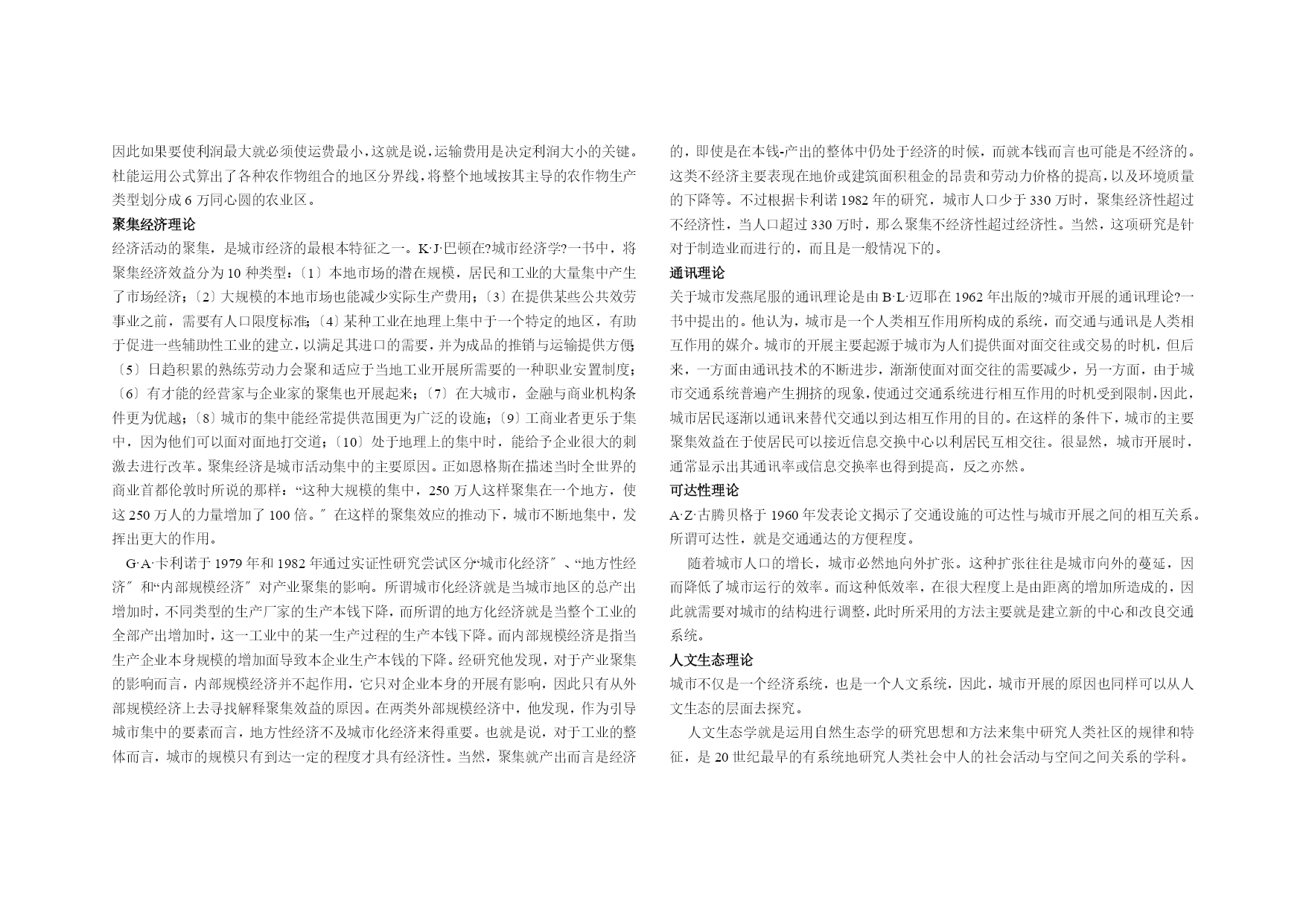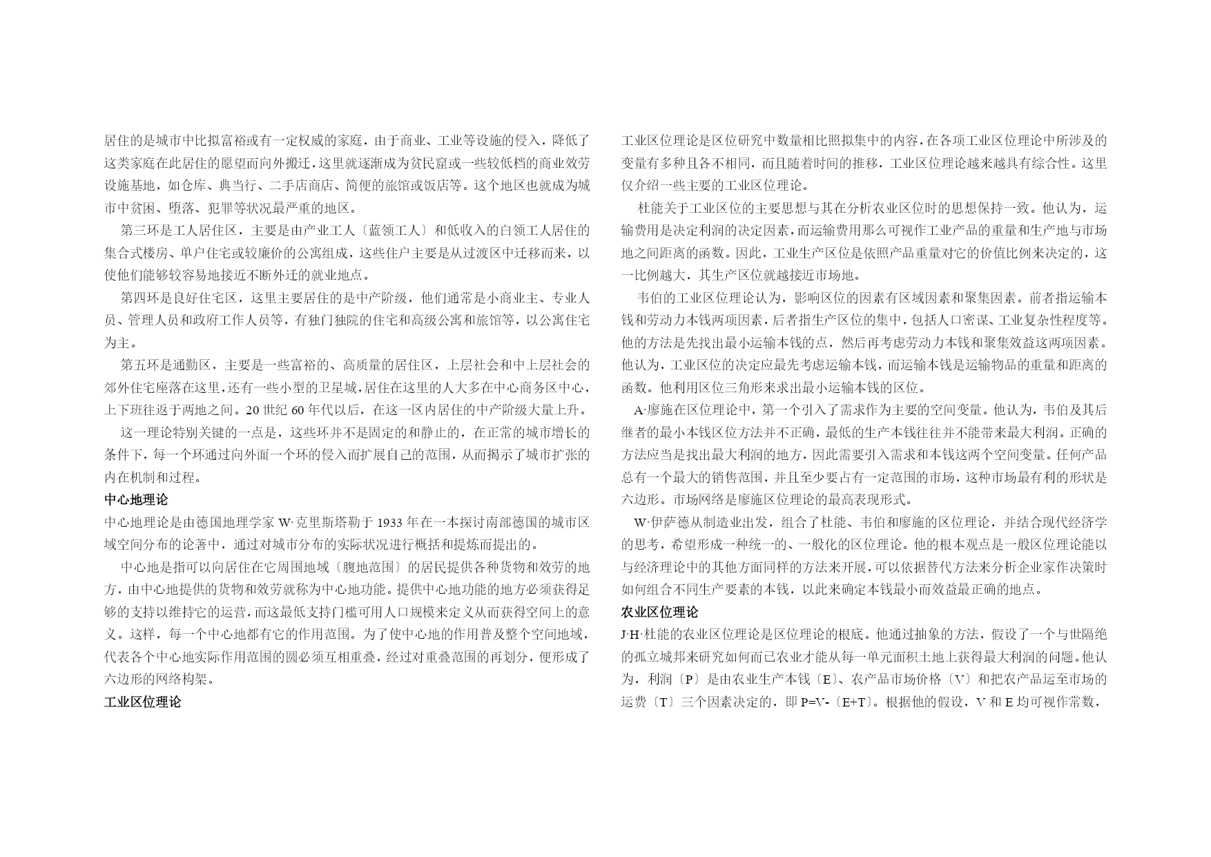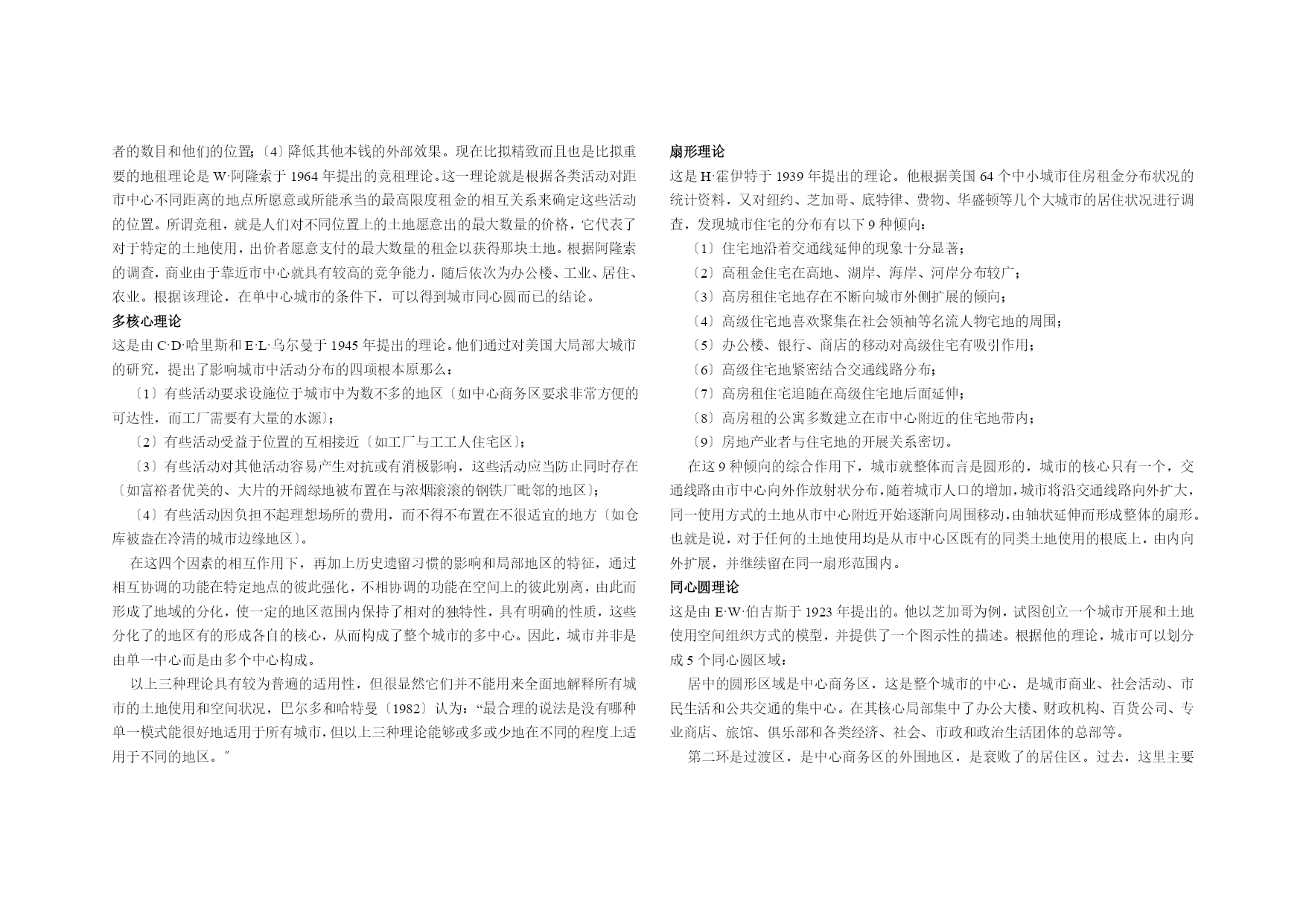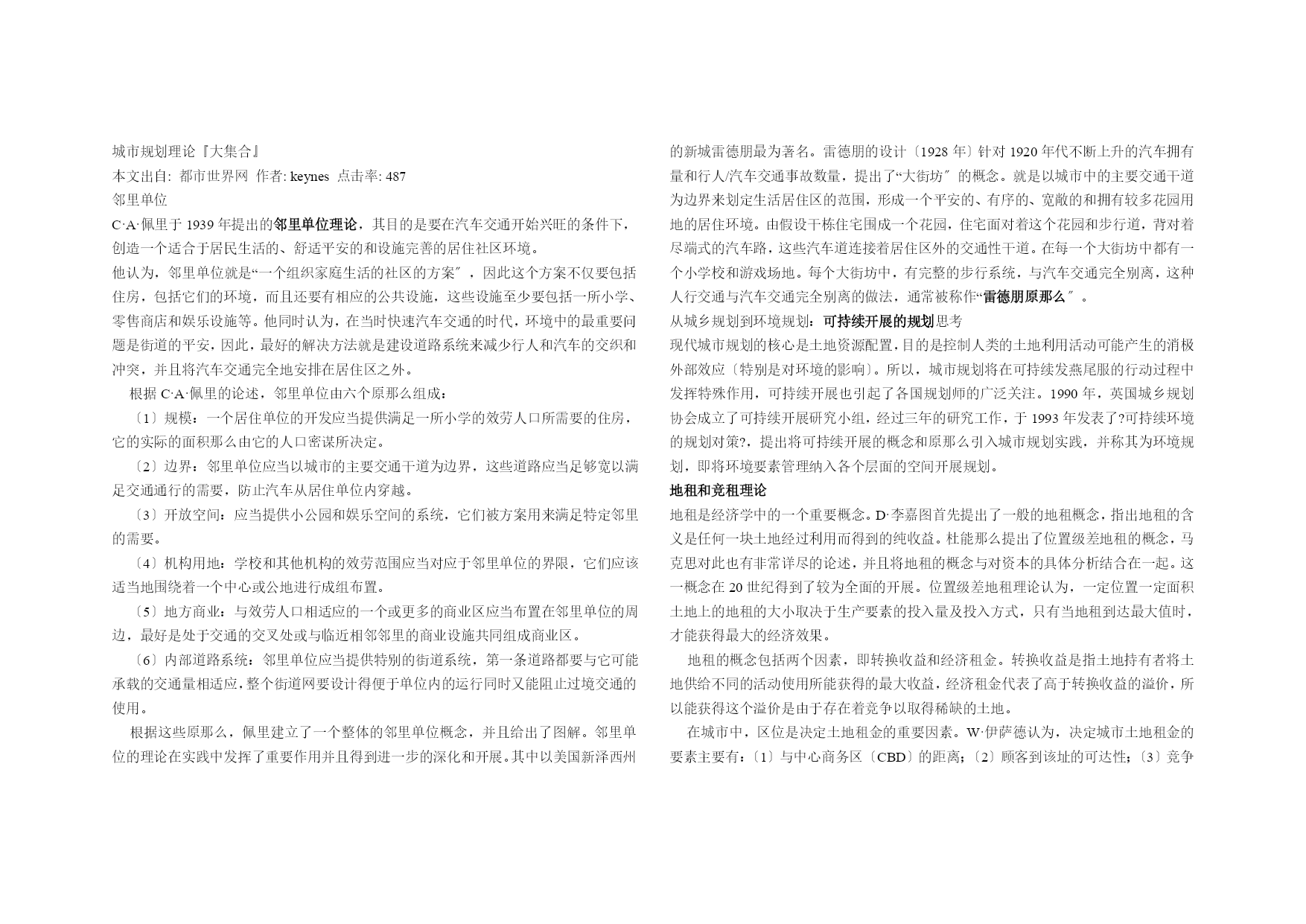 城市规划理论『大集合』[策划]【完整版】(文档可以直接使用,也可根据实际需要修订后使用,可编辑放心下载)城市规划理论『大集合』本文出自:HYPERLINK"://cityup.org/bbs/"都市世界网作者:keynes点击率:487邻里单位C·A·佩里于1939年提出的邻里单位理论,其目的是要在汽车交通开始兴旺的条件下,创造一个适合于居民生活的、舒适平安的和设施完善的居住社区环境。他认为,邻里单位就是“一个组织家庭生活的社区的方案〞,因此这个方案不仅要包括住房,包括它们的环境,而且还要有相应的公共设施,这些设施至少要包括一所小学、零售商店和娱乐设施等。他同时认为,在当时快速汽车交通的时代,环境中的最重要问题是街道的平安,因此,最好的解决方法就是建设道路系统来减少行人和汽车的交织和冲突,并且将汽车交通完全地安排在居住区之外。根据C·A·佩里的论述,邻里单位由六个原那么组成:〔1〕规模:一个居住单位的开发应当提供满足一所小学的效劳人口所需要的住房,它的实际的面积那么由它的人口密谋所决定。〔2〕边界:邻里单位应当以城市的主要交通干道为边界,这些道路应当足够宽以满足交通通行的需要,防止汽车从居住单位内穿越。〔3〕开放空间:应当提供小公园和娱乐空间的系统,它们被方案用来满足特定邻里的需要。〔4〕机构用地:学校和其他机构的效劳范围应当对应于邻里单位的界限,它们应该适当地围绕着一个中心或公地进行成组布置。〔5〕地方商业:与效劳人口相适应的一个或更多的商业区应当布置在邻里单位的周边,最好是处于交通的交叉处或与临近相邻邻里的商业设施共同组成商业区。〔6〕内部道路系统:邻里单位应当提供特别的街道系统,第一条道路都要与它可能承载的交通量相适应,整个街道网要设计得便于单位内的运行同时又能阻止过境交通的使用。根据这些原那么,佩里建立了一个整体的邻里单位概念,并且给出了图解。邻里单位的理论在实践中发挥了重要作用并且得到进一步的深化和开展。其中以美国新泽西州的新城雷德朋最为著名。雷德朋的设计〔1928年〕针对1920年代不断上升的汽车拥有量和行人/汽车交通事故数量,提出了“大街坊〞的概念。就是以城市中的主要交通干道为边界来划定生活居住区的范围,形成一个平安的、有序的、宽敞的和拥有较多花园用地的居住环境。由假设干栋住宅围成一个花园,住宅面对着这个花园和步行道,背对着尽端式的汽车路,这些汽车道连接着居住区外的交通性干道。在每一个大街坊中都有一个小学校和游戏场地。每个大街坊中,有完整的步行系统,与汽车交通完全别离,这种人行交通与汽车交通完全别离的做法,通常被称作“雷德朋原那么〞。从城乡规划到环境规划:可持续开展的规划思考现代城市规划的核心是土地资源配置,目的是控制人类的土地利用活动可能产生的消极外部效应〔特别是对环境的影响〕。所以,城市规划将在可持续发燕尾服的行动过程中发挥特殊作用,可持续开展也引起了各国规划师的广泛关注。1990年,英国城乡规划协会成立了可持续开展研究小组,经过三年的研究工作,于1993年发表了?可持续环境的规划对策?,提出将可持续开展的概念和原那么引入城市规划实践,并称其为环境规划,即将环境要素管理纳入各个层面的空间开展规划。地租和竞租理论地租是经济学中的一个重要概念。D·李嘉图首先提出了一般的地租概念,指出地租的含义是任何一块土地经过利用而得到的纯收益。杜能那么提出了位置级差地租的概念,马克思对此也有非常详尽的论述,并且将地租的概念与对资本的具体分析结合在一起。这一概念在20世纪得到了较为全面的开展。位置级差地租理论认为,一定位置一定面积土地上的地租的大小取决于生产要素的投入量及投入方式,只有当地租到达最大值时,才能获得最大的经济效果。地租的概念包括两个因素,即转换收益和经济租金。转换收益是指土地持有者将土地供给不同的活动使用所能获得的最大收益,经济租金代表了高于转换收益的溢价,所以能获得这个溢价是由于存在着竞争以取得稀缺的土地。在城市中,区位是决定土地租金的重要因素。W·伊萨德认为,决定城市土地租金的要素主要有:〔1〕与中心商务区〔CBD〕的距离;〔2〕顾客到该址的可达性;〔3〕竞争者的数目和他们的位置;〔4〕降低其他本钱的外部效果。现在比拟精致而且也是比拟重要的地租理论是W·阿隆索于1964年提出的竞租理论。这一理论就是根据各类活动对距市中心不同距离的地点所愿意或所能承当的最高限度租金的相互关系来确定这些活动的位置。所谓竞租,就是人们对不同位置上的土地愿意出的最大数量的价格,它代表了对于特定的土地使用,出价者愿意支付的最大数量的租金以获得那块土地。根据阿隆索的调查,商业由于靠近市中心就具有较高的竞争能力,随后依次为办公楼、工业、居住、农业。根据该理论,在单中心城市的条件下,可以得到城市同心圆而已的结论。多核心理论