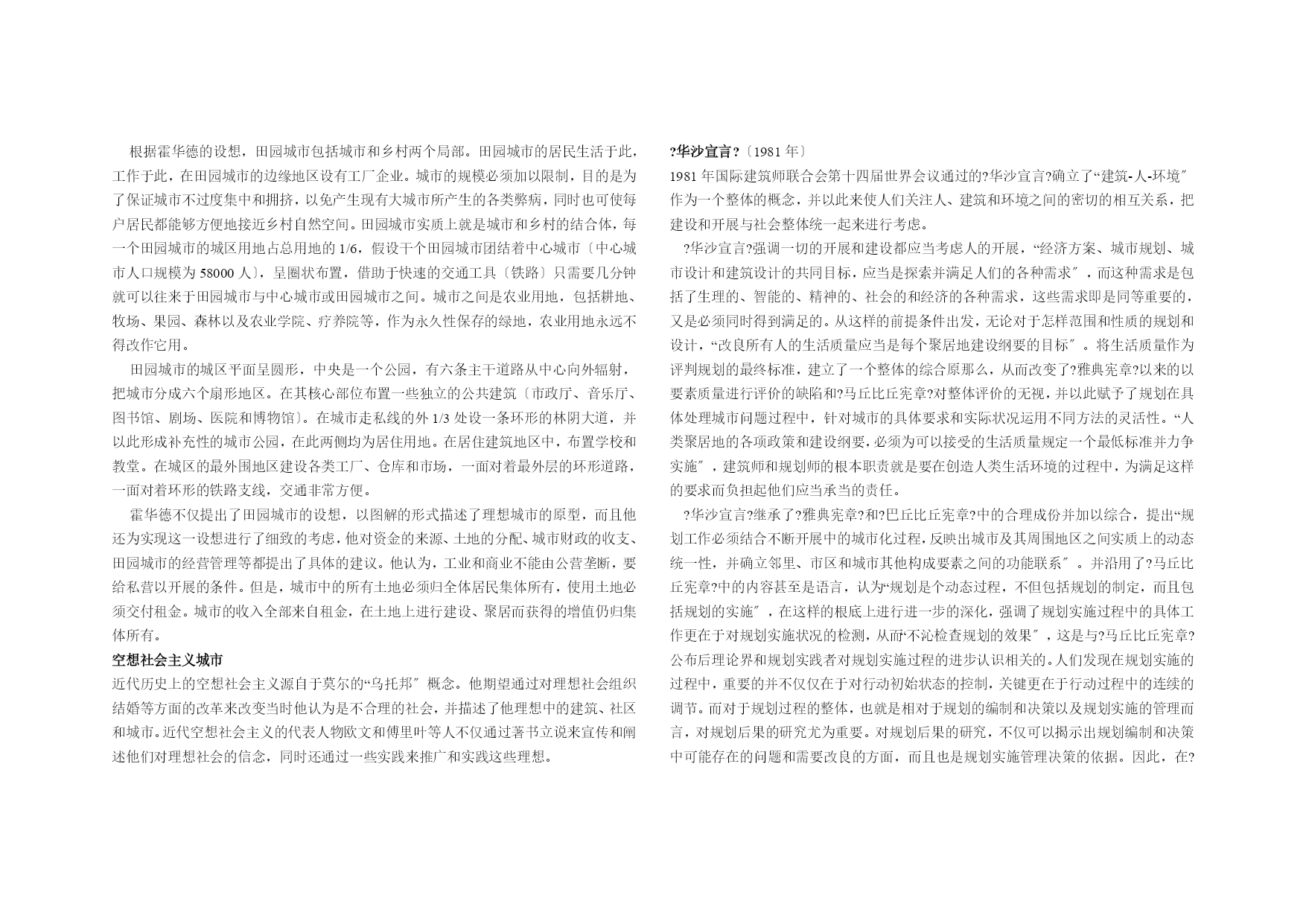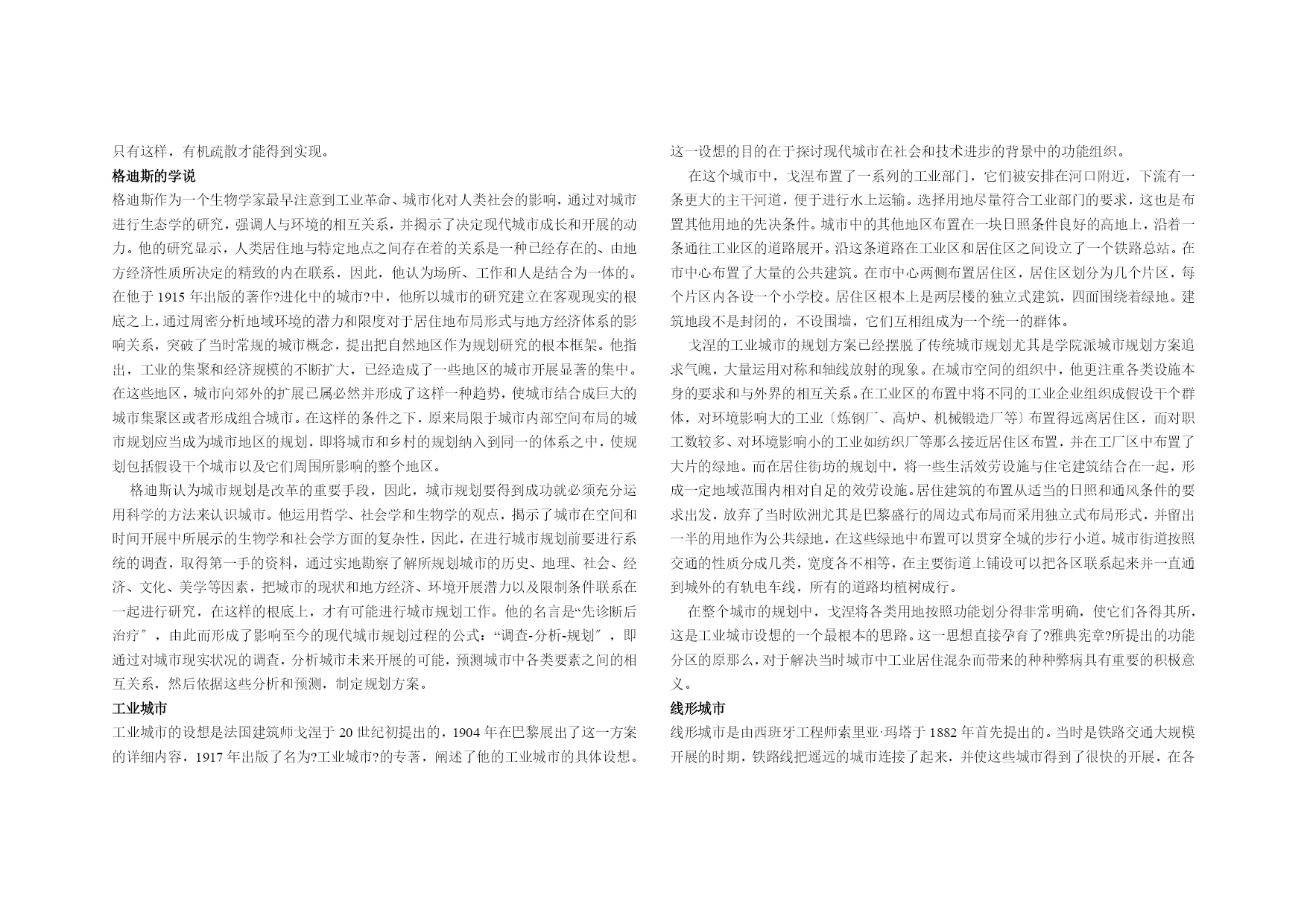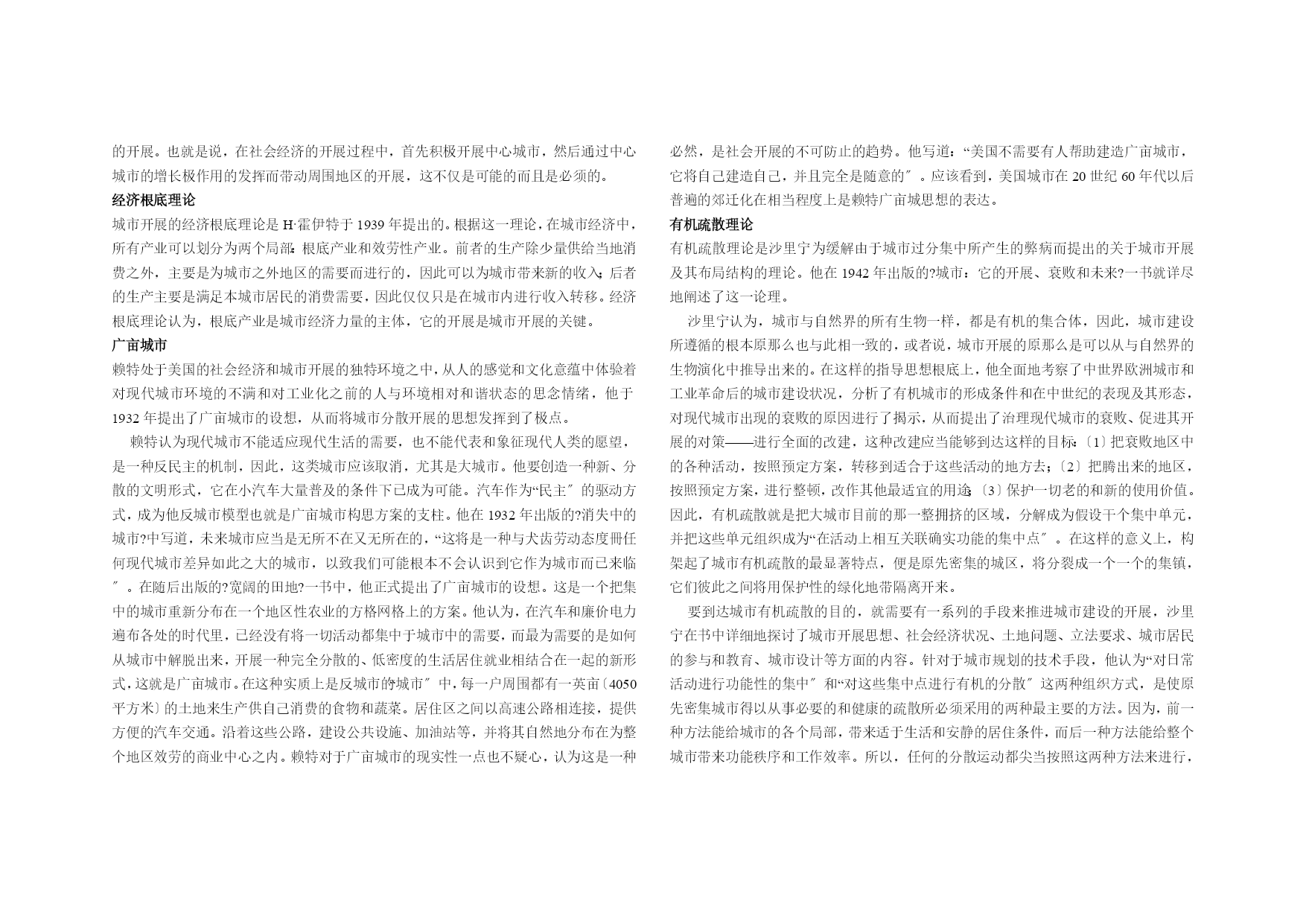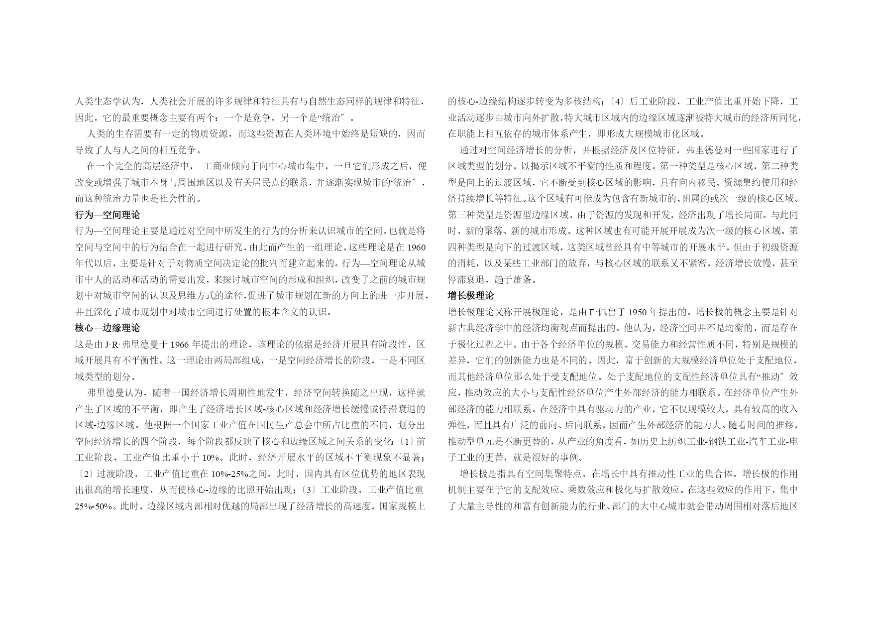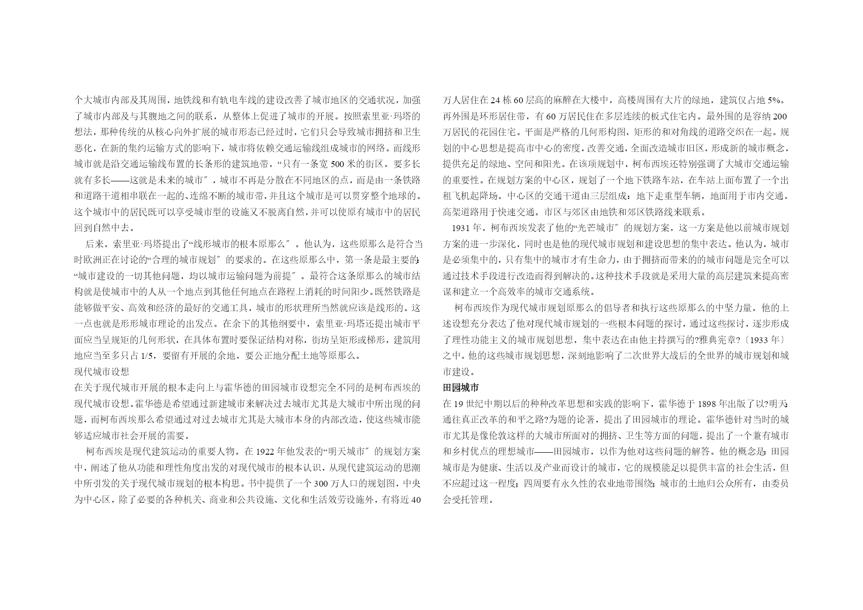 城市规划理论『大集合』[策划]【完整版】(文档可以直接使用,也可根据实际需要修订后使用,可编辑放心下载)城市规划理论『大集合』本文出自:HYPERLINK"://cityup.org/bbs/"都市世界网作者:keynes点击率:487邻里单位C·A·佩里于1939年提出的邻里单位理论,其目的是要在汽车交通开始兴旺的条件下,创造一个适合于居民生活的、舒适平安的和设施完善的居住社区环境。他认为,邻里单位就是“一个组织家庭生活的社区的方案〞,因此这个方案不仅要包括住房,包括它们的环境,而且还要有相应的公共设施,这些设施至少要包括一所小学、零售商店和娱乐设施等。他同时认为,在当时快速汽车交通的时代,环境中的最重要问题是街道的平安,因此,最好的解决方法就是建设道路系统来减少行人和汽车的交织和冲突,并且将汽车交通完全地安排在居住区之外。根据C·A·佩里的论述,邻里单位由六个原那么组成:〔1〕规模:一个居住单位的开发应当提供满足一所小学的效劳人口所需要的住房,它的实际的面积那么由它的人口密谋所决定。〔2〕边界:邻里单位应当以城市的主要交通干道为边界,这些道路应当足够宽以满足交通通行的需要,防止汽车从居住单位内穿越。〔3〕开放空间:应当提供小公园和娱乐空间的系统,它们被方案用来满足特定邻里的需要。〔4〕机构用地:学校和其他机构的效劳范围应当对应于邻里单位的界限,它们应该适当地围绕着一个中心或公地进行成组布置。〔5〕地方商业:与效劳人口相适应的一个或更多的商业区应当布置在邻里单位的周边,最好是处于交通的交叉处或与临近相邻邻里的商业设施共同组成商业区。〔6〕内部道路系统:邻里单位应当提供特别的街道系统,第一条道路都要与它可能承载的交通量相适应,整个街道网要设计得便于单位内的运行同时又能阻止过境交通的使用。根据这些原那么,佩里建立了一个整体的邻里单位概念,并且给出了图解。邻里单位的理论在实践中发挥了重要作用并且得到进一步的深化和开展。其中以美国新泽西州的新城雷德朋最为著名。雷德朋的设计〔1928年〕针对1920年代不断上升的汽车拥有量和行人/汽车交通事故数量,提出了“大街坊〞的概念。就是以城市中的主要交通干道为边界来划定生活居住区的范围,形成一个平安的、有序的、宽敞的和拥有较多花园用地的居住环境。由假设干栋住宅围成一个花园,住宅面对着这个花园和步行道,背对着尽端式的汽车路,这些汽车道连接着居住区外的交通性干道。在每一个大街坊中都有一个小学校和游戏场地。每个大街坊中,有完整的步行系统,与汽车交通完全别离,这种人行交通与汽车交通完全别离的做法,通常被称作“雷德朋原那么〞。从城乡规划到环境规划:可持续开展的规划思考现代城市规划的核心是土地资源配置,目的是控制人类的土地利用活动可能产生的消极外部效应〔特别是对环境的影响〕。所以,城市规划将在可持续发燕尾服的行动过程中发挥特殊作用,可持续开展也引起了各国规划师的广泛关注。1990年,英国城乡规划协会成立了可持续开展研究小组,经过三年的研究工作,于1993年发表了?可持续环境的规划对策?,提出将可持续开展的概念和原那么引入城市规划实践,并称其为环境规划,即将环境要素管理纳入各个层面的空间开展规划。地租和竞租理论地租是经济学中的一个重要概念。D·李嘉图首先提出了一般的地租概念,指出地租的含义是任何一块土地经过利用而得到的纯收益。杜能那么提出了位置级差地租的概念,马克思对此也有非常详尽的论述,并且将地租的概念与对资本的具体分析结合在一起。这一概念在20世纪得到了较为全面的开展。位置级差地租理论认为,一定位置一定面积土地上的地租的大小取决于生产要素的投入量及投入方式,只有当地租到达最大值时,才能获得最大的经济效果。地租的概念包括两个因素,即转换收益和经济租金。转换收益是指土地持有者将土地供给不同的活动使用所能获得的最大收益,经济租金代表了高于转换收益的溢价,所以能获得这个溢价是由于存在着竞争以取得稀缺的土地。在城市中,区位是决定土地租金的重要因素。W·伊萨德认为,决定城市土地租金的要素主要有:〔1〕与中心商务区〔CBD〕的距离;〔2〕顾客到该址的可达性;〔3〕竞争者的数目和他们的位置;〔4〕降低其他本钱的外部效果。现在比拟精致而且也是比拟重要的地租理论是W·阿隆索于1964年提出的竞租理论。这一理论就是根据各类活动对距市中心不同距离的地点所愿意或所能承当的最高限度租金的相互关系来确定这些活动的位置。所谓竞租,就是人们对不同位置上的土地愿意出的最大数量的价格,它代表了对于特定的土地使用,出价者愿意支付的最大数量的租金以获得那块土地。根据阿隆索的调查,商业由于靠近市中心就具有较高的竞争能力,随后依次为办公楼、工业、居住、农业。根据该理论,在单中心城市的条件下,可以得到城市同心圆而已的结论。多核心理论