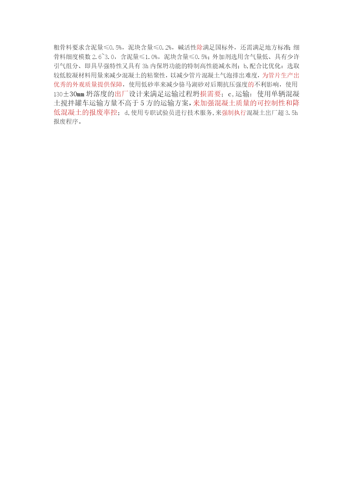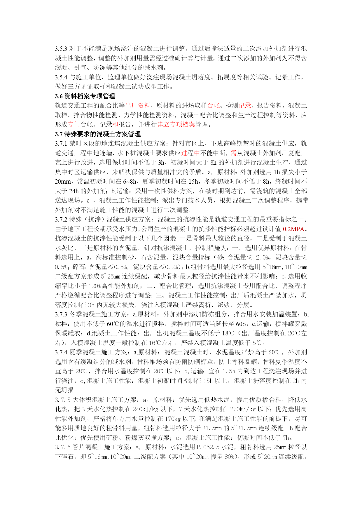 轨道交通工程专用商砼质量控制措施0.总则:加强城市轨道交通工程管理,打造企业做精做强品格。1.适用范围:**市轨道交通工程1#、2#线各施工项目的商品混凝土生产质量控制全过程。2.控制原则:根据轨道交通工程的不同标段、不同浇注部位、不同施工季节、不同混凝土施工工艺要求,执行原材料采购、配合比管理、原材料进场、搅拌、运输、质量管理、服务跟踪和资料记录整理专项方案。3.控制要求:3.1原材料的选择与采购根据轨道交通工程的特殊要求,从混凝土原材料供应商的选择,到原材料采购的要求,到原材料采购过程,遵循优中选优的原则,来保障轨道交通工程混凝土的质量得到有效控制。3.1.1合格供应商的确定:混凝土原材料的供应商严格执行合格供应商评价程序,优先选用具有较大的生产、供应能力、产品质量能满足轨道交通工程标准的要求,并经过质量体系认证的供应商。3.1.2原材料的采购:优中选优,提前采购,保证库存,确保连续生产不断供。3.1.3原材料采购的要求:A胶凝材料:水泥:优先选用低碱、低水化热、旋窑或者新型干法窑生产的符合《通用硅酸盐水泥》GB175的普通硅酸盐水泥,比表面积小于350㎡/kg;矿粉:符合S95级标准;粉煤灰:符合F类Ⅰ级灰标准。B骨料:粗骨料采取5~25mm连续级配的低碱活性碎石,针片状颗粒小于5.0%,含泥量≤0.5%,泥块含量≤0.2%,碱活性除满足国标外,还需满足地方标准DBJ01-95《预防混凝土结构工程碱集料反应规程》;细骨料细度模数2.6~3.0,含泥量≤2.0%,泥块含量≤0.5%;其他指标均需符合《HYPERLINK"http://qr.wxrmc.com:14903/viewthread.php?tid=196&highlight=52"\t"_blank"普通混凝土用砂、石质量及检验方法标准》JGJ52-2006要求。C外加剂:优先使用高性能减水剂,外加剂释放氨含量<0.1%,28天收缩率<120%。3.2配合比管理由于地铁工程的特殊性,即使混凝土等级相同,但是结构部位的不同,配合比设计和要求也不相同,配合比的管理和使用必须有更严更高的标准和要求。3.2.1配合比的设计与验证:轨道交通工程的配合比如业主单位统一设计时,由业主单位设计与验证;如无统一设计时,本公司组织技术团队按照《普通混凝土配合比设计规程》JGJ55-2011和《混凝土耐久性设计规范》进行设计,并送具有检测资质的单位进行验证,然后报施工单位和监理批准后使用。3.2.2所有投入我公司生产线的配合比(含施工方提供的配合比),必须先经试验室进行试配验证合格后方可投入生产使用,配合比在使用前须做开盘鉴定并记录。3.2.2施工配合比的选择与使用:施工配合比根据工程的工程部位和施工季节选择施工配合比,业主单位指定施工配合比时使用指定施工配合比。3.2.3施工配合比的调整:当原材料外加剂与其他材料适应性发生变化、以及砂的细度模数和碎石连续级配发生变化时,质量控制员必须报告试验室主任与监理单位,经试验室主任批准后可进行微调。3.3生产设施管理与生产组织3.3.1轨道交通工程实行专用生产线专线供应。专线生产含原材料使用专用仓储设施,搅拌设备使用专用线设备,并进行专门维护和保养记录。3.3.2原材料进场管理。原材料实行专库存储,各原材料库须有专用标识。原材料进场时,供应商应提供合格文件(质保书),并按检验程序进行报检,检验合格后方可入库。原材料检测、入库管理实行专人专岗管理;水泥、矿粉、粉煤灰应按不同厂家、规格分批由专人专岗检测验收进专用库,入库水泥须是符合GB175《硅酸盐水泥、普通硅酸盐水泥》要求的普通硅酸盐水泥,水泥比表面积<350㎡/kg,受潮板结和过期水泥严禁入库和使用,混凝土拌合时,水泥温度高于60℃时严禁使用;外加剂根据不同品种、厂家经验收后进入专库管理,外加剂减水率不得低于26%,28天收缩率比不得大于120%,外加剂释放氨含量<0.1%,外加剂氯离子和碱含量符合徐州轨道交通工程要求,外加剂使用过程中不得出现假凝、速凝、分层或离析现象;砂、石应按不同规格、品种堆放进专用仓库,不得混放和混入杂物,堆放的专用仓库必须有遮雨设施,粗骨料采取5~16mm、10~20mm、16~31.5mm三个规格单级配碎石分别存储,使用时按照5~25mm、5~31.5mm分别调整;各规格碎石针片状颗粒均须小于5.0%,含泥量≤0.5%,泥块含量≤0.2%,碱活性满足除国标外,还需满足地方标准;细骨料细度模数2.6~3.0,含泥量≤2.0%,泥块含量≤0.5%;其他指标均需符合《HYPERLINK"http://qr.wxrmc.com:14903/viewthread.php?tid=196&highlight=52"\t"_