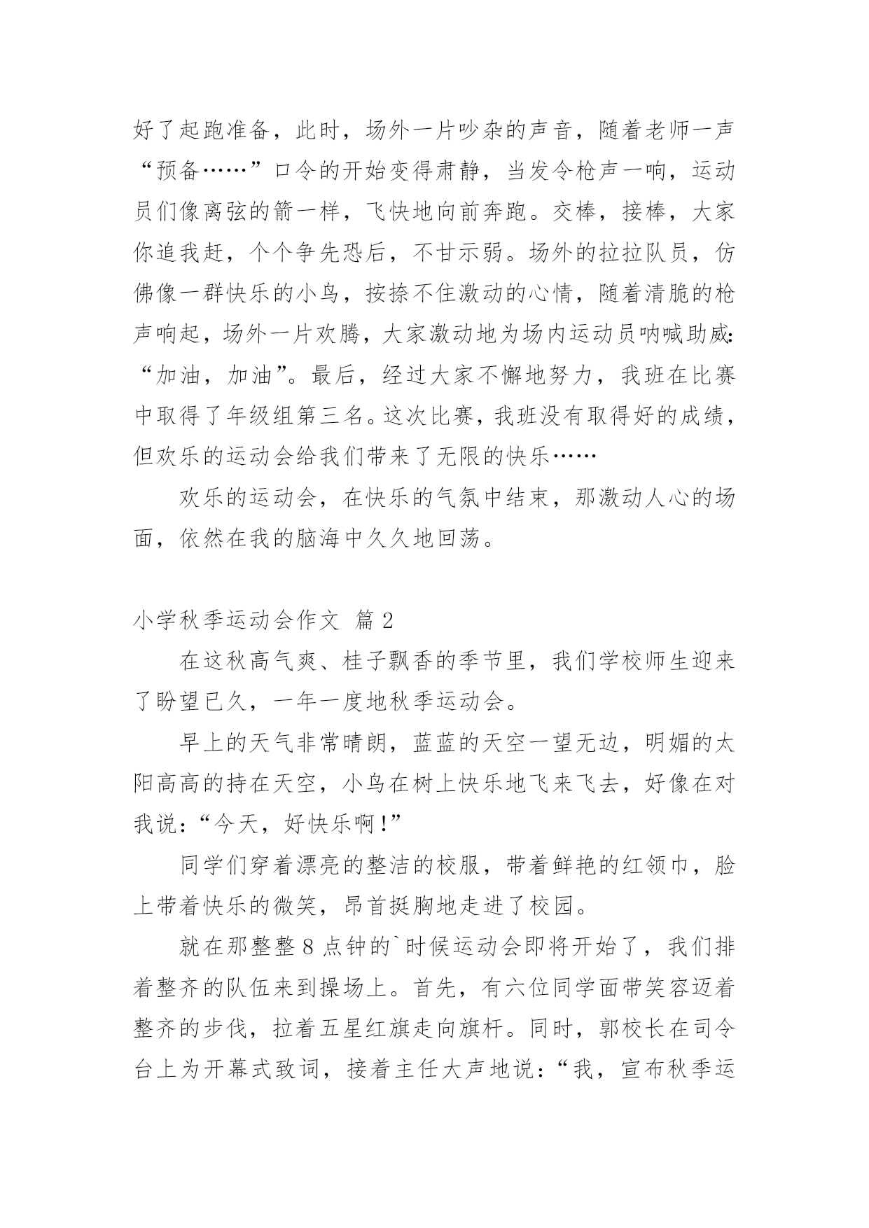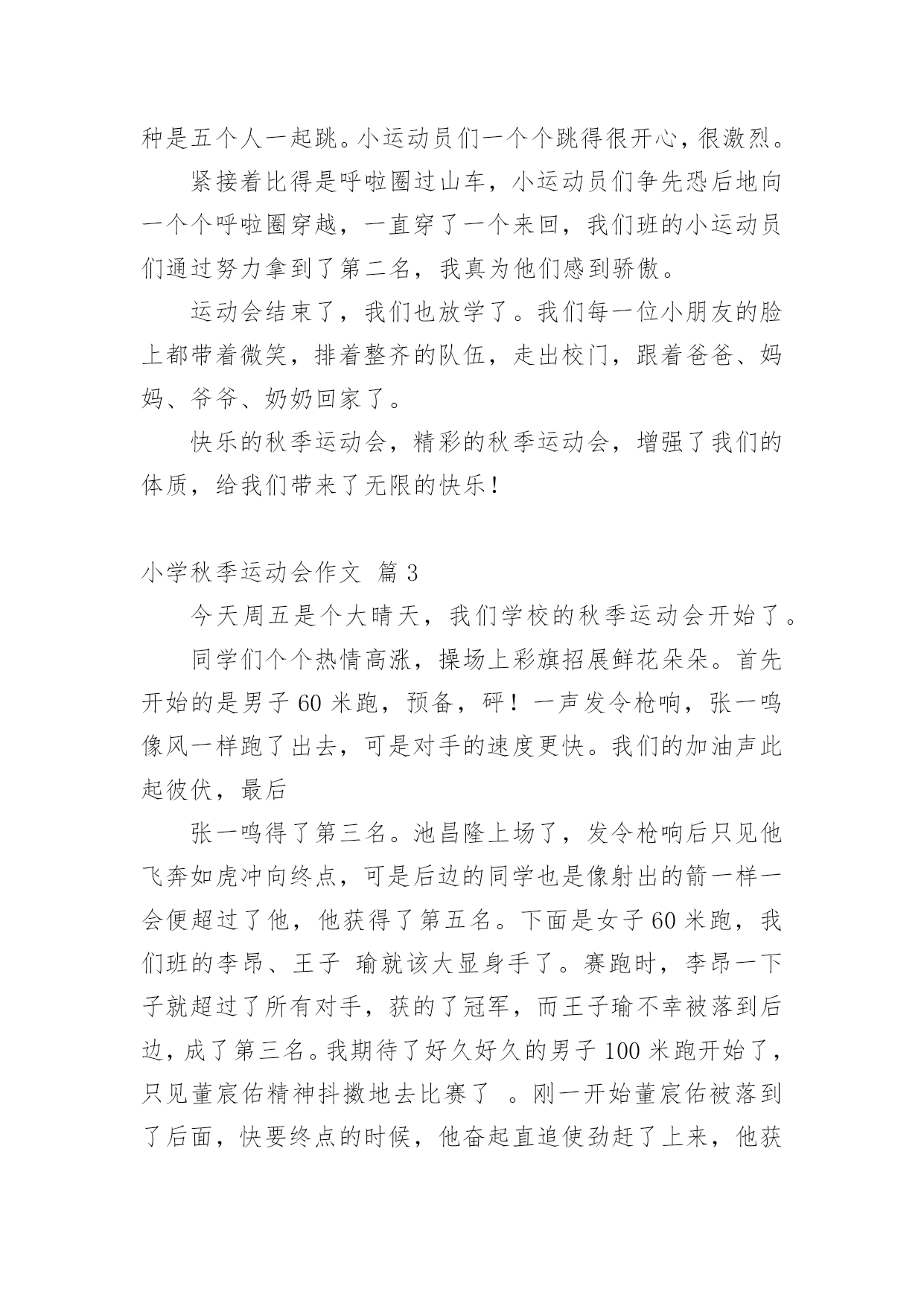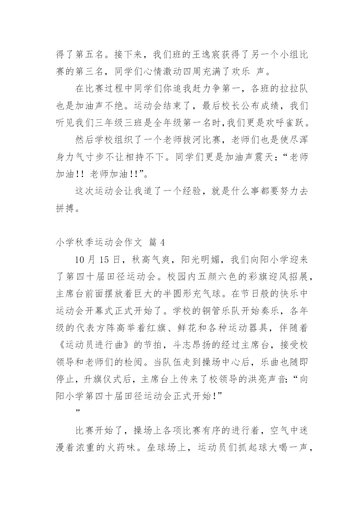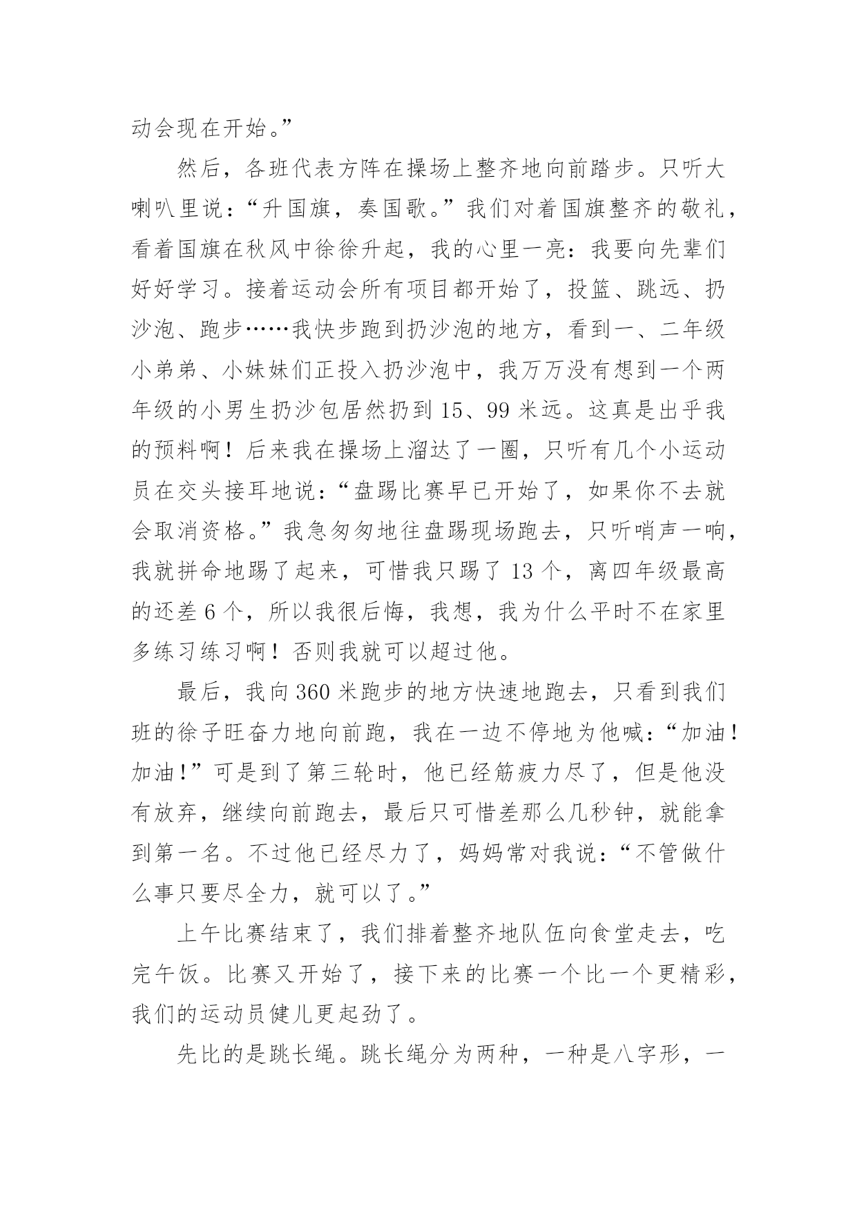 小学秋季运动会作文在学习、工作乃至生活中,大家都跟作文打过交道吧,作文是通过文字来表达一个主题意义的记叙方法。为了让您在写作文时更加简单方便,下面是小编为大家收集的小学秋季运动会作文4篇,仅供参考,大家一起来看看吧。小学秋季运动会作文篇1秋高送爽,丹桂飘香,在这美丽的季节里,我校师生迎来了翘首盼望已久的一年一度校秋季运动会。同学们穿着整洁的校服,脸上带着童趣的笑脸,快乐地来到操场,以年级为单位整齐地围坐在操场旁,静静地等待运动会的召开。在无边的天际,蔚蓝的天空飘着朵朵白云,金色的太阳此时躲在云层里,仿佛像一位羞涩的淑女,温柔而矜持,不愿露出其峥嵘。凉爽的秋风不时地习习吹拂着我们的颜面,运动会的召开,让我们丝毫没有感觉到秋风的凉意,此时,我们的心情随着运动会的开始而兴奋。运动会开始,首先是运动员入场。运动员穿着整洁的服装,伴随着运动员进行曲,他们迈着有力而整齐的步伐,喊着响亮的口号,步入会场……运动会开始后,运动员个个精神抖擞,生龙活虎地活跃在运动场上。比赛开始,有跳远、举哑铃、百米短跑等比赛,但最激动人心,也是最引人注目的项目是接力赛。我班选派了多名男、女生参加比赛,接力赛开始后,第一棒运动员做好了起跑准备,此时,场外一片吵杂的声音,随着老师一声“预备……”口令的开始变得肃静,当发令枪声一响,运动员们像离弦的箭一样,飞快地向前奔跑。交棒,接棒,大家你追我赶,个个争先恐后,不甘示弱。场外的拉拉队员,仿佛像一群快乐的小鸟,按捺不住激动的心情,随着清脆的枪声响起,场外一片欢腾,大家激动地为场内运动员呐喊助威:“加油,加油”。最后,经过大家不懈地努力,我班在比赛中取得了年级组第三名。这次比赛,我班没有取得好的成绩,但欢乐的运动会给我们带来了无限的快乐……欢乐的运动会,在快乐的气氛中结束,那激动人心的场面,依然在我的脑海中久久地回荡。小学秋季运动会作文篇2在这秋高气爽、桂子飘香的季节里,我们学校师生迎来了盼望已久,一年一度地秋季运动会。早上的天气非常晴朗,蓝蓝的天空一望无边,明媚的太阳高高的持在天空,小鸟在树上快乐地飞来飞去,好像在对我说:“今天,好快乐啊!”同学们穿着漂亮的整洁的校服,带着鲜艳的红领巾,脸上带着快乐的微笑,昂首挺胸地走进了校园。就在那整整8点钟的`时候运动会即将开始了,我们排着整齐的队伍来到操场上。首先,有六位同学面带笑容迈着整齐的步伐,拉着五星红旗走向旗杆。同时,郭校长在司令台上为开幕式致词,接着主任大声地说:“我,宣布秋季运动会现在开始。”然后,各班代表方阵在操场上整齐地向前踏步。只听大喇叭里说:“升国旗,奏国歌。”我们对着国旗整齐的敬礼,看着国旗在秋风中徐徐升起,我的心里一亮:我要向先辈们好好学习。接着运动会所有项目都开始了,投篮、跳远、扔沙泡、跑步……我快步跑到扔沙泡的地方,看到一、二年级小弟弟、小妹妹们正投入扔沙泡中,我万万没有想到一个两年级的小男生扔沙包居然扔到15、99米远。这真是出乎我的预料啊!后来我在操场上溜达了一圈,只听有几个小运动员在交头接耳地说:“盘踢比赛早已开始了,如果你不去就会取消资格。”我急匆匆地往盘踢现场跑去,只听哨声一响,我就拼命地踢了起来,可惜我只踢了13个,离四年级最高的还差6个,所以我很后悔,我想,我为什么平时不在家里多练习练习啊!否则我就可以超过他。最后,我向360米跑步的地方快速地跑去,只看到我们班的徐子旺奋力地向前跑,我在一边不停地为他喊:“加油!加油!”可是到了第三轮时,他已经筋疲力尽了,但是他没有放弃,继续向前跑去,最后只可惜差那么几秒钟,就能拿到第一名。不过他已经尽力了,妈妈常对我说:“不管做什么事只要尽全力,就可以了。”上午比赛结束了,我们排着整齐地队伍向食堂走去,吃完午饭。比赛又开始了,接下来的比赛一个比一个更精彩,我们的运动员健儿更起劲了。先比的是跳长绳。跳长绳分为两种,一种是八字形,一种是五个人一起跳。小运动员们一个个跳得很开心,很激烈。紧接着比得是呼啦圈过山车,小运动员们争先恐后地向一个个呼啦圈穿越,一直穿了一个来回,我们班的小运动员们通过努力拿到了第二名,我真为他们感到骄傲。运动会结束了,我们也放学了。我们每一位小朋友的脸上都带着微笑,排着整齐的队伍,走出校门,跟着爸爸、妈妈、爷爷、奶奶回家了。快乐的秋季运动会,精彩的秋季运动会,增强了我们的体质,给我们带来了无限的快乐!小学秋季运动会作文篇3今天周五是个大晴天,我们学校的秋季运动会开始了。同学们个个热情高涨,操场上彩旗招展鲜花朵朵。首先开始的是男子60米跑,预备,砰!一声发令枪响,张一鸣像风一样跑了出去,可是对手的速度更快。我们的加油声此起彼伏,最后张一鸣得了第三名。池昌隆上场了,发令枪响后只见他飞奔如虎冲向终点,可是后边的同学也是像射出的箭一样一会便超过了他,他获得了第五名。下面是女子60米跑,我们