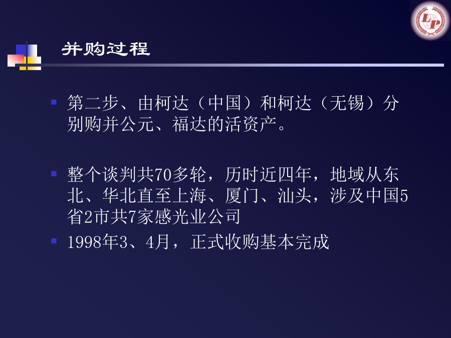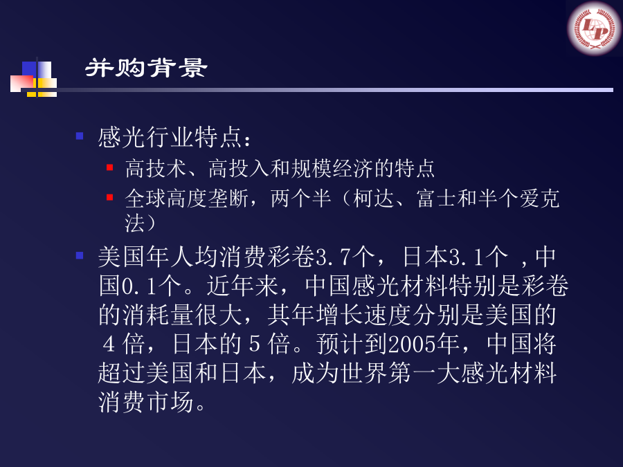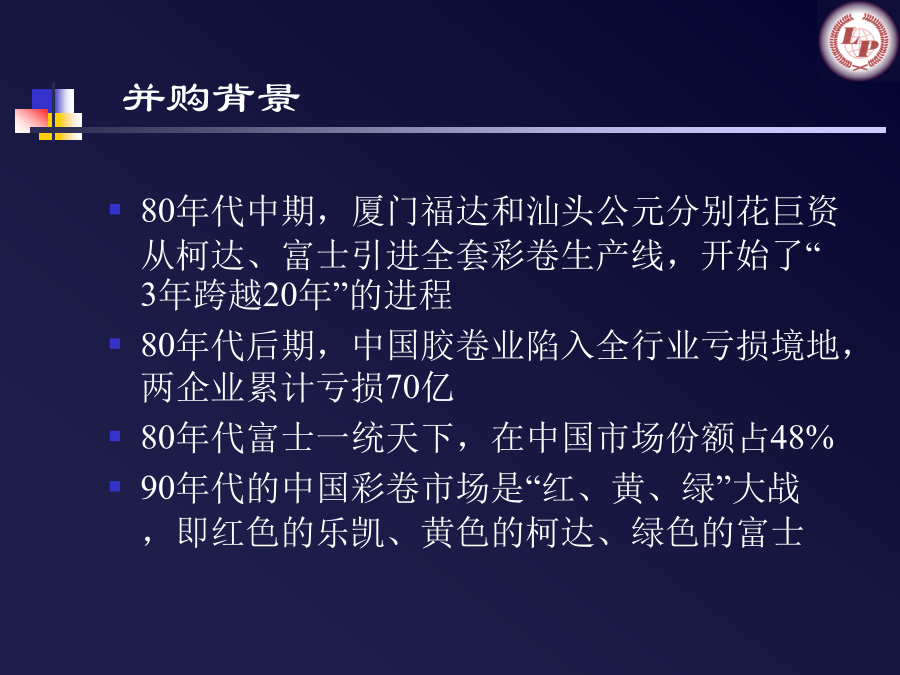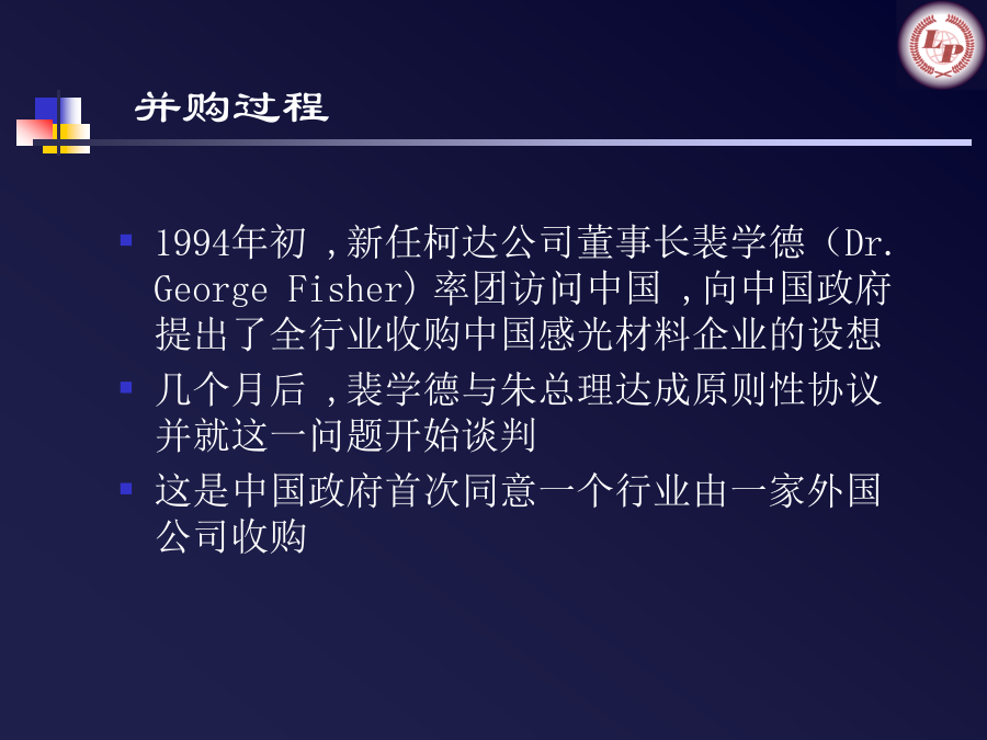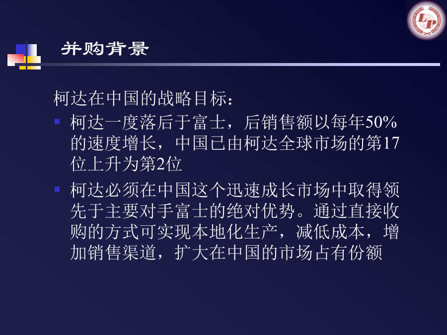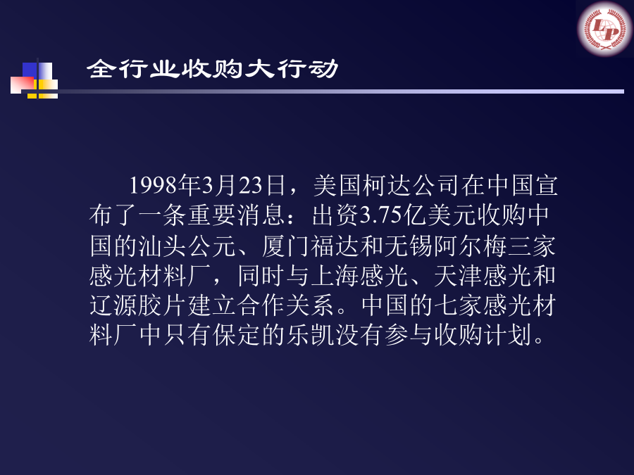 柯达国内感光行业收购案全行业收购大行动并购背景并购背景并购背景并购过程并购过程并购过程并购涉及的主要问题并购结局并购结局“柯达模式”分析与启示“柯达模式”分析与启示“柯达模式”分析与启示“柯达模式”分析与启示“柯达模式”分析与启示并购形式并购形式并购发展史并购发展史并购发展史中国吸引外资模式的改变中国吸引外资模式的改变深化对跨国并购的认识并购的生命力并购在亚洲的发展潜力加入WTO,为中国企业带来一场真正的经济机遇国内企业应该以自身在市场开拓、品牌建设方面的优势与国外集团强强联合,充分利用跨国并购这一资本运作形式迅速增强自身竞争能力专业机构操作并购的程序并购网站