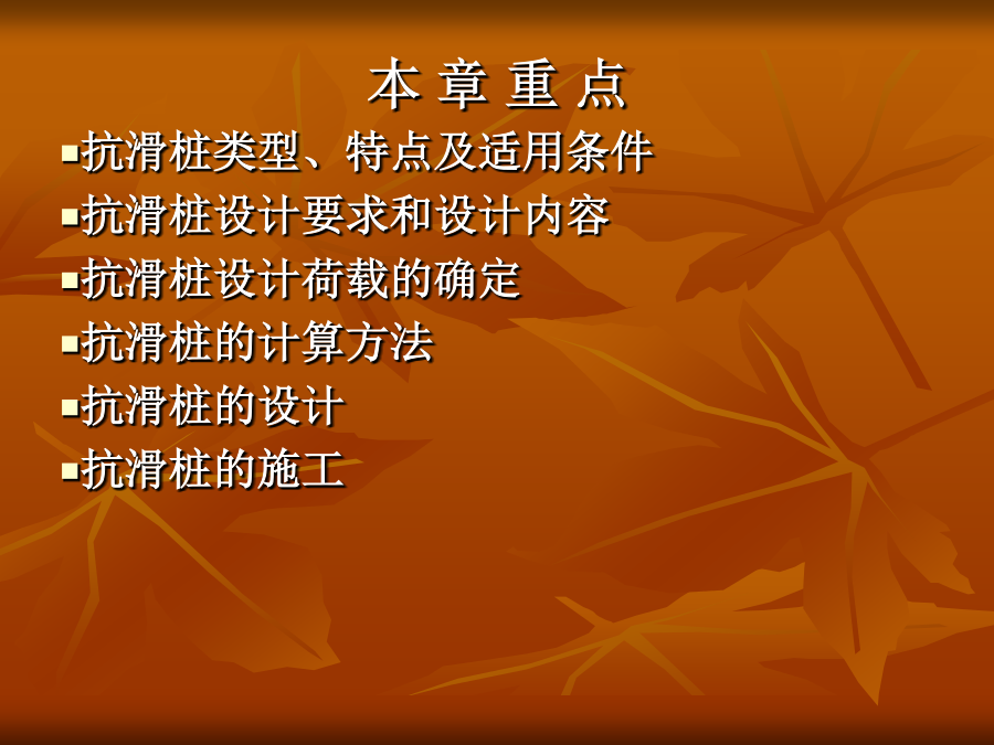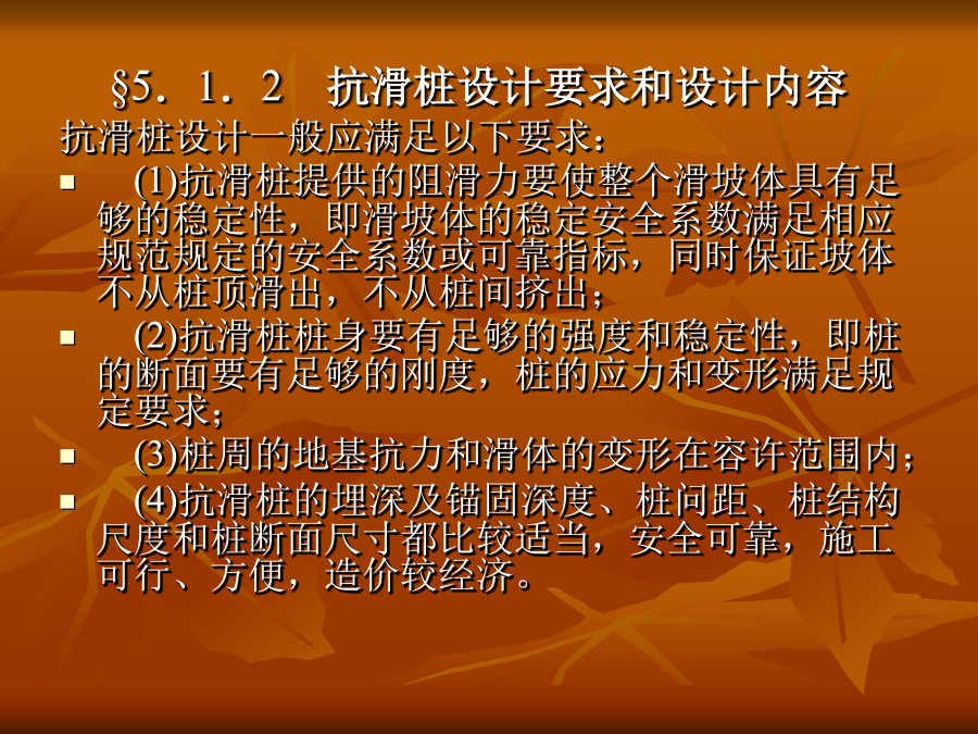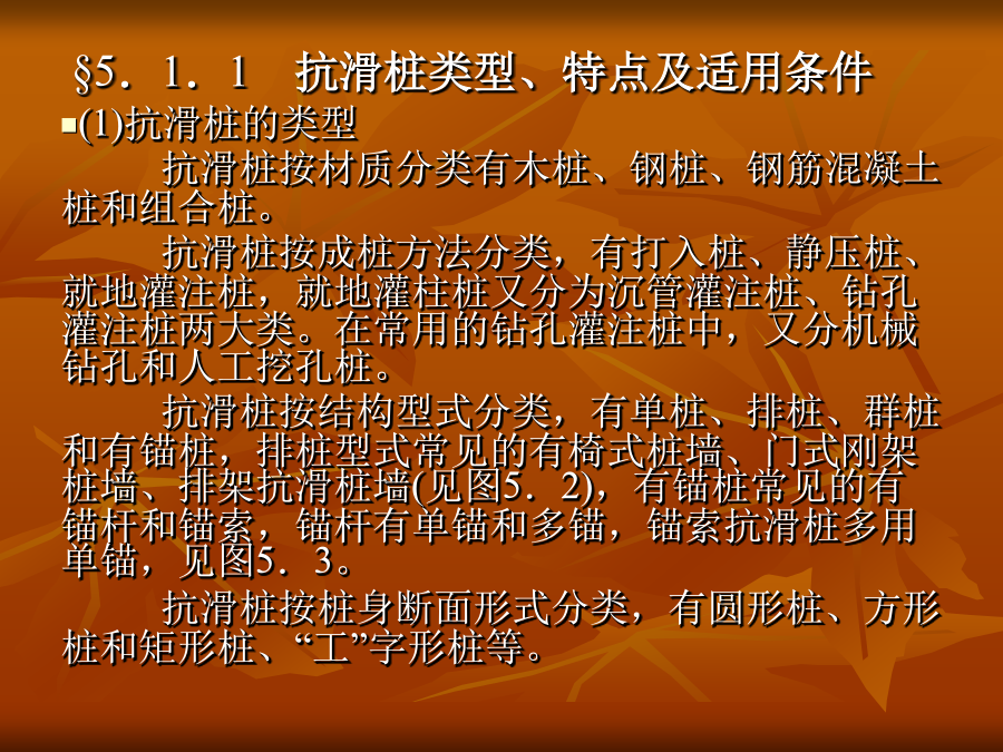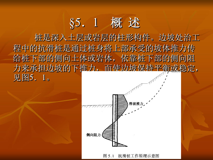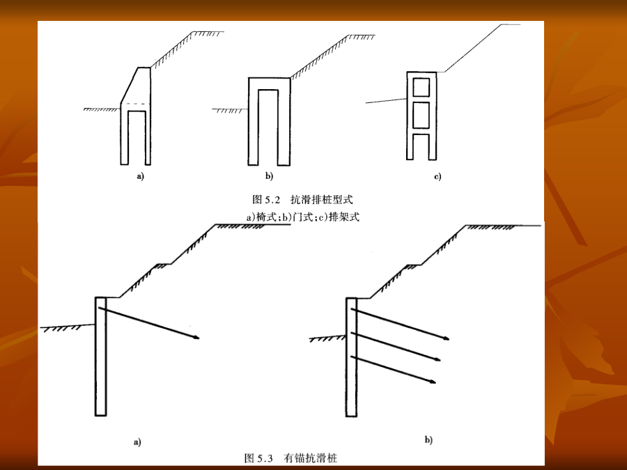第5章抗滑桩的设计与施工本章重点抗滑桩类型、特点及适用条件抗滑桩设计要求和设计内容抗滑桩设计荷载的确定抗滑桩的计算方法抗滑桩的设计抗滑桩的施工§5.1概述桩是深入土层或岩层的柱形构件。边坡处治工程中的抗滑桩是通过桩身将上部承受的坡体推力传给桩下部的侧向土体或岩体,依靠桩下部的侧向阻力来承担边坡的下推力,而使边坡保持平衡或稳定,见图5.1。抗滑桩与一般桩基类似,但主要是承担水平荷载。抗滑桩也是边坡处治工程中常见常用的处治方案之一,从早期的木桩,到近代的钢桩和目前在边坡工程中常用的钢筋混凝土桩,断面型式有圆形和矩形,施工方法有打入、机械成孔和人工成孔等方法,结构型式有单桩、排桩、群桩,有锚桩和预应力锚索桩等。§5.1.1抗滑桩类型、特点及适用条件(1)抗滑桩的类型抗滑桩按材质分类有木桩、钢桩、钢筋混凝土桩和组合桩。抗滑桩按成桩方法分类,有打入桩、静压桩、就地灌注桩,就地灌柱桩又分为沉管灌注桩、钻孔灌注桩两大类。在常用的钻孔灌注桩中,又分机械钻孔和人工挖孔桩。抗滑桩按结构型式分类,有单桩、排桩、群桩和有锚桩,排桩型式常见的有椅式桩墙、门式刚架桩墙、排架抗滑桩墙(见图5.2),有锚桩常见的有锚杆和锚索,锚杆有单锚和多锚,锚索抗滑桩多用单锚,见图5.3。抗滑桩按桩身断面形式分类,有圆形桩、方形桩和矩形桩、“工”字形桩等。(2)各类桩型的特点及适用条件木桩是最早采用的桩,其特点是就地取材、方便、易于施工,但桩长有限,桩身强度不高,一般用于浅层滑坡的治理、临时工程或抢险工程。钢桩的强度高,施打容易、快速,接长方便,但受桩身断面尺寸限制,横向刚度较小,造价偏高。钢筋混凝土桩是边坡处治工程广泛采用的桩材,桩断面刚度大,抗弯能力高,施工方式多样,可打入、静压、机械钻孔就地灌注和人工成孔就地灌注,其缺点是混凝土抗拉能力有限。抗滑桩的施工采用打入时,应充分考虑施工振动对边坡稳定的影响,一般是全埋式抗滑桩或填方边坡可采用,同时下卧地层应有可打性。抗滑桩施工常用的是就地灌注桩,机械钻孔速度快,桩径可大可小,适用于各种地质条件,但对地形较陡的边坡工程,机械进入和架设困难较大,另外,钻孔时的水对边坡的稳定也有影响。人工成孔的特点是方便、简单、经济,但速度较慢,劳动强度高,遇不良地层(如流沙)时处理相当困难,另外,桩径较小时人工作业困难,桩径一般应在1000mm以上才适宜人工成孔。单桩是抗滑桩的基本型式,也是常用的结构型式,其特点是简单,受力和作用明确。当边坡的推力较大,用单桩不足以承担其推力或使用单桩不经济时,可采用排桩。排架桩的特点是转动惯量大,抗弯能力强,桩壁阻力较小,桩身应力较小,在软弱地层有较明显的优越性。有锚桩的锚可用钢筋锚杆或预应力锚索,锚杆(索)和桩共同工作,改变桩的悬臂受力状况和桩完全靠侧向地基反力抵抗滑坡推力的机理,使桩身的应力状态和桩顶变位大大改善,是一种较为合理、经济的抗滑结构。但锚杆或锚索的锚固端需要有较好的地层或岩层,对锚索而言,更需要有较好的岩层以提供可靠的锚固力。抗滑桩群一般指在横向2排以上,在纵向2列以上的组合抗滑结构,类似于墩台或承台结构,它能承担更大的滑坡推力,可用于特殊的滑坡治理工程或特殊用途的边坡工程。§5.1.2抗滑桩设计要求和设计内容抗滑桩设计一般应满足以下要求:(1)抗滑桩提供的阻滑力要使整个滑坡体具有足够的稳定性,即滑坡体的稳定安全系数满足相应规范规定的安全系数或可靠指标,同时保证坡体不从桩顶滑出,不从桩间挤出;(2)抗滑桩桩身要有足够的强度和稳定性,即桩的断面要有足够的刚度,桩的应力和变形满足规定要求;(3)桩周的地基抗力和滑体的变形在容许范围内;(4)抗滑桩的埋深及锚固深度、桩问距、桩结构尺度和桩断面尺寸都比较适当,安全可靠,施工可行、方便,造价较经济。根据上述设计要求,抗滑桩的设计内容一般为:(1)进行桩群的平面布置,确定桩位、桩间距等平面尺度;(2)拟定桩型、桩埋深、桩长、桩断面尺寸;(3)根据拟定的结构确定作用于抗滑桩上的力系;(4)确定桩的计算宽度,选定地基反力系数,进行桩的受力和变形计算;(5)进行桩截面的配筋计算和一般的构造设计;(6)提出施工技术要求,拟定施工方案,计算工程量,编制概(预)算等。§5.1.3抗滑桩的设计计算程序根据上述设计要求和设计内容,抗滑桩的设计计算程序如图5.4所示。§5.2抗滑桩设计荷载的确定作用于抗滑桩上的力系主要有两大部分:作用于桩上部的滑坡推力和桩周地层对桩的反力。对有锚桩,还有锚杆或锚索系统对桩上部的横向拉力和压力。§5.2.1滑坡推力的确定滑坡推力作用于滑面以上部分的桩背上,其方向假定与桩穿过滑面点处的切线方向平行。滑坡推力的计算见第2章或第4章相关内容,即采用不平衡推力