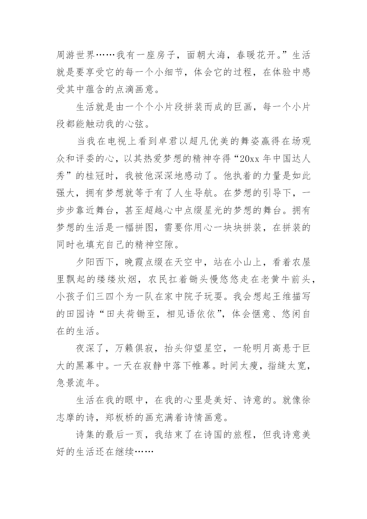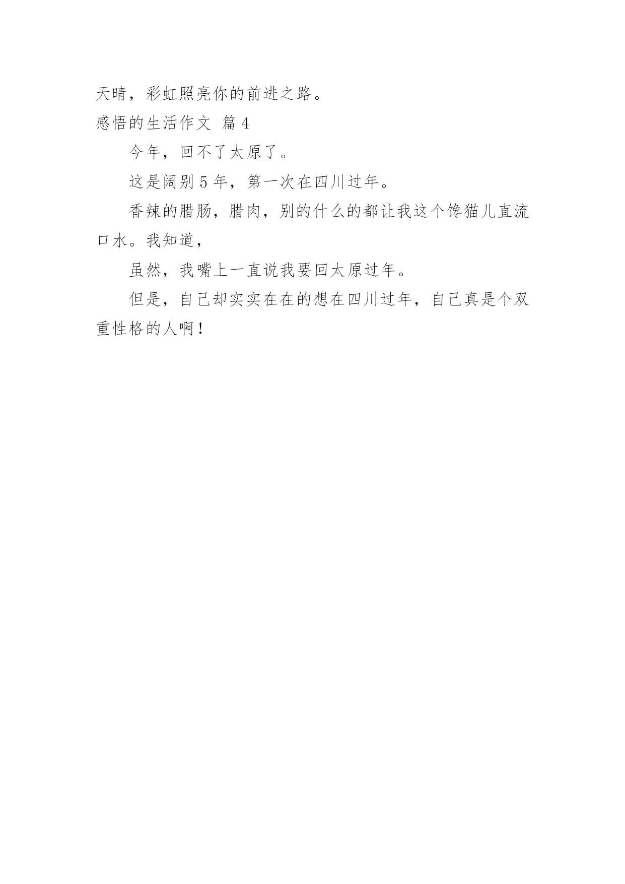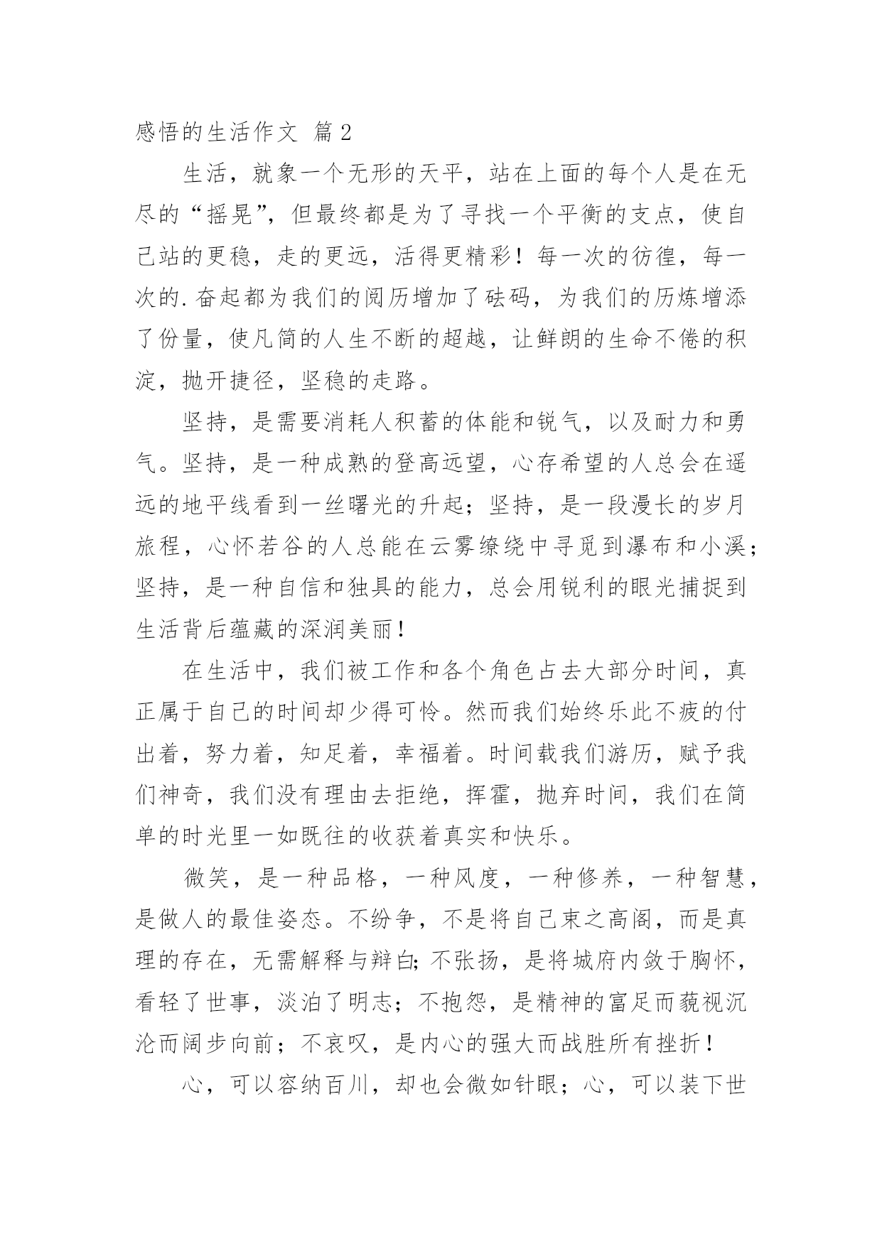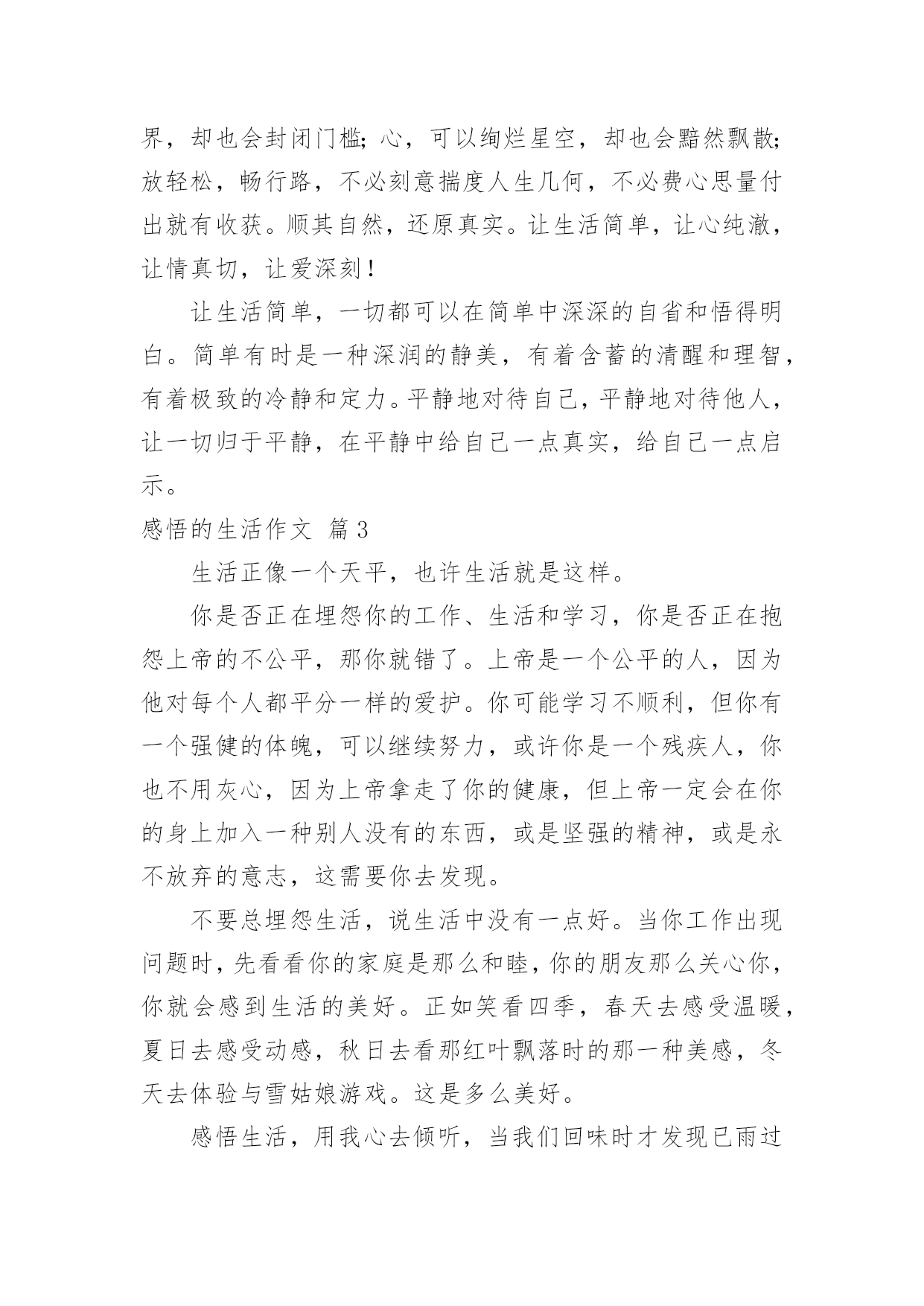 感悟的生活作文【推荐】感悟的生活作文4篇在平凡的学习、工作、生活中,大家都写过作文,肯定对各类作文都很熟悉吧,借助作文人们可以反映客观事物、表达思想感情、传递知识信息。那么你知道一篇好的作文该怎么写吗?以下是小编精心整理的感悟的生活作文4篇,仅供参考,欢迎大家阅读。感悟的生活作文篇1生活,简简单单,平凡中透露出美好,简单中蕴含着诗意。秋日的早晨,阳光柔和地洒在丛丛秀菊上。含露绽放的菊花,湿润晶莹,明艳可爱,缕缕幽香,飘满池岸,沁人心脾,就如郑谷诗所云“露湿秋香满池岸”。花儿或含苞待放,或枝头傲立,或羞涩低俯,千姿百态。生活亦是如此多姿美好。冬日的午后,泡一杯普洱,携一本《泰戈尔诗集》,在太阳的温情和清茗氤氲的淡雾中,静静地品读一首首清新、带着浓浓爱意的小诗。和泰戈尔对话,感受他的虔诚和柔情。或许你还可以在诗中与清晨挤牛奶的女孩会面,远远地观赏她的俊俏容颜。生活就是这般的诗意,你若驻立在长长的画廊观赏拉斐尔的奇画,你一定会深深感叹,艺术的生活是那么有魅力。海子说:“从明天起,做一个幸福的人。喂马、劈柴、周游世界……我有一座房子,面朝大海,春暖花开。”生活就是要享受它的每一个小细节,体会它的过程,在体验中感受其中蕴含的点滴画意。生活就是由一个个小片段拼装而成的巨画,每一个小片段都能触动我的心弦。当我在电视上看到卓君以超凡优美的舞姿赢得在场观众和评委的心,以其热爱梦想的精神夺得“20xx年中国达人秀”的桂冠时,我被他深深地感动了。他执着的力量是如此强大,拥有梦想就等于有了人生导航。在梦想的引导下,一步步靠近舞台,甚至超越心中点缀星光的梦想的舞台。拥有梦想的生活是一幅拼图,需要你用心一块块拼装,在拼装的同时也填充自己的精神空隙。夕阳西下,晚霞点缀在天空中,站在小山上,看着农屋里飘起的缕缕炊烟,农民扛着锄头慢悠悠走在老黄牛前头,小孩子们三四个为一队在家中院子玩耍。我会想起王维描写的田园诗“田夫荷锄至,相见语依依”,体会惬意、悠闲自在的生活。夜深了,万籁俱寂,抬头仰望星空,一轮明月高悬于巨大的黑幕中。一天在寂静中落下帷幕。时间太瘦,指缝太宽,急景流年。生活在我的眼中,在我的心里是美好、诗意的。就像徐志摩的诗,郑板桥的画充满着诗情画意。诗集的最后一页,我结束了在诗国的旅程,但我诗意美好的生活还在继续……感悟的生活作文篇2生活,就象一个无形的天平,站在上面的每个人是在无尽的“摇晃”,但最终都是为了寻找一个平衡的支点,使自己站的更稳,走的更远,活得更精彩!每一次的彷徨,每一次的.奋起都为我们的阅历增加了砝码,为我们的历炼增添了份量,使凡简的人生不断的超越,让鲜朗的生命不倦的积淀,抛开捷径,坚稳的走路。坚持,是需要消耗人积蓄的体能和锐气,以及耐力和勇气。坚持,是一种成熟的登高远望,心存希望的人总会在遥远的地平线看到一丝曙光的升起;坚持,是一段漫长的岁月旅程,心怀若谷的人总能在云雾缭绕中寻觅到瀑布和小溪;坚持,是一种自信和独具的能力,总会用锐利的眼光捕捉到生活背后蕴藏的深润美丽!在生活中,我们被工作和各个角色占去大部分时间,真正属于自己的时间却少得可怜。然而我们始终乐此不疲的付出着,努力着,知足着,幸福着。时间载我们游历,赋予我们神奇,我们没有理由去拒绝,挥霍,抛弃时间,我们在简单的时光里一如既往的收获着真实和快乐。微笑,是一种品格,一种风度,一种修养,一种智慧,是做人的最佳姿态。不纷争,不是将自己束之高阁,而是真理的存在,无需解释与辩白;不张扬,是将城府内敛于胸怀,看轻了世事,淡泊了明志;不抱怨,是精神的富足而藐视沉沦而阔步向前;不哀叹,是内心的强大而战胜所有挫折!心,可以容纳百川,却也会微如针眼;心,可以装下世界,却也会封闭门槛;心,可以绚烂星空,却也会黯然飘散;放轻松,畅行路,不必刻意揣度人生几何,不必费心思量付出就有收获。顺其自然,还原真实。让生活简单,让心纯澈,让情真切,让爱深刻!让生活简单,一切都可以在简单中深深的自省和悟得明白。简单有时是一种深润的静美,有着含蓄的清醒和理智,有着极致的冷静和定力。平静地对待自己,平静地对待他人,让一切归于平静,在平静中给自己一点真实,给自己一点启示。感悟的生活作文篇3生活正像一个天平,也许生活就是这样。你是否正在埋怨你的工作、生活和学习,你是否正在抱怨上帝的不公平,那你就错了。上帝是一个公平的人,因为他对每个人都平分一样的爱护。你可能学习不顺利,但你有一个强健的体魄,可以继续努力,或许你是一个残疾人,你也不用灰心,因为上帝拿走了你的健康,但上帝一定会在你的身上加入一种别人没有的东西,或是坚强的精神,或是永不放弃的意志,这需要你去发现。不要总埋怨生活,说生活中没有一点好。当你工作出现问题时,先看看你的家庭是那么和睦,你的朋友那么关心你,你就会感到生活的美好。正如笑看四季,春天去感受温暖,夏日去感受动