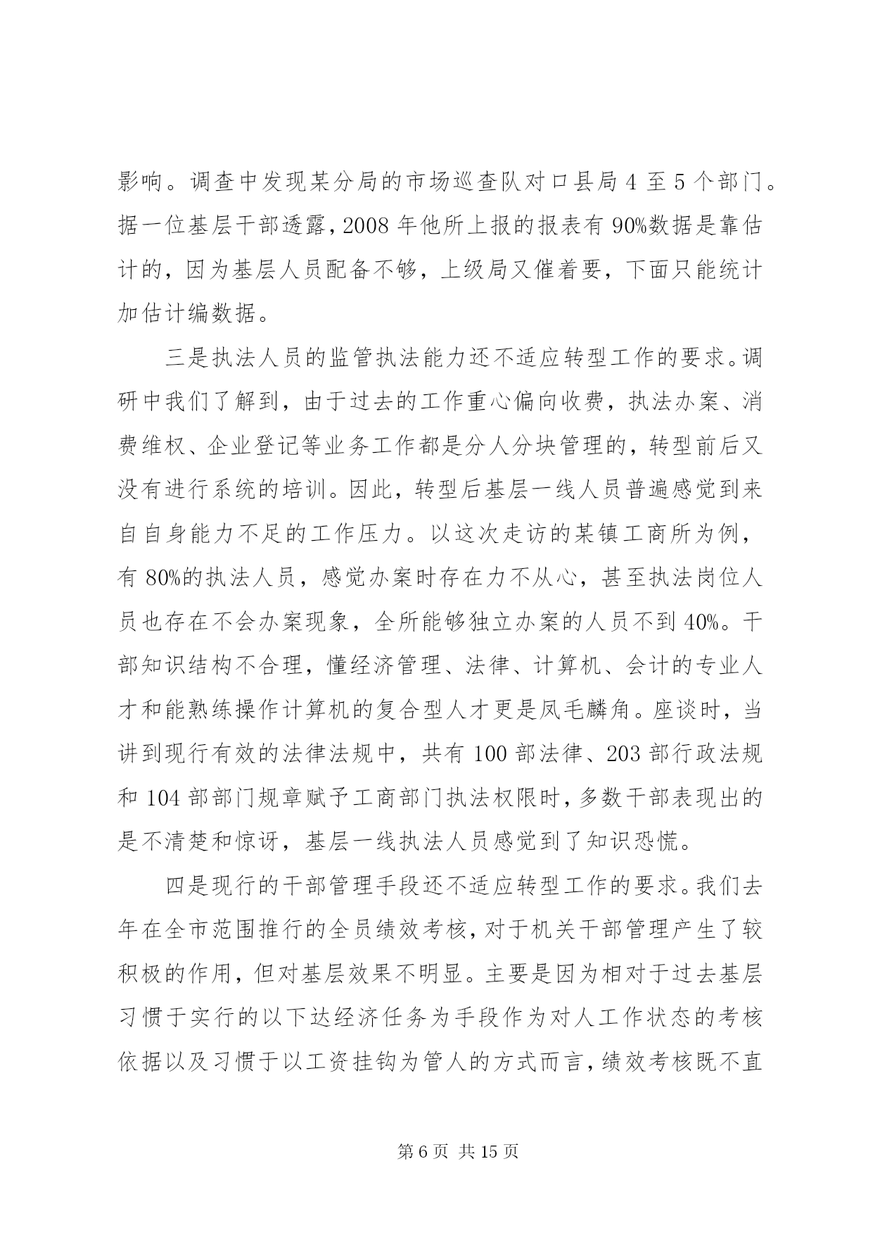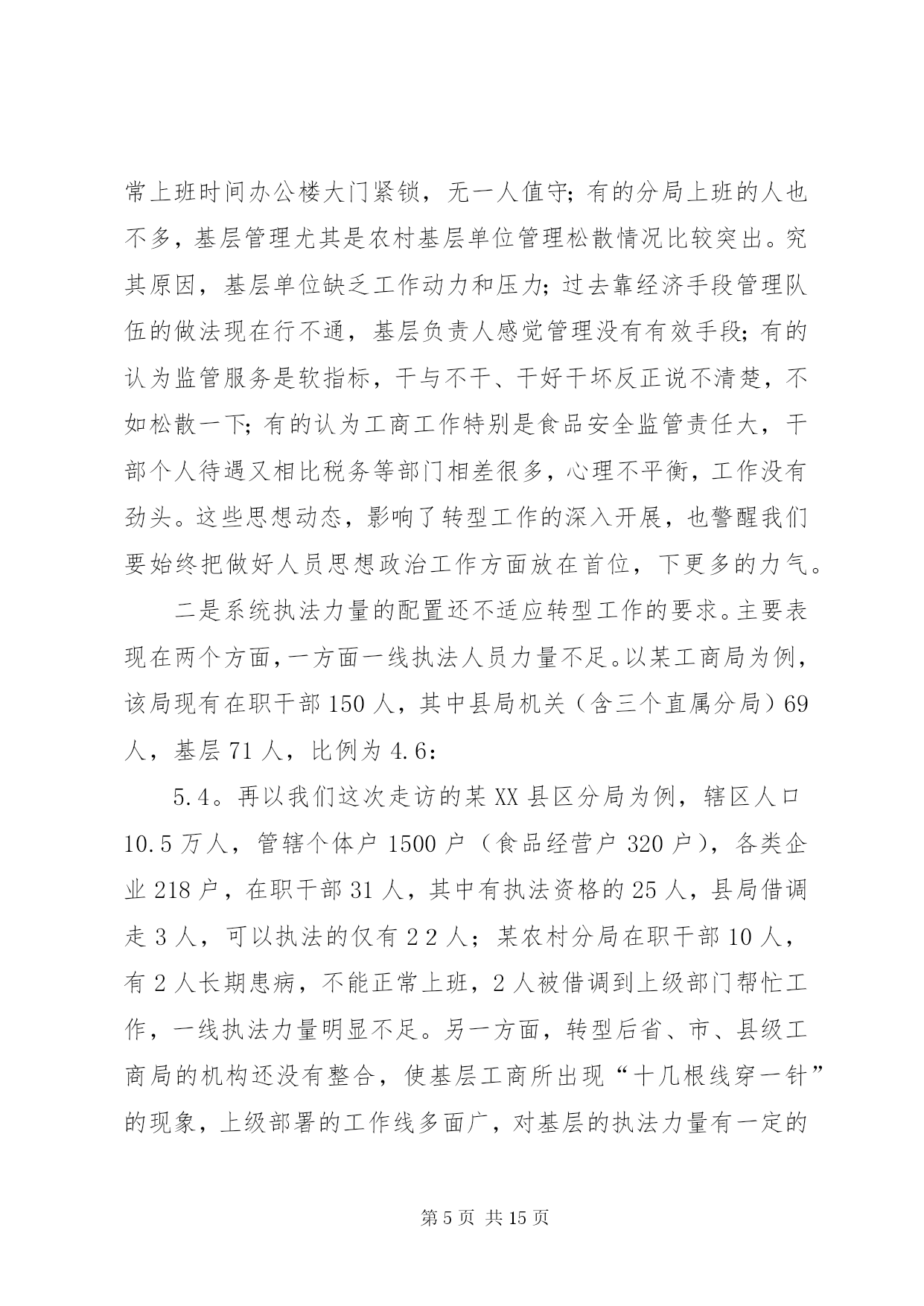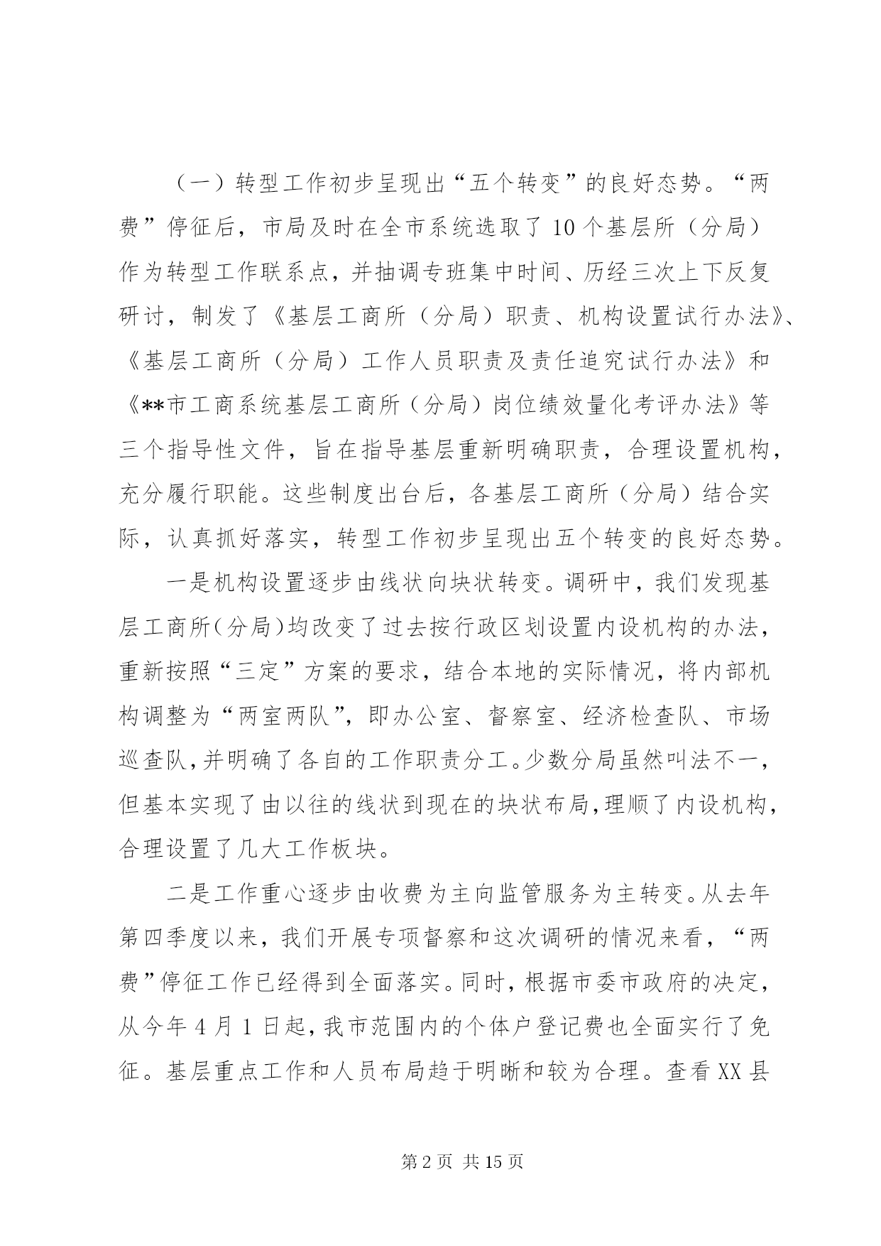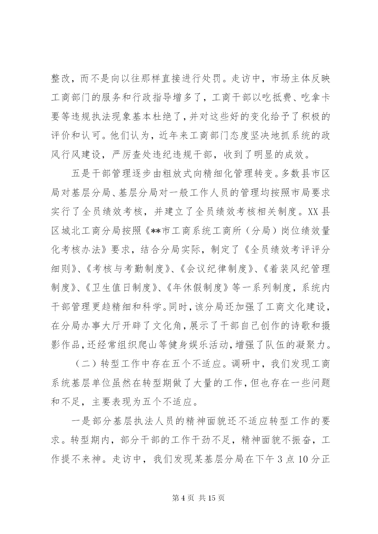 第PAGE\*Arabic\*MERGEFORMAT15页共NUMPAGES\*MERGEFORMAT15页基层工商职能转型工作调研报告编者按:本文主要从系统基层转型工作基本现状;推进基层工作转型的几点建议进行讲述。其中,主要包括:转型工作初步呈现出“五个转变”的良好态势、转型工作中存在五个不适应、转型基层干部的思想反映、创新执法理念推转型。、重设内部机构带转型、培训干部队伍促转型、健全监管机制保转型、落实绩效责任评转型等,具体材料请详见:“两费”停征后,我市工商系统应势而变,顺势而为,围绕工作转型大做文章,迅速转变执法理念,调整机构设置,创新工作机制,较快地实行了职能归位。全系统实施工作转型已有半年多了,基层工作转型究竟现状如何,基层工作人员究竟在干什么、想什么,我们带着这一问题,本着到基层,进店铺,查实情,听实话的要求,先后深入到黄州、团风、浠水、黄梅、武穴、蕲春等6个县市区局的12个基层工商分局和部分经营店,就这一问题进行了专题调研,并作了一些初步的思索。一、系统基层转型工作基本现状基层工商所(分局)是职能工作的前沿和窗口,也是检验转型工作成效最重要和最直接的对象。通过调查,我们认为全市系统基层工商所(分局)的转型工作既取得了一些明显的成效,也存在一些突出的问题,同时基层干部对工作转型问题也有一些很好的想法。(一)转型工作初步呈现出“五个转变”的良好态势。“两费”停征后,市局及时在全市系统选取了10个基层所(分局)作为转型工作联系点,并抽调专班集中时间、历经三次上下反复研讨,制发了《基层工商所(分局)职责、机构设置试行办法》、《基层工商所(分局)工作人员职责及责任追究试行办法》和《**市工商系统基层工商所(分局)岗位绩效量化考评办法》等三个指导性文件,旨在指导基层重新明确职责,合理设置机构,充分履行职能。这些制度出台后,各基层工商所(分局)结合实际,认真抓好落实,转型工作初步呈现出五个转变的良好态势。一是机构设置逐步由线状向块状转变。调研中,我们发现基层工商所(分局)均改变了过去按行政区划设置内设机构的办法,重新按照“三定”方案的要求,结合本地的实际情况,将内部机构调整为“两室两队”,即办公室、督察室、经济检查队、市场巡查队,并明确了各自的工作职责分工。少数分局虽然叫法不一,但基本实现了由以往的线状到现在的块状布局,理顺了内设机构,合理设置了几大工作板块。二是工作重心逐步由收费为主向监管服务为主转变。从去年第四季度以来,我们开展专项督察和这次调研的情况来看,“两费”停征工作已经得到全面落实。同时,根据市委市政府的决定,从今年4月1日起,我市范围内的个体户登记费也全面实行了免征。基层重点工作和人员布局趋于明晰和较为合理。查看XX县区城北分局等单位人员,分配从事内部管理与从事市场监管和行政执法工作的干部人数,基本上达到1:5。XX县区城北分局每周例会对监管服务工作的安排比较具体细致,基本落实到了各项业务工作、各个室队和每名干部。从与个体户交谈中也了解到,基层工商执法人员加强了对市场的巡查力度,对食品经营店等重点监管对象一般情况每周巡查2次,有时次数更多。三是监管方式逐步由传统单一式向现代综合式转变。近年来,在上级的支持下各县市区局都积极创造条件,为基层分局配备了执法车、微机、数码相机和食品安全快速检测箱等装备,监管能力有了新的提高。大力开展大培训大练兵大比武活动,监管方式有了新的改进。实行网上年检办照、网上办案、网格式管理,监管手段有了新的提升。基层分局认真落实市局下达的《食品安全驻店监管责任及责任追究办法》,监管力度有了新的加强。在XX县区局所辖的上巴河镇一王姓个体户店内,我们发现张贴有食品安全质量承诺书,设有食品安全驻店监管责任牌,驻店人员照片、联系电话一目了然,个体户自律制度建立完善,按规定建立了相应的购销货台账,检查中也没有发现有过期变质食品。四是执法理念逐步由强势执法向和谐监管转变。走访个体户了解到,以往随意扣留商品、粗暴管理等现象得到有效遏制,一般的无照经营、超范围经营、广告未备案等违法行为,工商干部都会提前上门做工作,下发通知进行预警,要求经营者限期进行整改,而不是向以往那样直接进行处罚。走访中,市场主体反映工商部门的服务和行政指导增多了,工商干部以吃抵费、吃拿卡要等违规执法现象基本杜绝了,并对这些好的变化给予了积极的评价和认可。他们认为,近年来工商部门态度坚决地抓系统的政风行风建设,严厉查处违纪违规干部,收到了明显的成效。五是干部管理逐步由粗放式向精细化管理转变。多数县市区局对基层分局、基层分局对一般工作人员的管理均按照市局要求实行了全员绩效考核,并建立了全员绩效考核相关制度。XX县区城北工商分局按照《**市工商系统工商所(分局)岗位绩效量化考核办法》要求,结合分局实际,制定了《全员