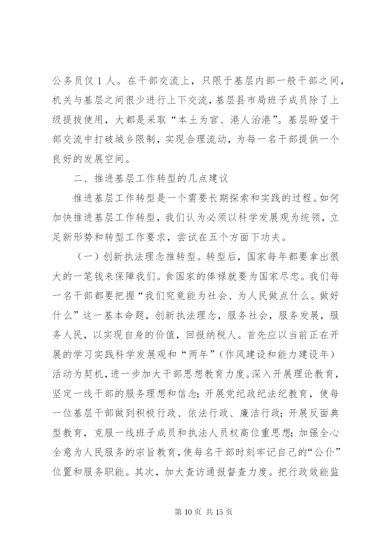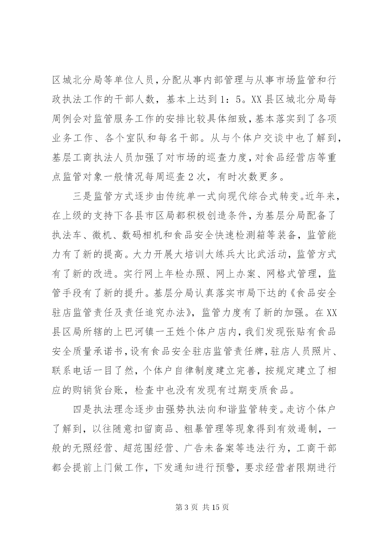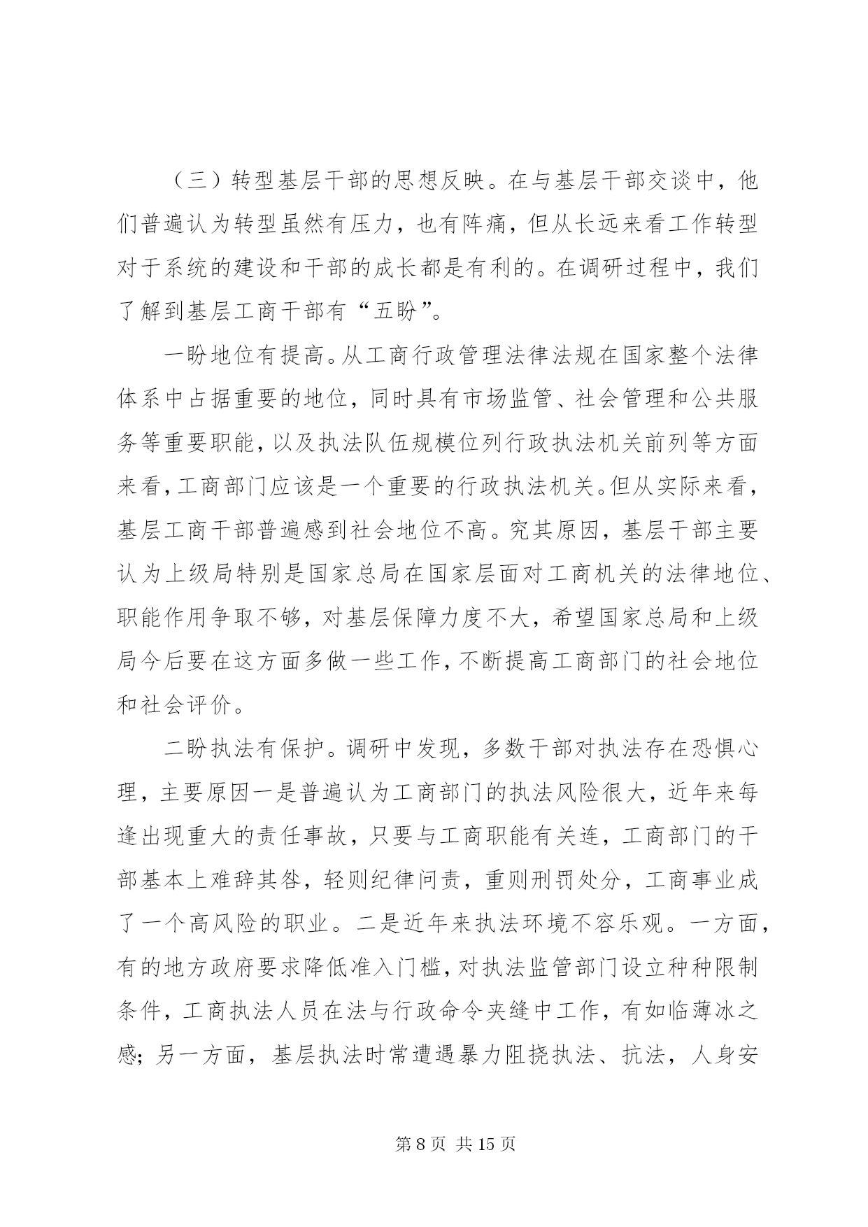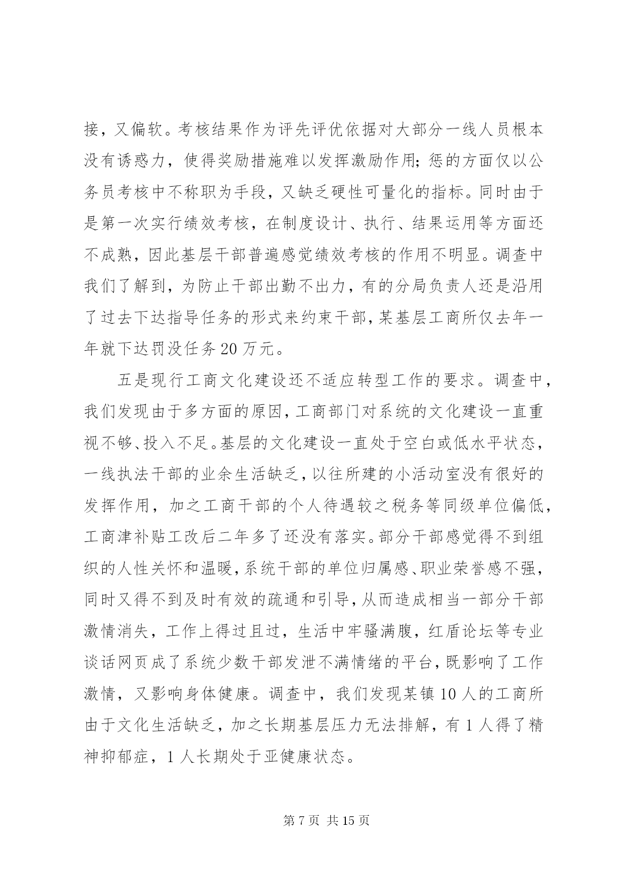 第PAGE\*Arabic\*MERGEFORMAT15页共NUMPAGES\*MERGEFORMAT15页基层工商职能转型工作调研报告编者按:本文主要从系统基层转型工作基本现状;推进基层工作转型的几点建议进行讲述。其中,主要包括:转型工作初步呈现出“五个转变”的良好态势、转型工作中存在五个不适应、转型基层干部的思想反映、创新执法理念推转型。、重设内部机构带转型、培训干部队伍促转型、健全监管机制保转型、落实绩效责任评转型等,具体材料请详见:“两费”停征后,我市工商系统应势而变,顺势而为,围绕工作转型大做文章,迅速转变执法理念,调整机构设置,创新工作机制,较快地实行了职能归位。全系统实施工作转型已有半年多了,基层工作转型究竟现状如何,基层工作人员究竟在干什么、想什么,我们带着这一问题,本着到基层,进店铺,查实情,听实话的要求,先后深入到黄州、团风、浠水、黄梅、武穴、蕲春等6个县市区局的12个基层工商分局和部分经营店,就这一问题进行了专题调研,并作了一些初步的思索。一、系统基层转型工作基本现状基层工商所(分局)是职能工作的前沿和窗口,也是检验转型工作成效最重要和最直接的对象。通过调查,我们认为全市系统基层工商所(分局)的转型工作既取得了一些明显的成效,也存在一些突出的问题,同时基层干部对工作转型问题也有一些很好的想法。(一)转型工作初步呈现出“五个转变”的良好态势。“两费”停征后,市局及时在全市系统选取了10个基层所(分局)作为转型工作联系点,并抽调专班集中时间、历经三次上下反复研讨,制发了《基层工商所(分局)职责、机构设置试行办法》、《基层工商所(分局)工作人员职责及责任追究试行办法》和《**市工商系统基层工商所(分局)岗位绩效量化考评办法》等三个指导性文件,旨在指导基层重新明确职责,合理设置机构,充分履行职能。这些制度出台后,各基层工商所(分局)结合实际,认真抓好落实,转型工作初步呈现出五个转变的良好态势。一是机构设置逐步由线状向块状转变。调研中,我们发现基层工商所(分局)均改变了过去按行政区划设置内设机构的办法,重新按照“三定”方案的要求,结合本地的实际情况,将内部机构调整为“两室两队”,即办公室、督察室、经济检查队、市场巡查队,并明确了各自的工作职责分工。少数分局虽然叫法不一,但基本实现了由以往的线状到现在的块状布局,理顺了内设机构,合理设置了几大工作板块。二是工作重心逐步由收费为主向监管服务为主转变。从去年第四季度以来,我们开展专项督察和这次调研的情况来看,“两费”停征工作已经得到全面落实。同时,根据市委市政府的决定,从今年4月1日起,我市范围内的个体户登记费也全面实行了免征。基层重点工作和人员布局趋于明晰和较为合理。查看XX县区城北分局等单位人员,分配从事内部管理与从事市场监管和行政执法工作的干部人数,基本上达到1:5。XX县区城北分局每周例会对监管服务工作的安排比较具体细致,基本落实到了各项业务工作、各个室队和每名干部。从与个体户交谈中也了解到,基层工商执法人员加强了对市场的巡查力度,对食品经营店等重点监管对象一般情况每周巡查2次,有时次数更多。三是监管方式逐步由传统单一式向现代综合式转变。近年来,在上级的支持下各县市区局都积极创造条件,为基层分局配备了执法车、微机、数码相机和食品安全快速检测箱等装备,监管能力有了新的提高。大力开展大培训大练兵大比武活动,监管方式有了新的改进。实行网上年检办照、网上办案、网格式管理,监管手段有了新的提升。基层分局认真落实市局下达的《食品安全驻店监管责任及责任追究办法》,监管力度有了新的加强。在XX县区局所辖的上巴河镇一王姓个体户店内,我们发现张贴有食品安全质量承诺书,设有食品安全驻店监管责任牌,驻店人员照片、联系电话一目了然,个体户自律制度建立完善,按规定建立了相应的购销货台账,检查中也没有发现有过期变质食品。四是执法理念逐步由强势执法向和谐监管转变。走访个体户了解到,以往随意扣留商品、粗暴管理等现象得到有效遏制,一般的无照经营、超范围经营、广告未备案等违法行为,工商干部都会提前上门做工作,下发通知进行预警,要求经营者限期进行整改,而不是向以往那样直接进行处罚。走访中,市场主体反映工商部门的服务和行政指导增多了,工商干部以吃抵费、吃拿卡要等违规执法现象基本杜绝了,并对这些好的变化给予了积极的评价和认可。他们认为,近年来工商部门态度坚决地抓系统的政风行风建设,严厉查处违纪违规干部,收到了明显的成效。五是干部管理逐步由粗放式向精细化管理转变。多数县市区局对基层分局、基层分局对一般工作人员的管理均按照市局要求实行了全员绩效考核,并建立了全员绩效考核相关制度。XX县区城北工商分局按照《**市工商系统工商所(分局)岗位绩效量化考核办法》要求,结合分局实际,制定了《全员