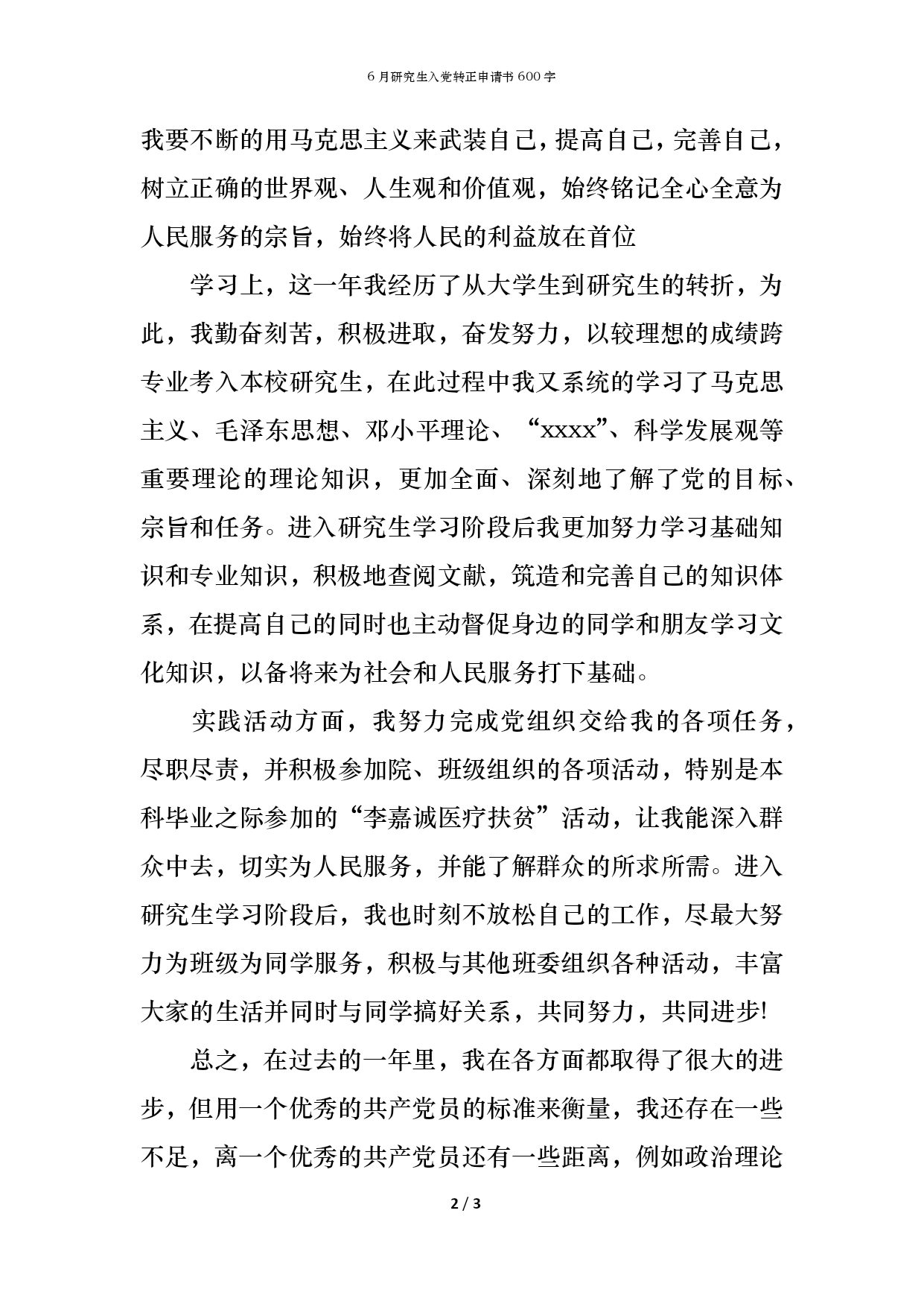 6月研究生入党转正申请书600字PAGE3/NUMPAGES36月研究生入党转正申请书600字6月研究生入党转正申请书600字为大家整理了《6月研究生入党转正申请书范文600字》供大家参考,望给大家带来帮助!尊敬的党组织:本人于XX年12月23日被xx大学医学院护理学院党支部批准为中共预备党员,按照党章第七条规定,截止20__(请自填)年11月23日,预备期满一年可申请转为中国共产党正式党员。在预备期的这一年里,我认真按照党员的标准严格要求自己,特别在组织的关怀与培养下,在支部党员的帮助教育下,我在政治上、思想上、学习上、工作上都有了很大的提高,对党的目标、宗旨、任务等认识更加全面,更加深刻,使我更加坚定了共产主义的信念,更加增强了对党的事业和共产主义事业奋斗终身的信心和勇气!现在我郑重向党组织提出转正申请,并认真接受党组织对我的审查。一下将自己一年来的思想、学习、实践活动等方面的情况作简单的汇报。思想上,一年来,在党支部的悉心培育和积极影响下,使我对党的各方面情况有了更深刻的认识和感悟,特别是党内一系列教育活动,使我更清楚地了解了党的光荣传统,加深了对党的宗旨的认识,增强了自己的党性。特别通过党支部的活动,让我更加明确了党在改革开放30多年来所取得的辉煌成绩中所发挥的不可取代的作用。因此,我要不断的用马克思主义来武装自己,提高自己,完善自己,树立正确的世界观、人生观和价值观,始终铭记全心全意为人民服务的宗旨,始终将人民的利益放在首位学习上,这一年我经历了从大学生到研究生的转折,为此,我勤奋刻苦,积极进取,奋发努力,以较理想的成绩跨专业考入本校研究生,在此过程中我又系统的学习了马克思主义、毛泽东思想、邓小平理论、“xxxx”、科学发展观等重要理论的理论知识,更加全面、深刻地了解了党的目标、宗旨和任务。进入研究生学习阶段后我更加努力学习基础知识和专业知识,积极地查阅文献,筑造和完善自己的知识体系,在提高自己的同时也主动督促身边的同学和朋友学习文化知识,以备将来为社会和人民服务打下基础。实践活动方面,我努力完成党组织交给我的各项任务,尽职尽责,并积极参加院、班级组织的各项活动,特别是本科毕业之际参加的“李嘉诚医疗扶贫”活动,让我能深入群众中去,切实为人民服务,并能了解群众的所求所需。进入研究生学习阶段后,我也时刻不放松自己的工作,尽最大努力为班级为同学服务,积极与其他班委组织各种活动,丰富大家的生活并同时与同学搞好关系,共同努力,共同进步!总之,在过去的一年里,我在各方面都取得了很大的进步,但用一个优秀的共产党员的标准来衡量,我还存在一些不足,离一个优秀的共产党员还有一些距离,例如政治理论基础还不扎实,理论联系实际的能力还较差,专业知识和各方面的知识水平还有待进一步提高,我还需要更加努力,不断地完善自己,希望党组织和各群众监督并督促我。在今后的工作和学习中,我要向先进的党员同志学习,争取在思想、工作、学习等方面取得更大的进步。此上为我一年来的基本情况,恳请组织和各位同志提出宝贵的意见,也恳请组织能批准我按期转为中国共产党正式党员,我讲悉心接受党组织对我的审查和考验!我会以此为新的起点,并在未来的征途上继续不断努力,争取作一名优秀的共产党员!此致敬礼