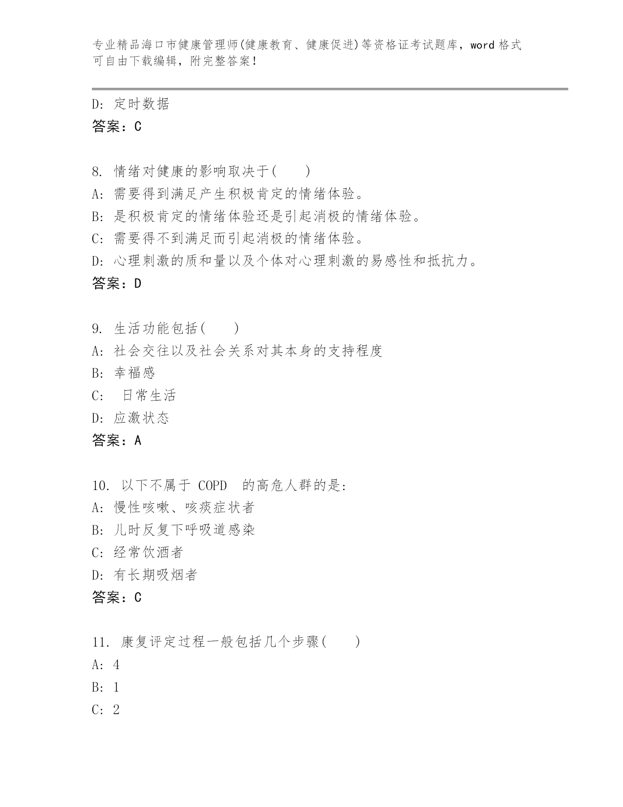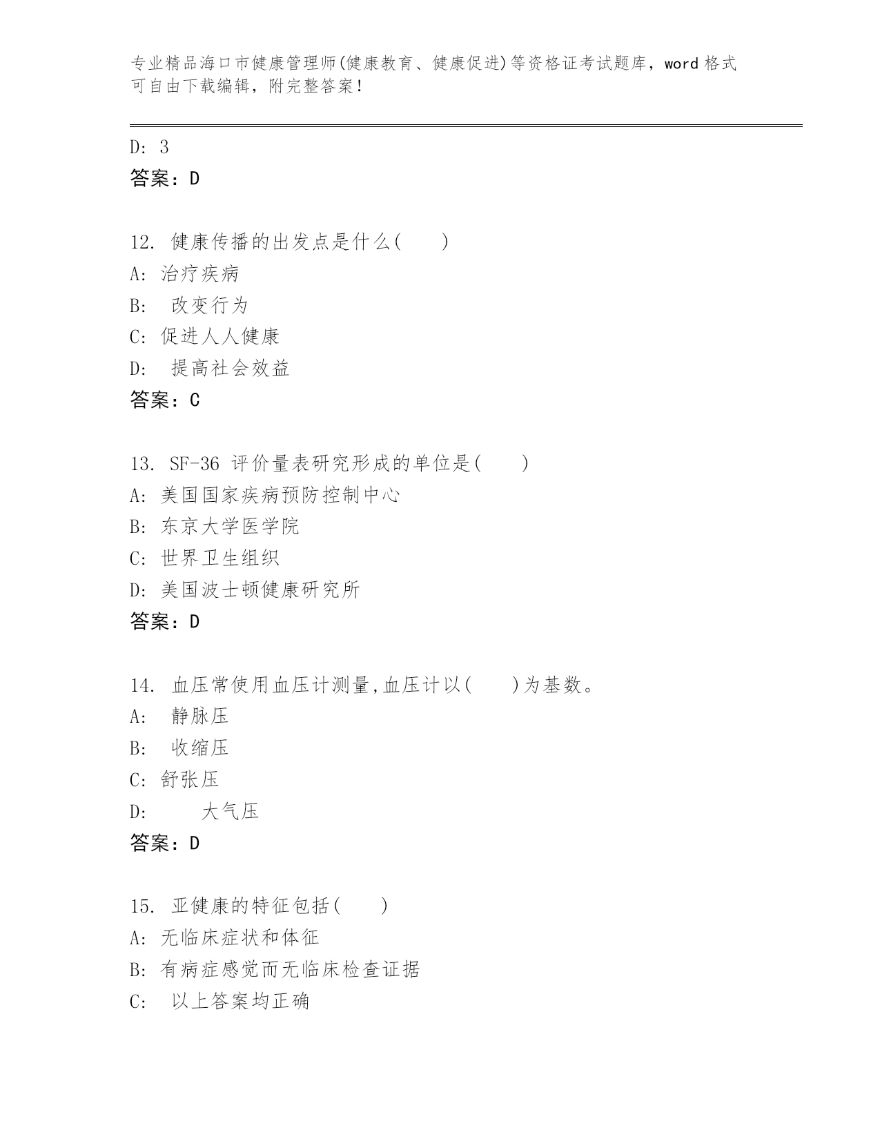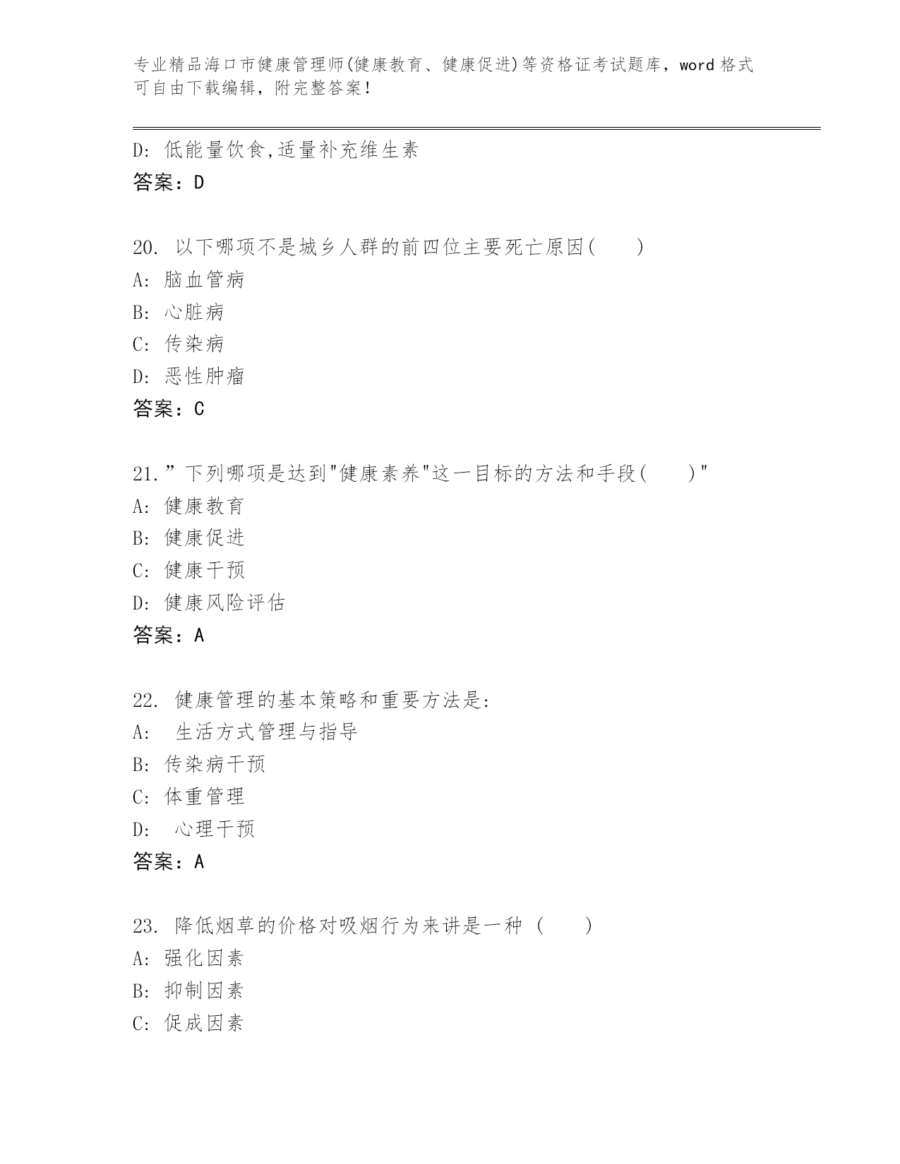 完整版海口市健康管理师(健康教育、健康促进)等资格证考试精品(名师推荐).docx