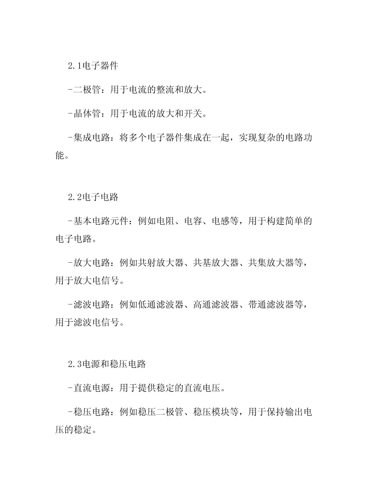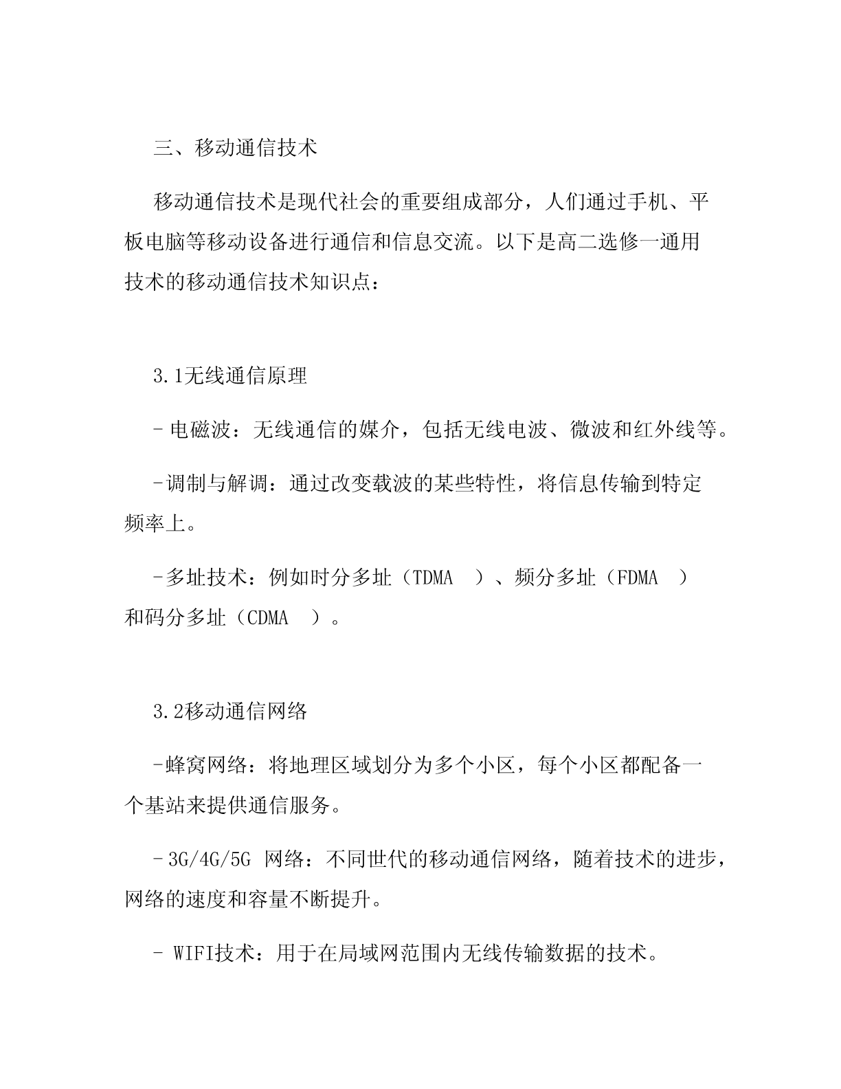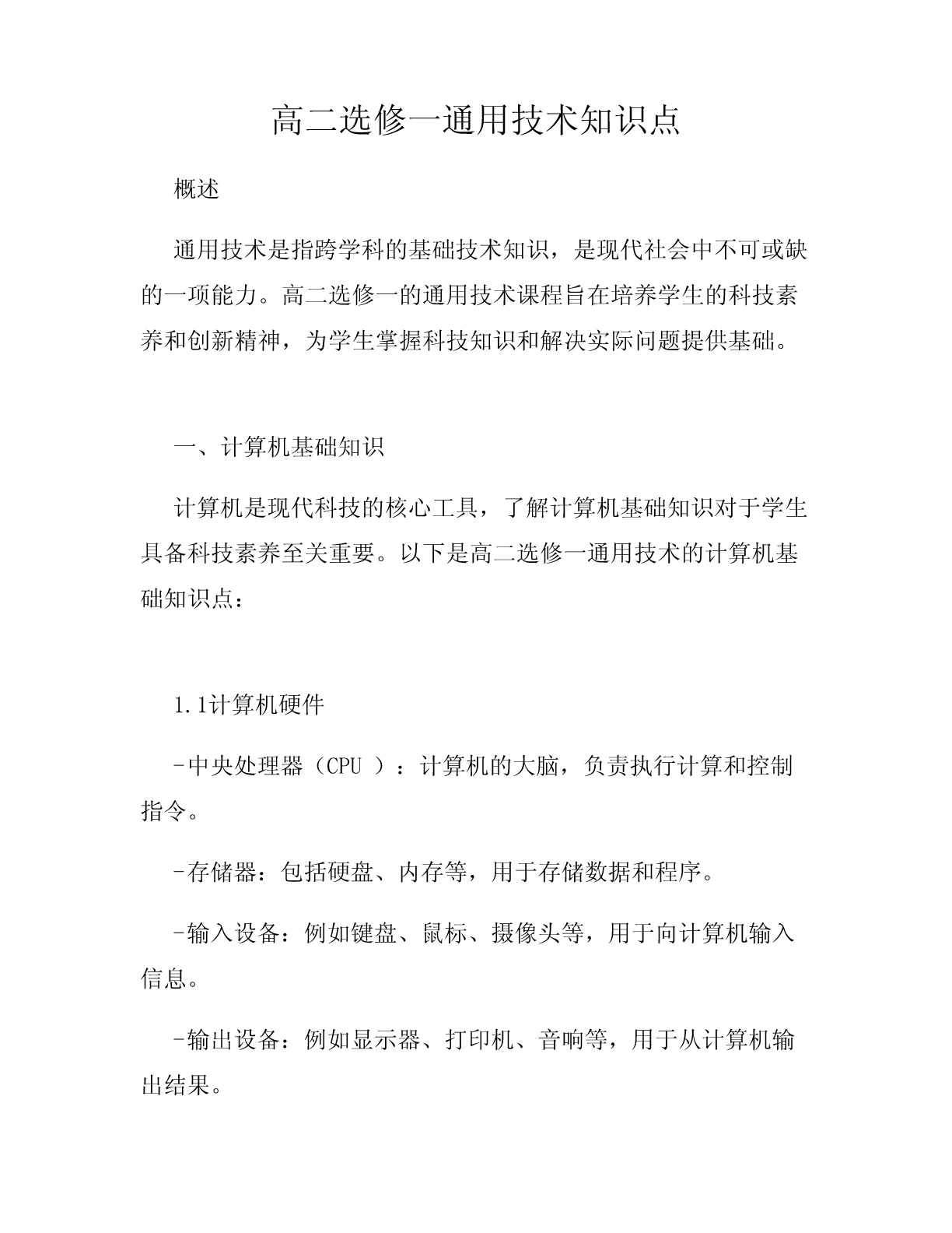 高二选修一通用技术知识点概述通用技术是指跨学科的基础技术知识,是现代社会中不可或缺的一项能力。高二选修一的通用技术课程旨在培养学生的科技素养和创新精神,为学生掌握科技知识和解决实际问题提供基础。一、计算机基础知识计算机是现代科技的核心工具,了解计算机基础知识对于学生具备科技素养至关重要。以下是高二选修一通用技术的计算机基础知识点:1.1计算机硬件-中央处理器(CPU):计算机的大脑,负责执行计算和控制指令。-存储器:包括硬盘、内存等,用于存储数据和程序。-输入设备:例如键盘、鼠标、摄像头等,用于向计算机输入信息。-输出设备:例如显示器、打印机、音响等,用于从计算机输出结果。-主板:连接计算机各个部件的电路板。1.2计算机软件-操作系统:例如Windows、MacOS、Linux等,管理计算机的硬件和软件资源。-应用软件:例如文字处理器、图像处理器、视频编辑器等,用户用于完成具体任务的软件。1.3计算机网络-网络拓扑结构:例如星型、总线型、环形等,用于描述计算机网络的物理连接方式。-协议:例如TCP/IP、HTTP、FTP等,用于在计算机网络中传输和通信。-网络安全:例如防火墙、加密算法等,用于保护计算机网络的安全。二、电子技术基础知识电子技术是现代科技领域的重要分支,它以电子器件和电子电路为基础。以下是高二选修一通用技术的电子技术基础知识点:2.1电子器件-二极管:用于电流的整流和放大。-晶体管:用于电流的放大和开关。-集成电路:将多个电子器件集成在一起,实现复杂的电路功能。2.2电子电路-基本电路元件:例如电阻、电容、电感等,用于构建简单的电子电路。-放大电路:例如共射放大器、共基放大器、共集放大器等,用于放大电信号。-滤波电路:例如低通滤波器、高通滤波器、带通滤波器等,用于滤波电信号。2.3电源和稳压电路-直流电源:用于提供稳定的直流电压。-稳压电路:例如稳压二极管、稳压模块等,用于保持输出电压的稳定。三、移动通信技术移动通信技术是现代社会的重要组成部分,人们通过手机、平板电脑等移动设备进行通信和信息交流。以下是高二选修一通用技术的移动通信技术知识点:3.1无线通信原理-电磁波:无线通信的媒介,包括无线电波、微波和红外线等。-调制与解调:通过改变载波的某些特性,将信息传输到特定频率上。-多址技术:例如时分多址(TDMA)、频分多址(FDMA)和码分多址(CDMA)。3.2移动通信网络-蜂窝网络:将地理区域划分为多个小区,每个小区都配备一个基站来提供通信服务。-3G/4G/5G网络:不同世代的移动通信网络,随着技术的进步,网络的速度和容量不断提升。-WIFI技术:用于在局域网范围内无线传输数据的技术。结语高二选修一通用技术的知识点涵盖了计算机基础、电子技术和移动通信技术等方面,这些知识将会对学生未来的科技学习和工作有着重要的影响。通过学习和掌握这些基础知识,学生将拓展自己的科技视野,提升解决实际问题和创新思维的能力。